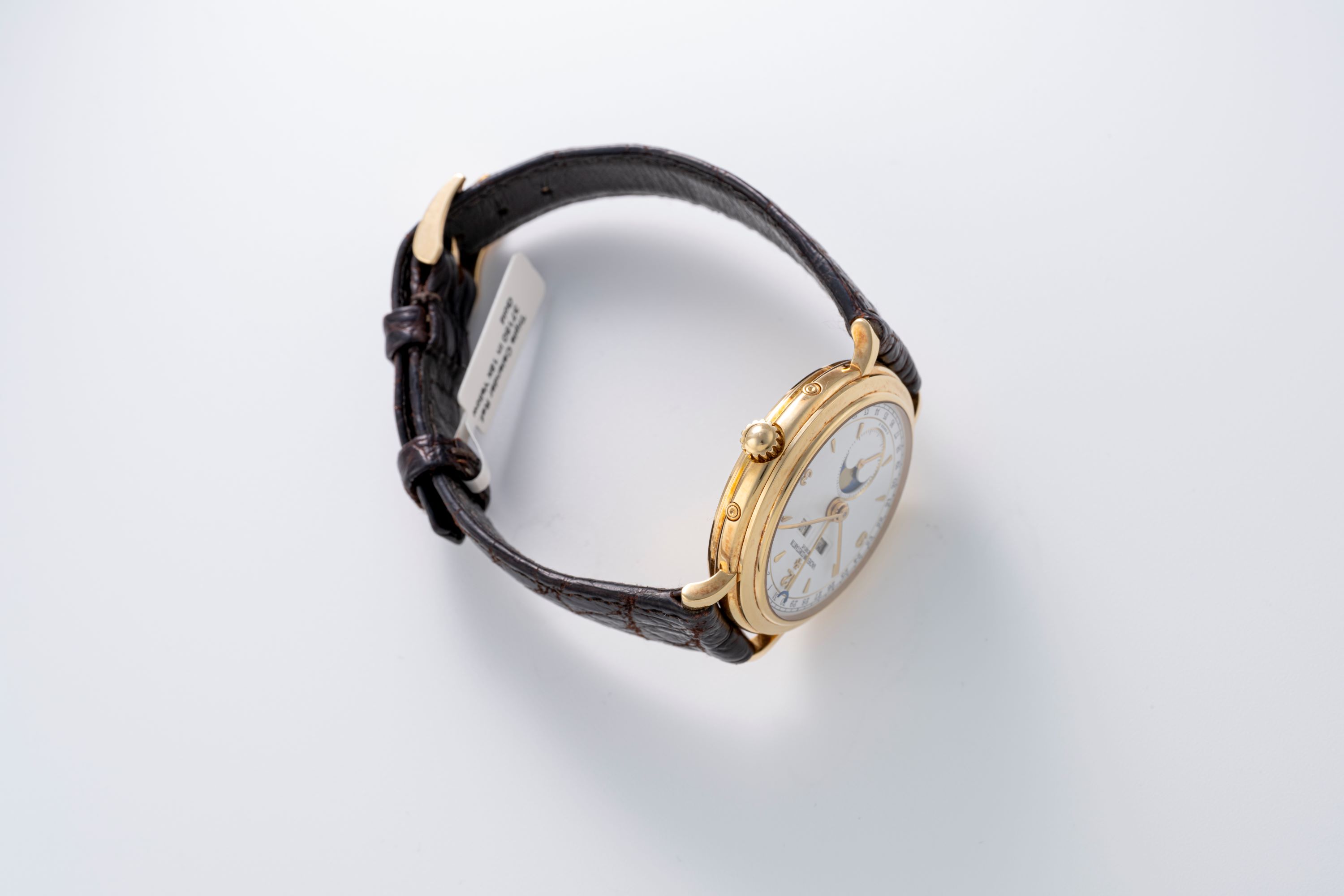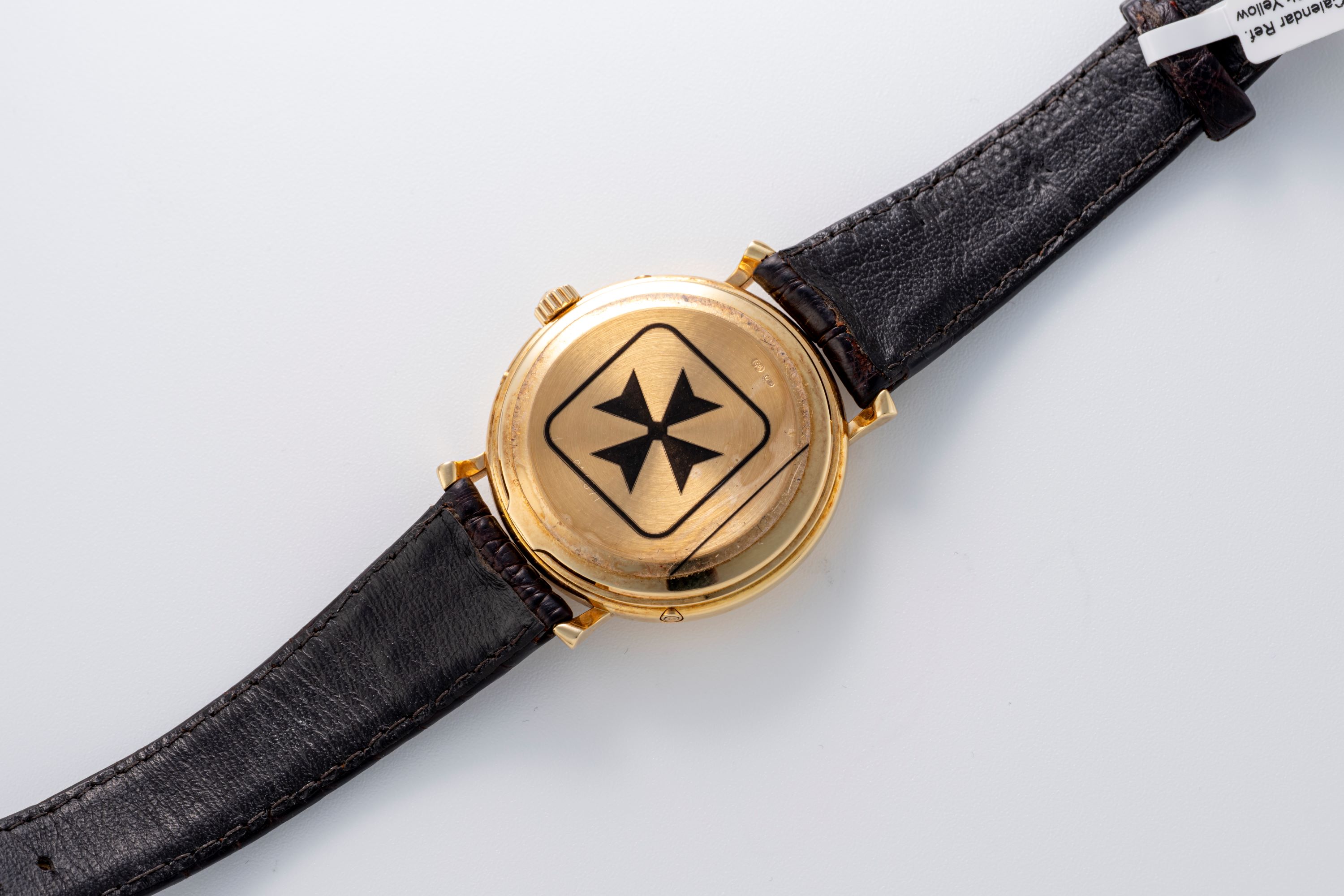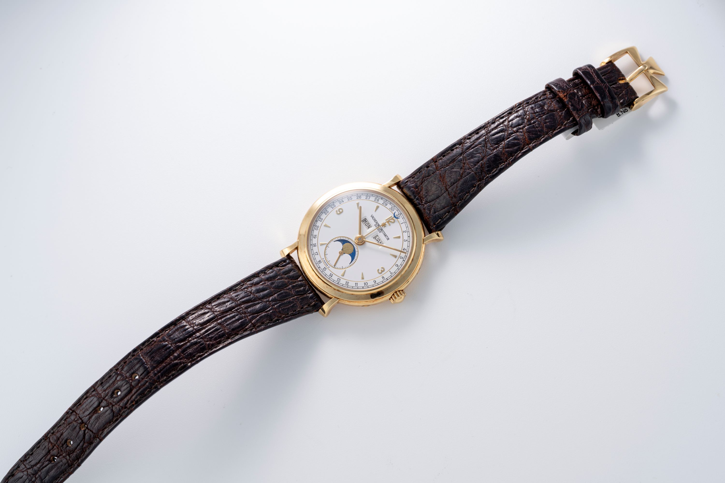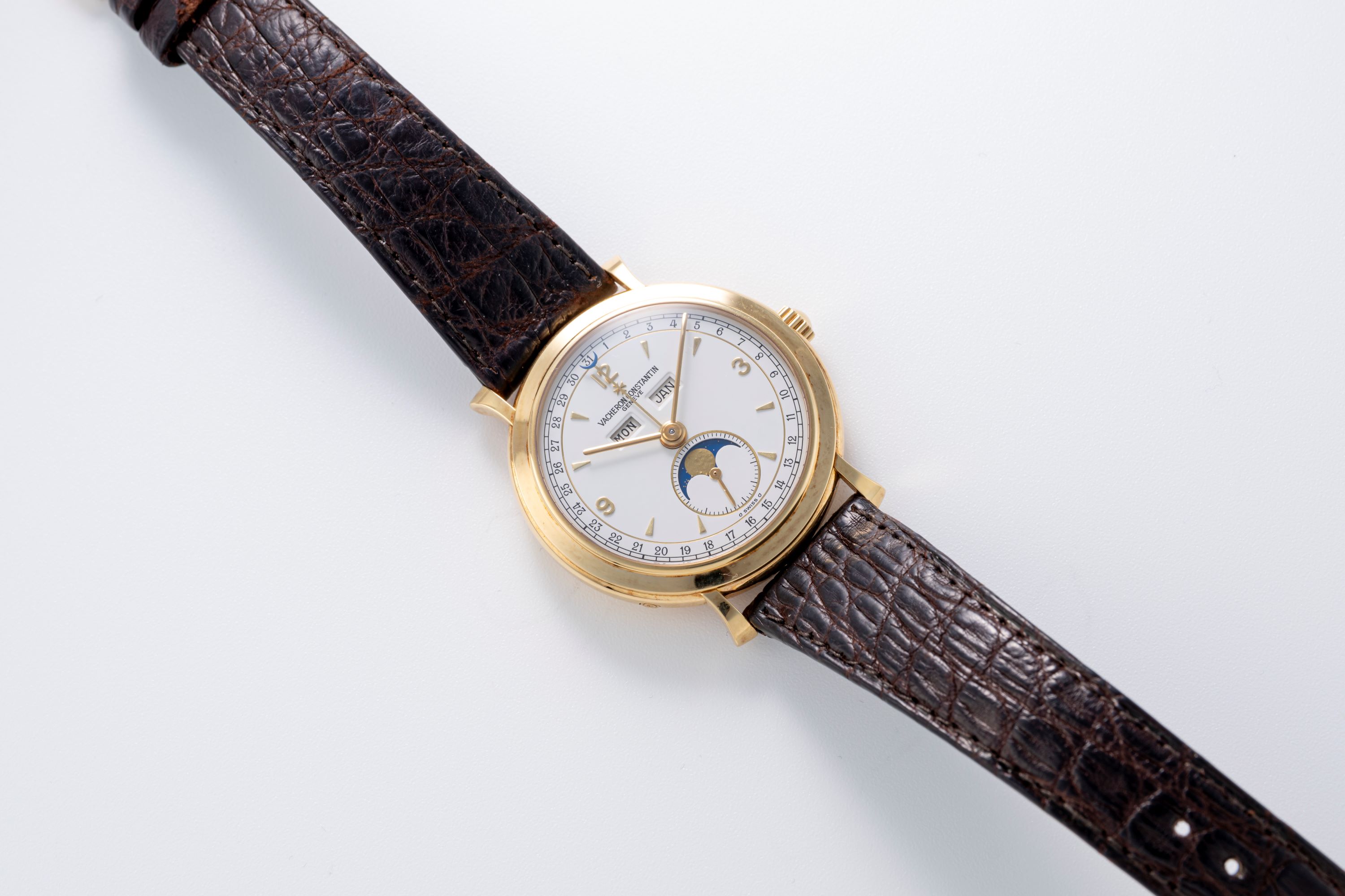 DialWhite lacquer dial with applied indices and 9, 12, and 3 numerals, outer date ring, yellow gold hands, day and month display at 12 o'clock, moonphase and small seconds at 6 o'clock, central date pointer hand, signed 'Vacheron Constantin Genève' at 12 o'clock