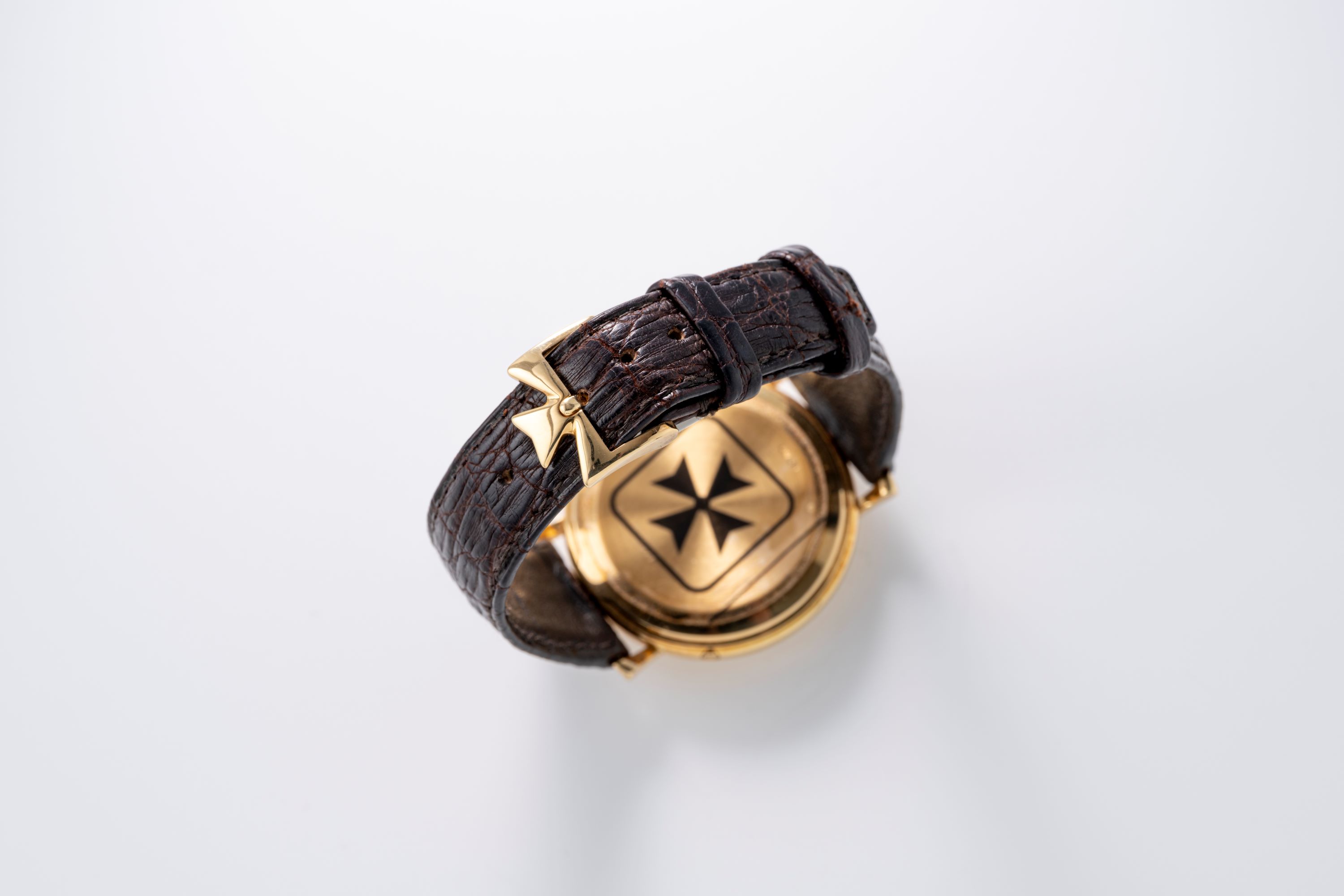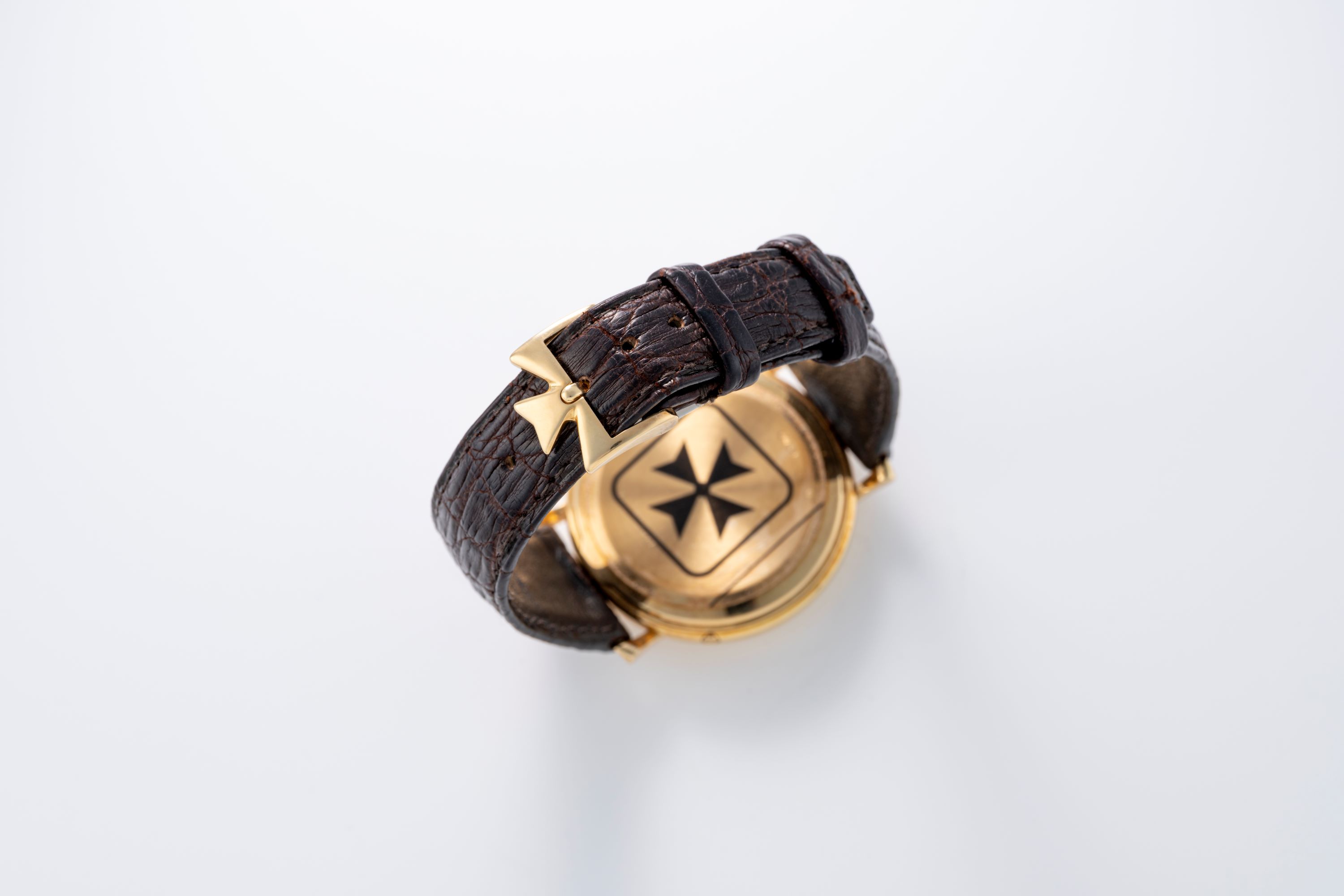The Vacheron Constantin Ref. 37150 stands as a graceful example of the Maison’s return to classical complications in the 1990s. Introduced circa the early-to-mid 1990s, this reference revives the triple-calendar (day, date, month) and moon-phase aesthetic within a compact and elegant 36 mm case, crafted in rich yellow gold. The 18k yellow gold case features a subtle stepped bezel and clean round profile. The white dial features applied arabic numerals, two apertures for the day and month at 12 o’clock, a peripheral date scale indicated by a central hand, and a moon-phase & subsidiary seconds register at 6 o’clock. The aesthetic is refined yet functionally rich, perfectly balanced between dress elegance and mechanical complexity. Inside lies the hand-wound Caliber 1150, a movement refined for this specific application and signed by Vacheron Constantin.