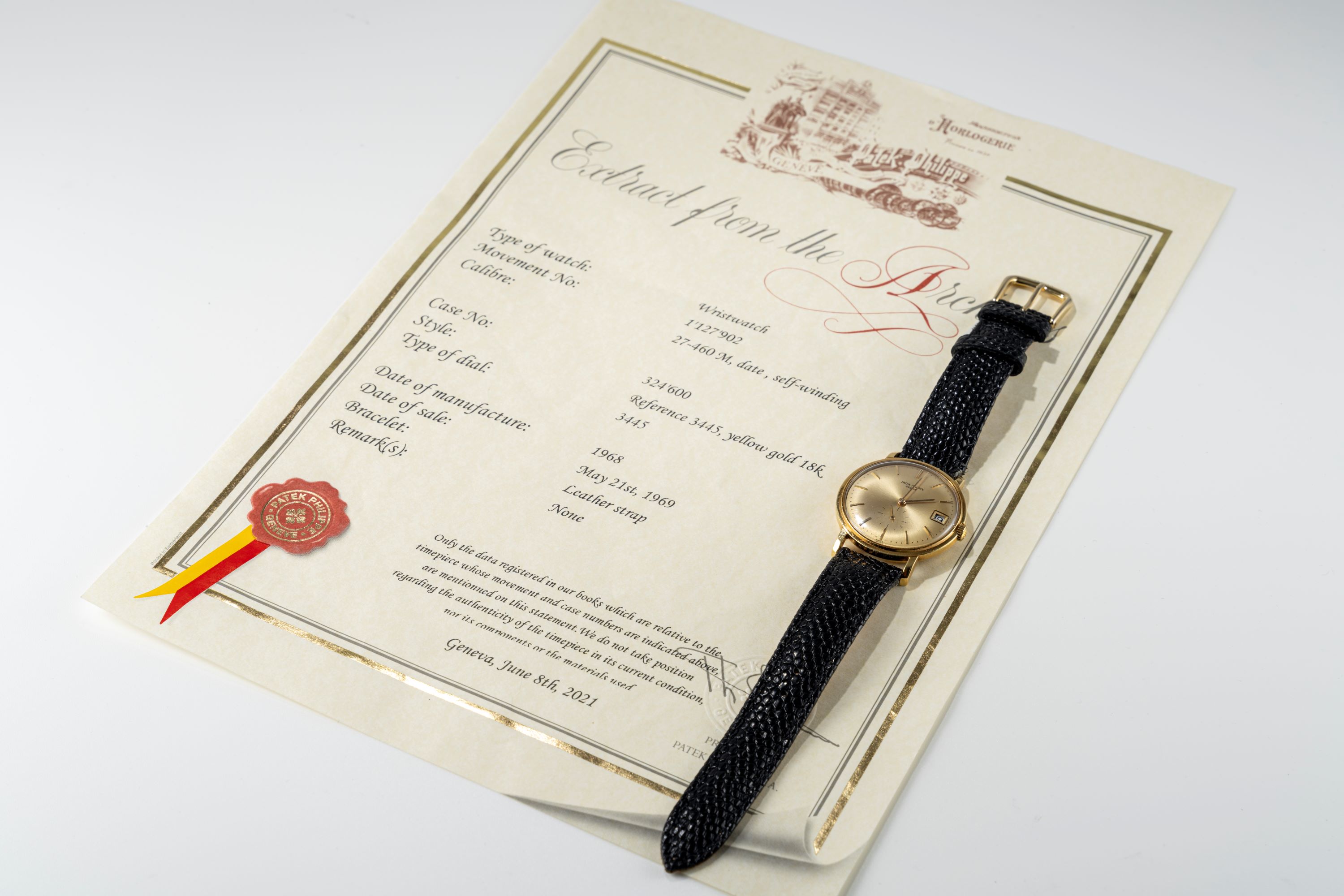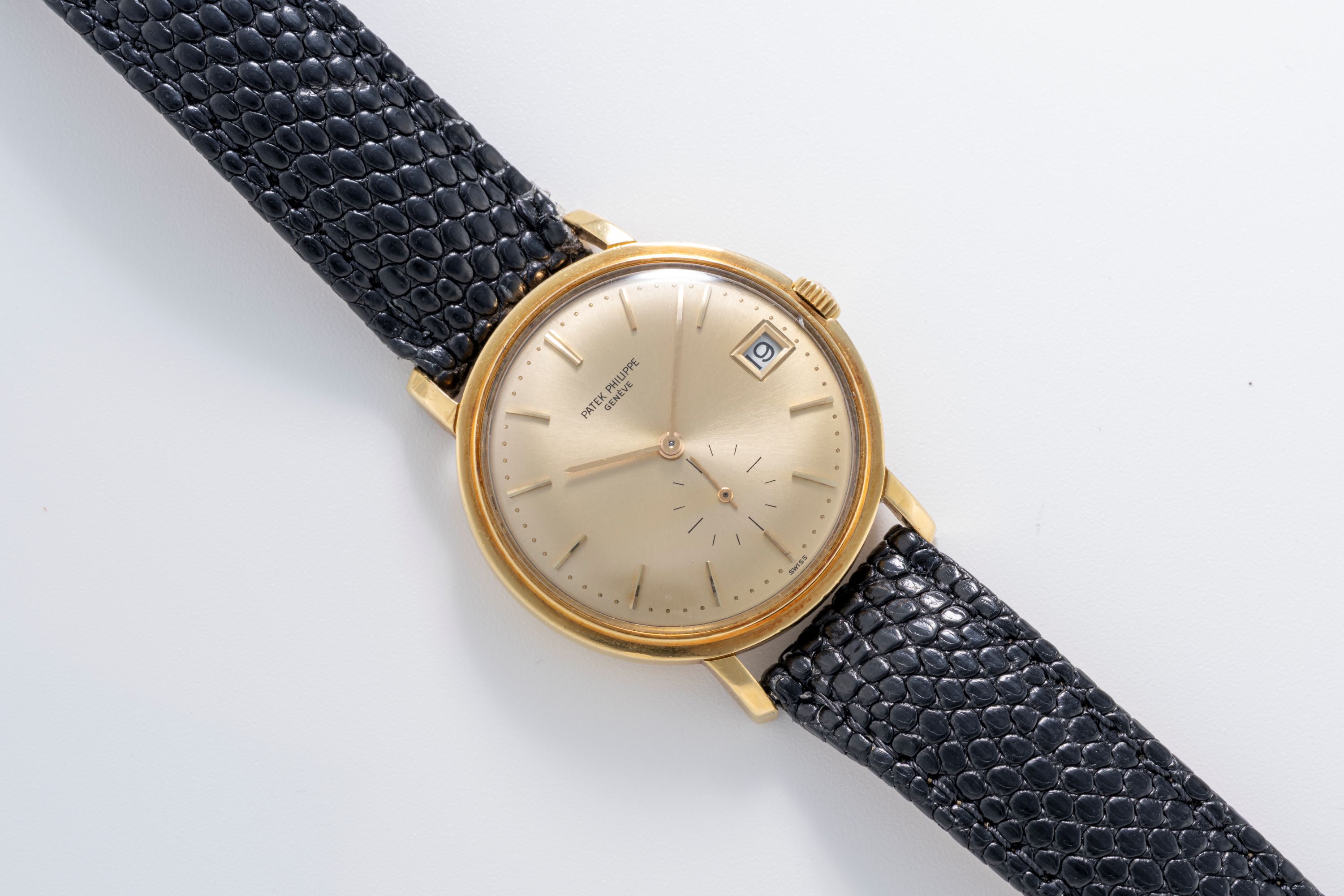 The Patek Philippe Calatrava Ref. 3445 is a quintessential expression of the maison’s understated elegance and mechanical purity. Produced from the 1960s through the late 1970s, the reference is widely celebrated as one of the most refined self-winding Calatravas of its era, combining a calm design with a technically significant movement. This example, presented in 18k yellow gold with a champagne dial, offers an especially warm and harmonious configuration, one that enhances the model’s inherently classical character. The 35 mm round case features clean, balanced lines, a gently stepped bezel and straight lugs. The champagne-toned dial heightens its vintage charm, with applied gold baton markers, a matching gold handset, and a subtle date window at 3 o’clock. Inside the Ref. 3445 ticks the legendary Patek Philippe Caliber 27-460M, which is the first automatic movement with a date function made by the maison and regarded to this day as one of the finest automatic movements ever produced by the brand. Elegant, versatile and enduring, the Ref. 3445 stands as one of the great 20th-century Calatravas, especially in this appealing champagne dial, it offers collectors a beautifully nuanced take on an iconic reference.