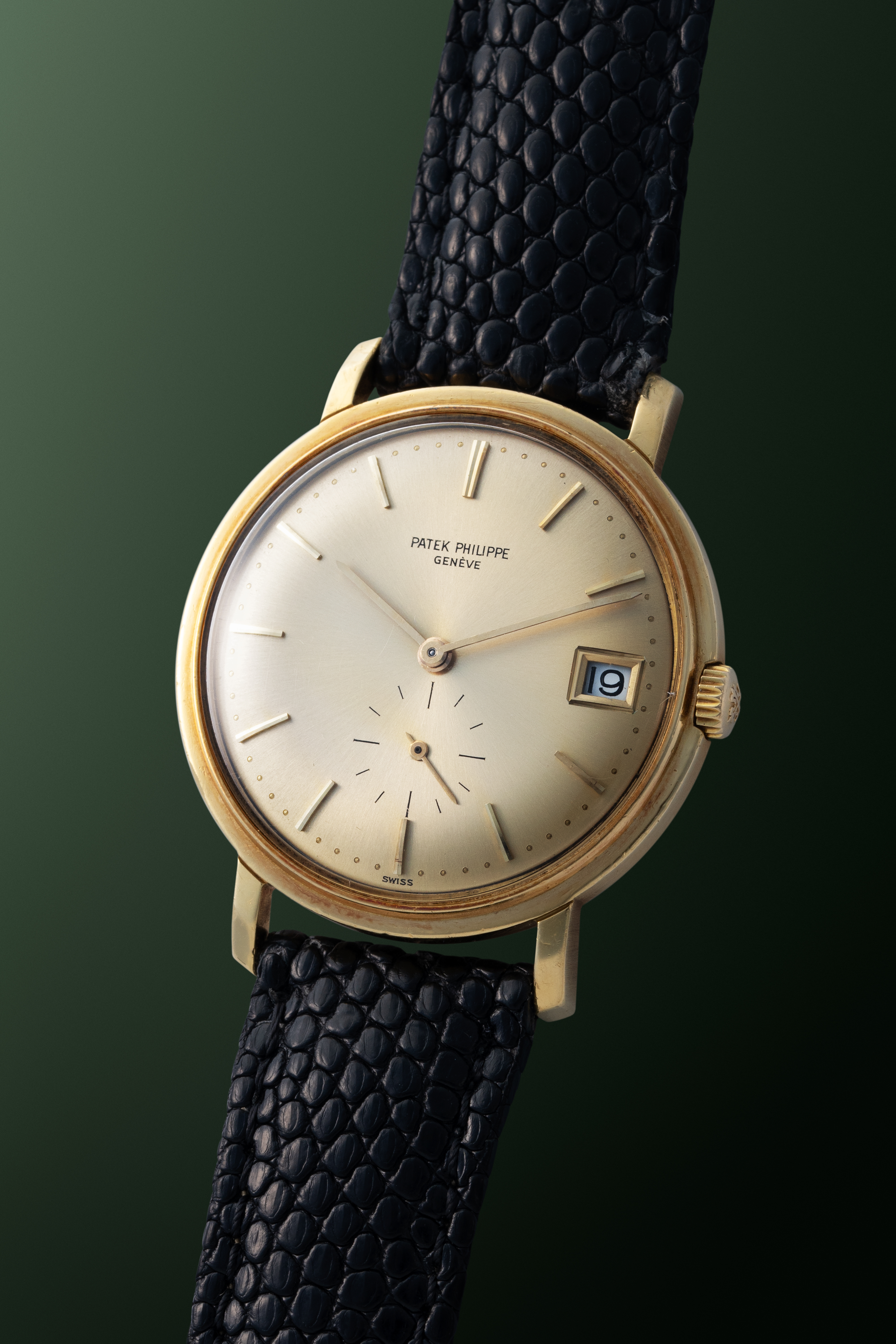 DialDomed champagne sunburst dial with applied yellow gold indices, yellow gold hands, date window at 3 o'clock, small seconds at 6 o'clock, signed 'Patek Philippe' at 12 o'clock