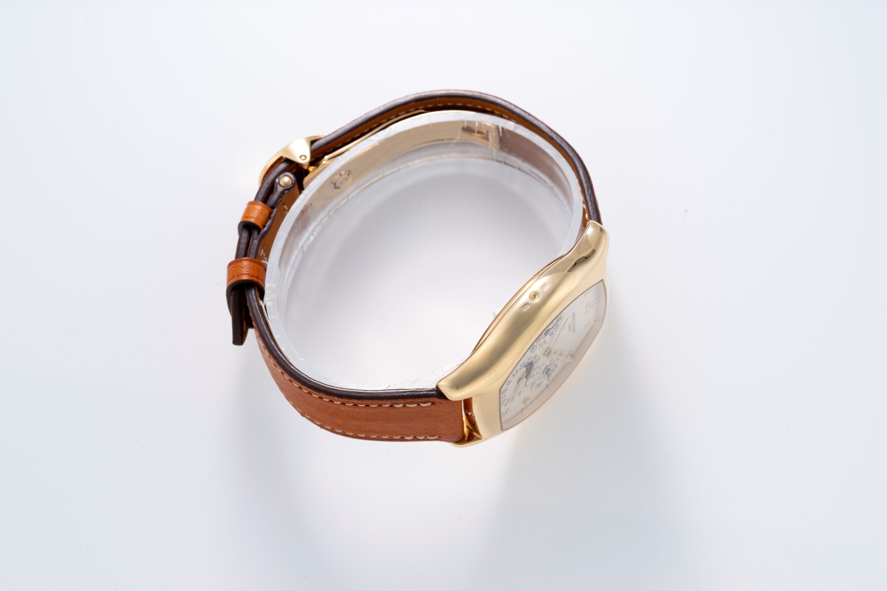 CaseTonneau case in 18k yellow gold with crown at 3 o'clock, calendar pushers at 12, 6, and 9 o'clock