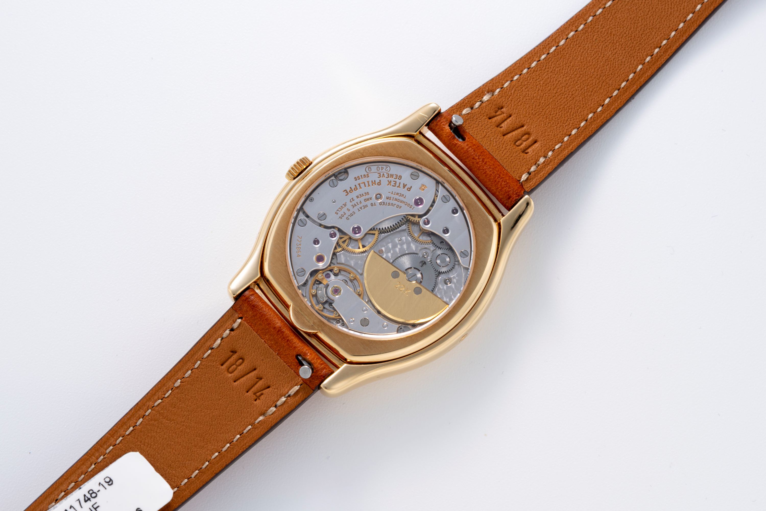 This Patek Philippe Perpetual Calendar Ref. 5040J is a rare and notable example of the brand’s distinctive tonneau-shaped perpetual calendar wristwatch in yellow gold. Produced from 1992 to 2007 in three series, the reference saw approximately 1800 pieces made in yellow gold. The present 5040J is an early first-series example (pre-1998), identifiable by its movement number in the 77xxxx range and its micro-rotor decorated with Côtes de Genève and 22k gold engravings, but without the Calatrava cross. Among its most appealing features are the sigma dial and the applied yellow-gold Breguet numerals—Ref. 5040 being the first Patek Philippe perpetual calendar to use applied Breguet numerals. Equally significant is the presence of the Poinçon de Genève hallmark on the caliber 240 Q, signalling the movement’s high level of finishing. Altogether, this watch presents an excellent opportunity for collectors to acquire an early, uncommon, and highly characterful Patek Philippe perpetual calendar in a refined tonneau case.