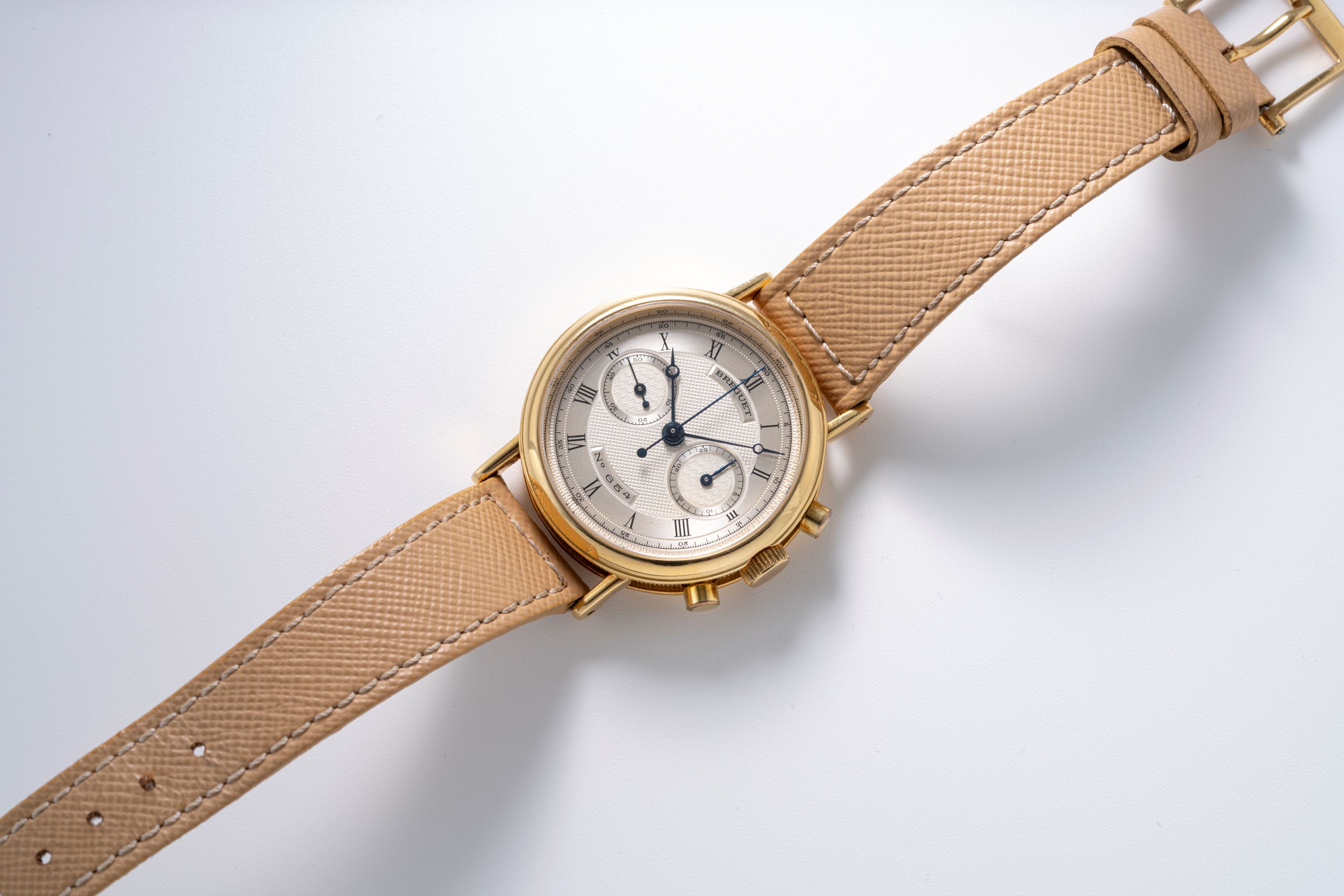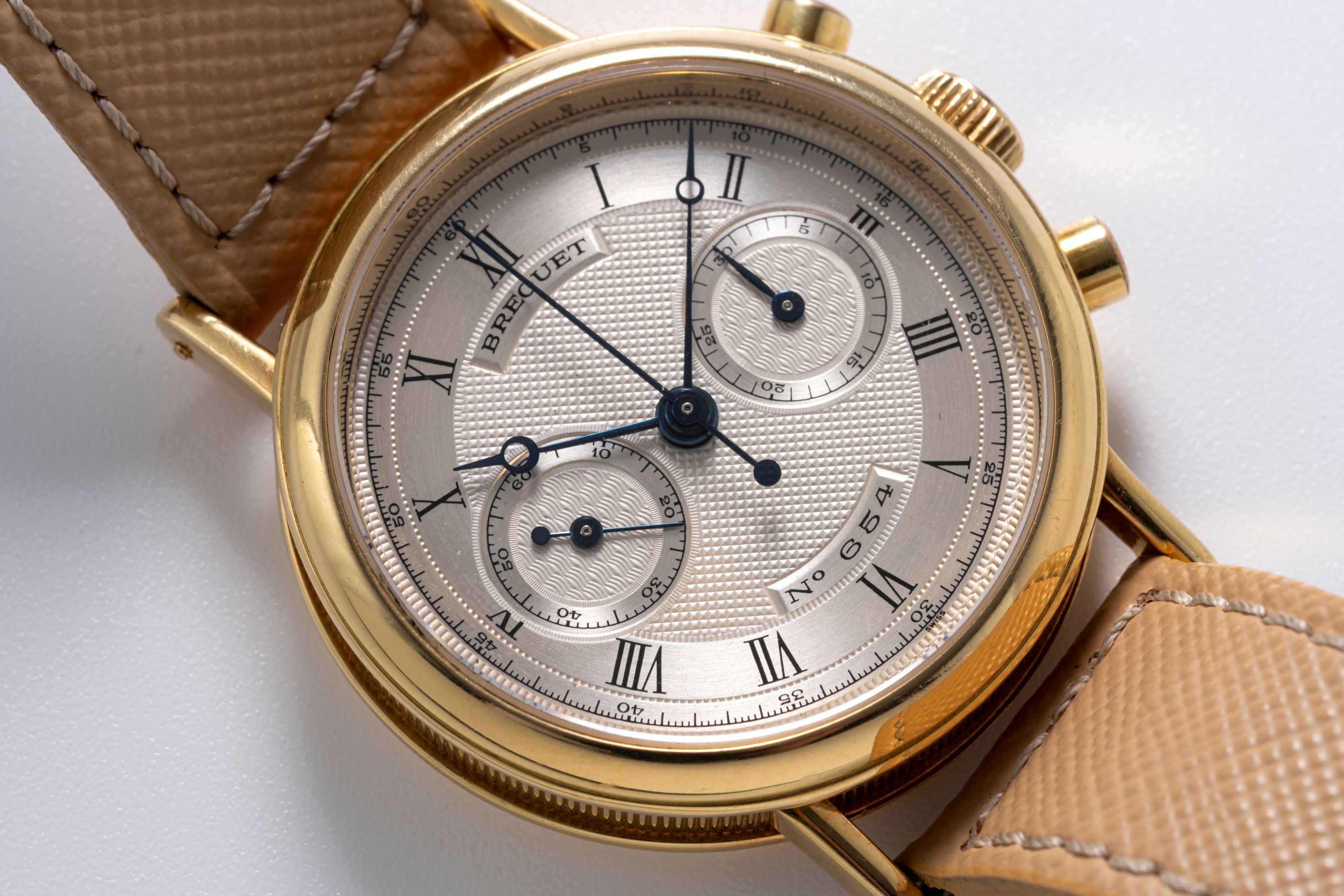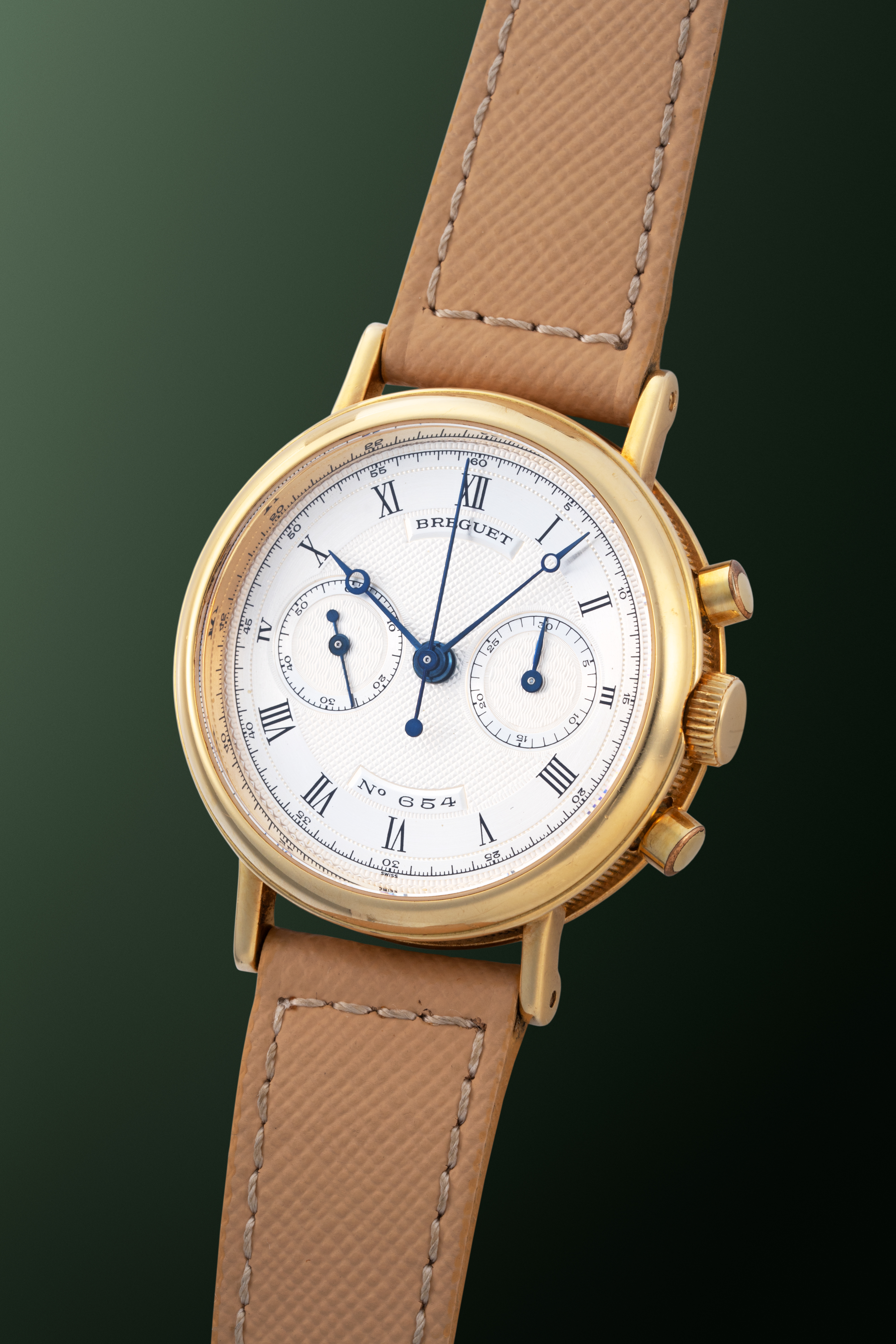 DialSilver guilloche dial with engraved roman numerals, heat-blued Breguet hands, small seconds at 9 o'clock, 30 minute chronograph counter at 3 o'clock, signed 'Breguet' at 12 o'clock