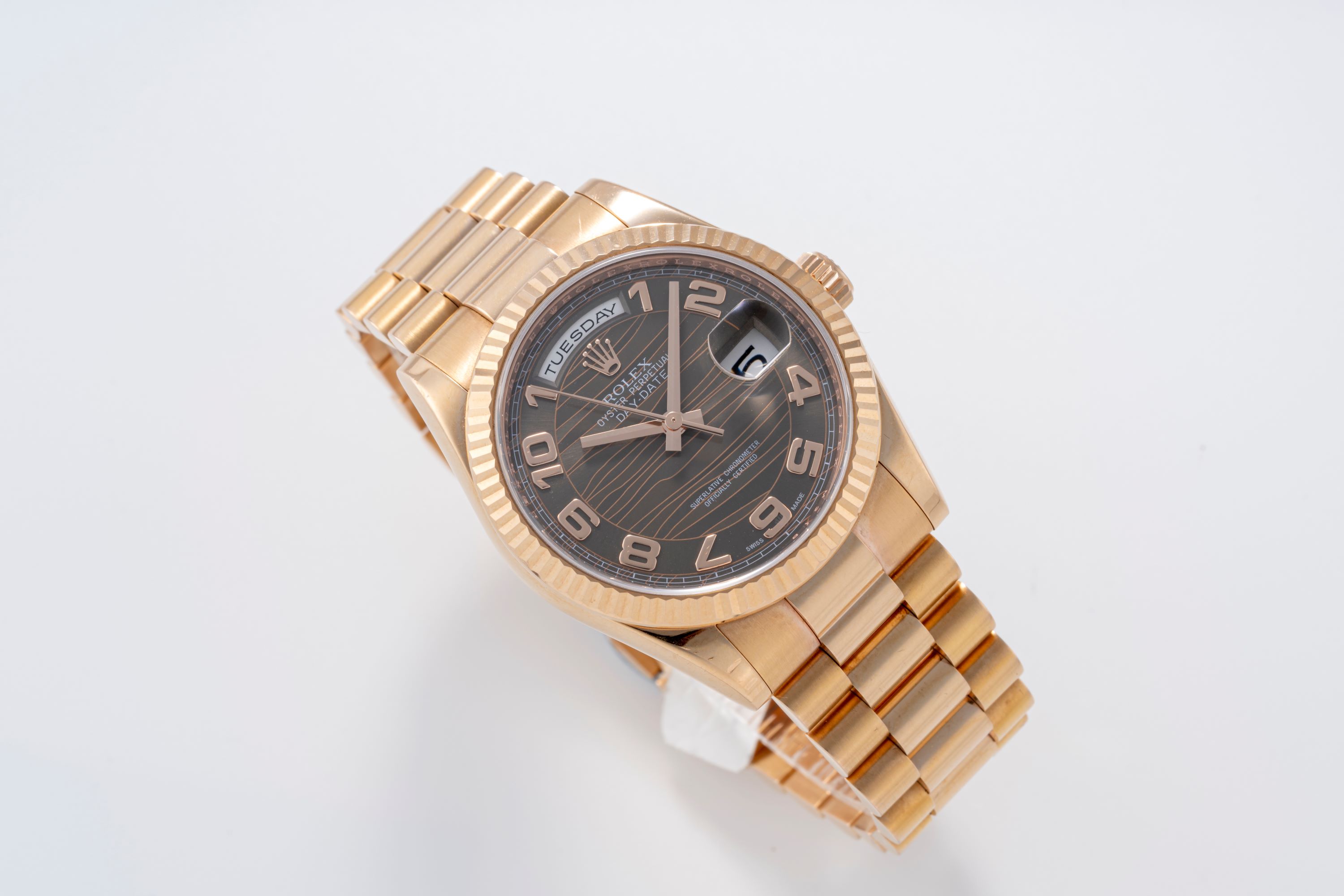 DialBrown wave dial with applied rose gold Arabic numeral hour markers, date calendar at 3 o'clock aperture, day window at 12 o'clock