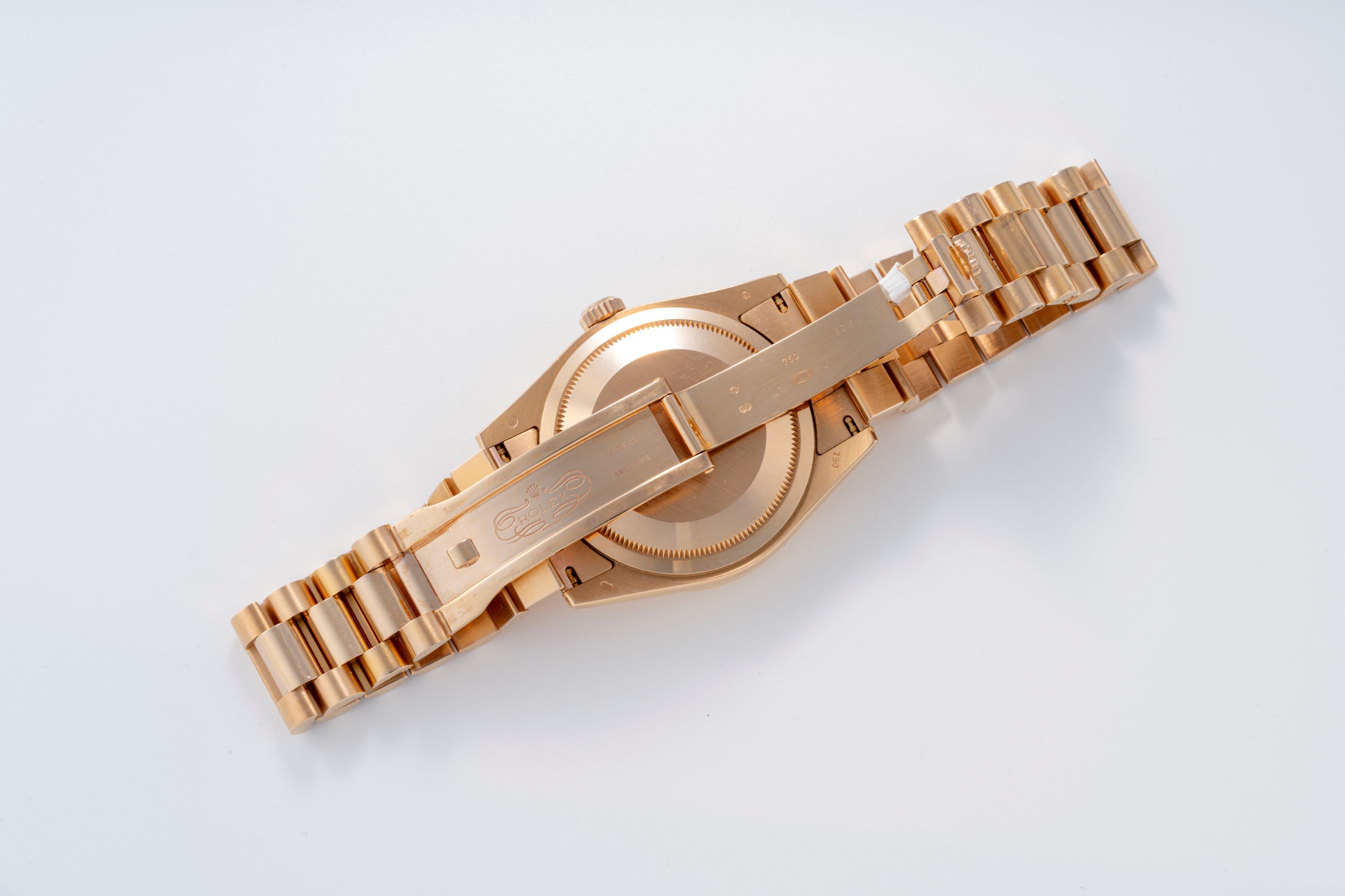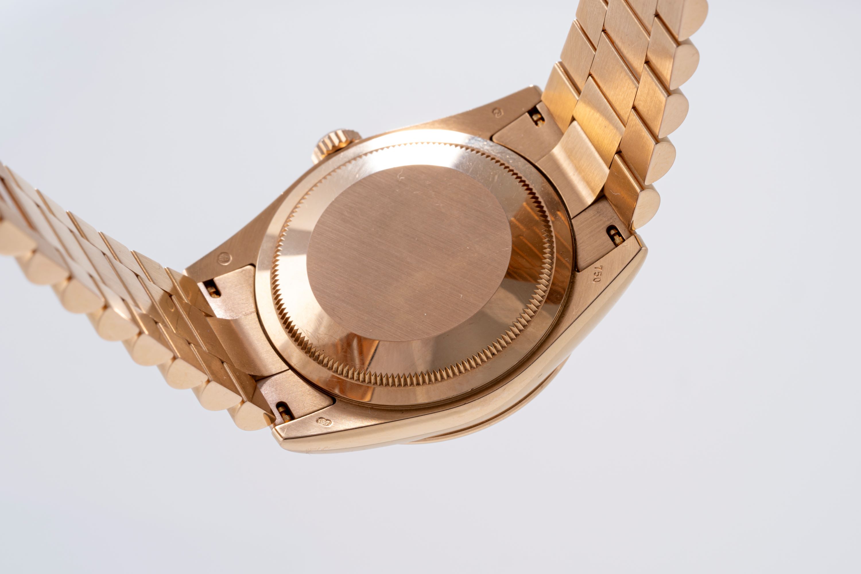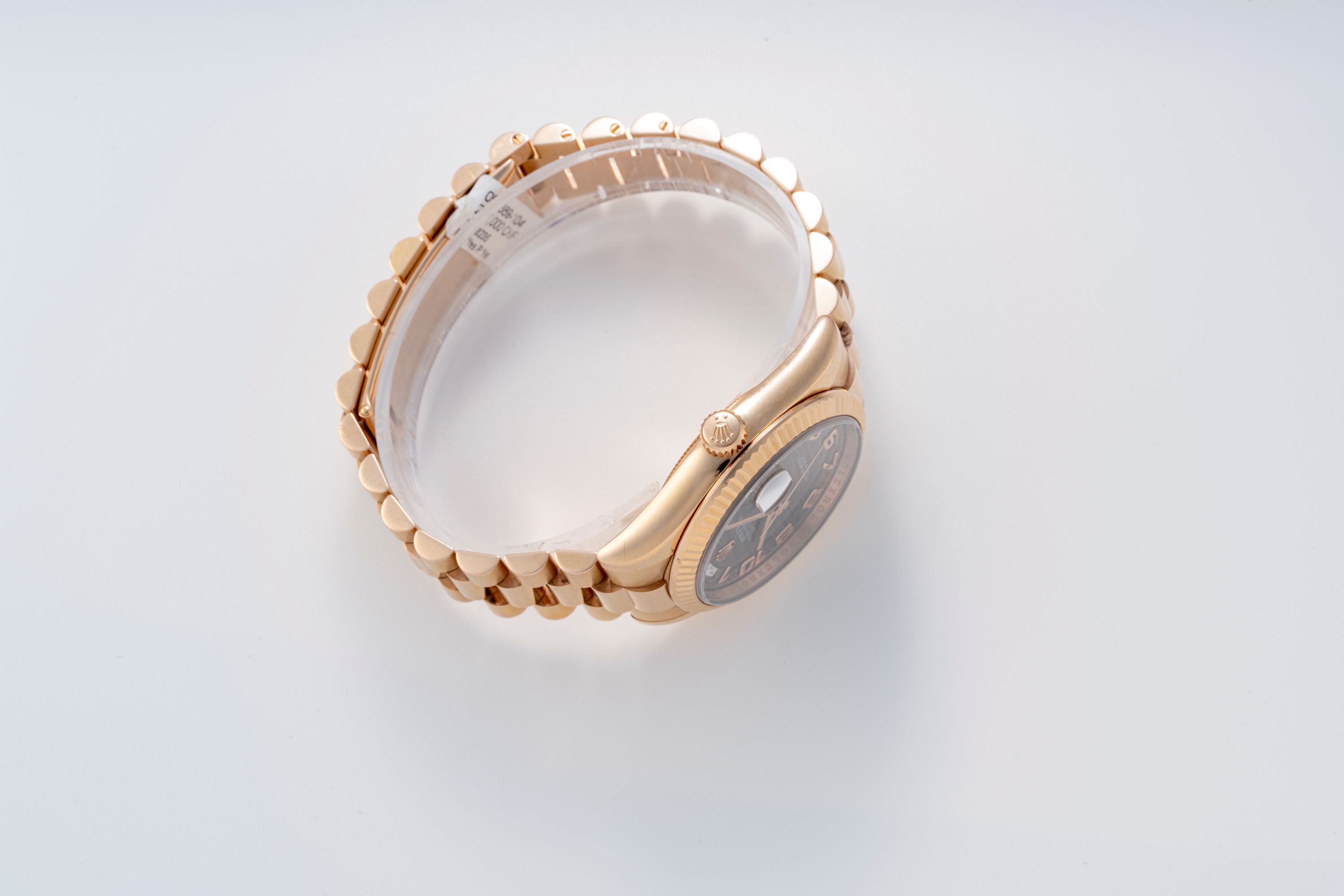 CaseEverose gold case 750/1000 with a fluted bezel, screw-down crown at 3 o'clock, screw-down rose gold caseback