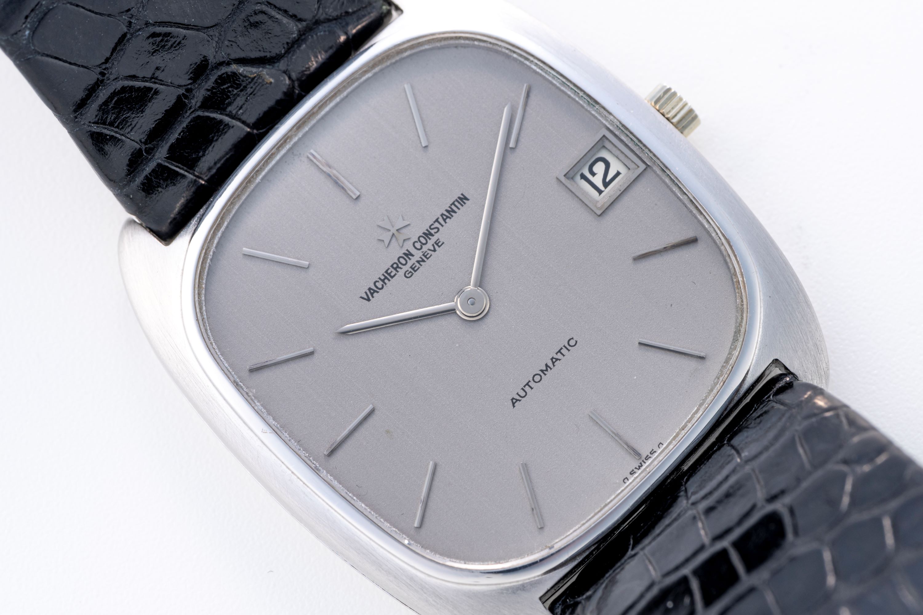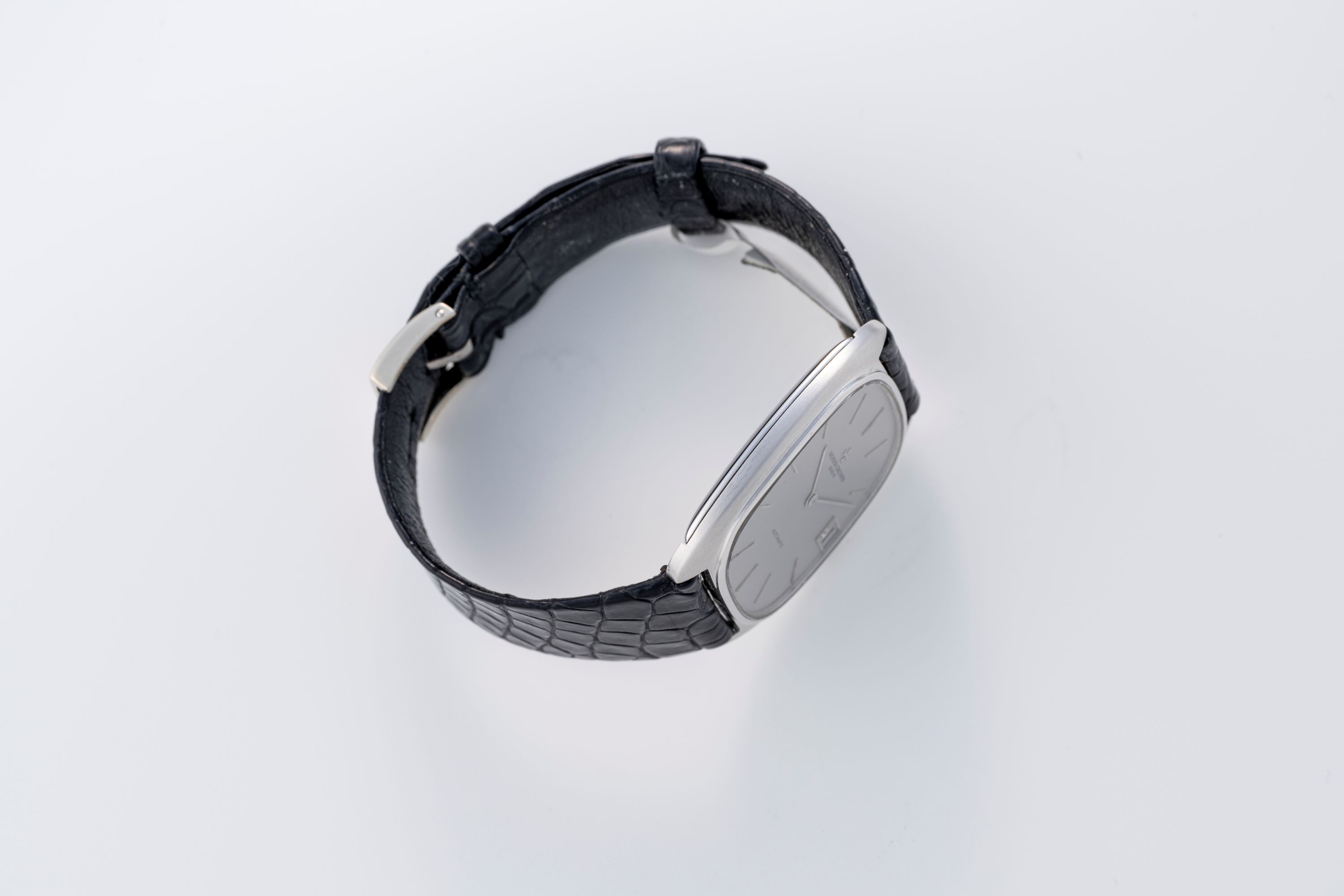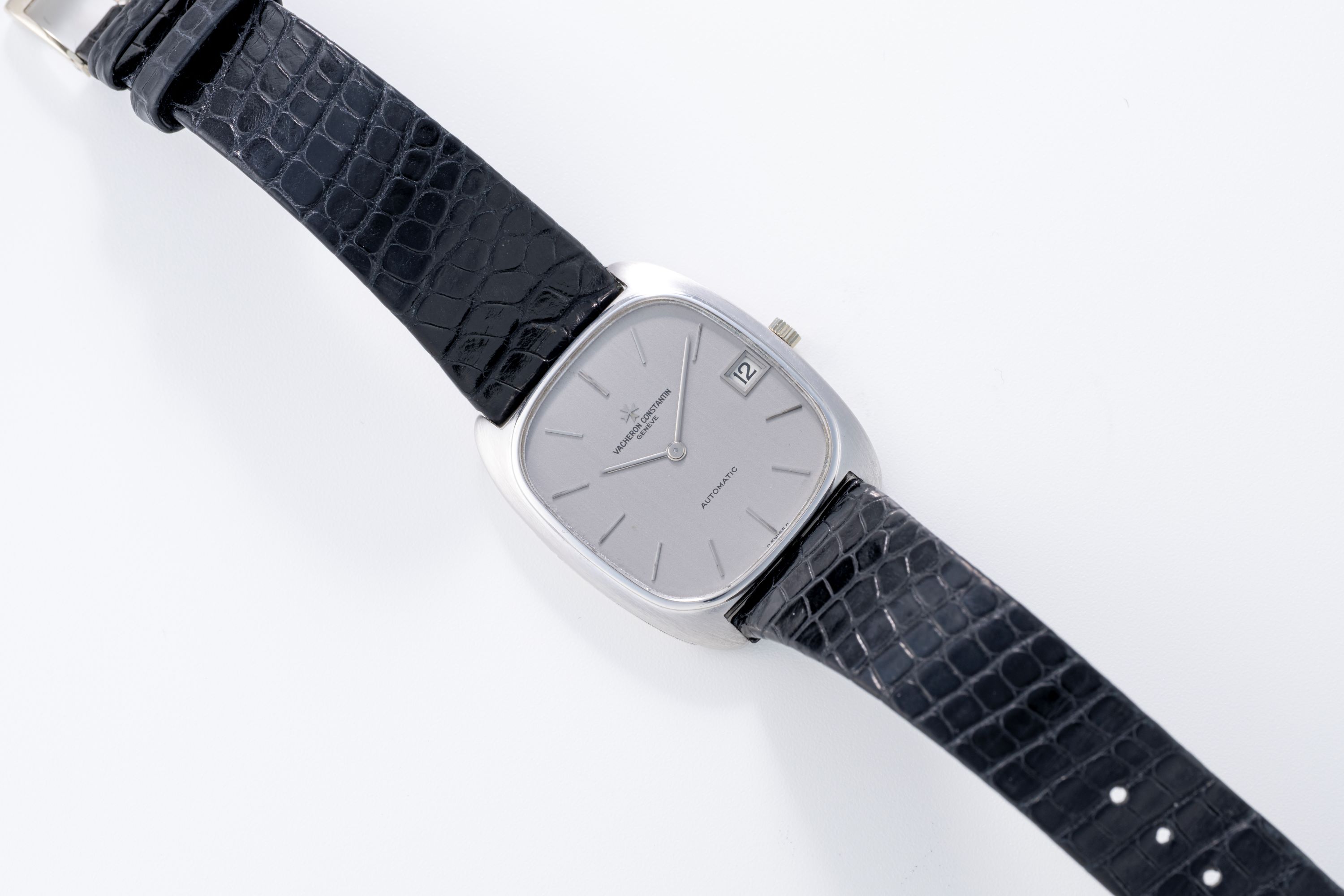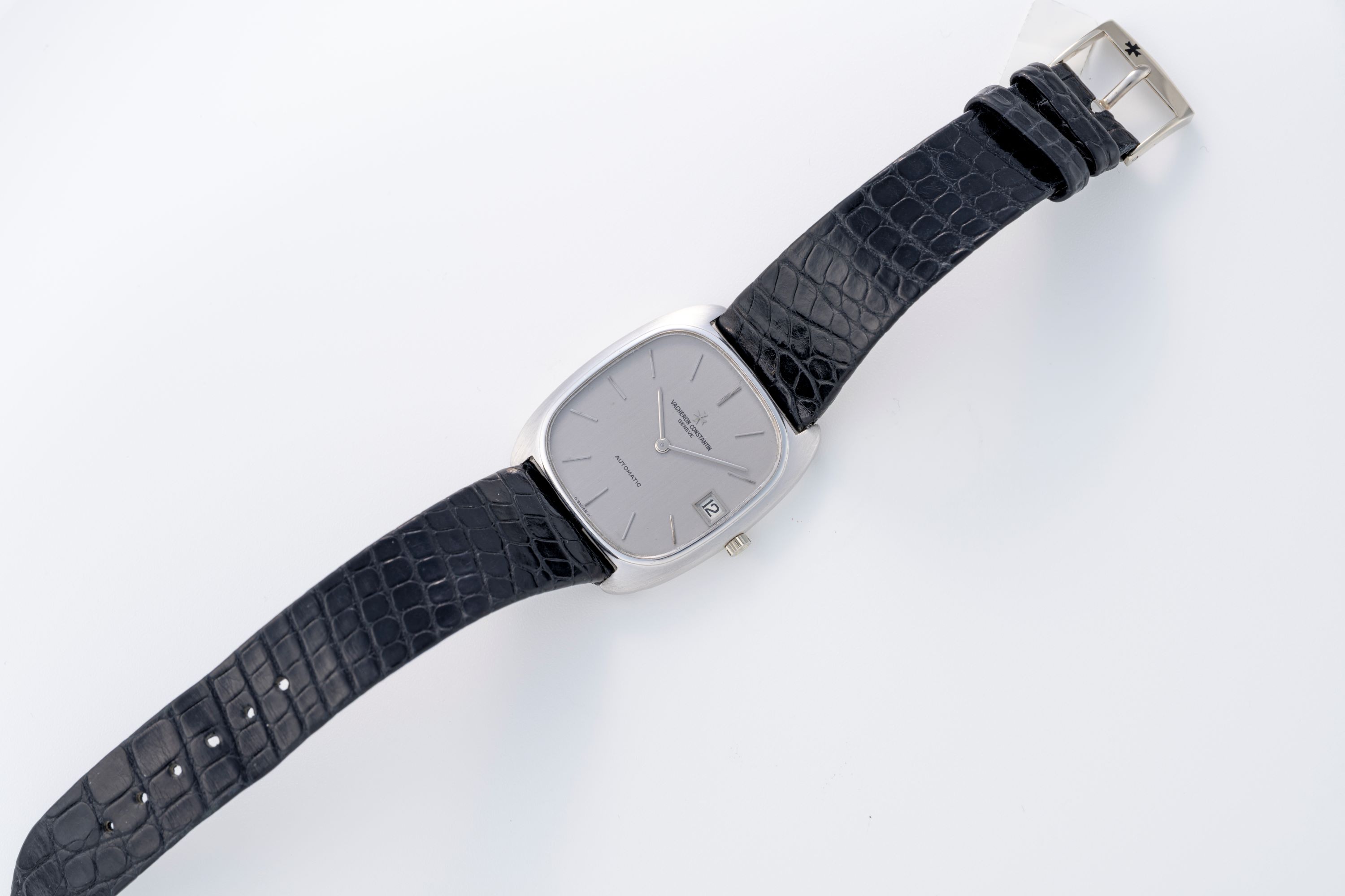 The Vacheron Constantin Ref. 2045Q is a distinguished dress watch from the 1970s that marries the maison’s heritage of refined finishing with a quietly bold case form. Crafted in 18k white gold, this timepiece features a refined cushion case design, less usual than the classic round profile, and underscores Vacheron’s design versatility during the era. The case measures 32.5 x 37 mm and remains impressively slim despite the automatic movement inside.
