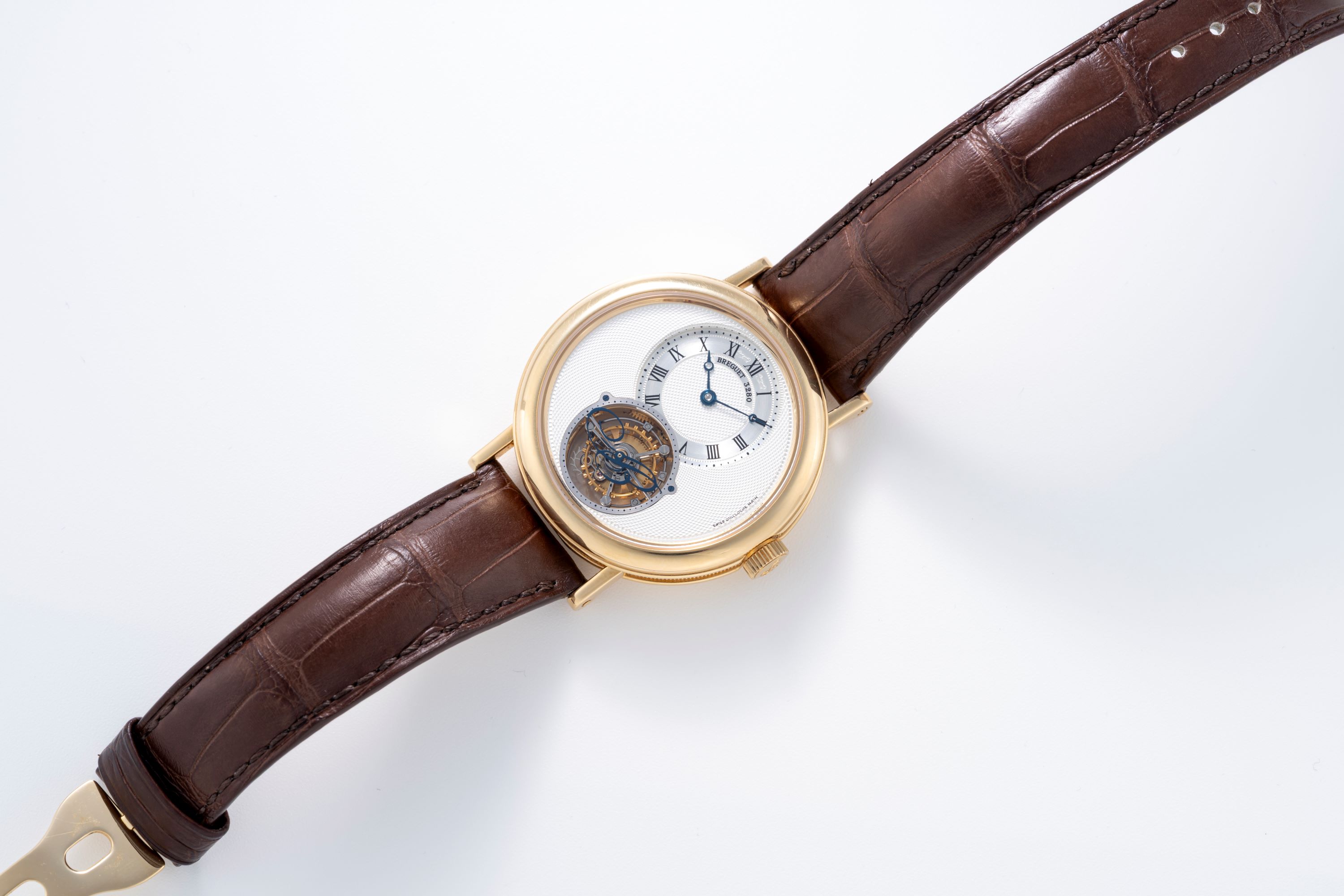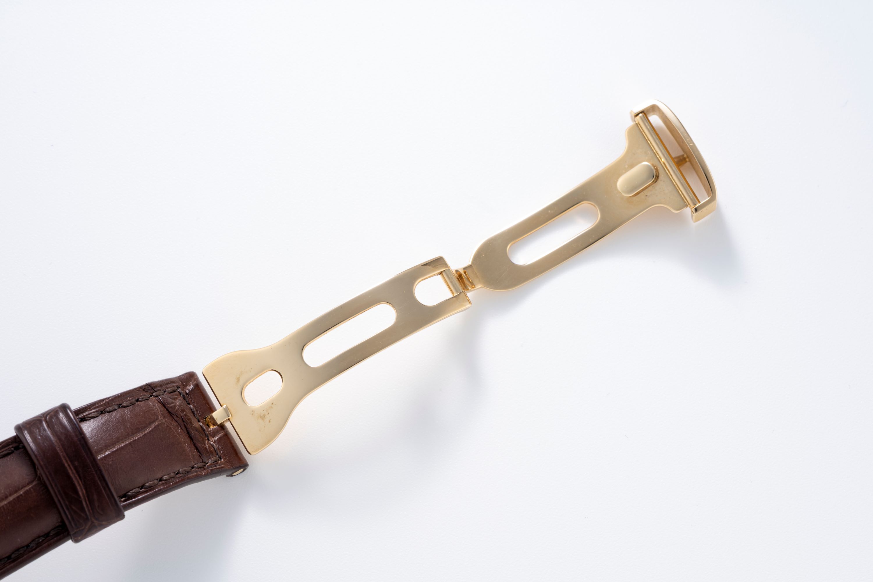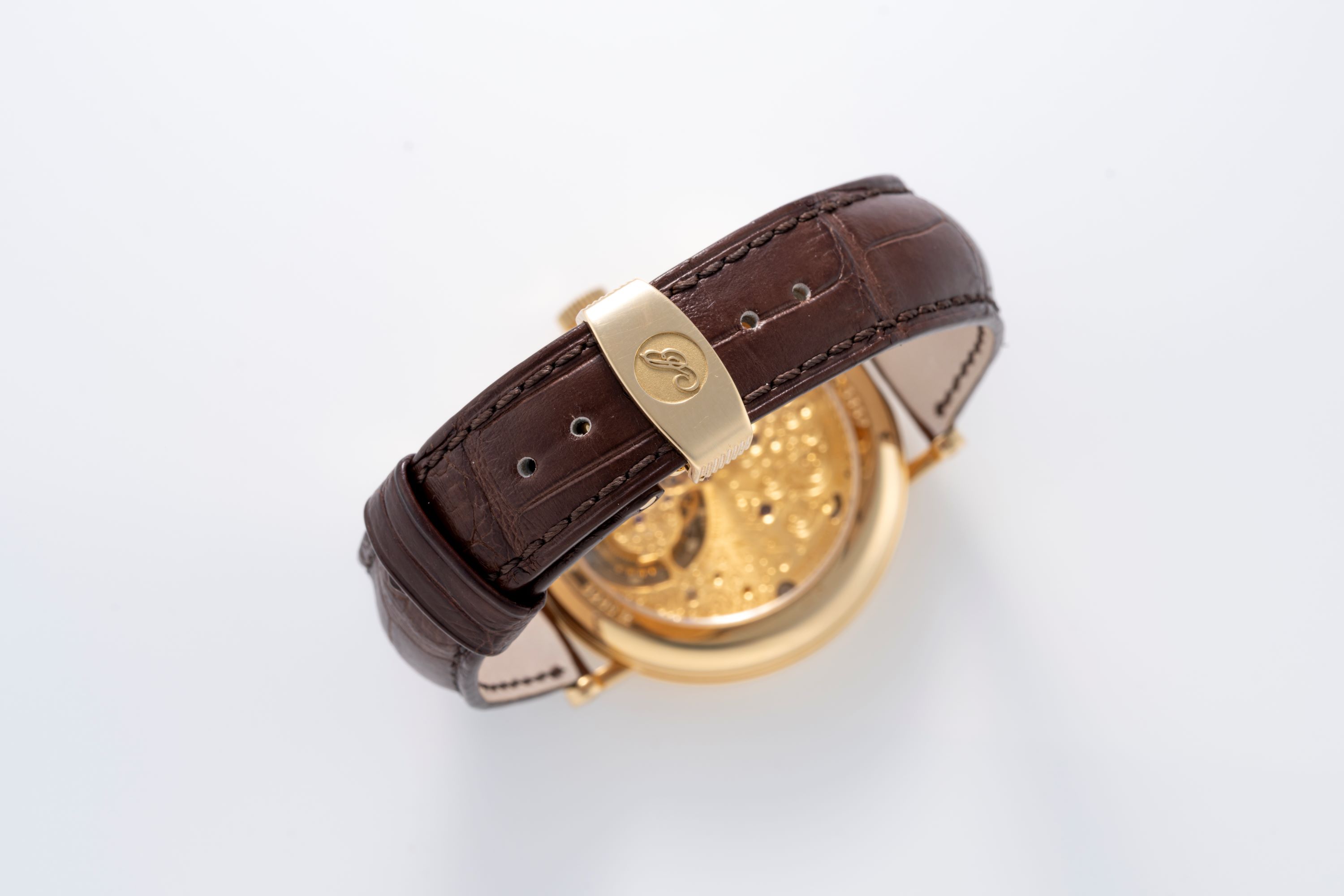 StrapBrown alligator strap, signed ‘Breguet’, double folding clasp in 18k yellow gold, signed ‘Breguet’ with ‘B’ logo embossed on closure