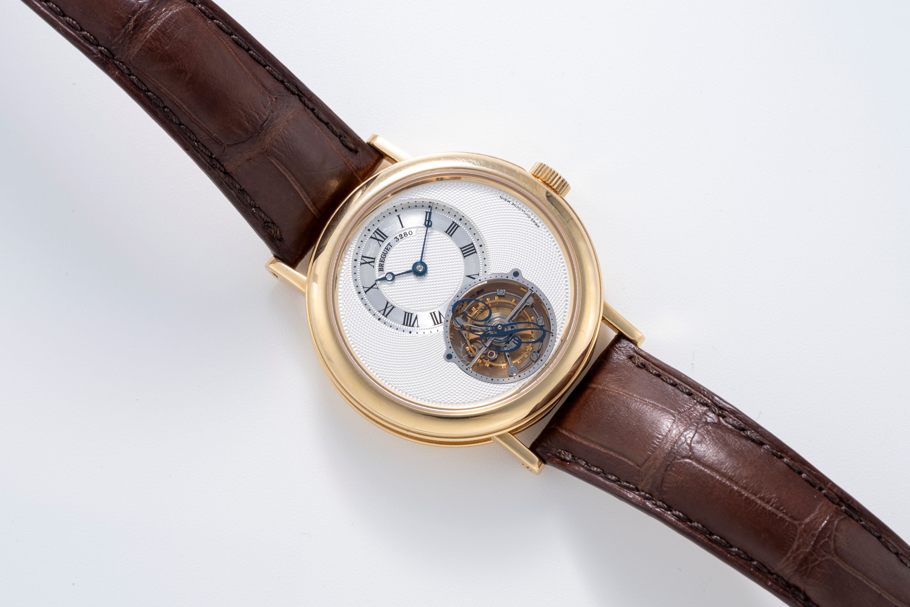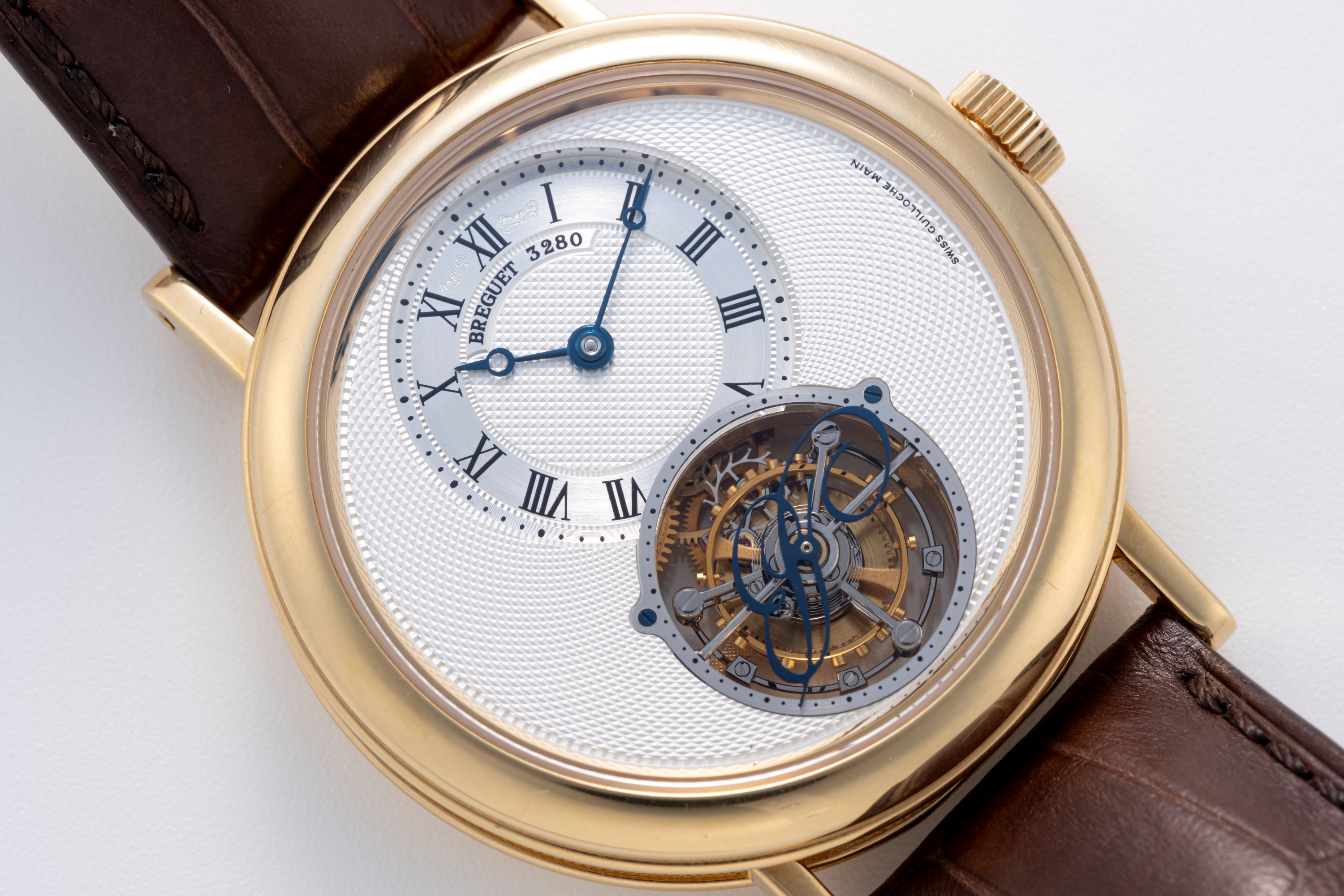 DialSilver plated solid gold dial with hand-made ‘Clous de Paris’, ‘grain de riz’ and ‘filet sautee’ guilloché motifs, main time sub-dial at 12 o’clock signed Breguet with case number, blued steel ‘pomme de Breguet’ hour and minute hands and black printed Roman numerals, two secret Breguet signatures on both sides of XII numeral, blued ‘B’ logo as a small seconds hand on tourbillon shaft at 6 o’clock
