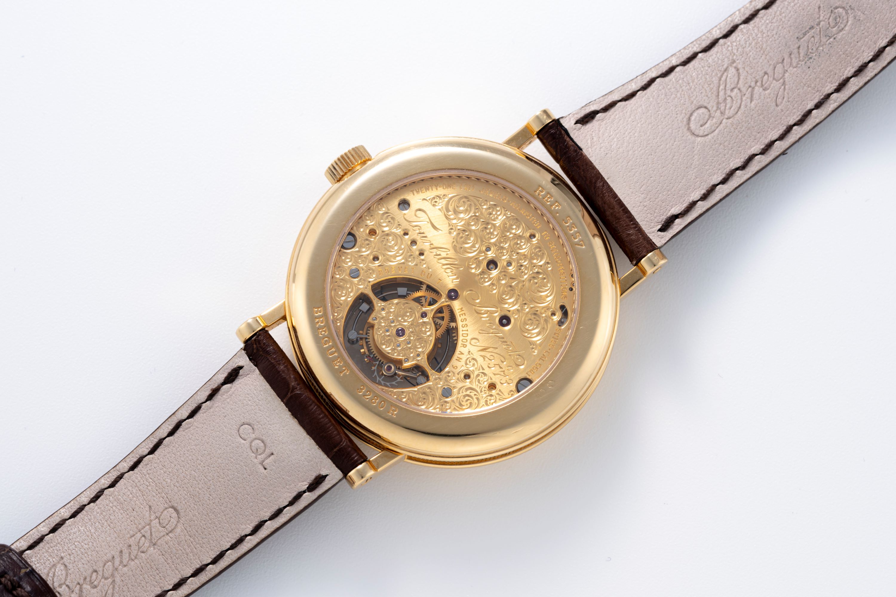 CaseRound case in 18k yellow gold, polished, fixed bezel in 18k yellow gold, polished, ribbed case ring, snap-on exhibition caseback, with engraved Breguet logo, reference and case numbers, winding crown at 3 o’clock with ‘B’ logo embossed