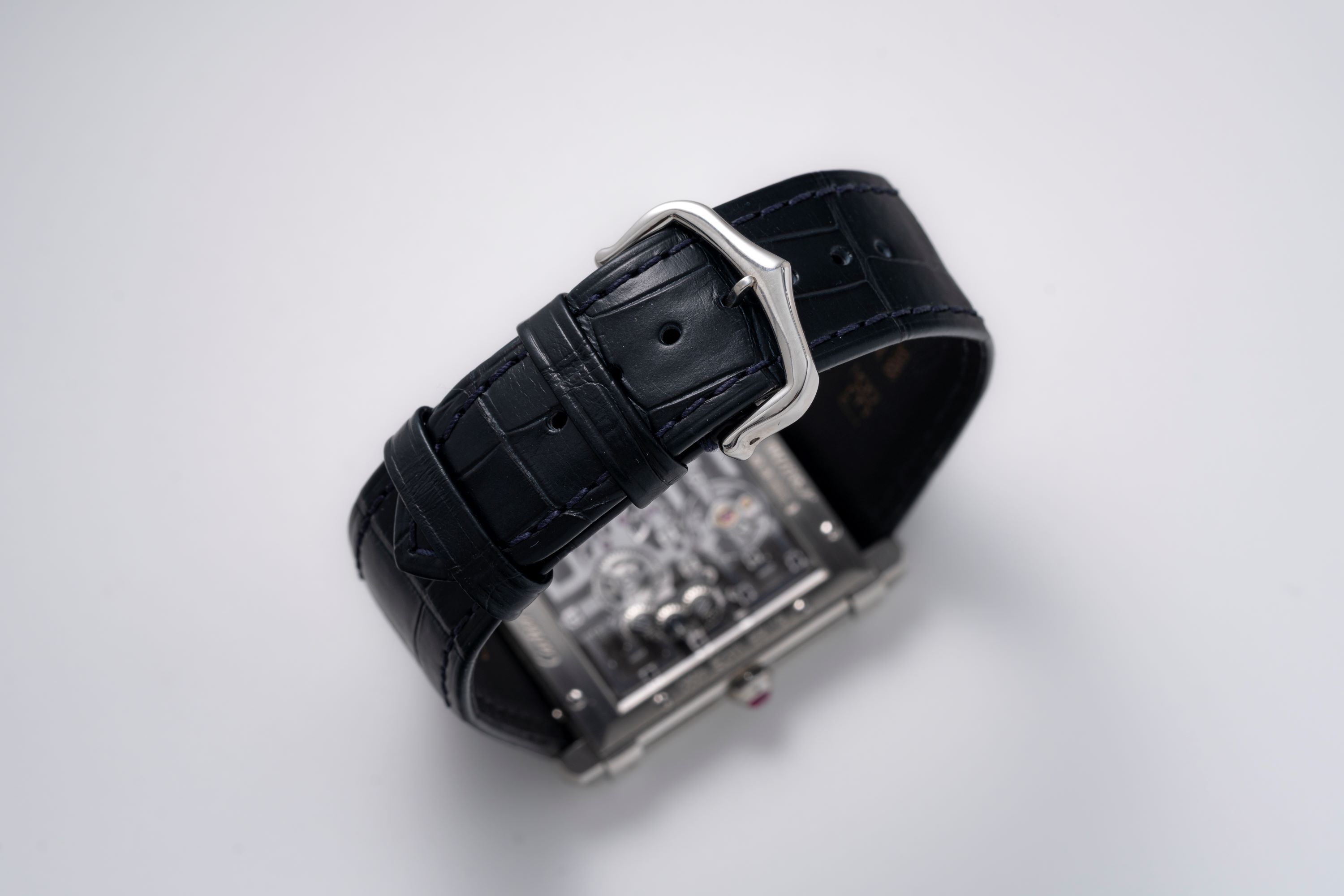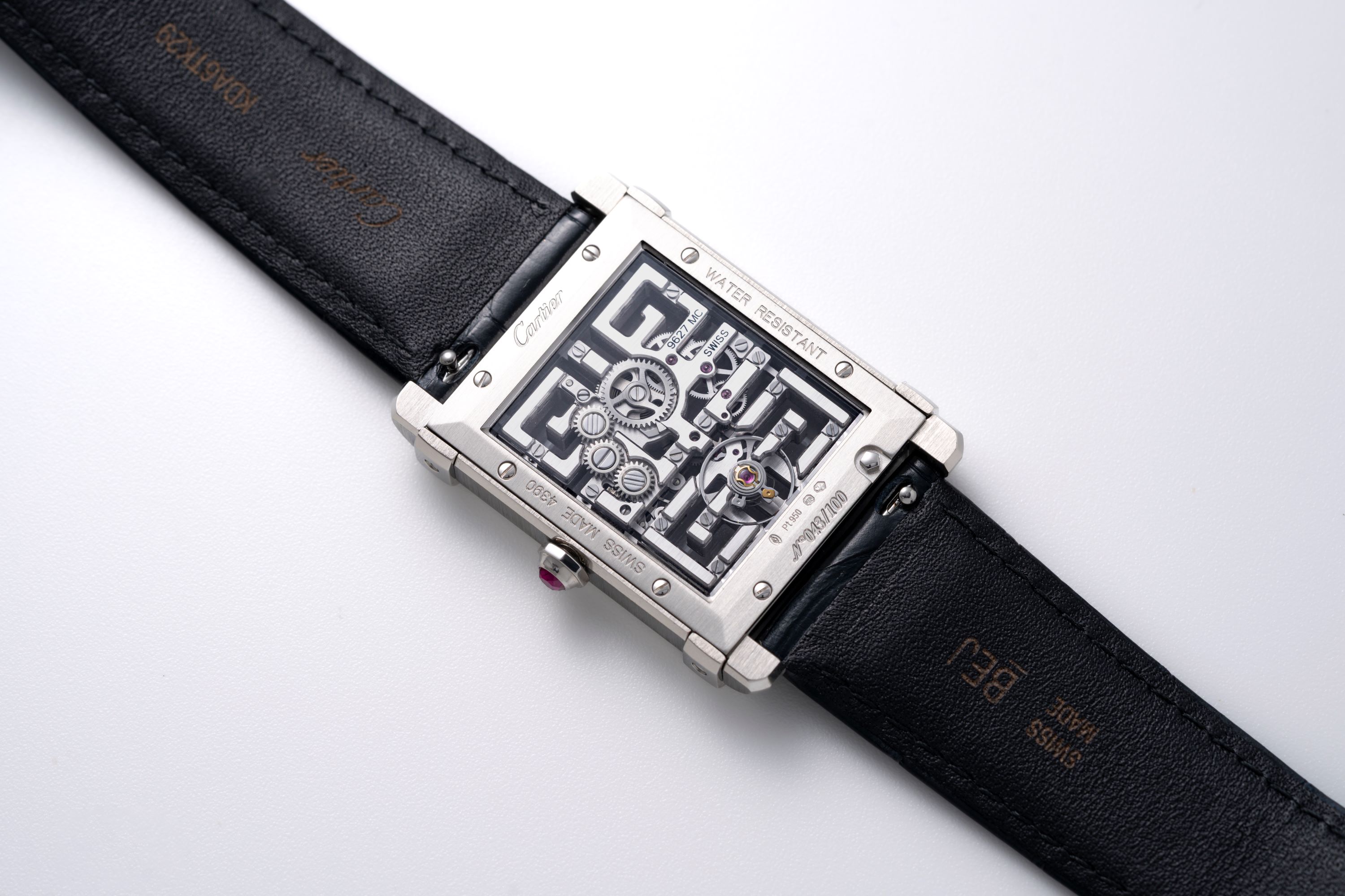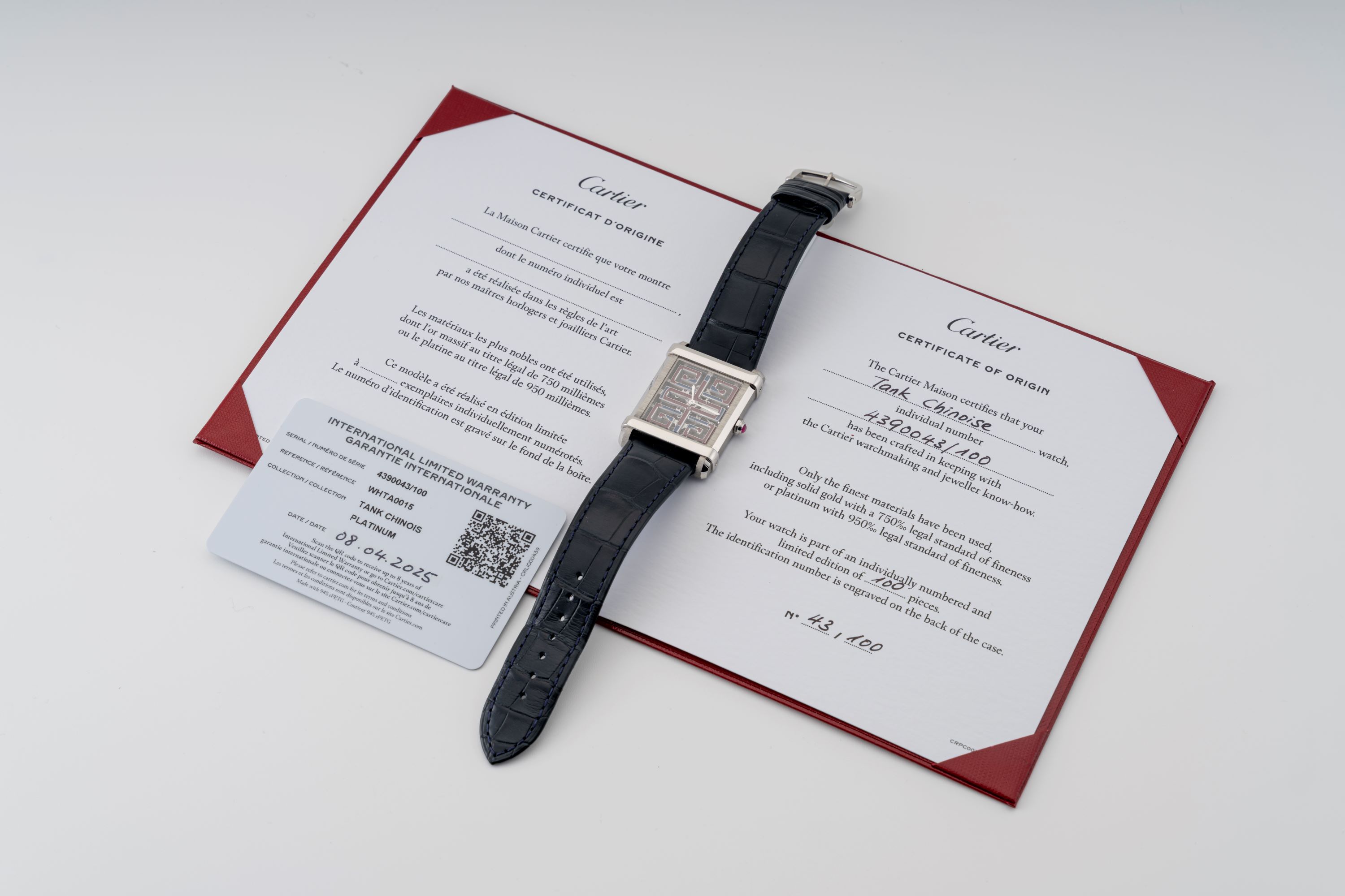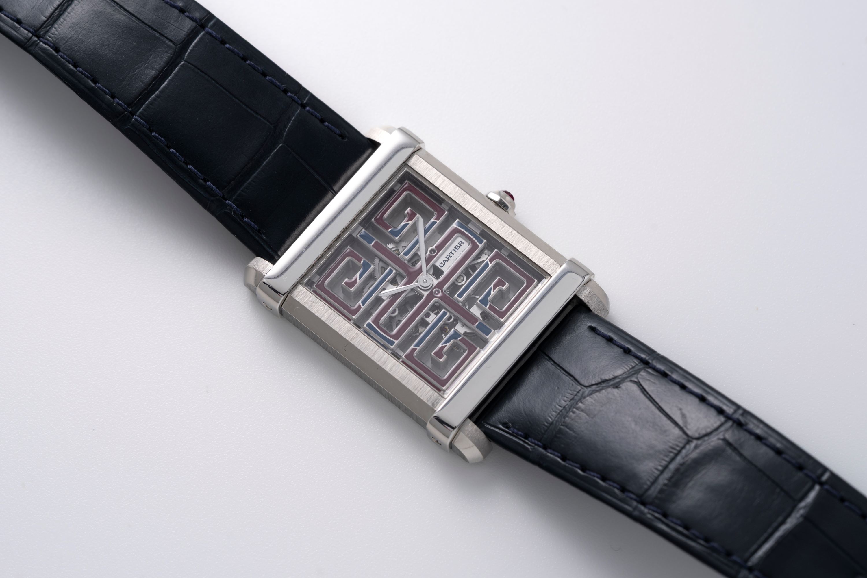 The Cartier Tank Chinoise Skeleton Ref. CRWHTA0015 is a striking contemporary reinterpretation of one of the maison’s most culturally inspired designs. First introduced in 1922, the Tank Chinoise drew from the architectural forms of Ancient Chinese temples and porticos, expressing refinement through geometry and symmetry. The modern skeletonized edition pays tribute to this heritage while showcasing Cartier’s development in mechanical movement manufacturing. The case is entirely made from Platinum and retains the Tank’s iconic shape while reimagining the Chinoise’s signature crossbars with layered horizontal structures that echo the lintels of traditional Chinese gateways. Measuring in at 28 x 39mm, the watch balances presence and elegance, enhanced by brushed and polished surfaces as well as characteristic architectural lines.