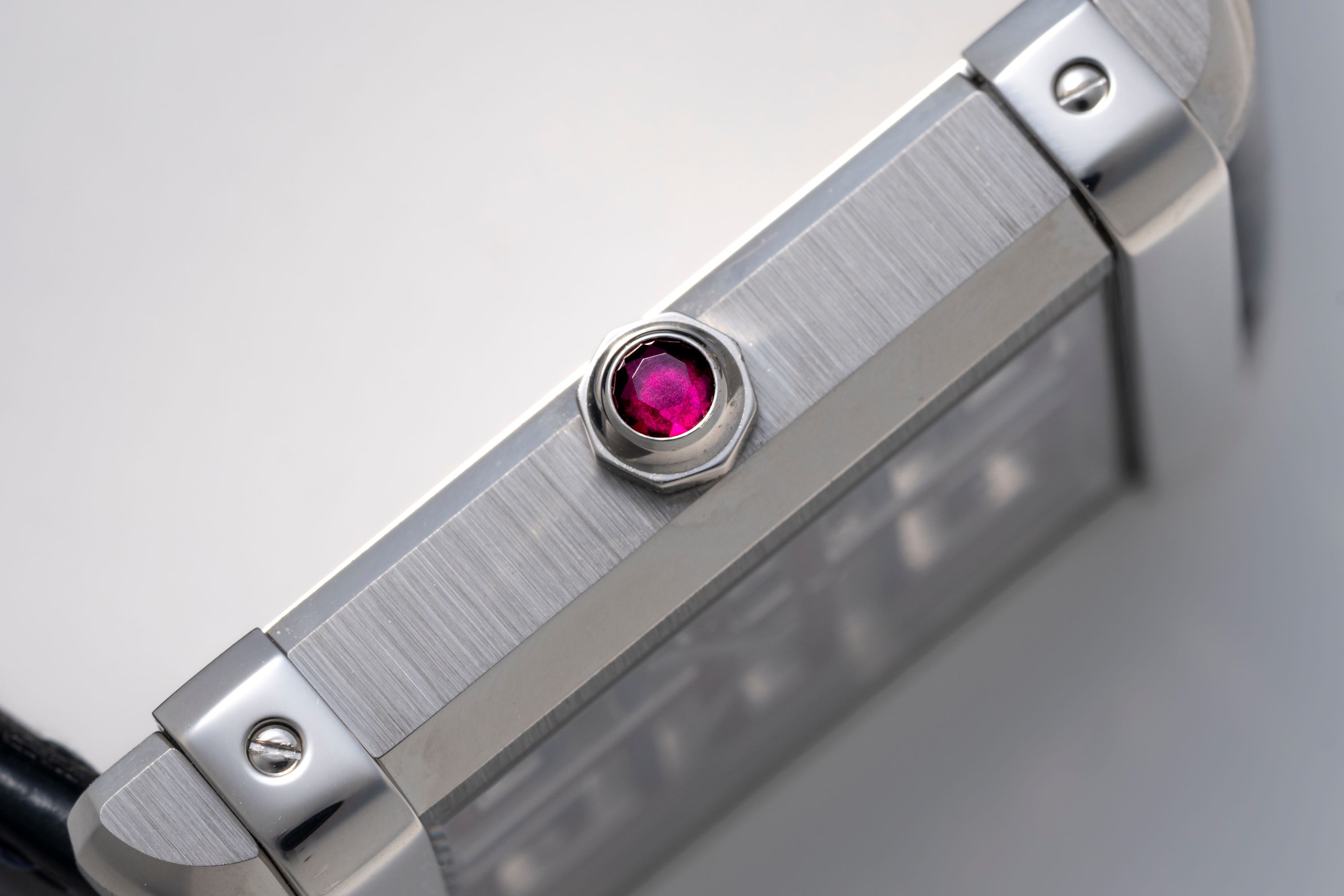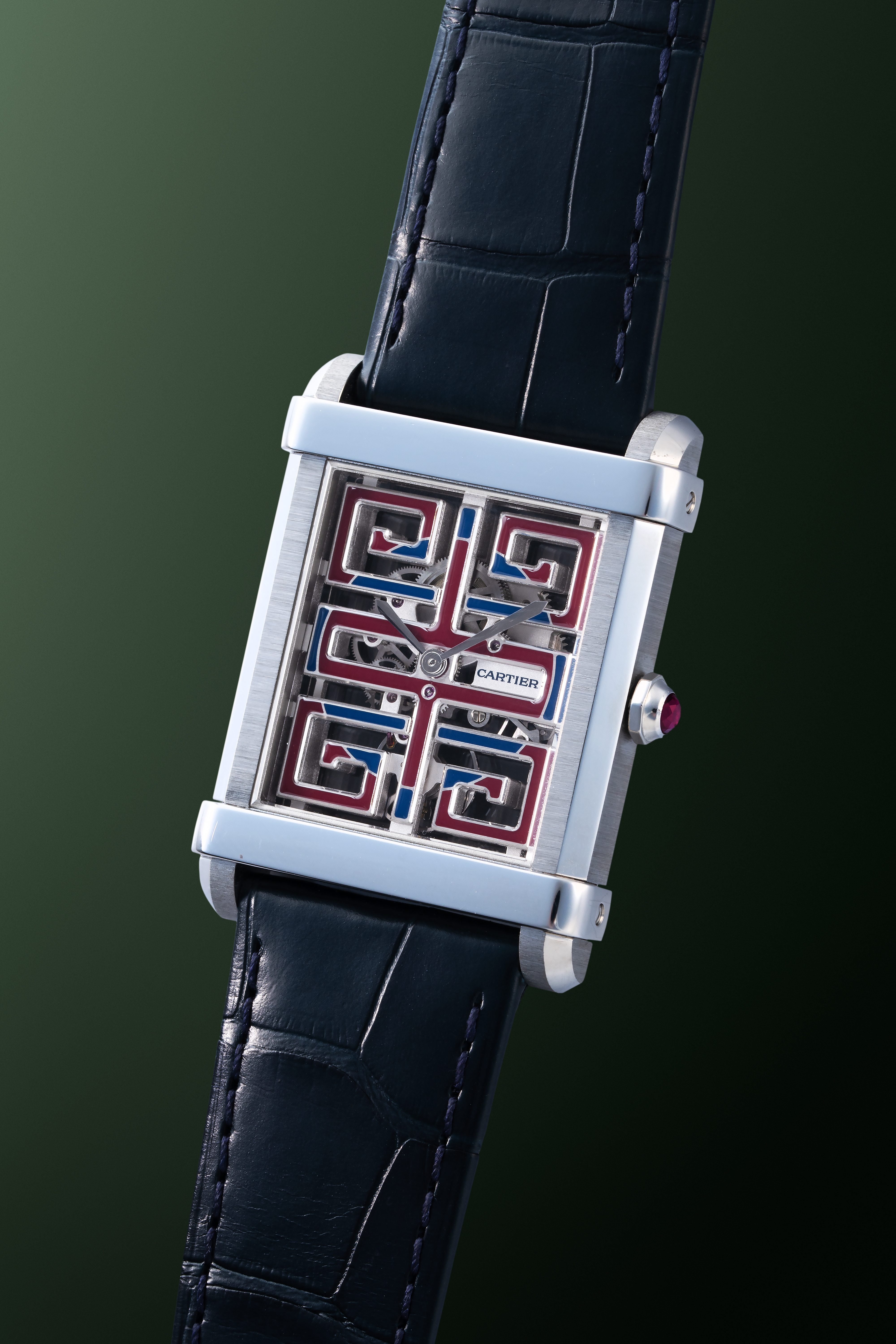 DialOpenworked dial with red and blue enamel inlays, white gold sword hands, signed 'Cartier' at 3 o'clock
