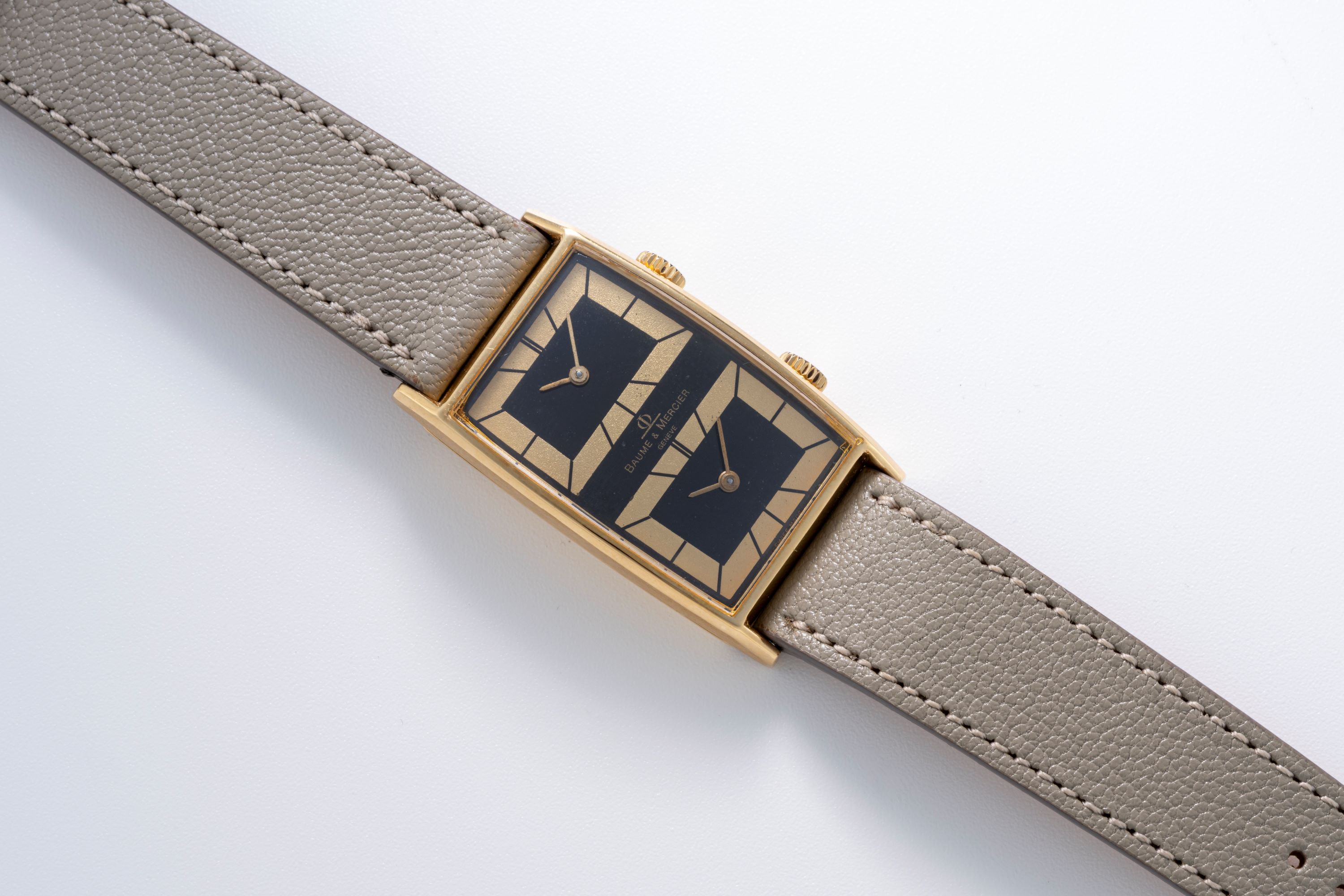 DialBlack lacquer dial with two gold sections for the two hour and minute displays, golden hands, signed 'Baume & Mercier' in the center of the dial