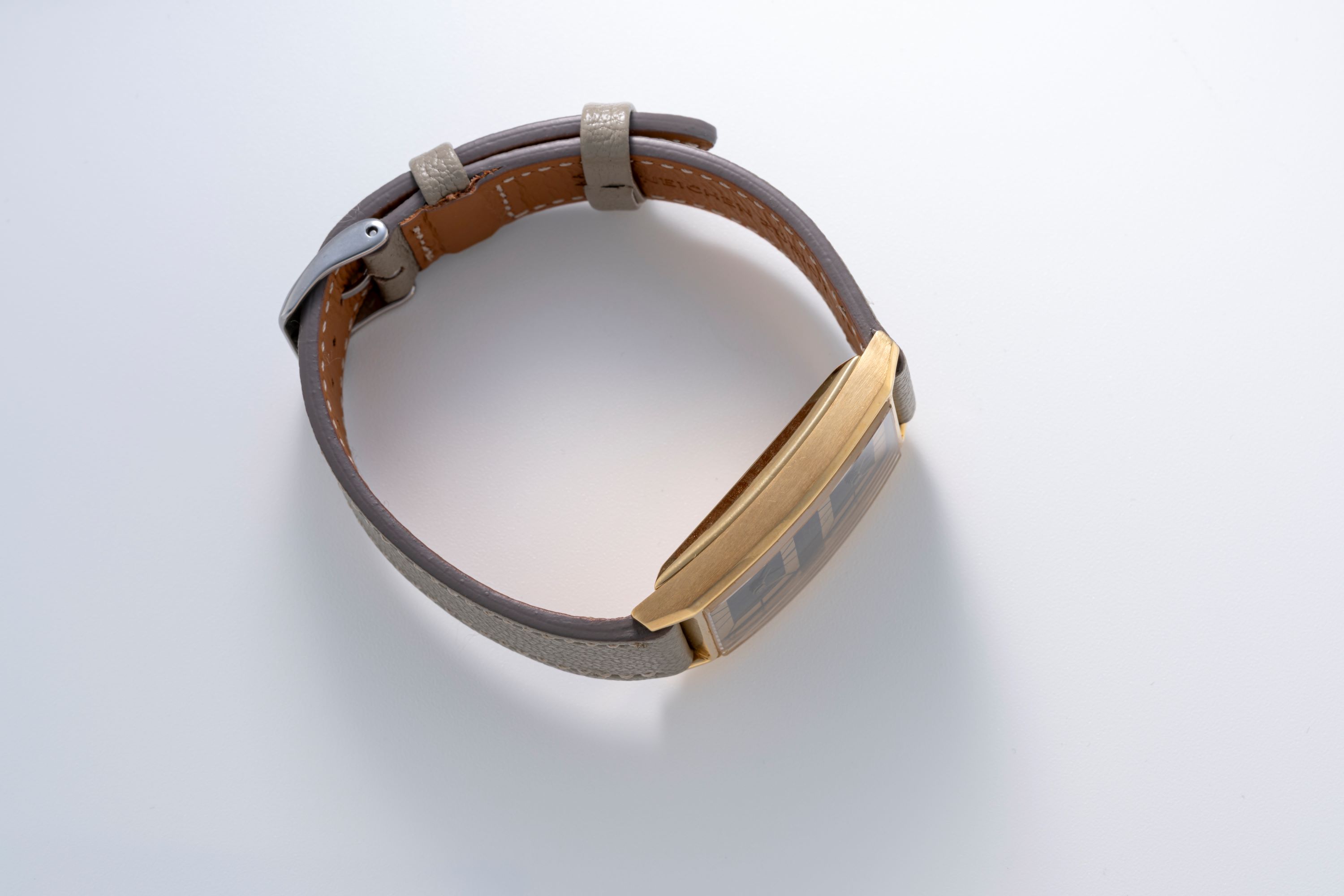 CaseRounded rectangular case in 18k yellow gold with two indepenent winding crowns on the right side of the case, solid caseback