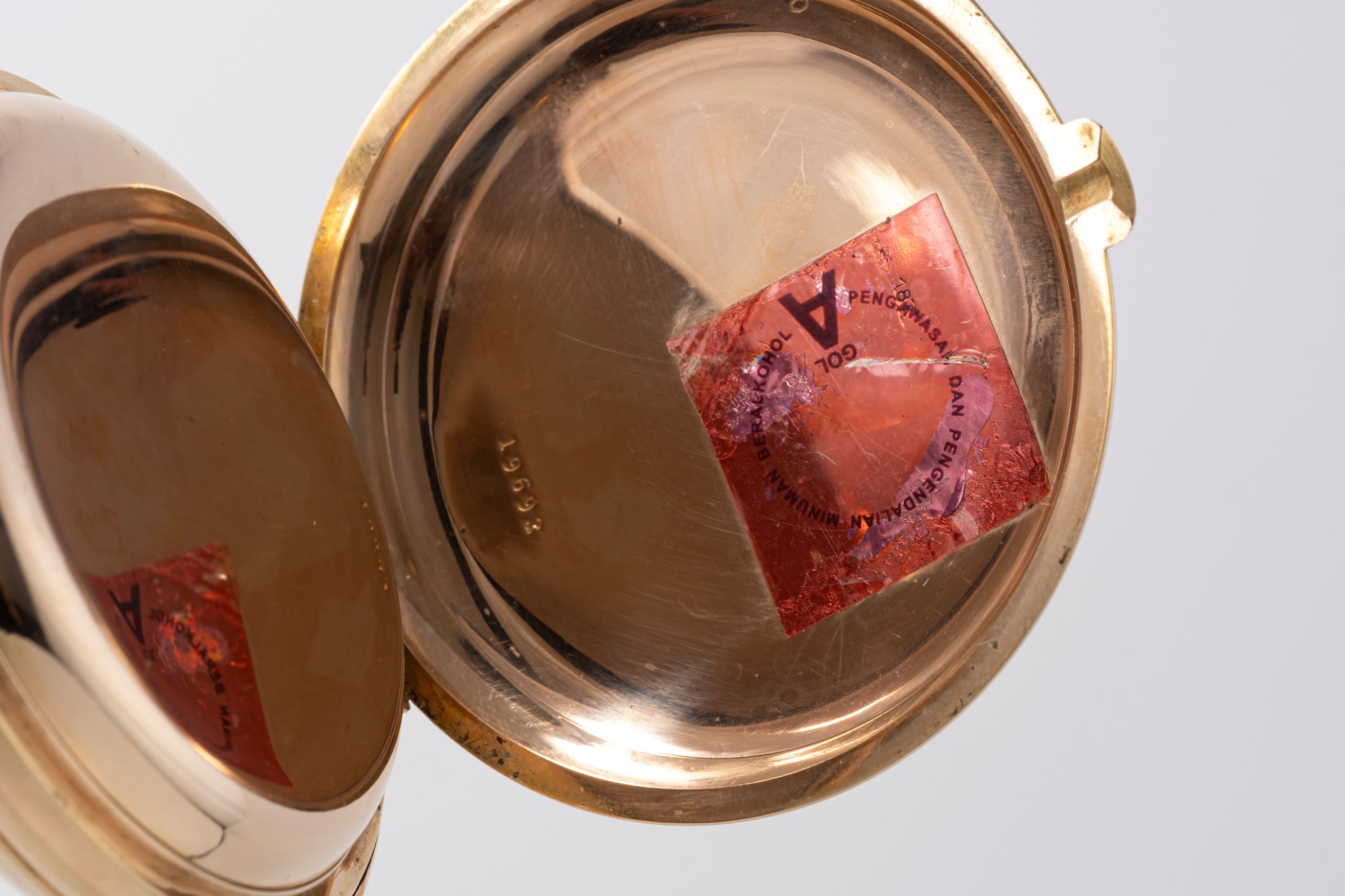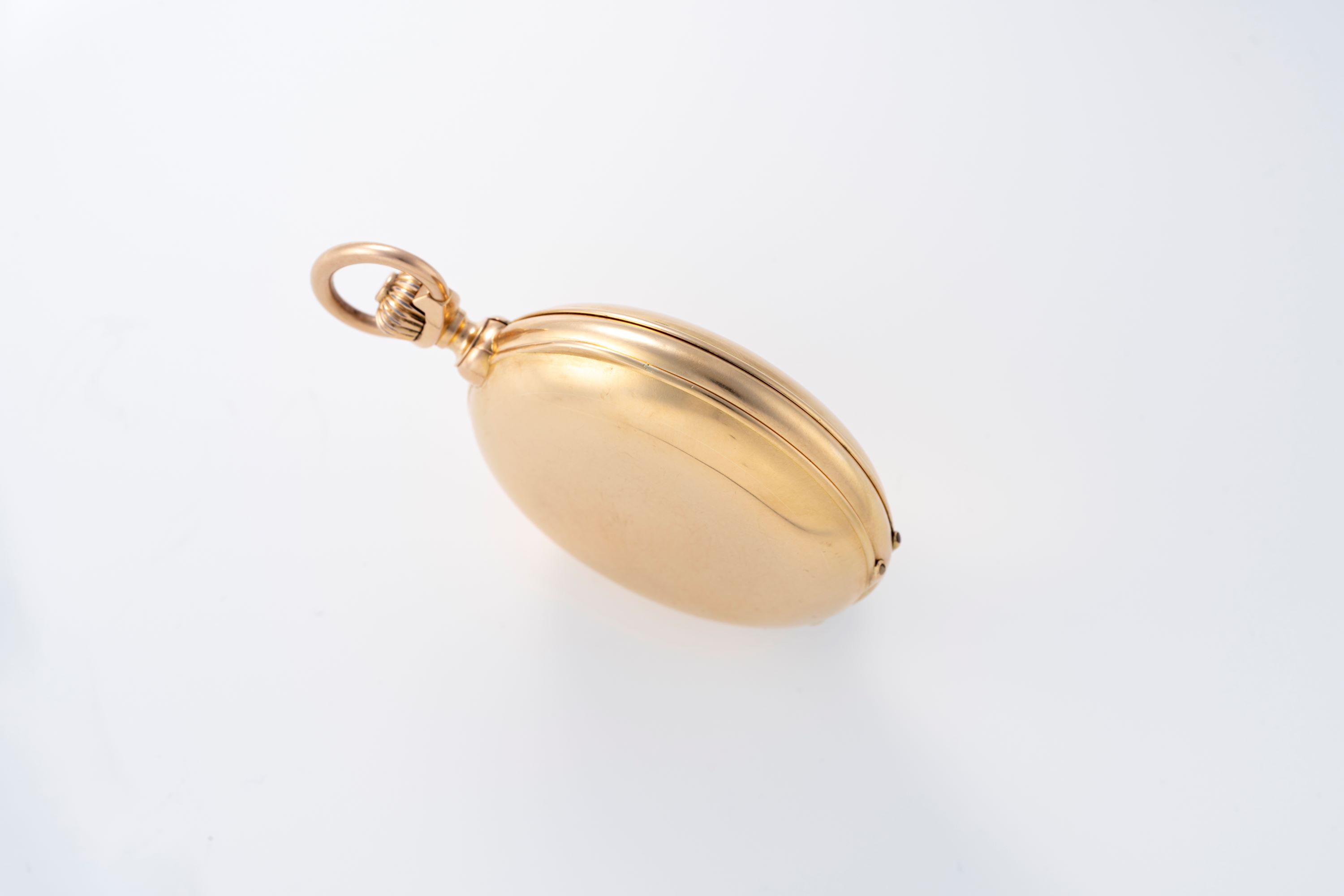CaseRound case in 18k rose gold with chain loop, winding crown and savonette lid release button at 3 o'clock, double lid caseback with plexi glass display caseback