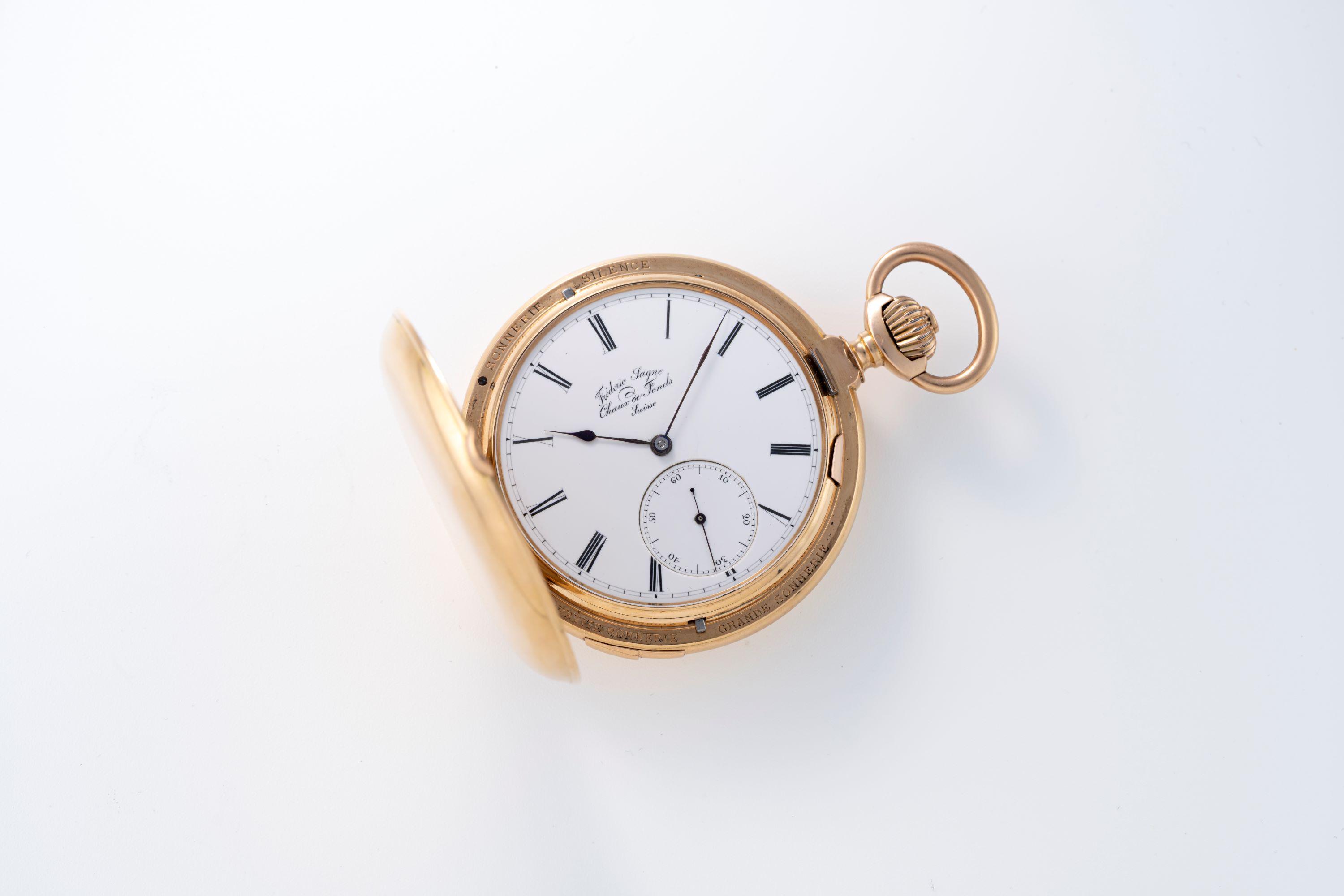 This Frederic Sagne grande and petite sonnerie pocket watch offers a rare chance to acquire a complication that stands among the most prestigious achievements in traditional watchmaking. Crafted in 18k rose gold, it represents the height of mechanical artistry from an era when every component of a striking mechanism was shaped, tuned, and finished by hand. The watch combines both grande and petite sonnerie functions, allowing it to chime the time automatically at each quarter, as well as a minute-repeating mechanism activated on demand, making it one of the most complex and desirable configurations in the world of chiming watches. Its elegant enamel dial with Roman numerals and subsidiary seconds reinforces its classical character, while the case, fitted with selectors for the striking modes, reflects the thoughtful engineering needed to house such a sophisticated mechanism. Pocket watches of this type were produced in very small numbers and required exceptional skill, placing this example firmly in the realm of collectible antique haute horlogerie.