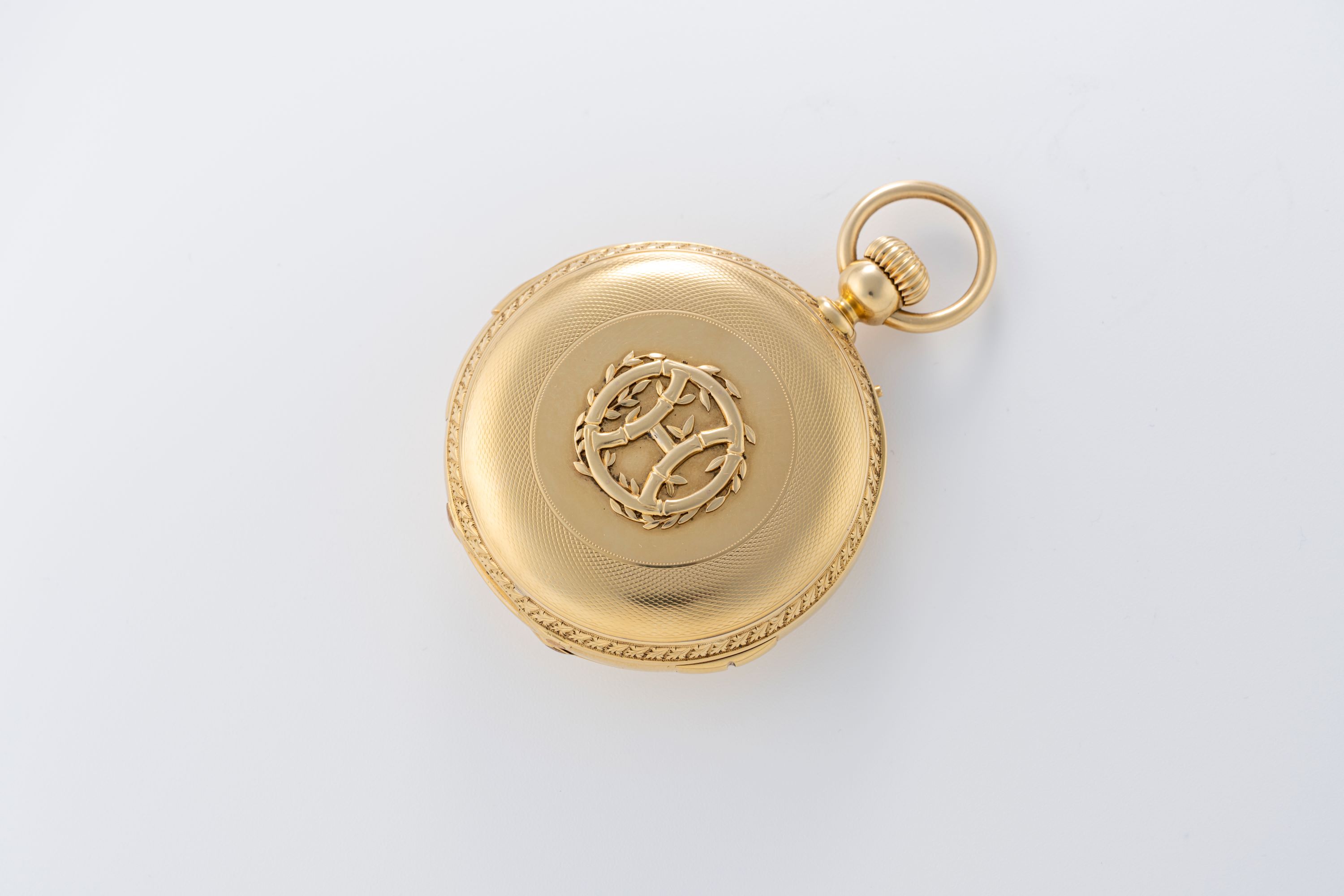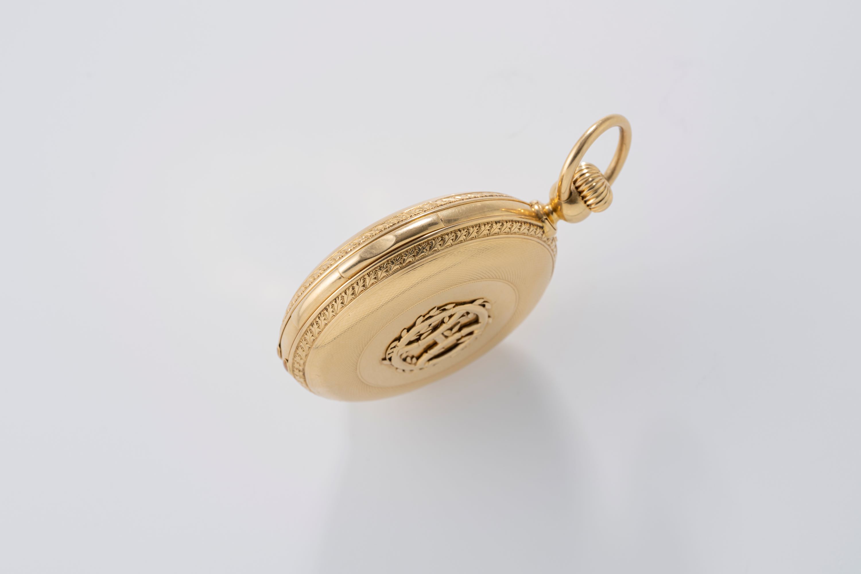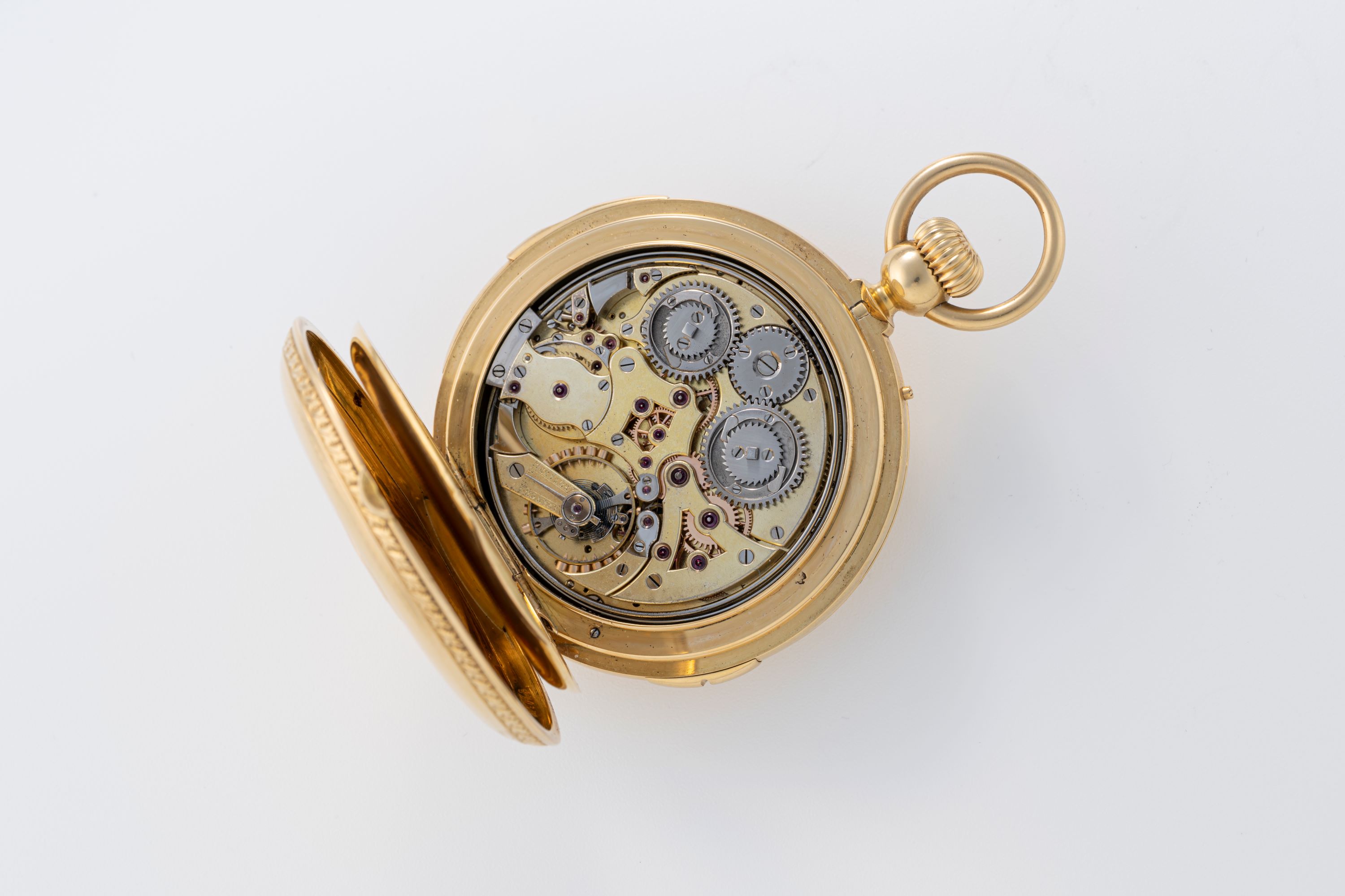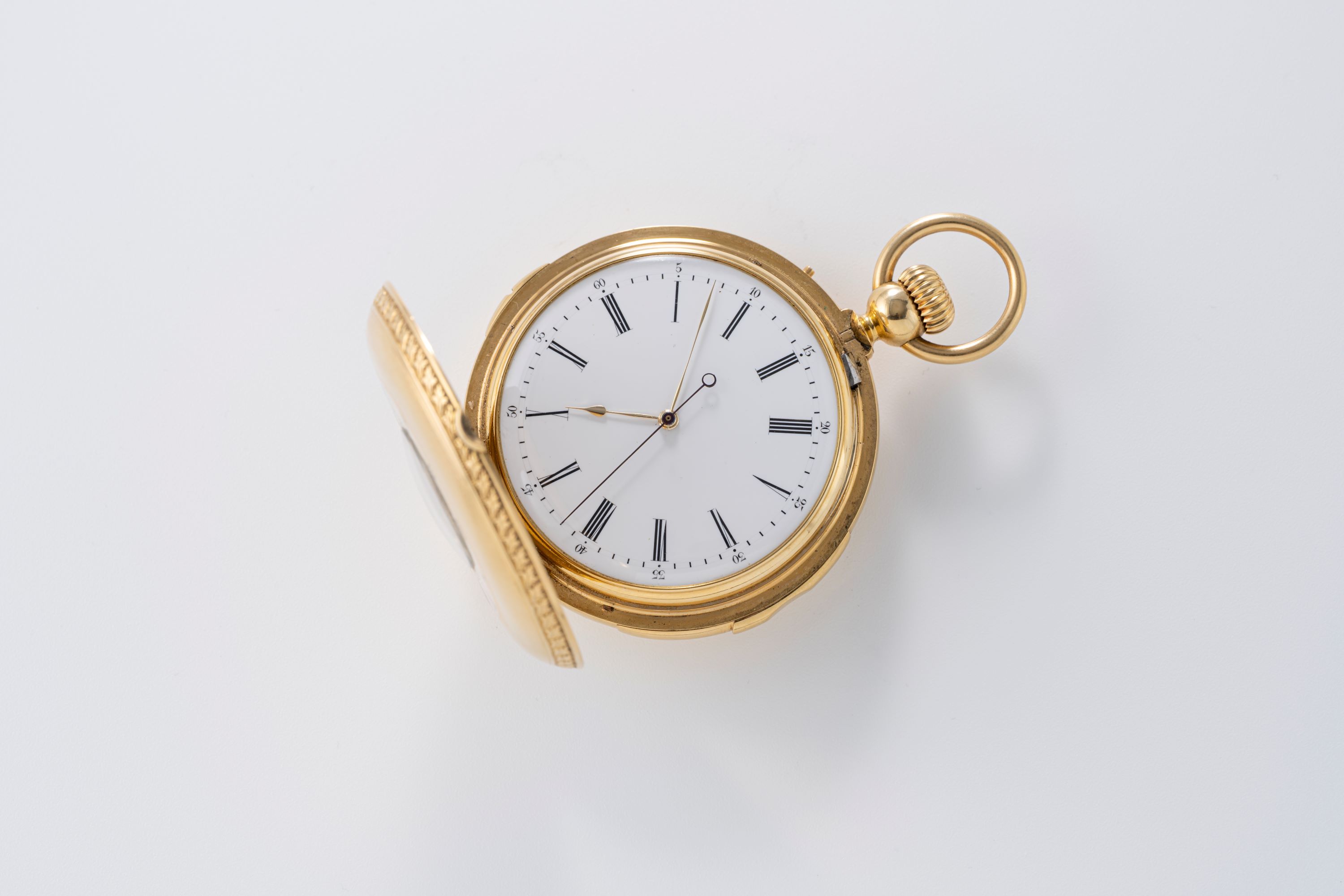 CaseRound hunter case with chain loop and winding crown at 3 o'clock, minute repeater slider at 6 o'clock, hunter front lid