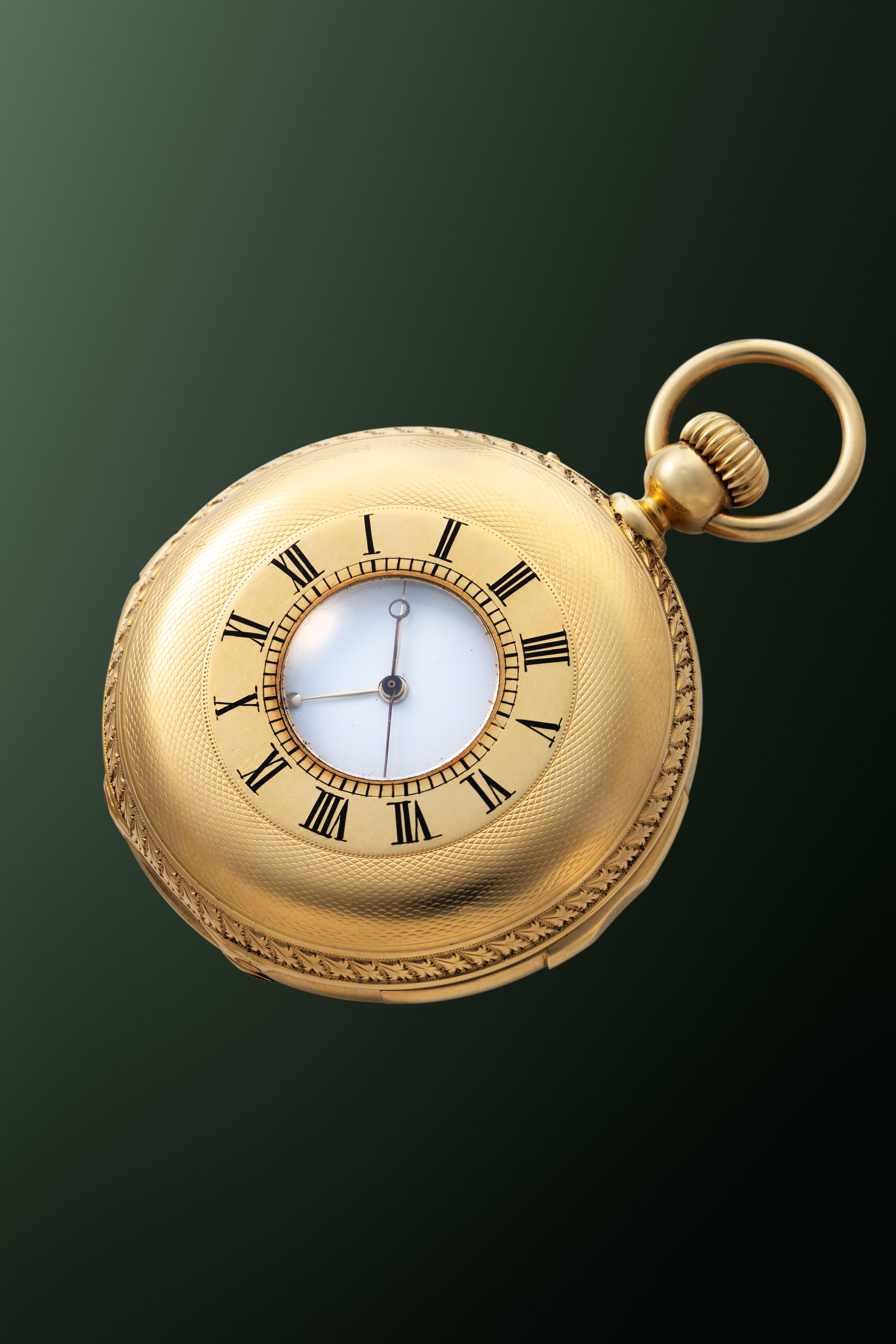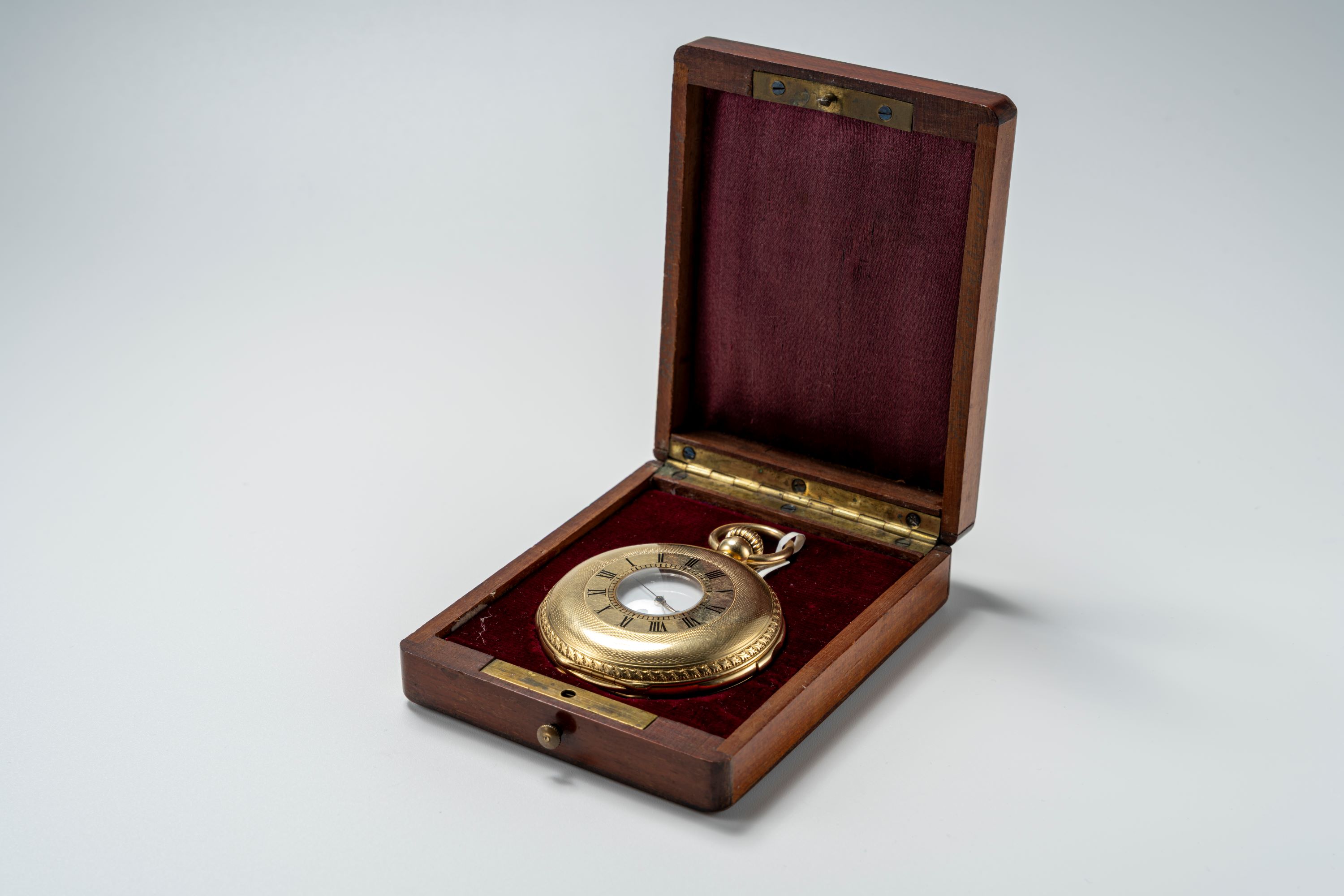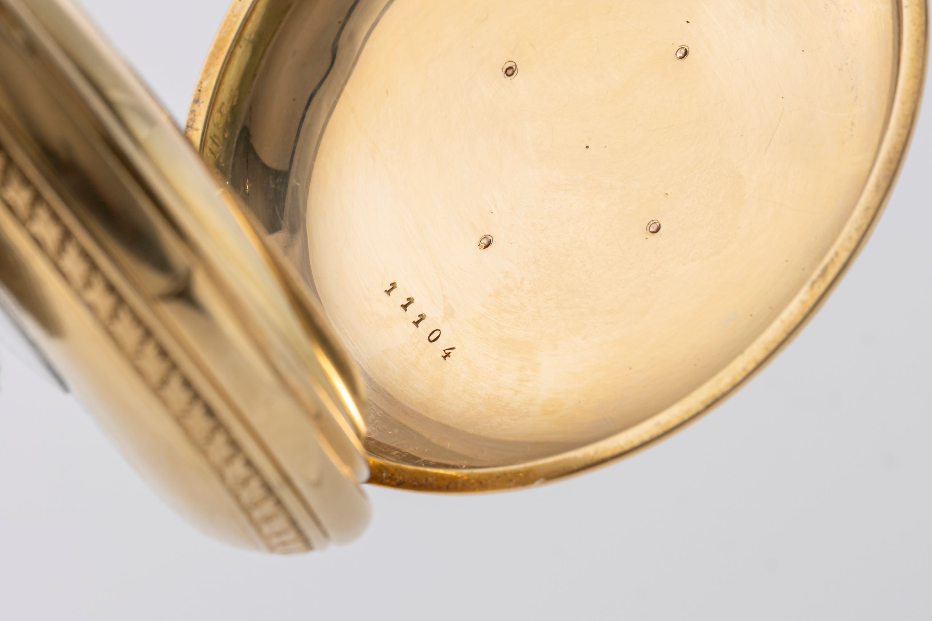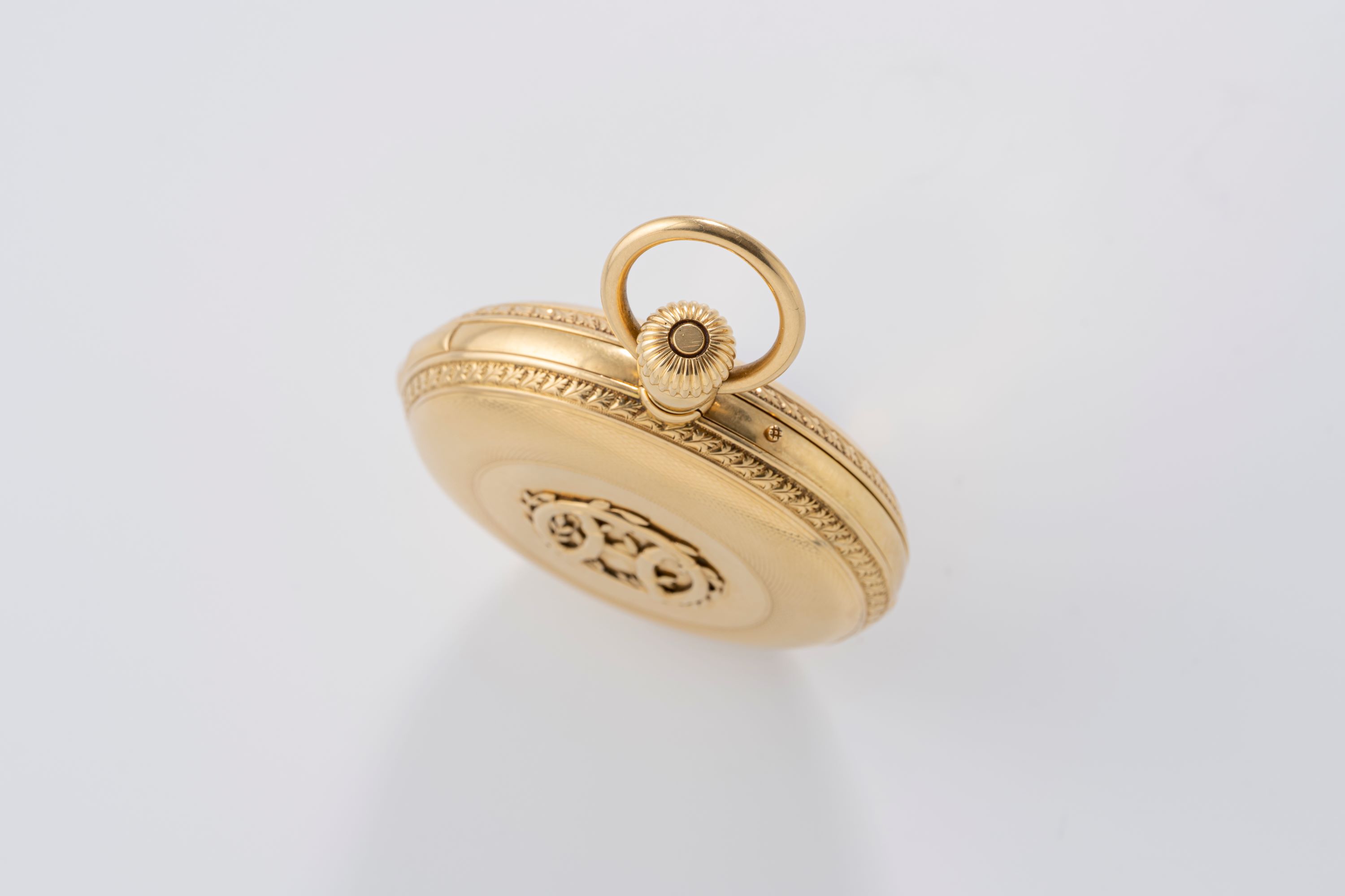 CaseRound hunter case with chain loop and winding crown at 3 o'clock, minute repeater slider at 6 o'clock, hunter front lid