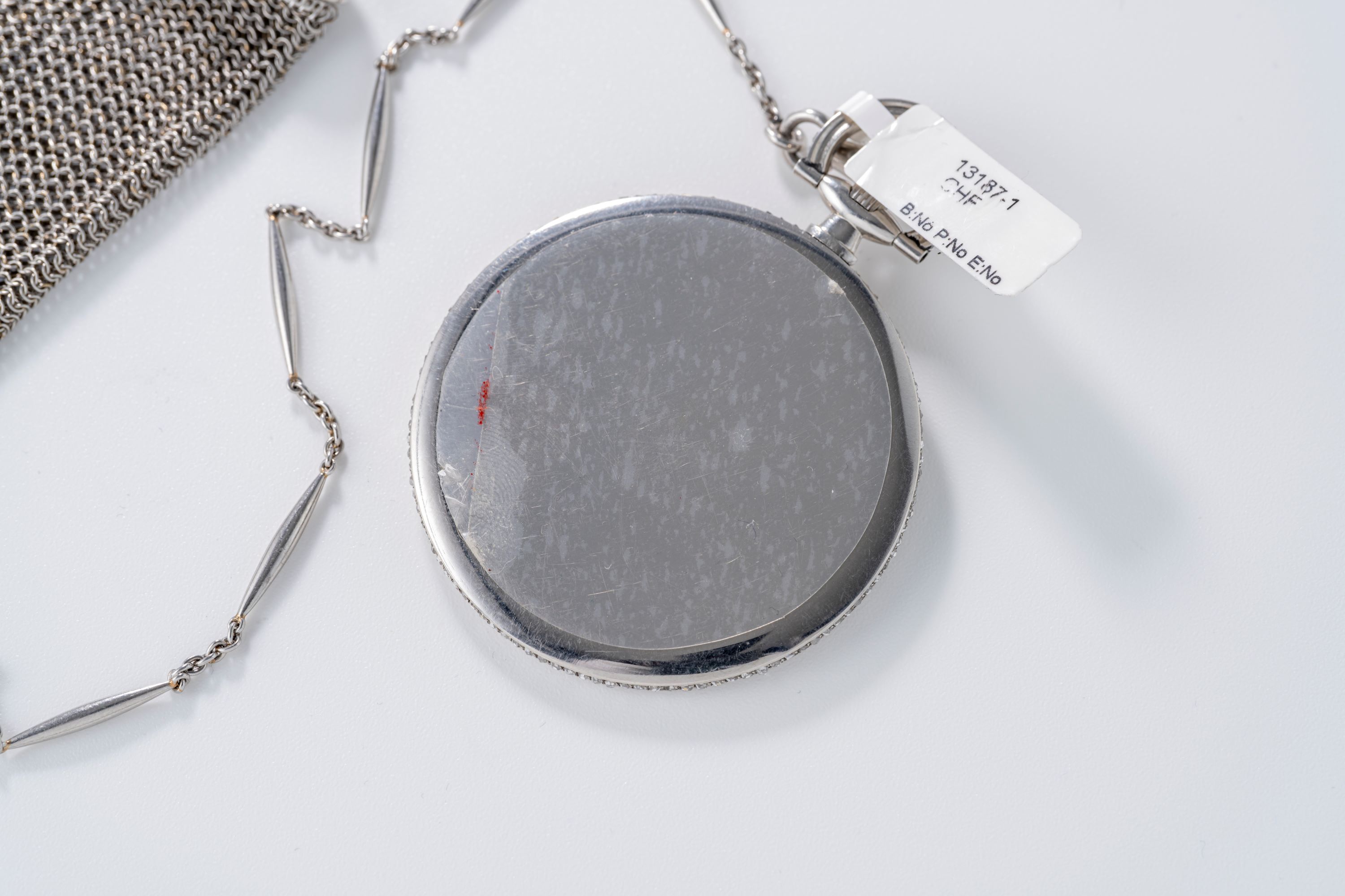 CaseRound case in platinum with diamond-set flanks, chain loop with diamonds and winding crown at 12 o'clock
