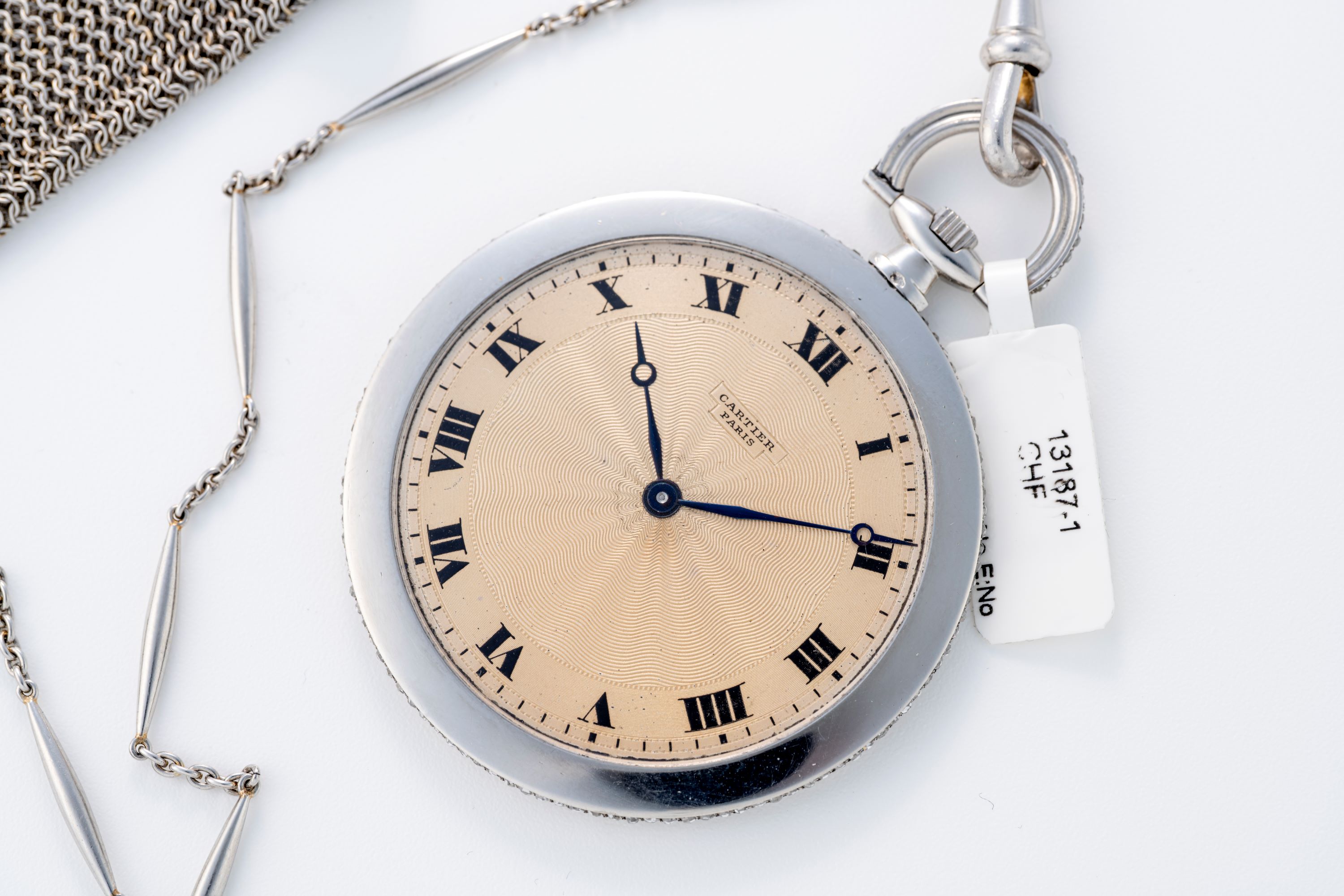 This Cartier pocket watch, made in platinum in 1912, is paired with a matching Cartier platinum chain and purse from 1909, forming a complete period ensemble rather than a single piece. The watch features a guilloché dial with Breguet hands, showing the design approach Cartier used in its early 20th-century timepieces. Platinum watches from this era were produced in small numbers, as the metal was difficult to work with and was reserved only for higher-level pieces. The inclusion of a matching Cartier chain and purse adds significant historical context and strengthens the value of the set. For collectors of early Cartier or those interested in pre-Art Deco watchmaking, this set offers a well-documented and authentic example of Cartier’s work in platinum before wristwatches became standard.