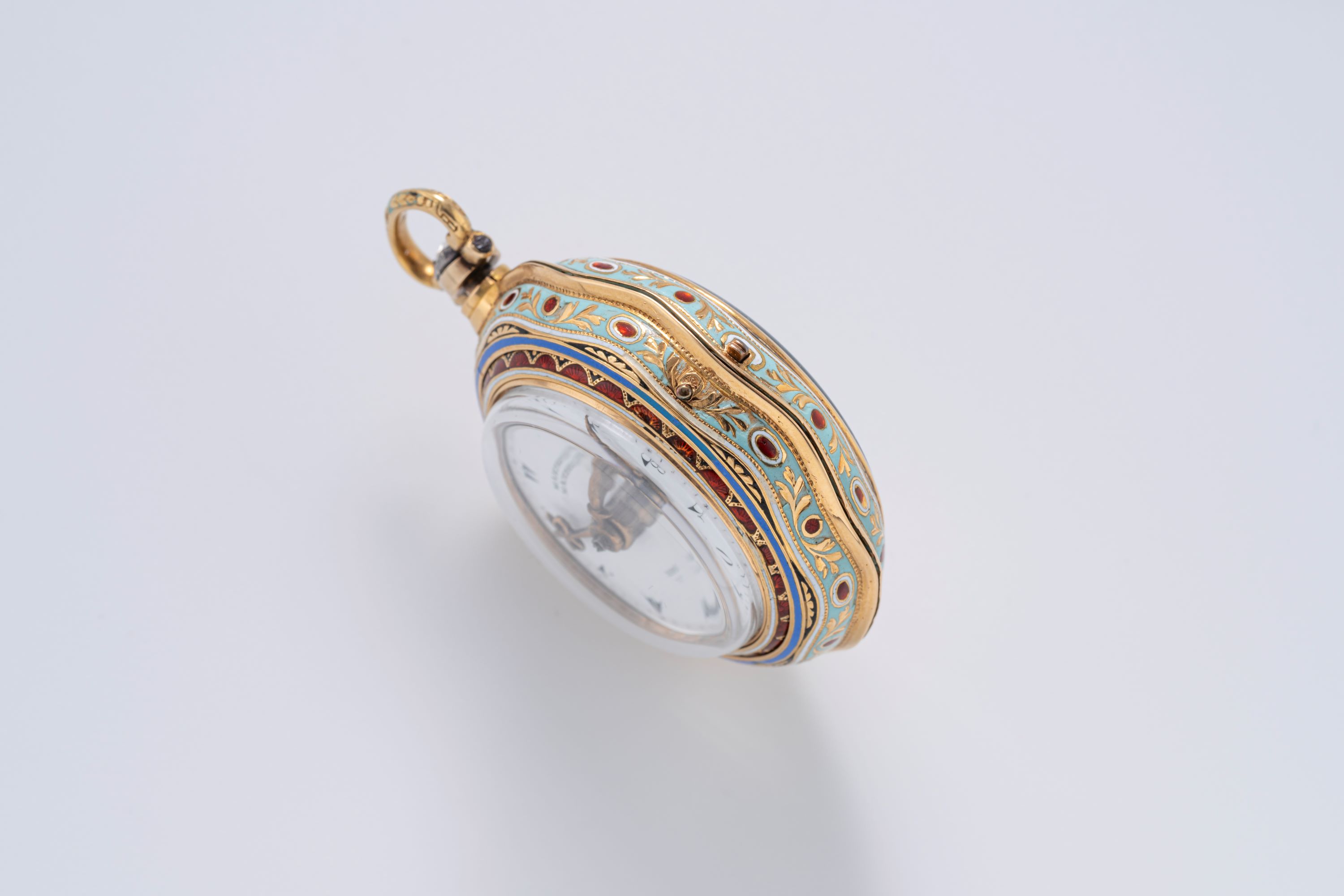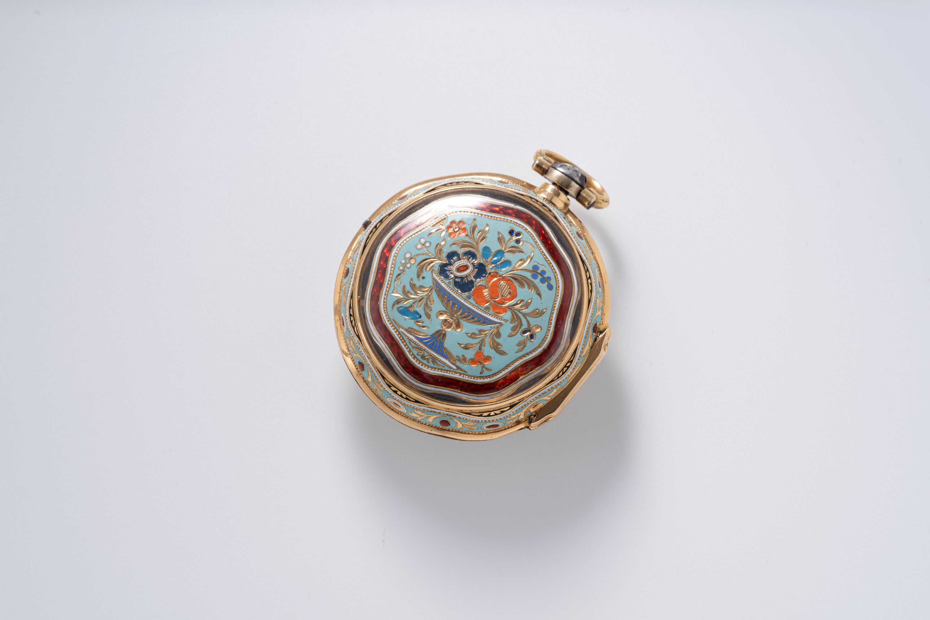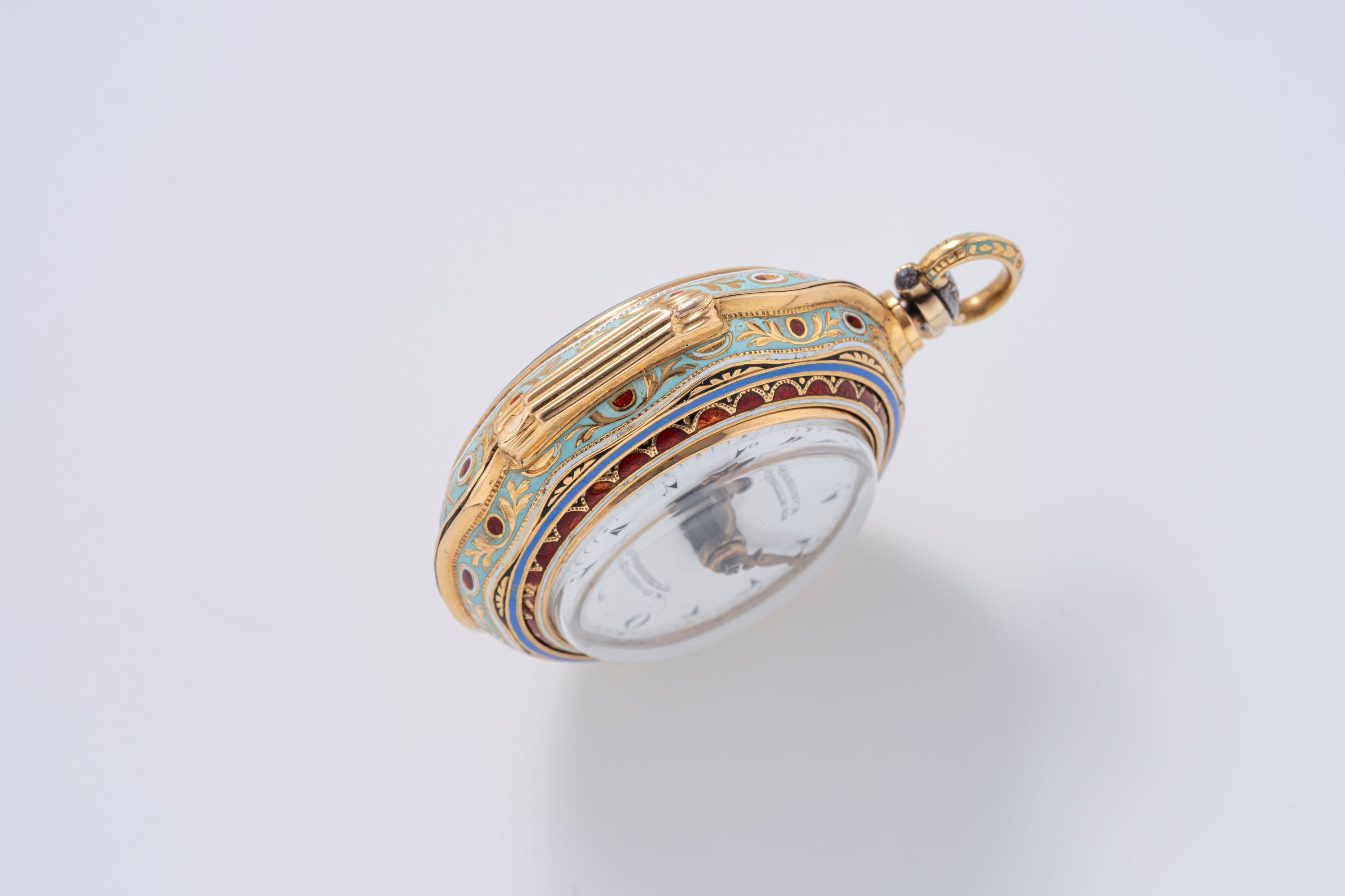 CaseRound case in 18k yellow gold with full cloisonné enamelling, chain loop at 12 o'clock