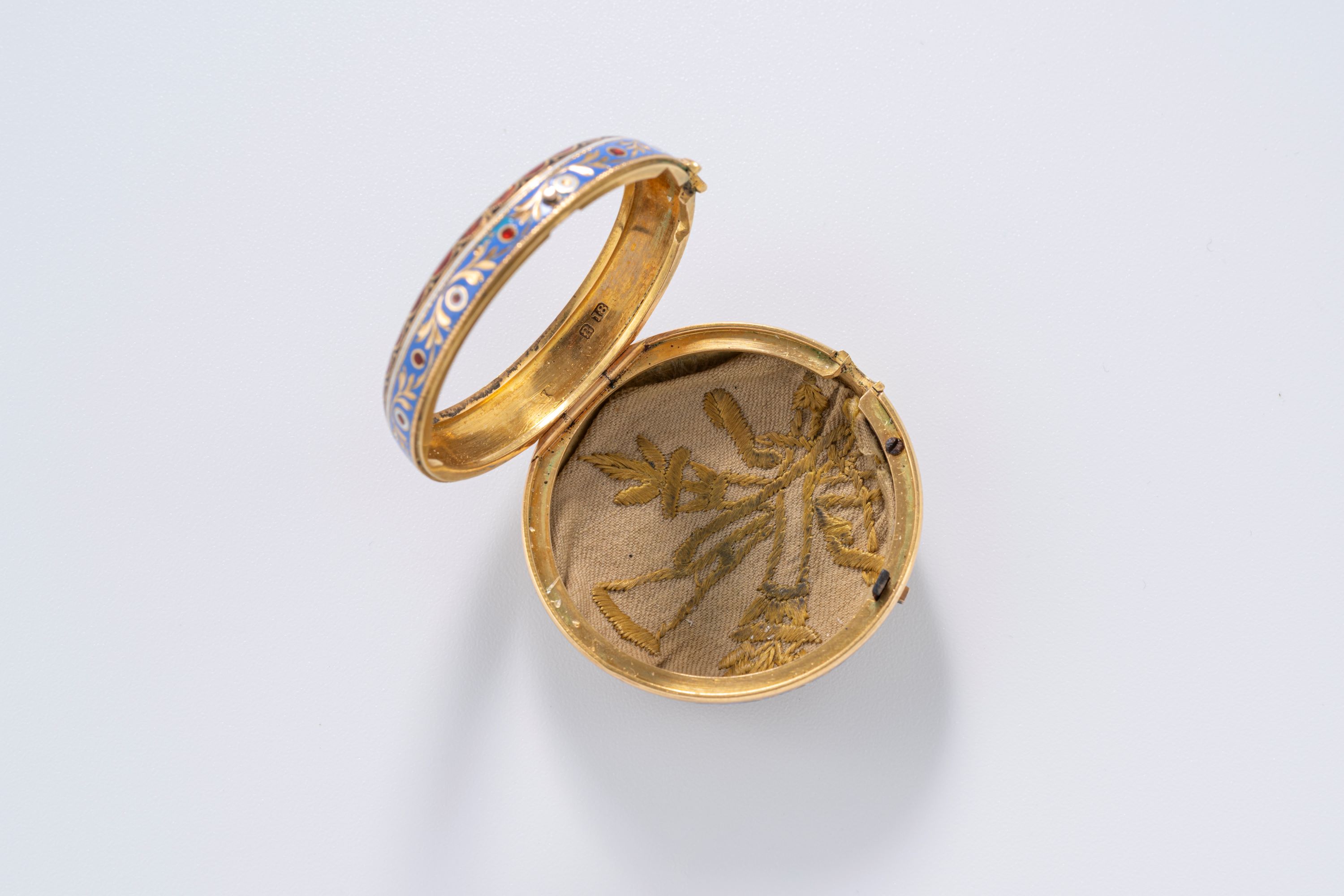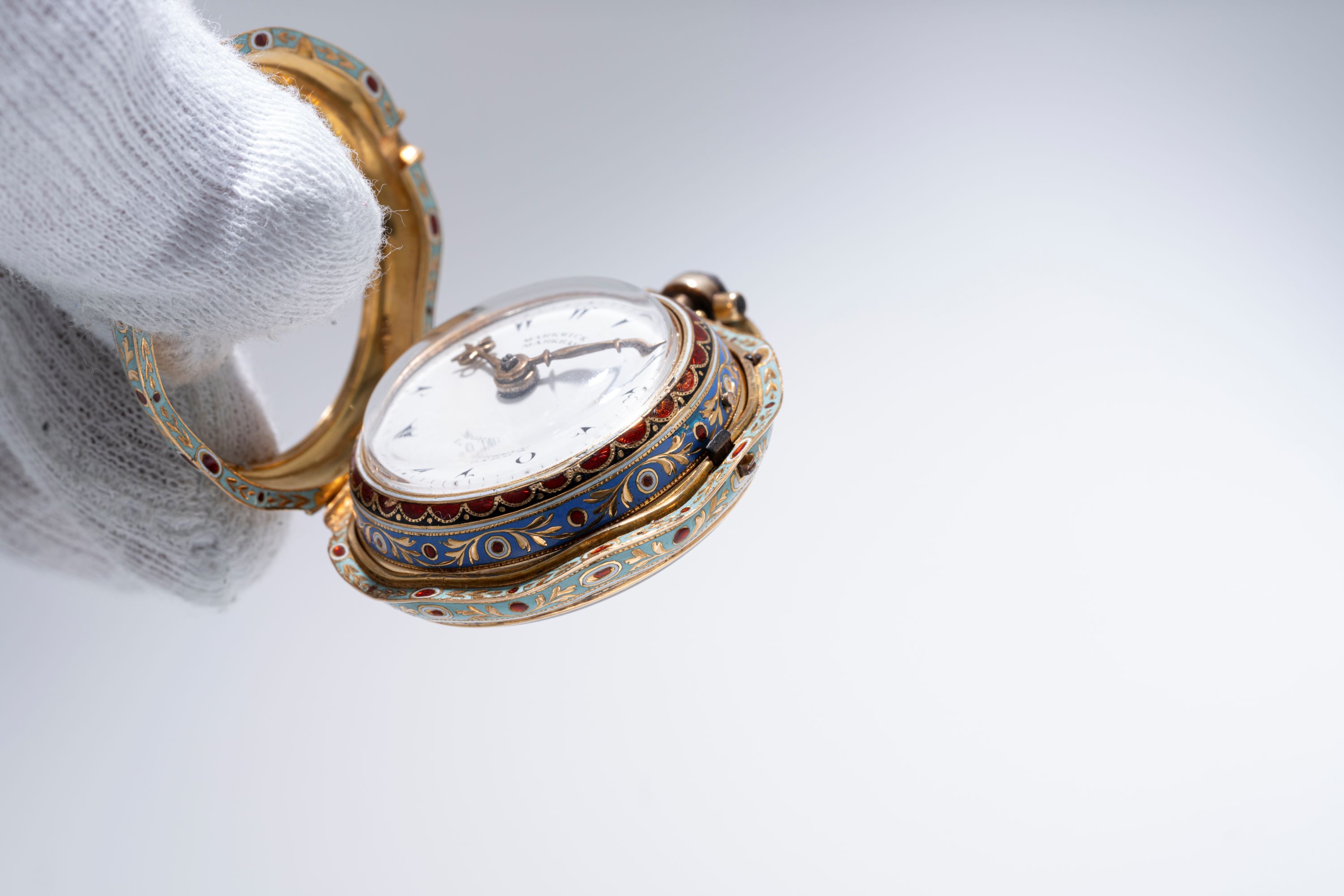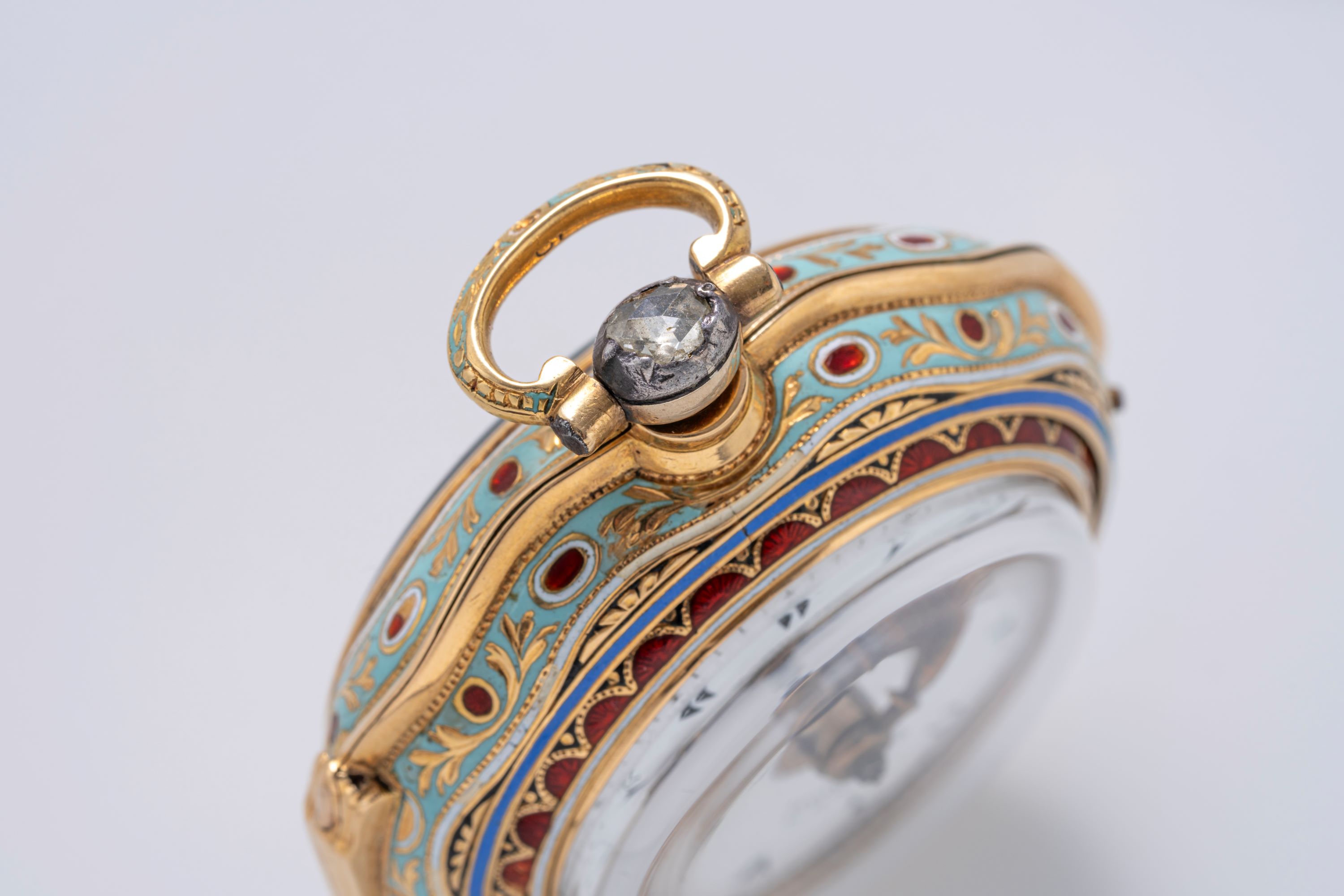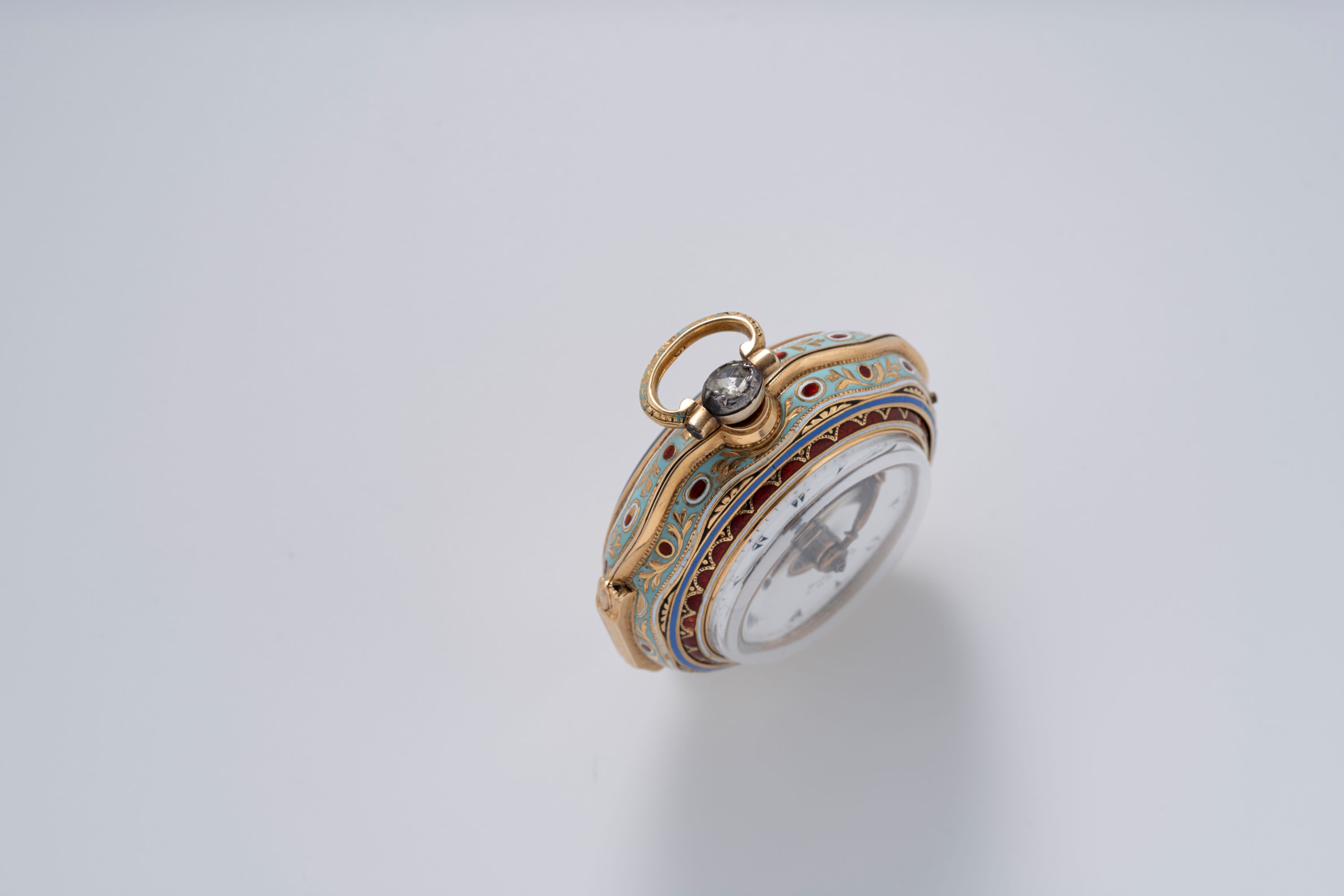 CaseRound case in 18k yellow gold with full cloisonné enamelling, chain loop at 12 o'clock