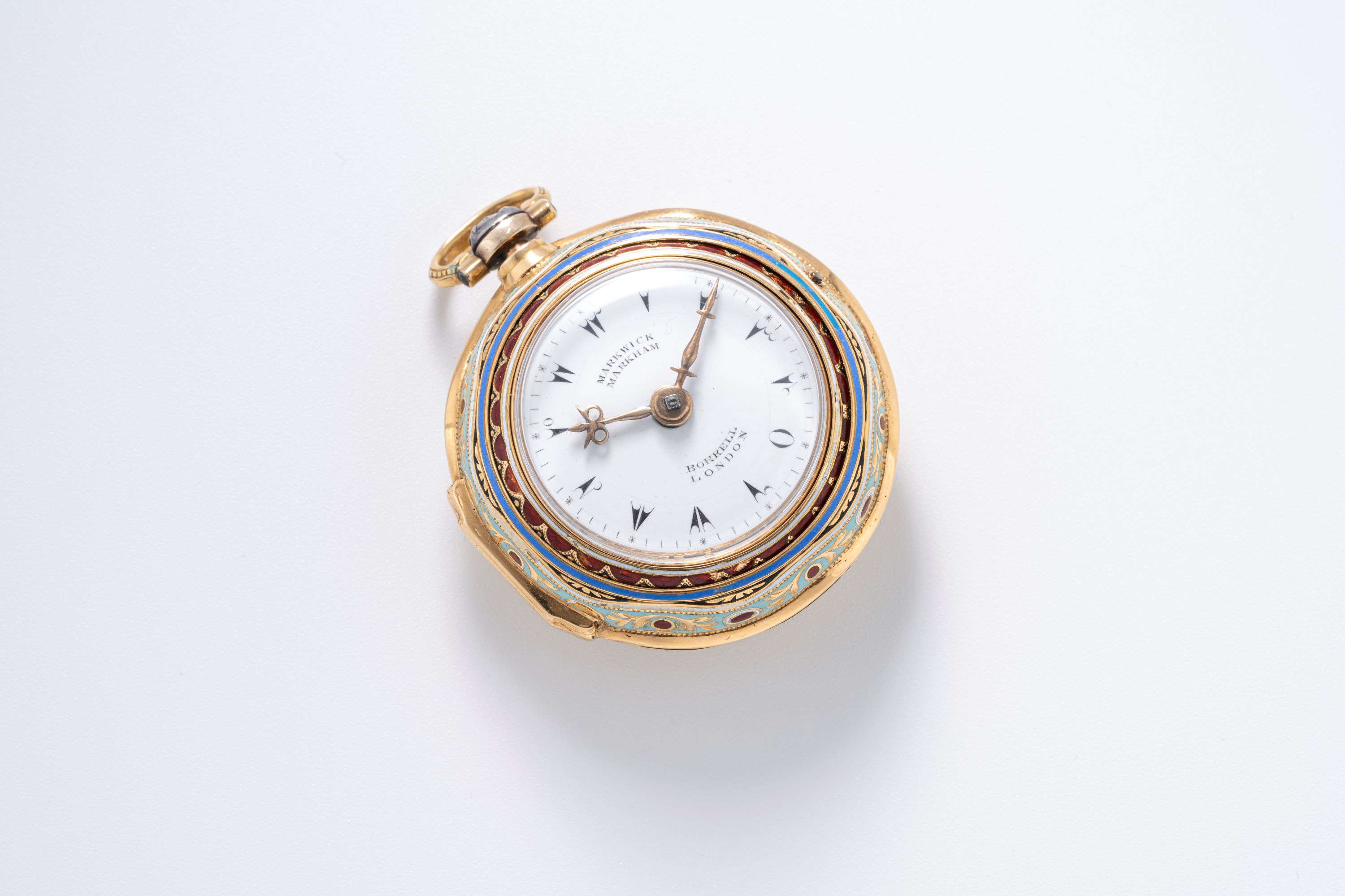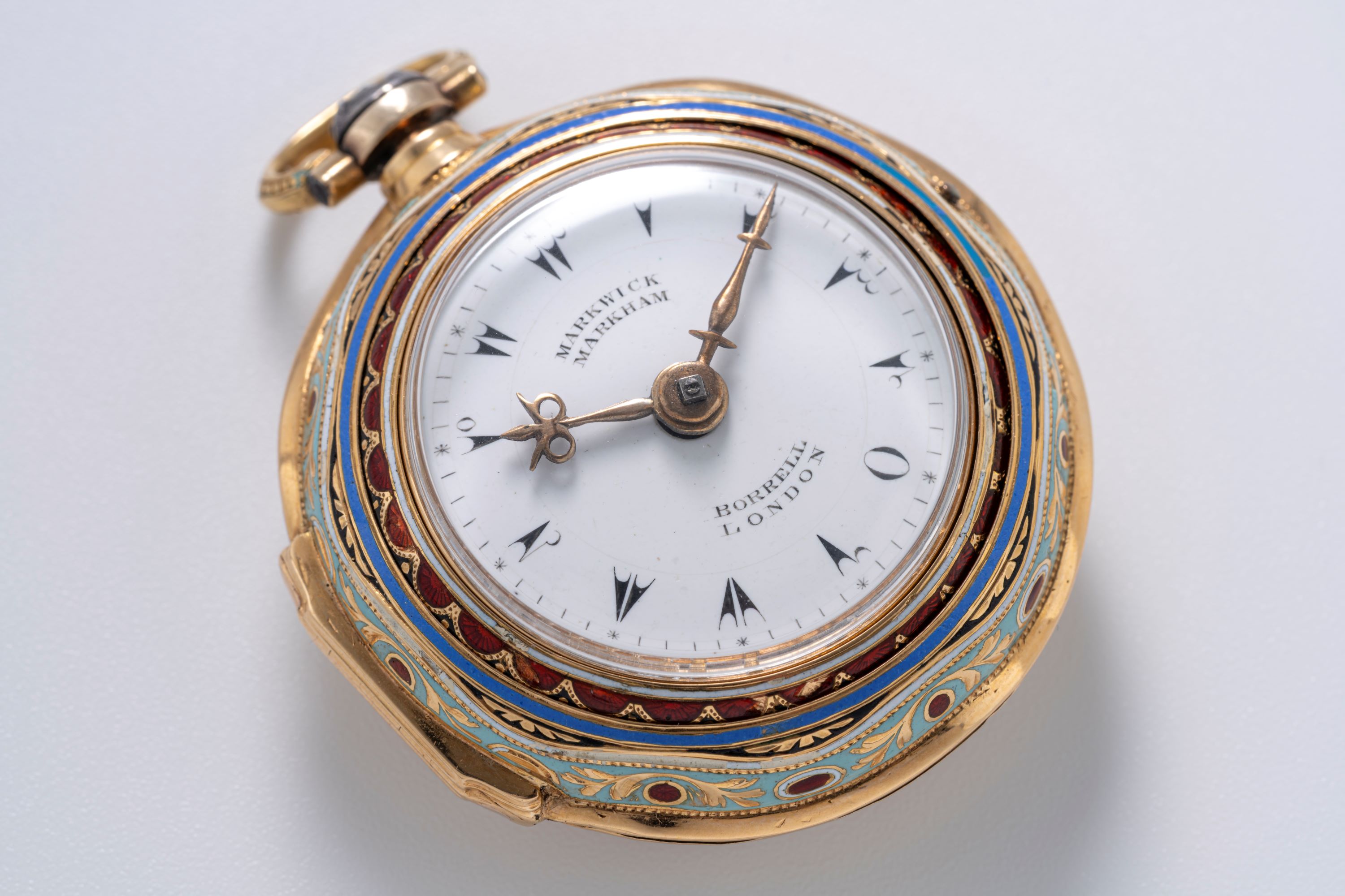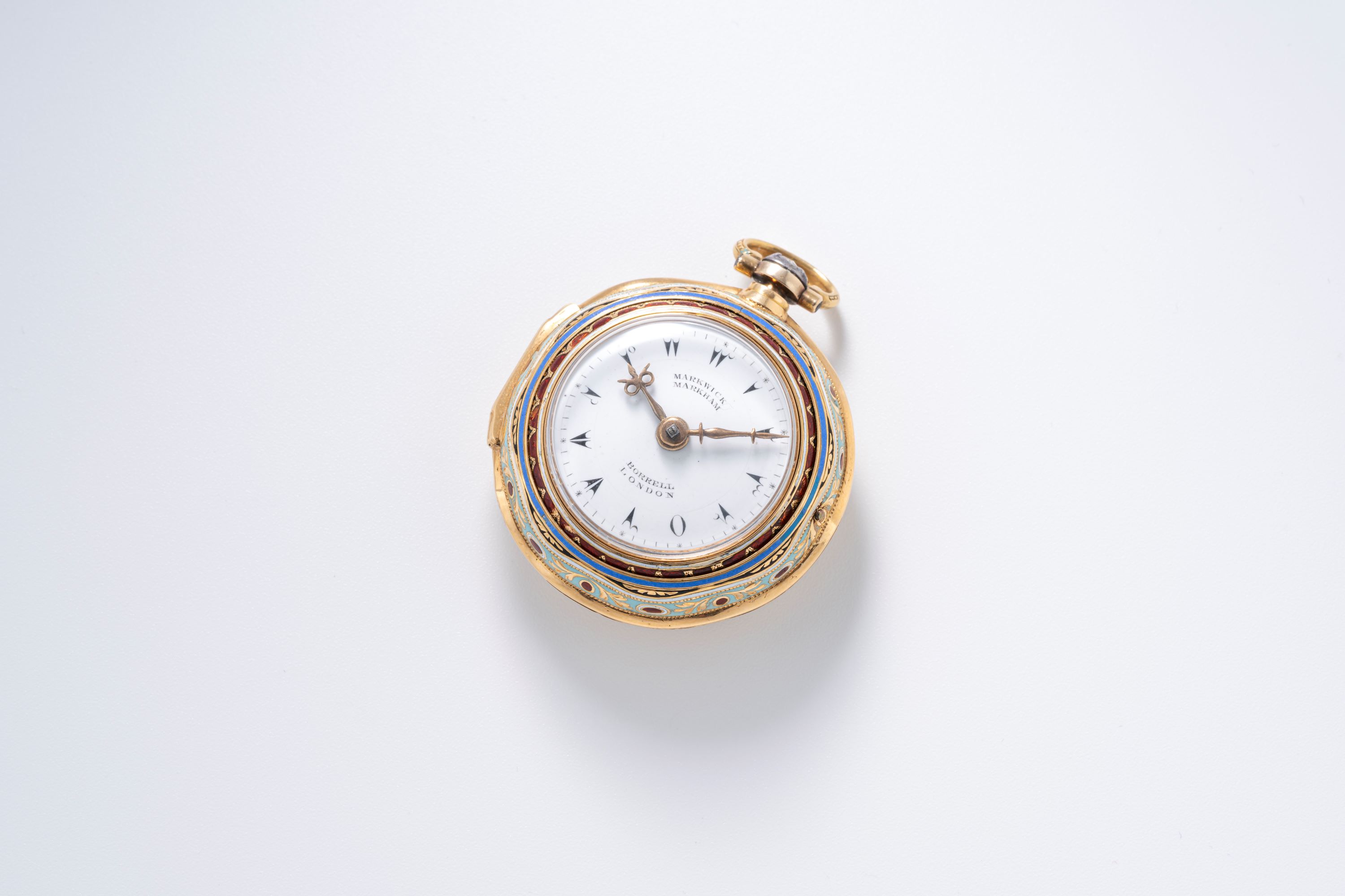 This late 18th-century pocket watch by Marwick Markham of London is a fine example of period craftsmanship and decorative watchmaking. The case is decorated entirely with cloisonné enamel, featuring colorful floral motifs and layered enamel borders that give the watch a distinct visual presence. Such enamel work requires considerable skill, as each color segment has to be applied and fired separately, making surviving examples particularly appreciated today. The dial is clean and clearly laid out, with decorative arrow-tip hour markers and ornate hands typical of English watchmaking of the period. Markwick Markham was known for producing reliable movements during a time when London was a major center of watch production. As a result, this piece combines practical timekeeping with decorative artistry. Pocket watches with original enamel decoration in good condition are increasingly sought after, making this a notable example for collectors of early English watches and decorative horology.