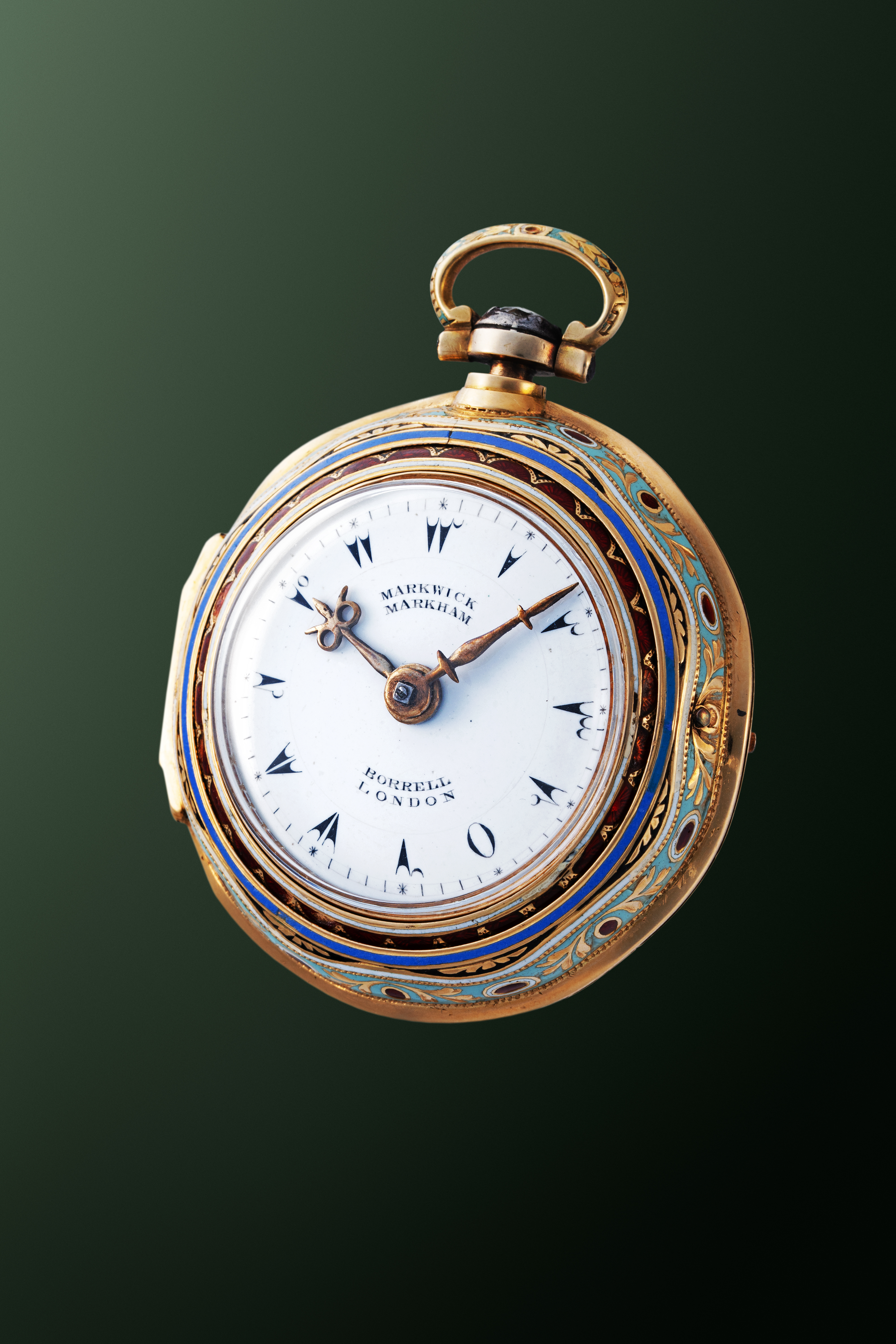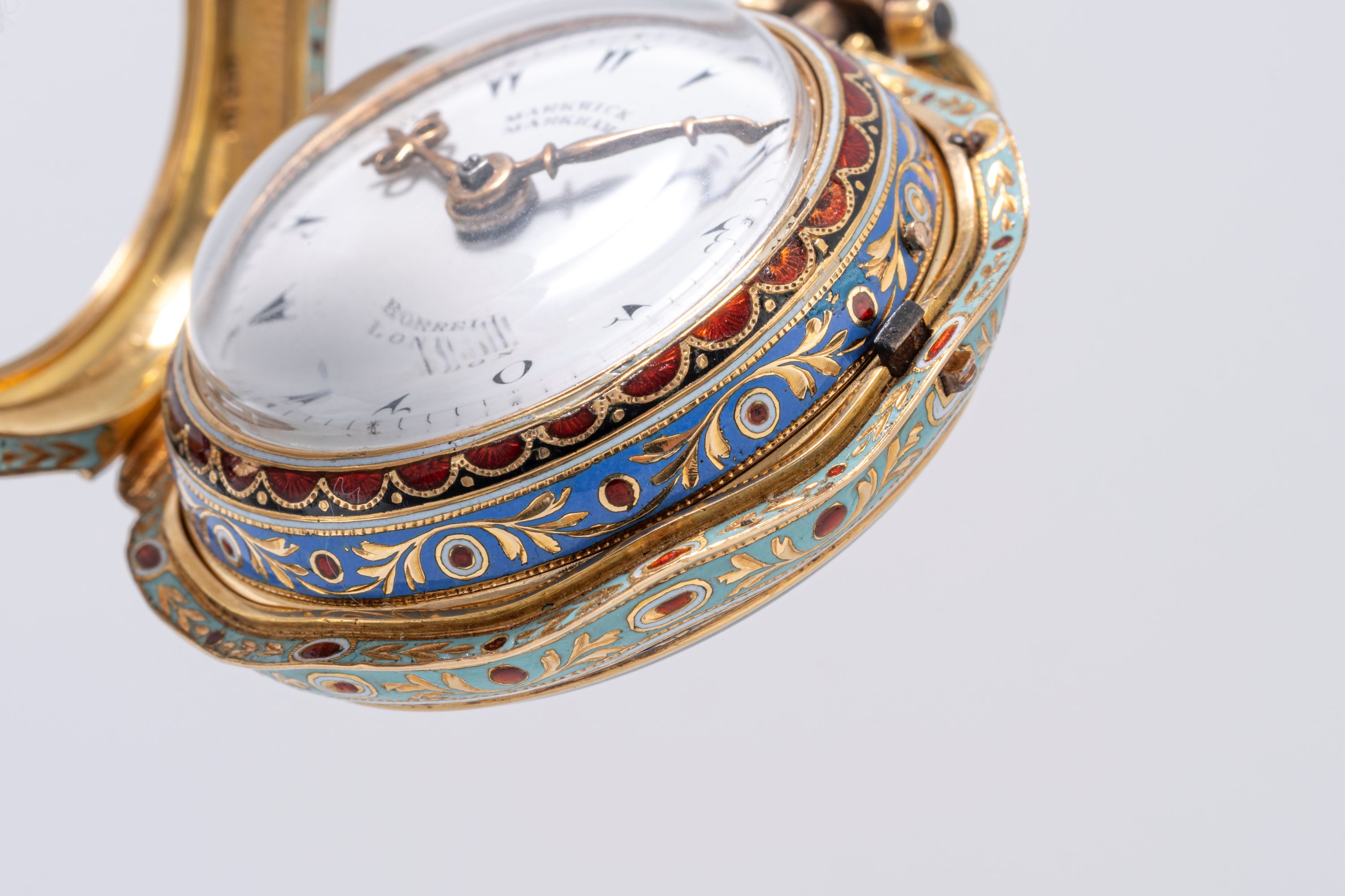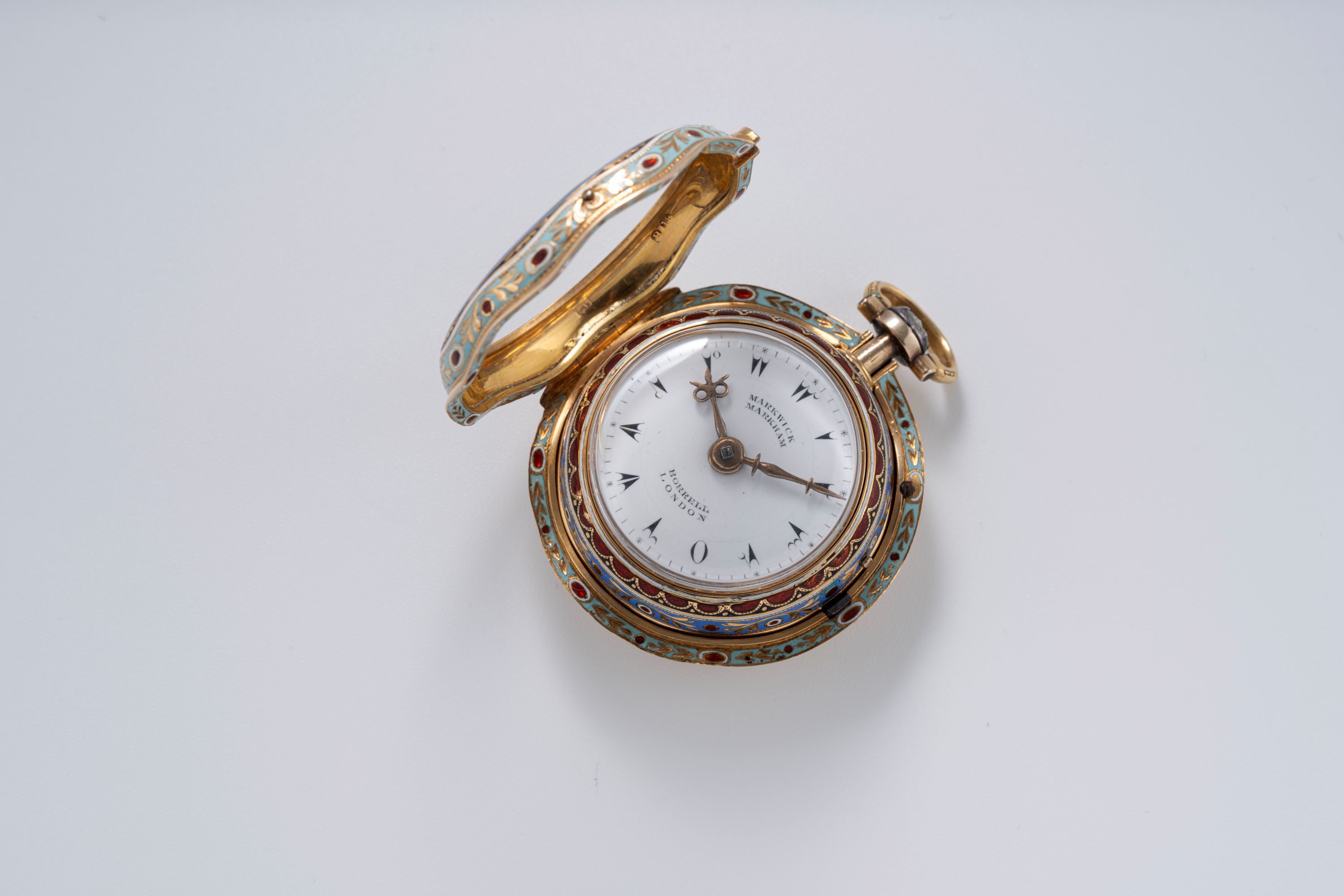 This late 18th-century pocket watch by Marwick Markham of London is a fine example of period craftsmanship and decorative watchmaking. The case is decorated entirely with cloisonné enamel, featuring colorful floral motifs and layered enamel borders that give the watch a distinct visual presence. Such enamel work requires considerable skill, as each color segment has to be applied and fired separately, making surviving examples particularly appreciated today. The dial is clean and clearly laid out, with decorative arrow-tip hour markers and ornate hands typical of English watchmaking of the period. Markwick Markham was known for producing reliable movements during a time when London was a major center of watch production. As a result, this piece combines practical timekeeping with decorative artistry. Pocket watches with original enamel decoration in good condition are increasingly sought after, making this a notable example for collectors of early English watches and decorative horology.