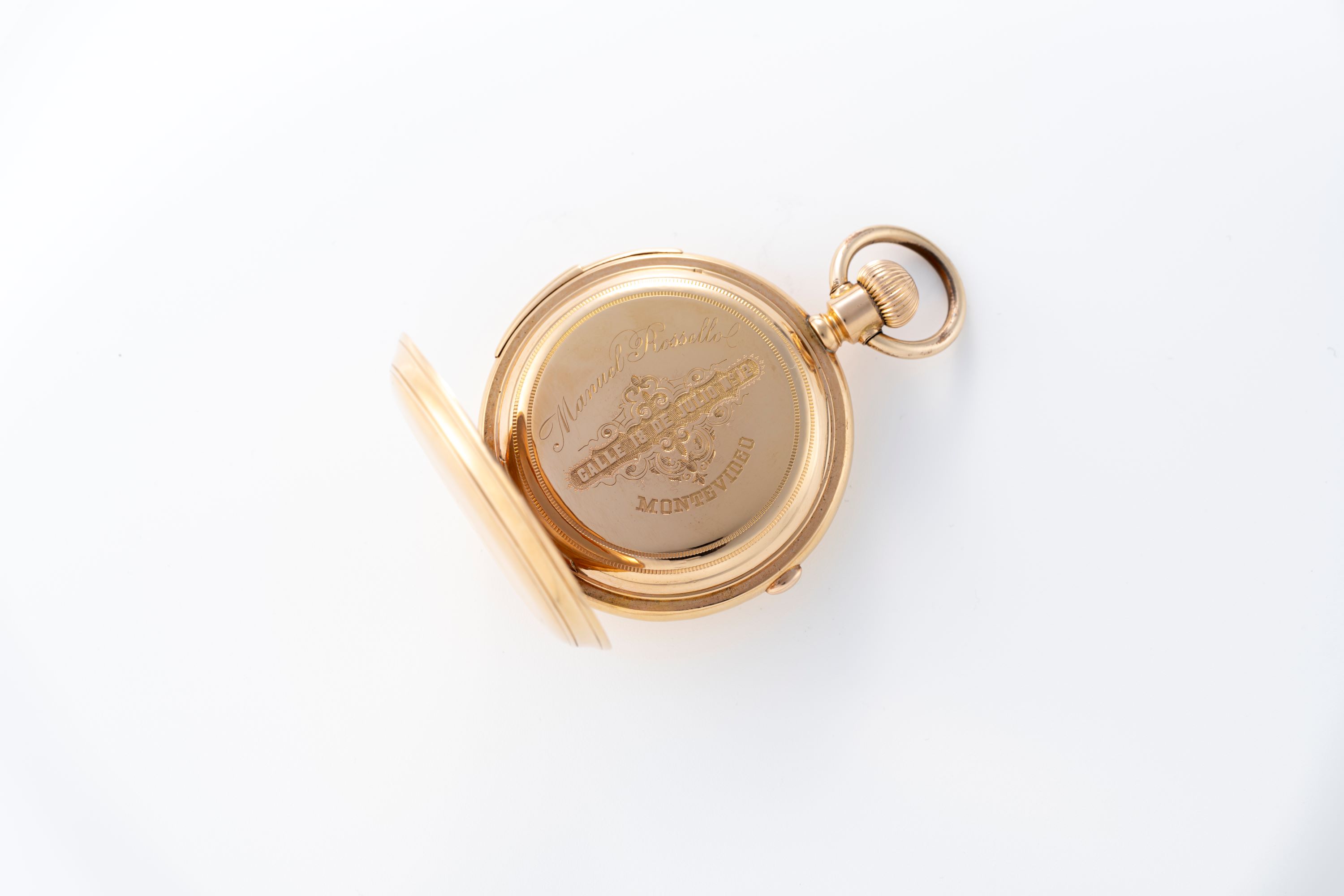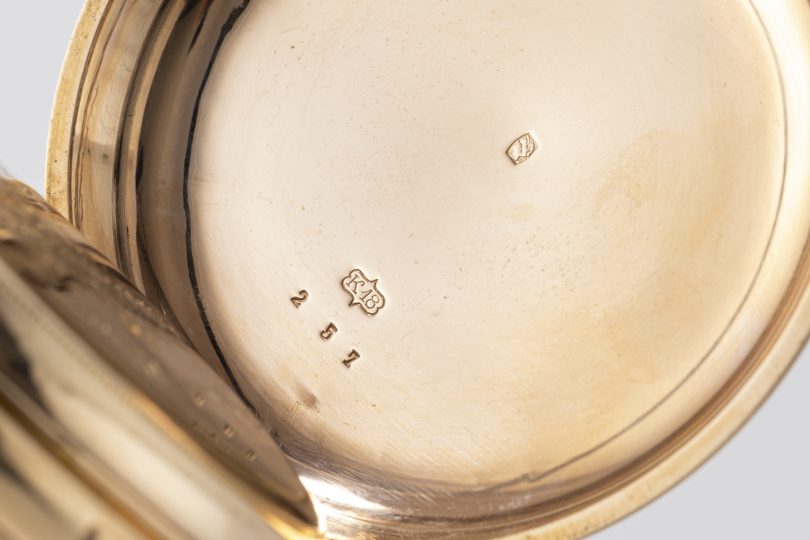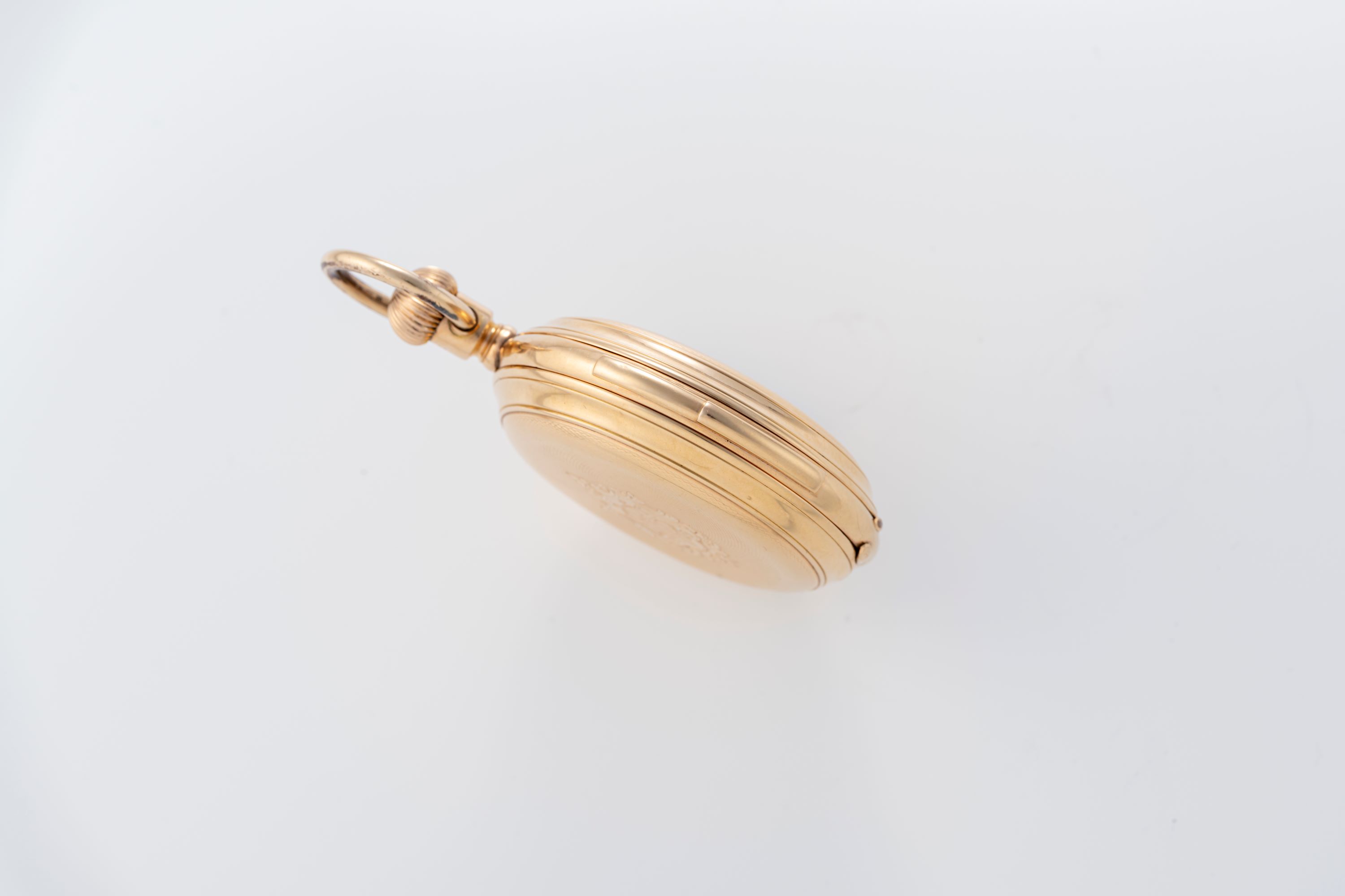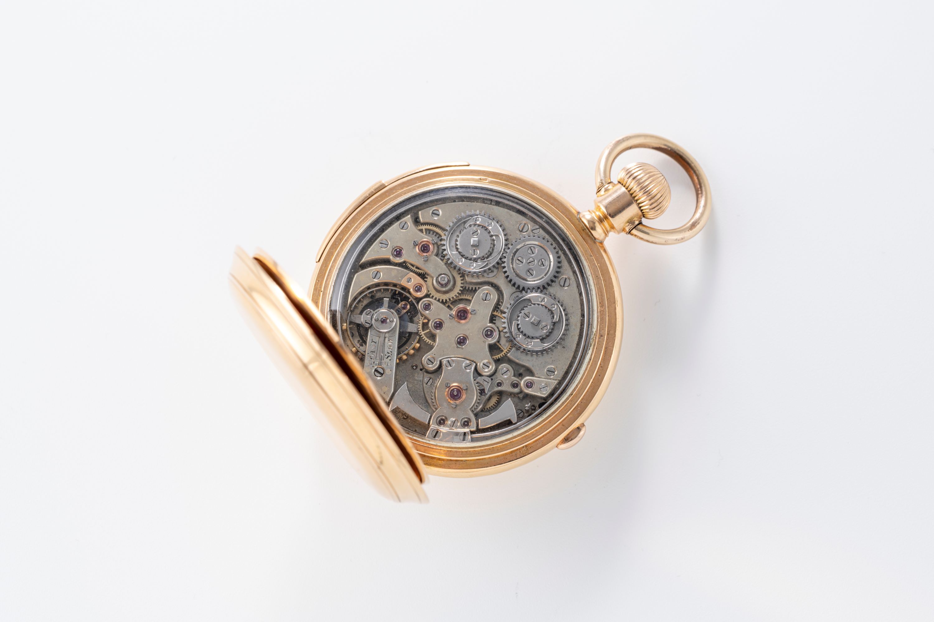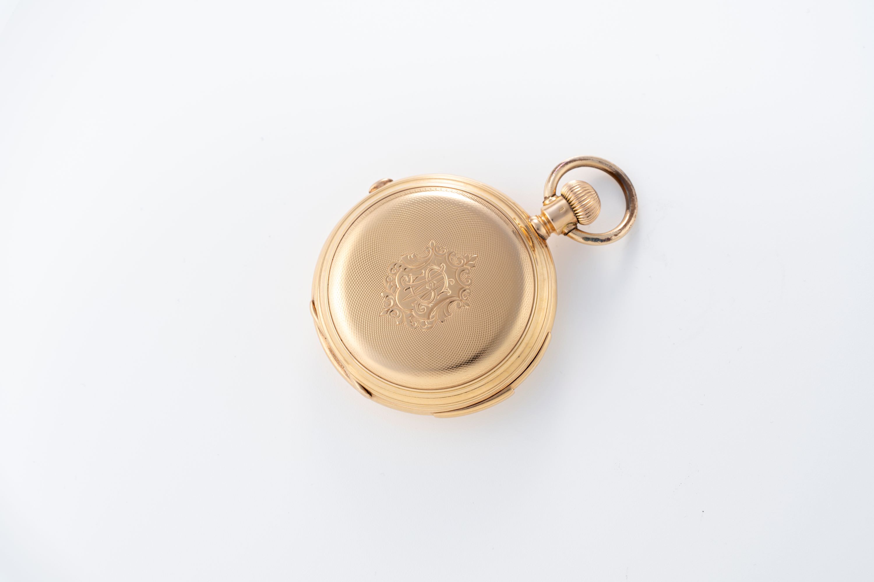 CaseRound case in 18k yellow gold with chain loop and winding crown at 3 o'clock, double lid caseback, repeater slider at 6 o'clock