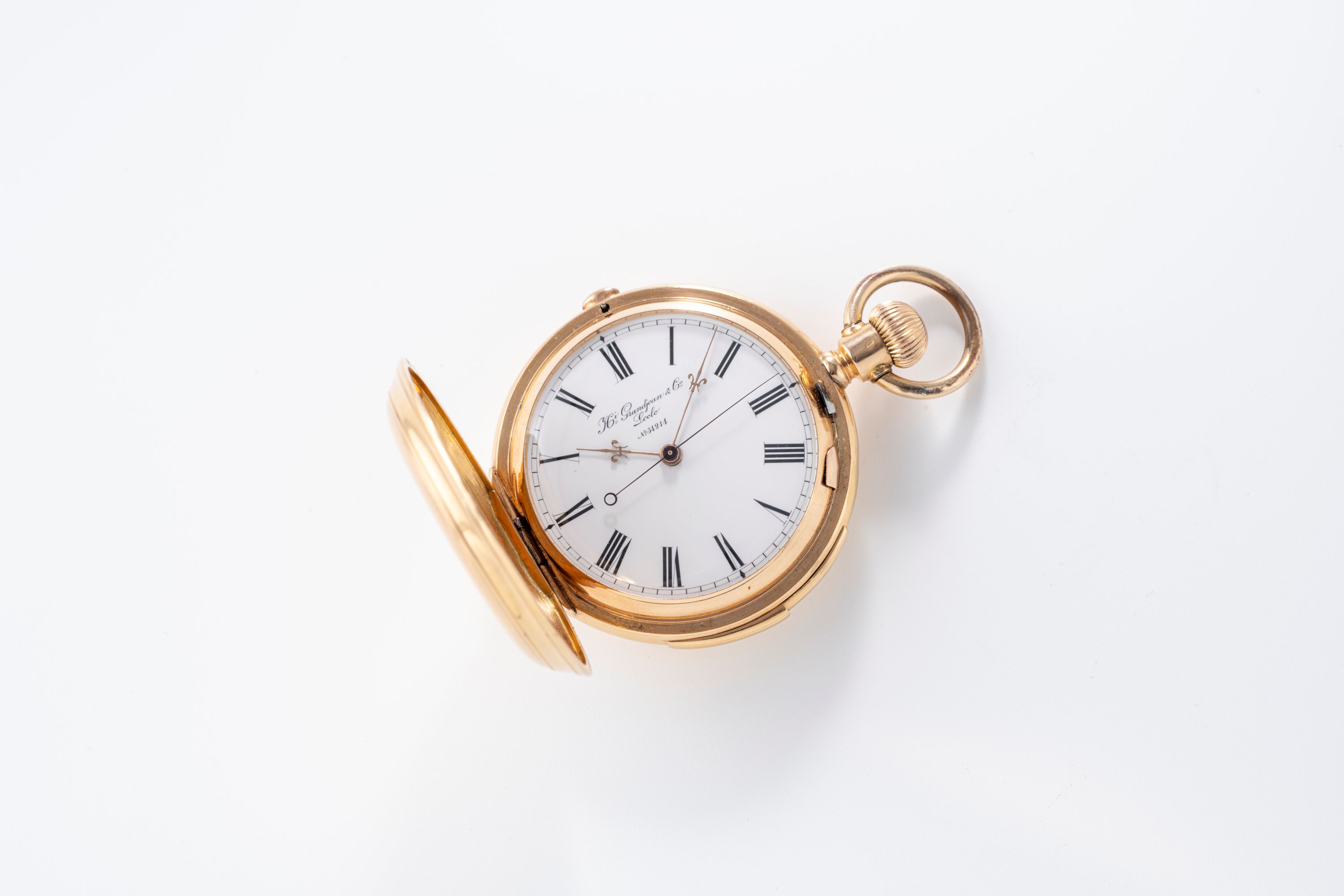 DialWhite enamel dial with thick roman numerals, gold Fleur de Lys hands, central dead-beat seconds, signed 'Hi. Grandjean & Cie.' at 12 o'clock,