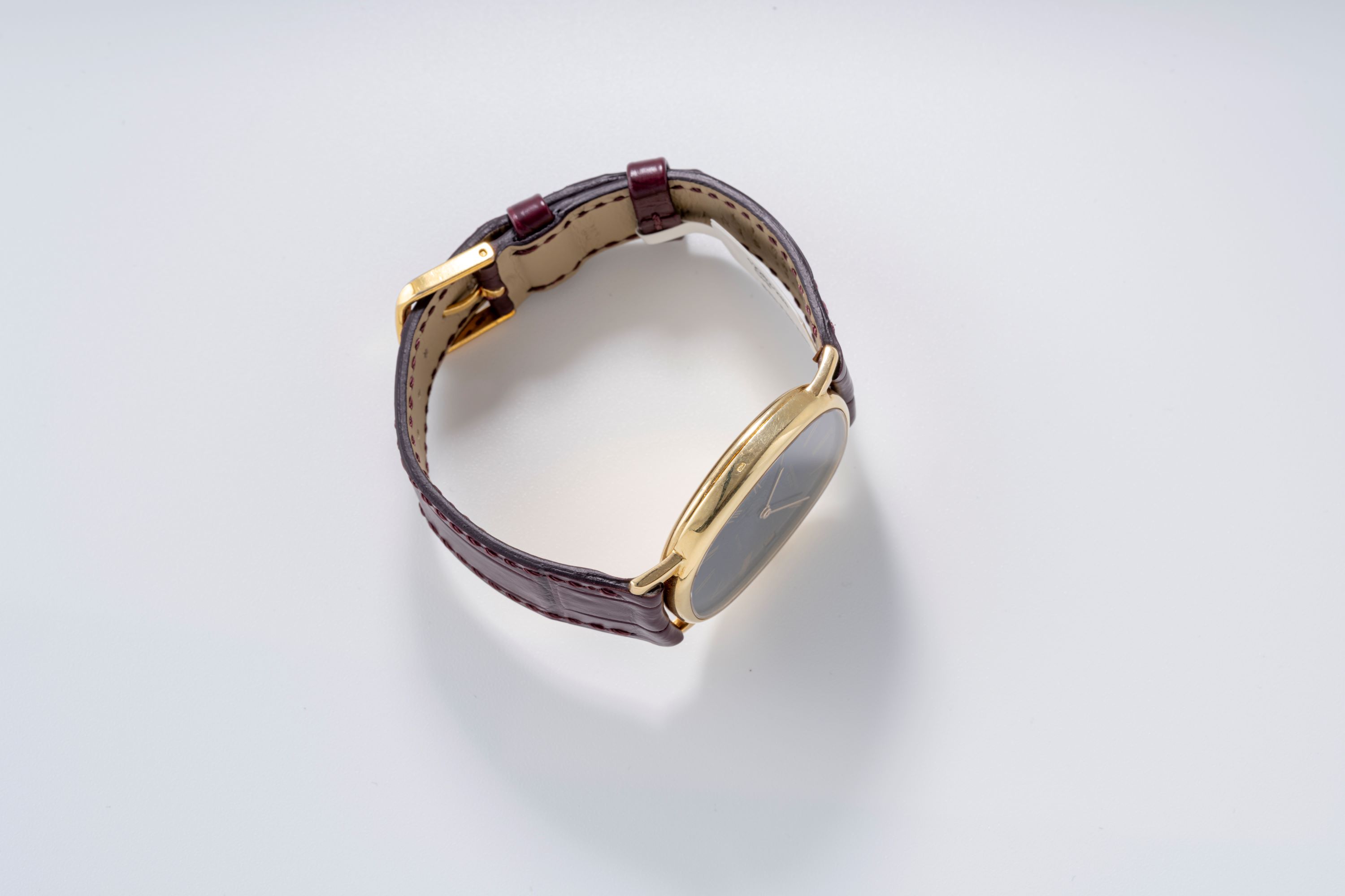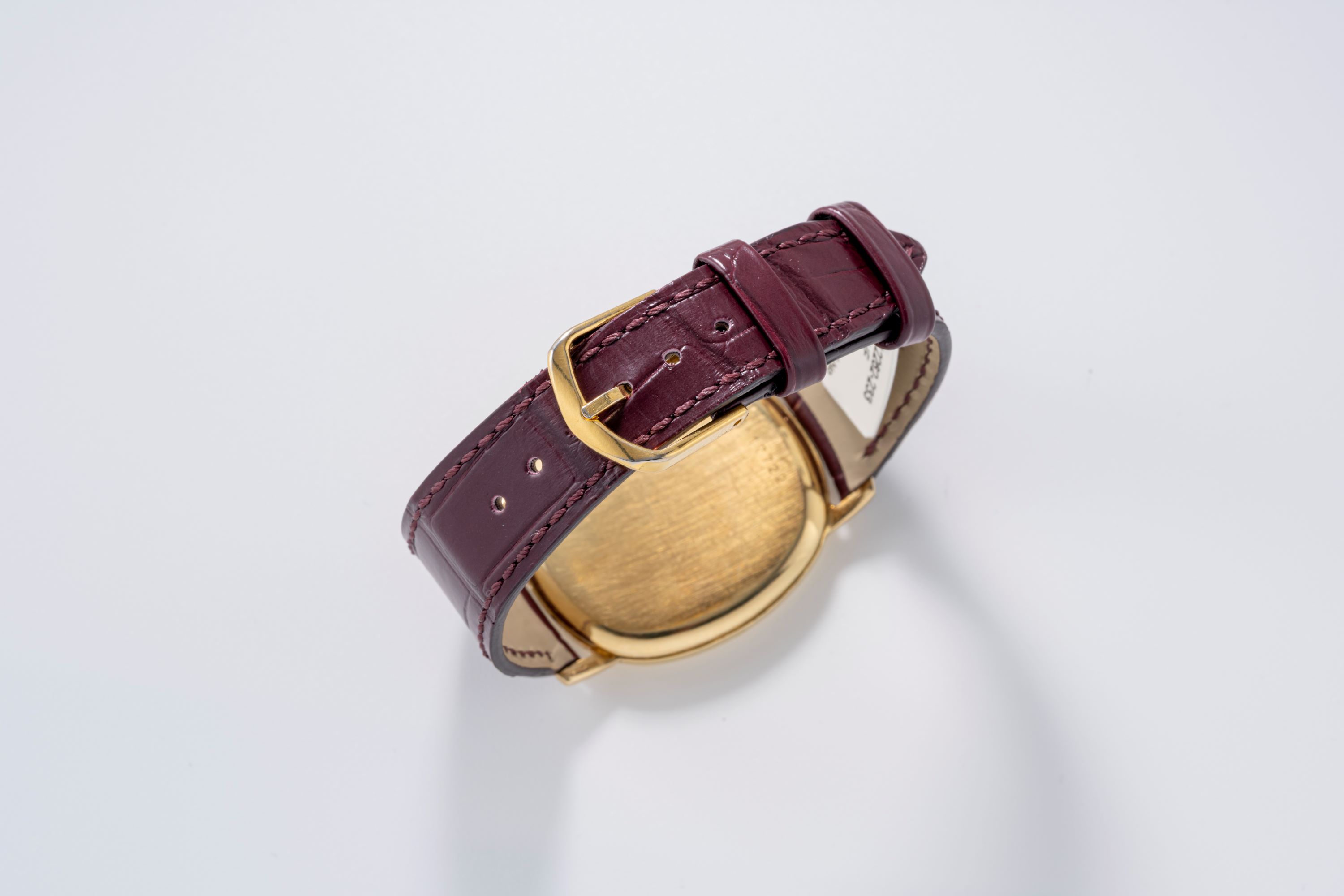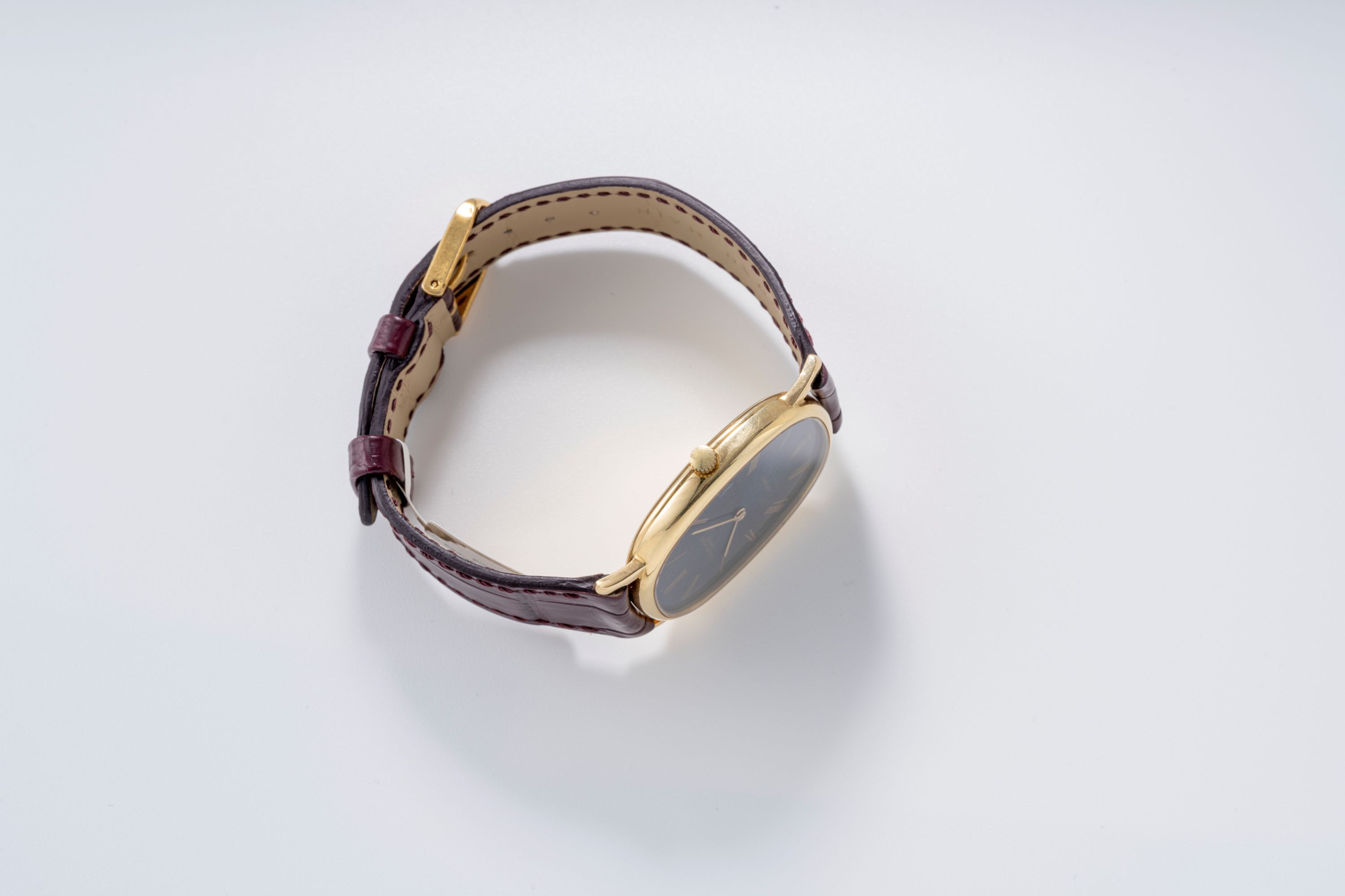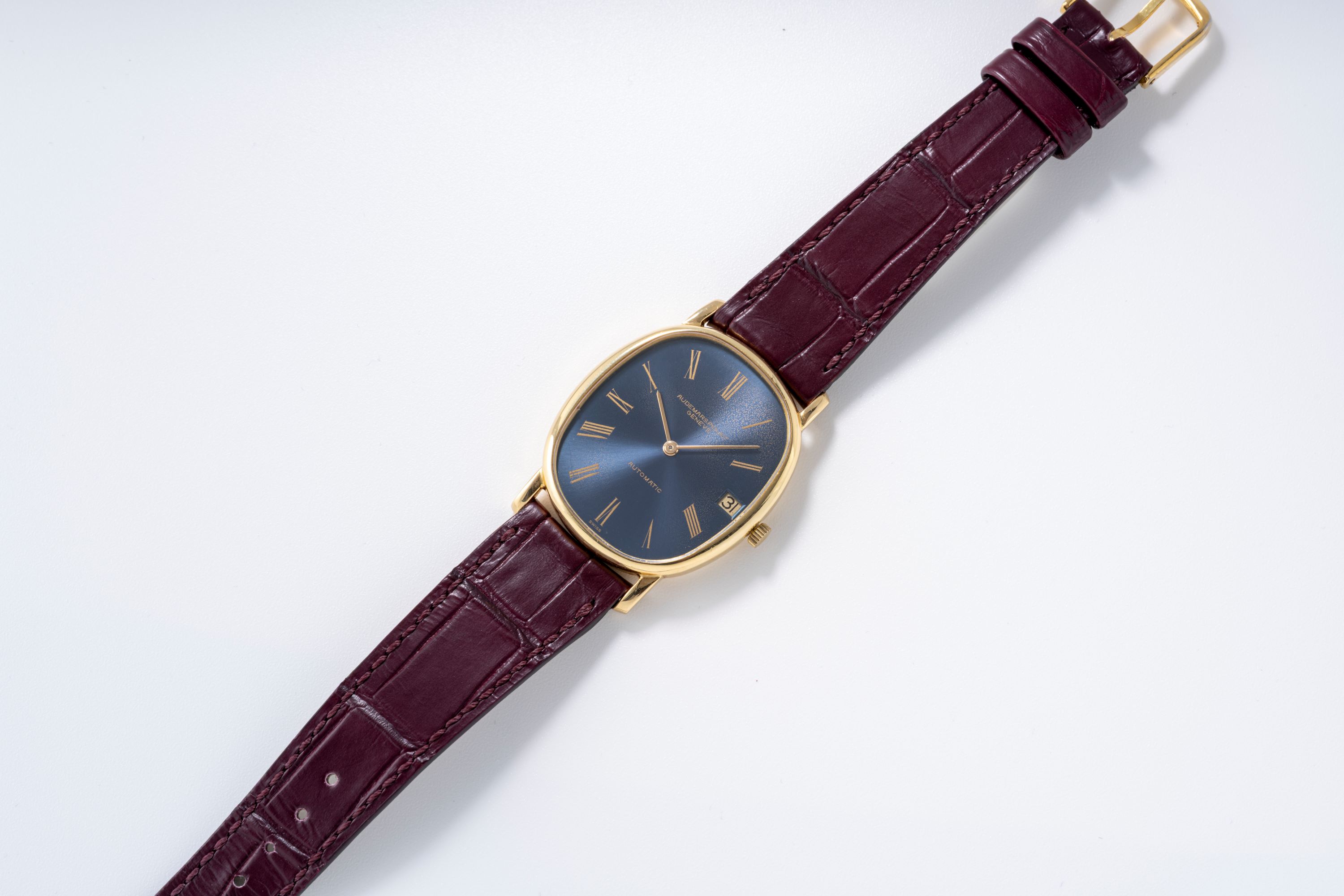 This Audemars Piguet Ellipse Ref. 722 in 18k yellow gold offers the slim, elegant profile associated with AP’s dress designs of the period, powered by the JLC-based Caliber 2121, a movement known for its thin construction and steady performance. While the watch prominently hints at Patek Philippe’s Ellipse design, the blue dial with golden roman numerals provides a clear and balanced display, with the date positioned at 3 o’clock for extra versatility. The case remains in good condition, showing careful wear rather than heavy polishing. As a model produced in more limited numbers than other references, the 722 presents a well-made, gold automatic watch from a leading Swiss manufacturer, with a recognized high-grade movement and a distinctive, restrained design at an intriguing price point.
