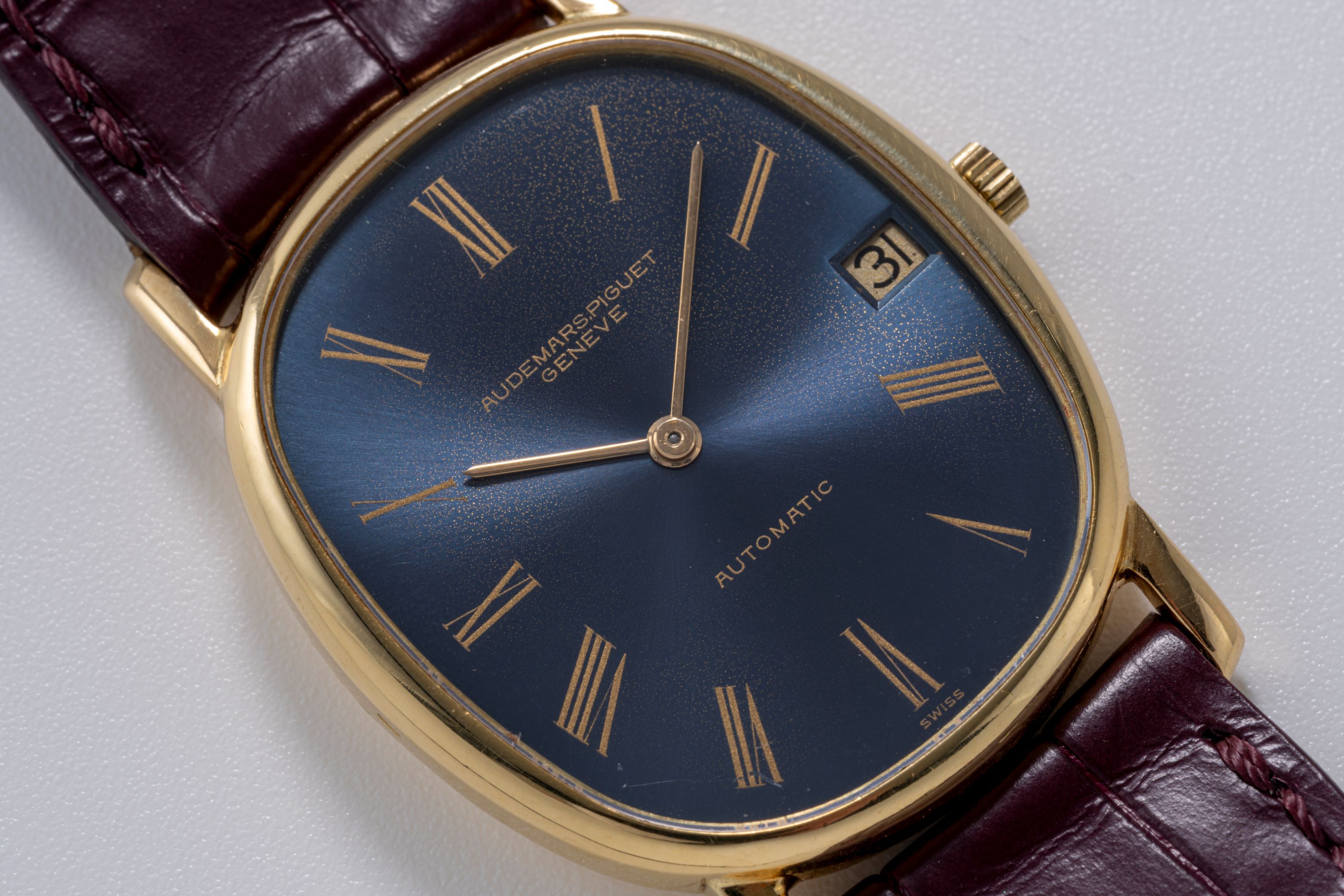 DialBlue sunburst dial with golden roman numerals, gold stick hands, date window at 3 o'clock, signed 'Audemars Piguet' at 12 o'clock