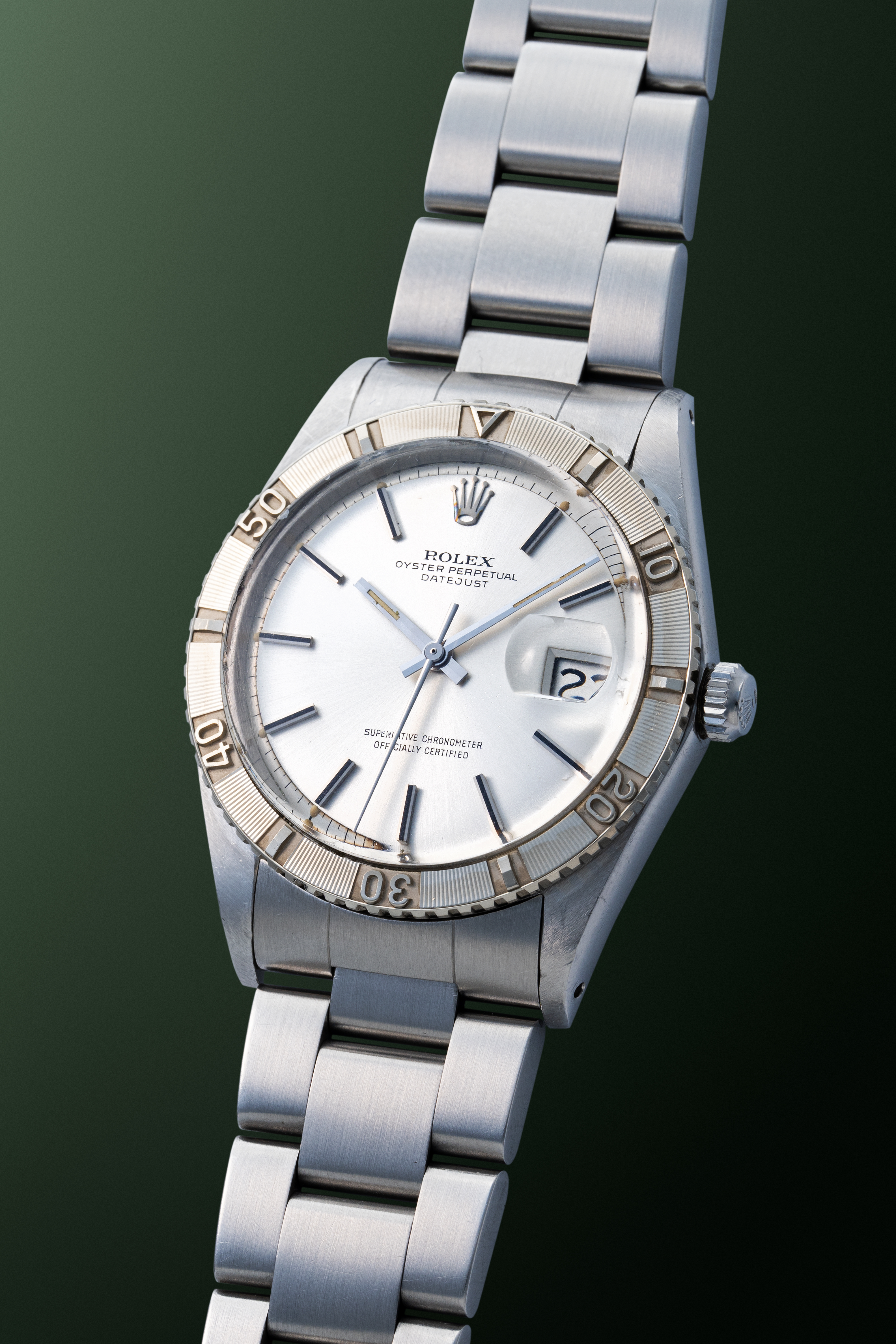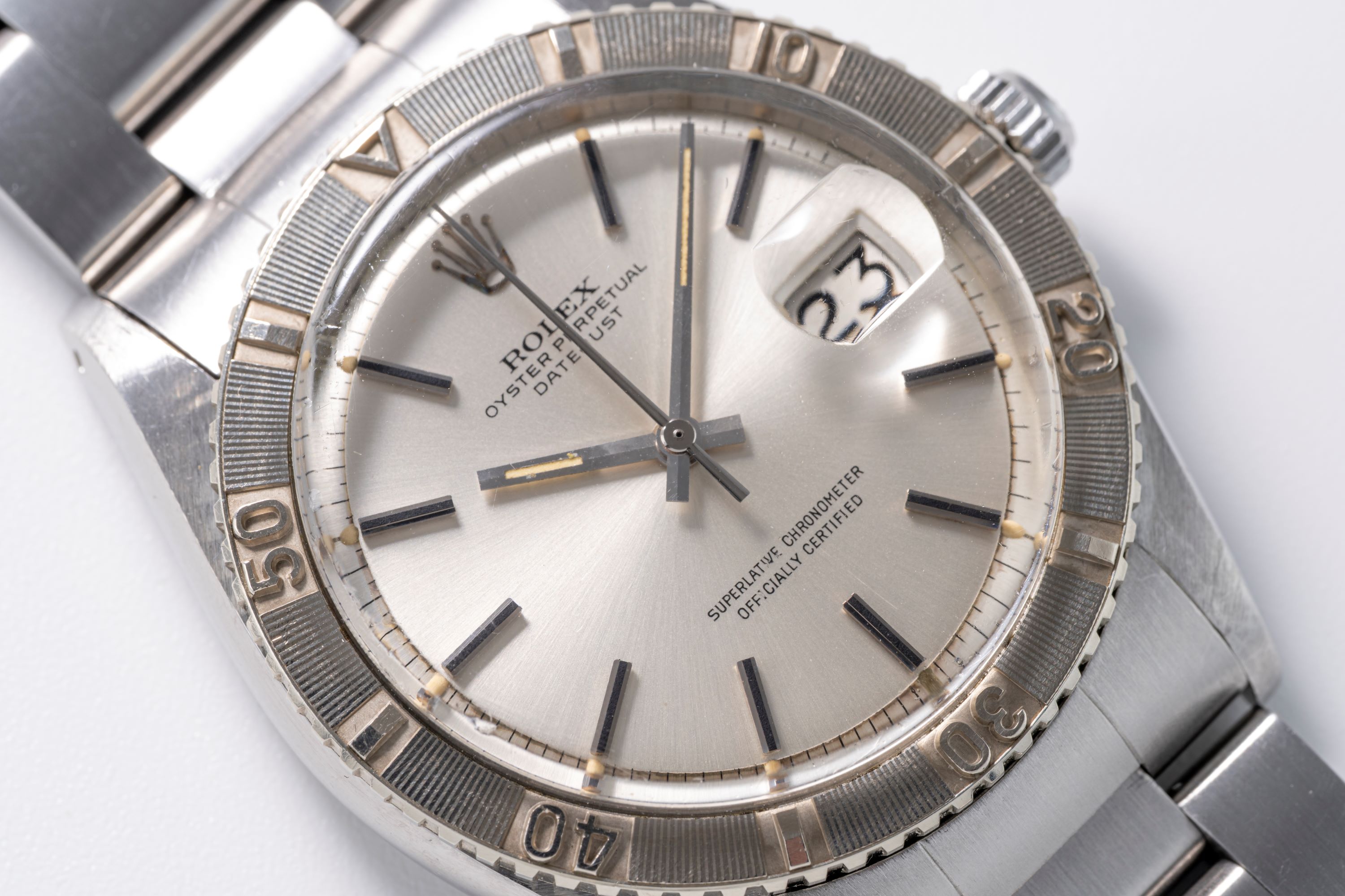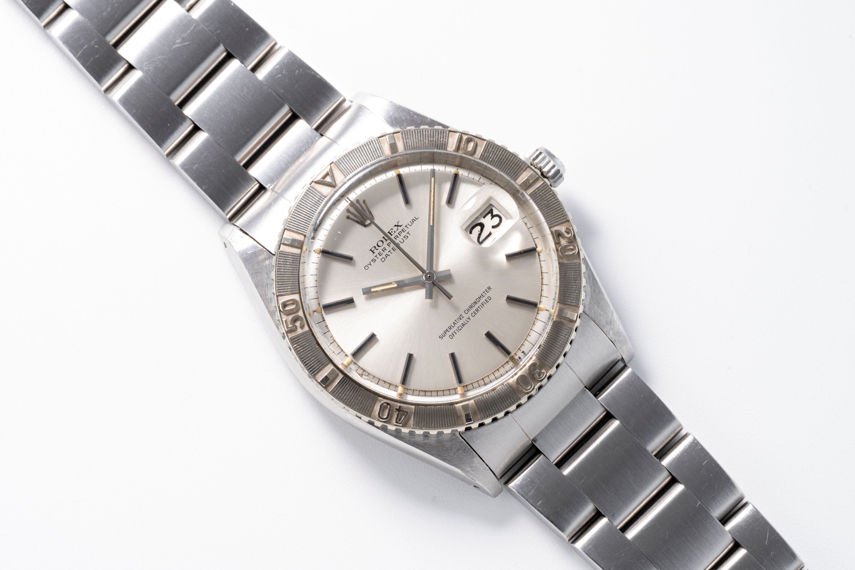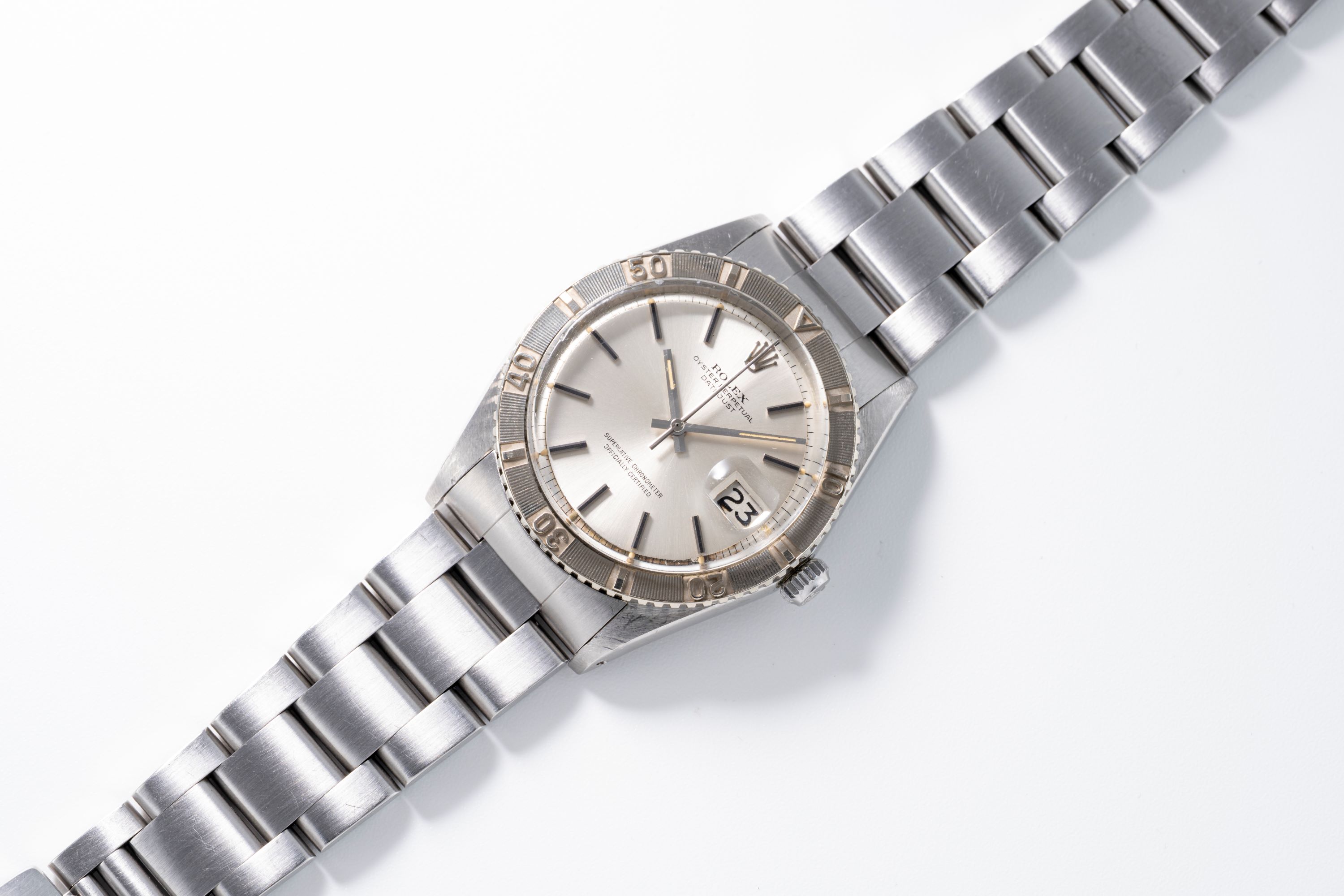 The Rolex Turn-O-Graph Ref. 1625 represents a historically significant yet often underestimated model within the brand’s legacy as a tool-watch innovator. Introduced in the early 1950s, the Turn-O-Graph was Rolex’s first serially produced wristwatch to feature a rotating bezel, a design innovation that would later become pivotal for models such as the Submariner and GMT-Master. The Ref. 1625 in stainless steel with a silver dial offers a compelling combination of early functionality and classy aesthetic. The 36mm Oyster case boasts vintage appeal due to its compact size and slim rotating relief bezel, compared to the later Ref. 16264 for which Rolex decided to slightly increase the size of the bezel. Under the hood, the 1625 is powered by the automatic Caliber 1570, a robust, Rolex-built automatic Caliber from the era. With its blend of historical relevance and everyday elegance, as Turn-O-Graphs are no longer part of the Rolex Catalogue, this is a historical piece preserved in fantastic condition throughout.