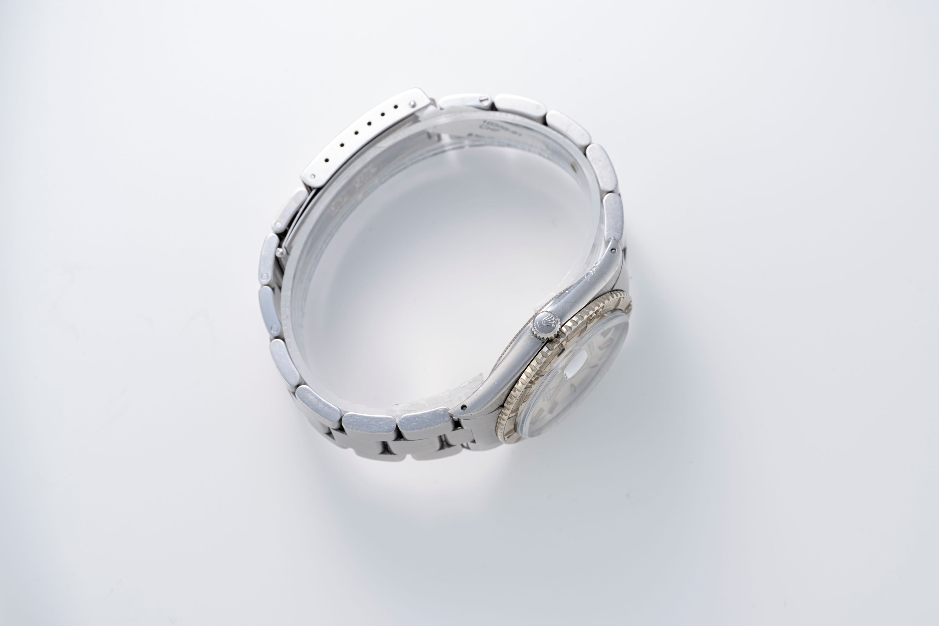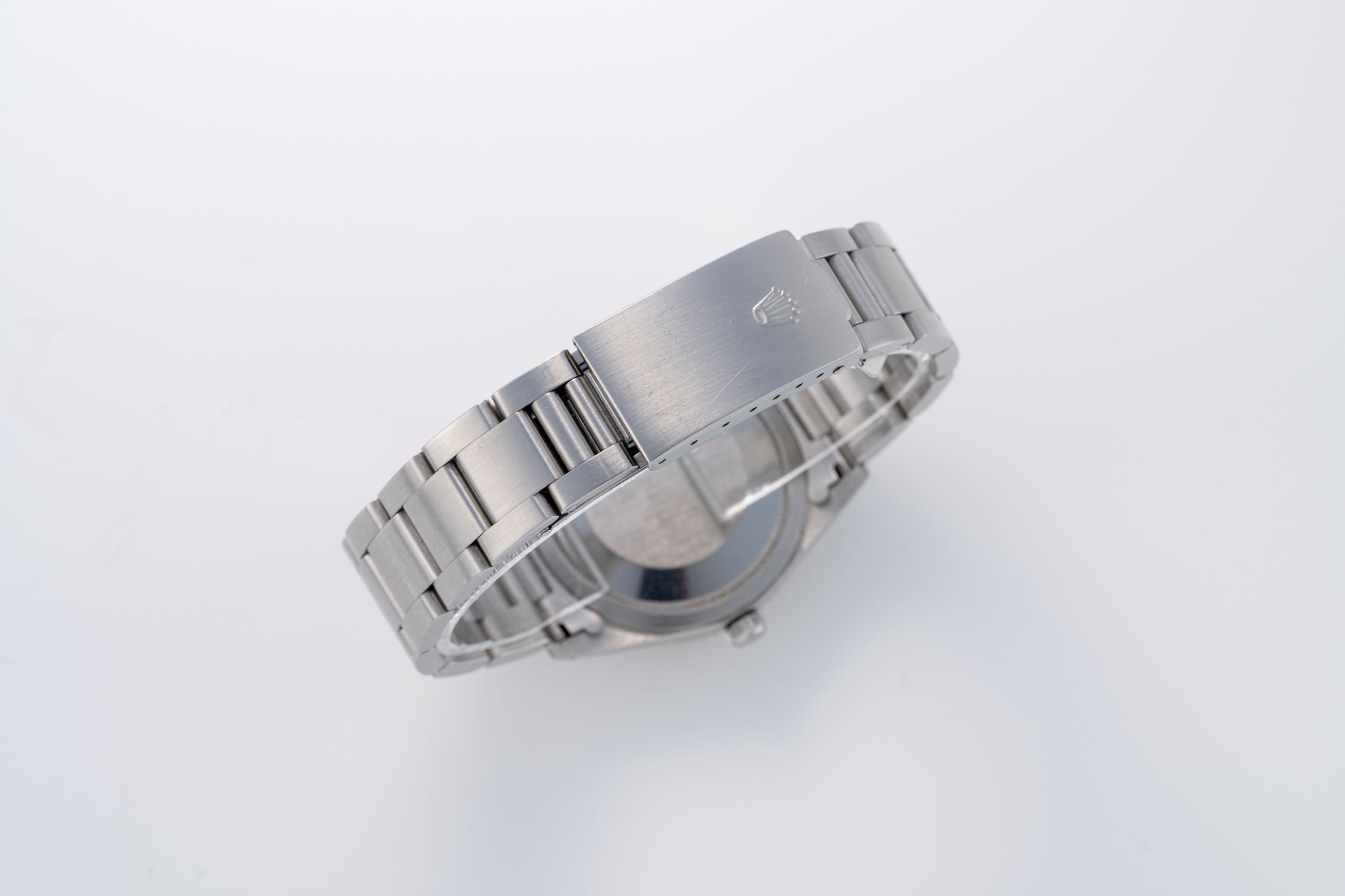 DialSilver sunburst dial with applied indices, stick luminous hands, date window with magnifier at 3 o'clock, signed 'Rolex' at 12 o'clock