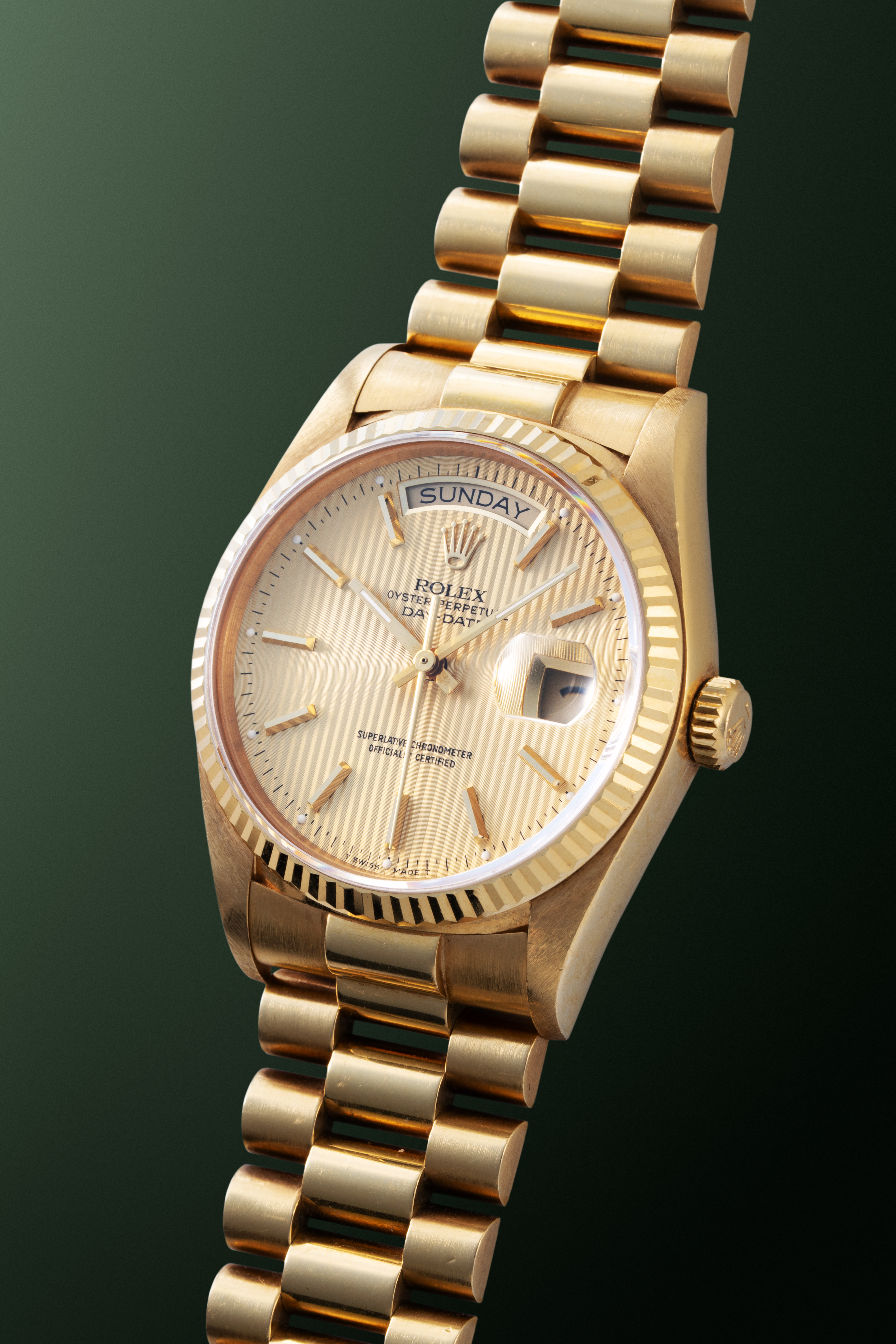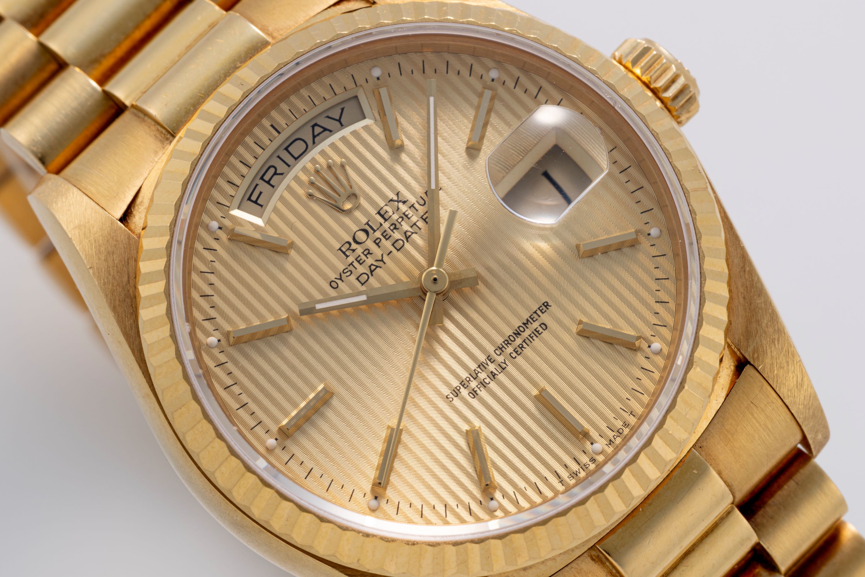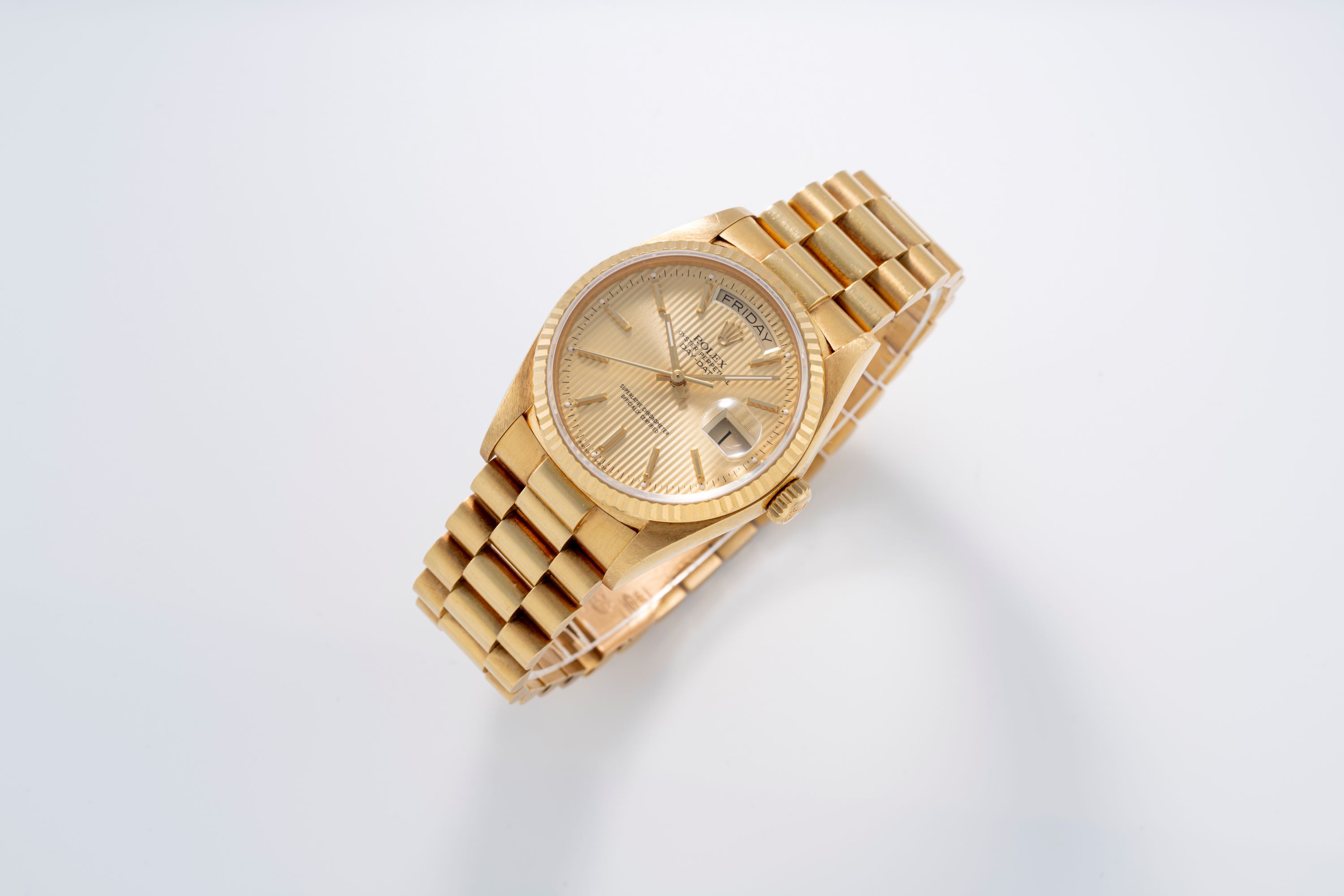 DialGold tapestry dial with vertical striping, applied gold indices, gold hands, day at 12 o'clock, date at 3 o'clock, signed 'Rolex' at 12 o'clock