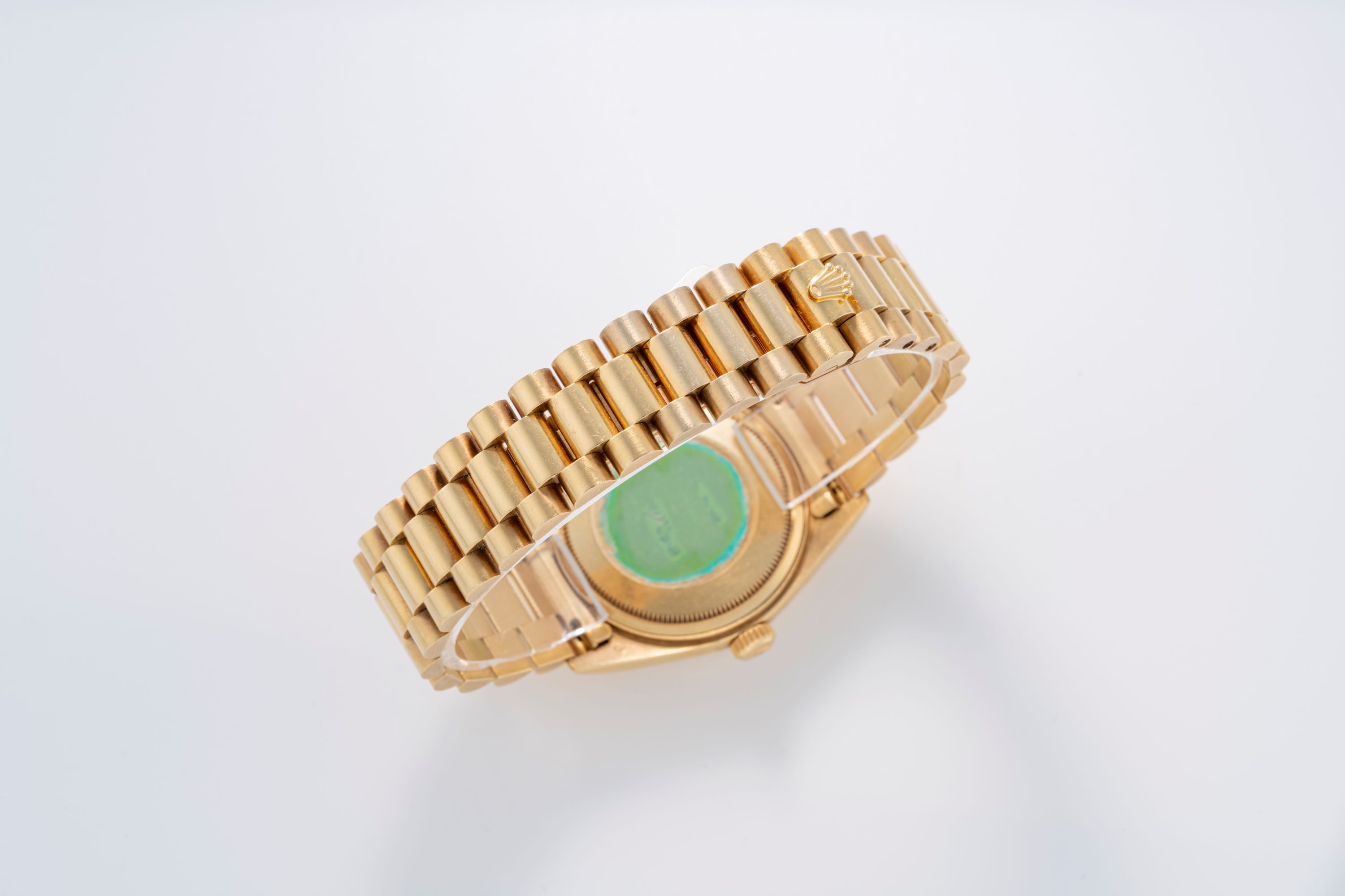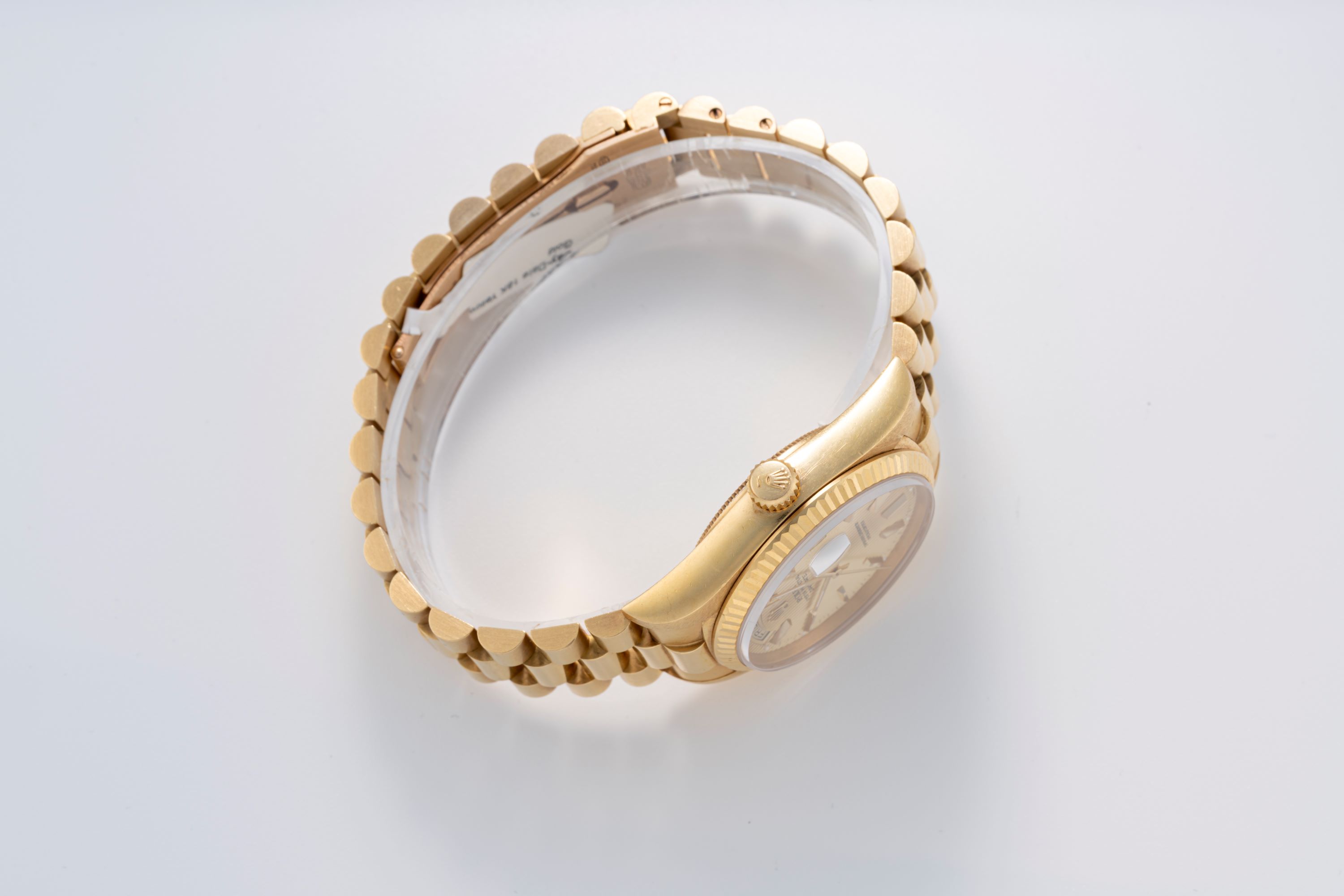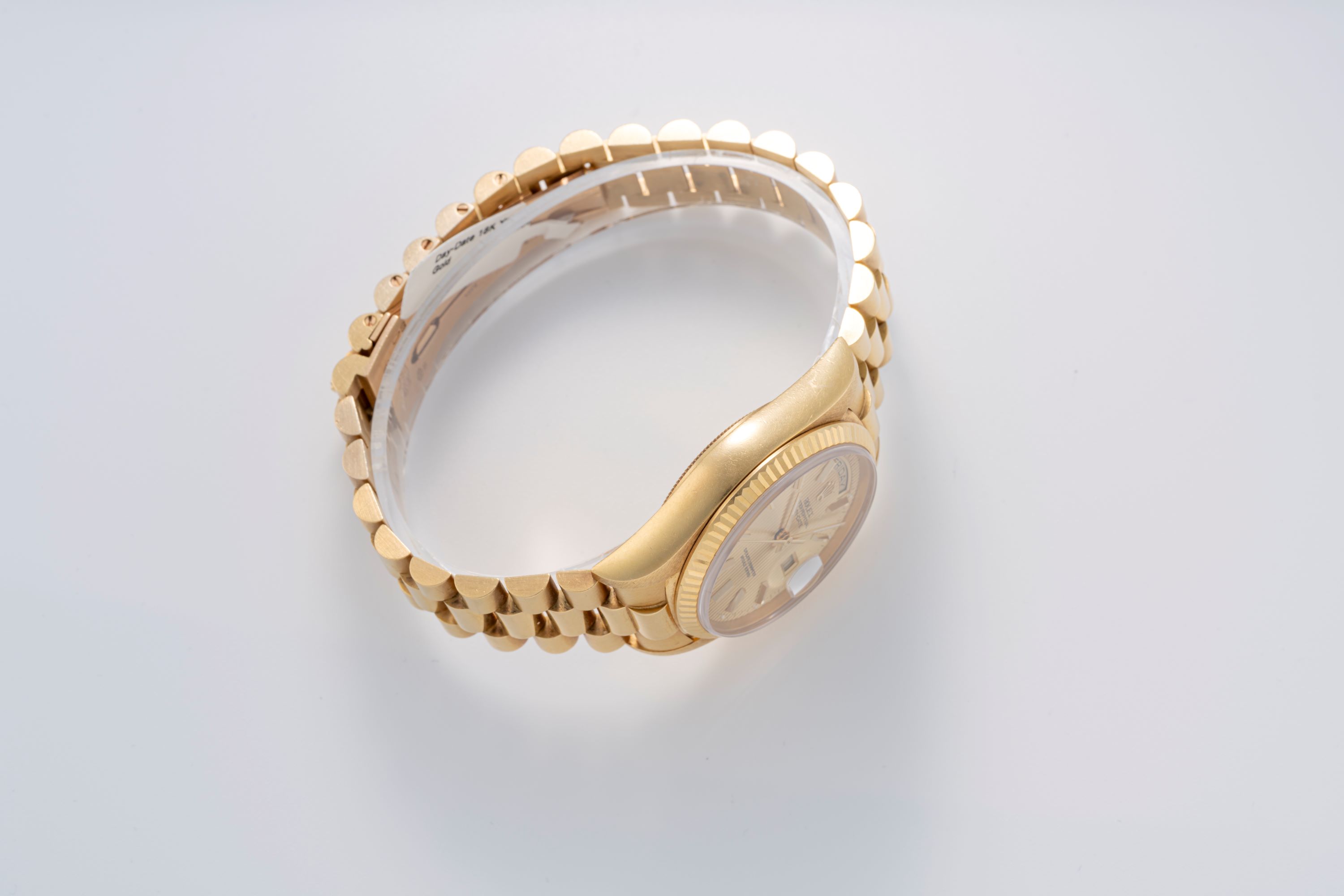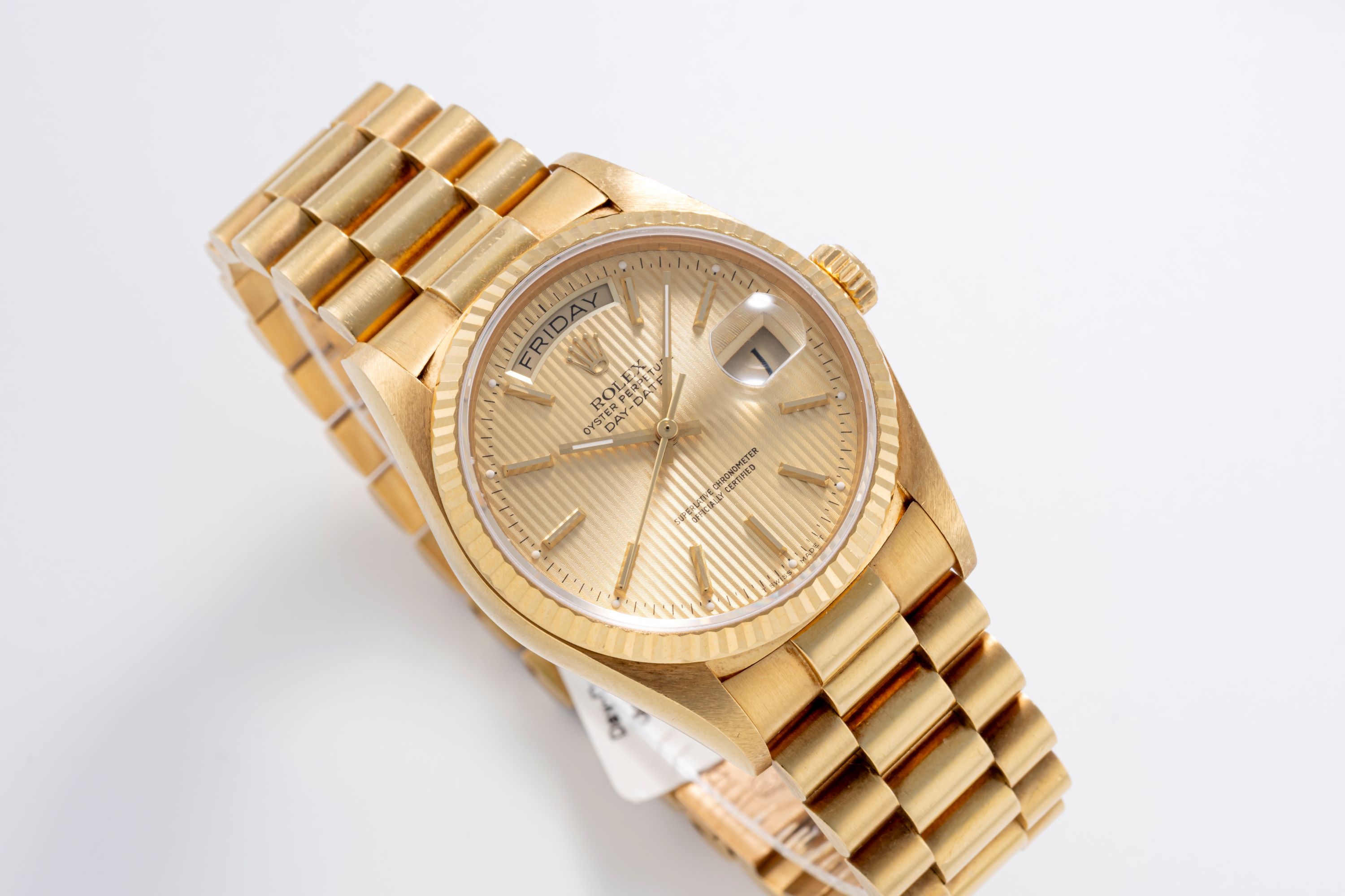 DialGold tapestry dial with vertical striping, applied gold indices, gold hands, day at 12 o'clock, date at 3 o'clock, signed 'Rolex' at 12 o'clock