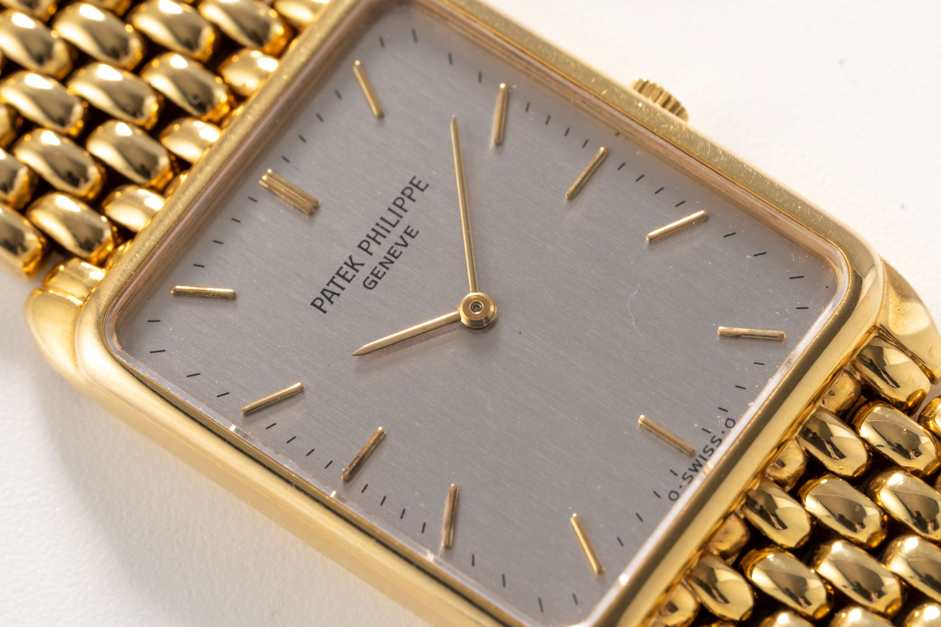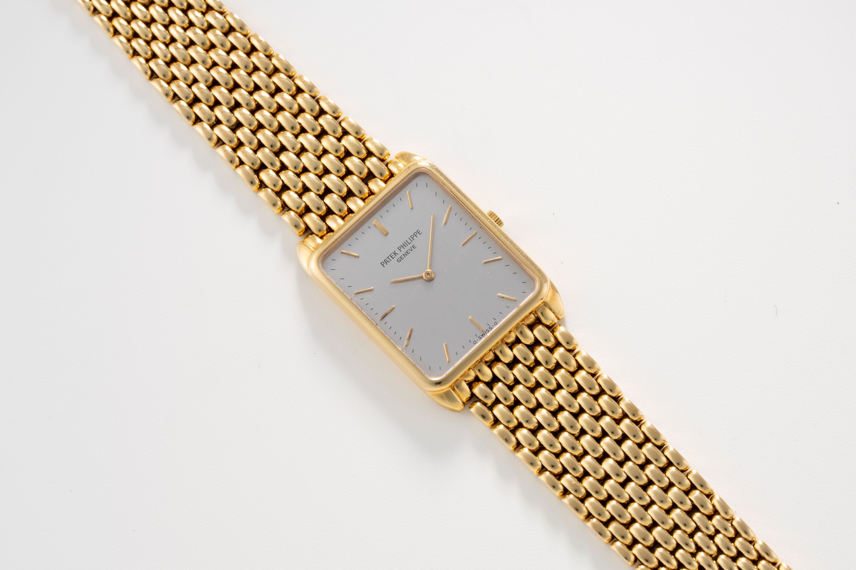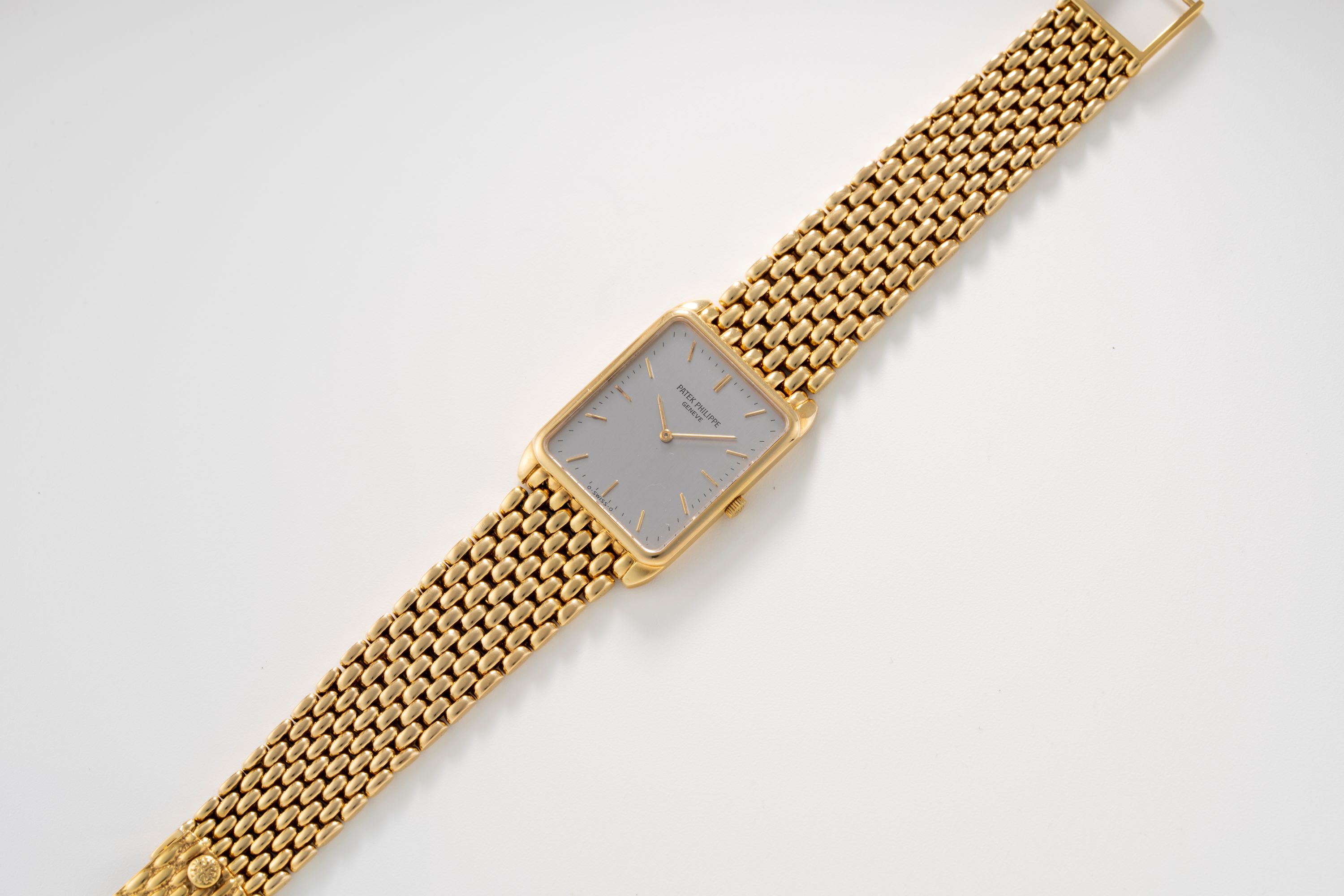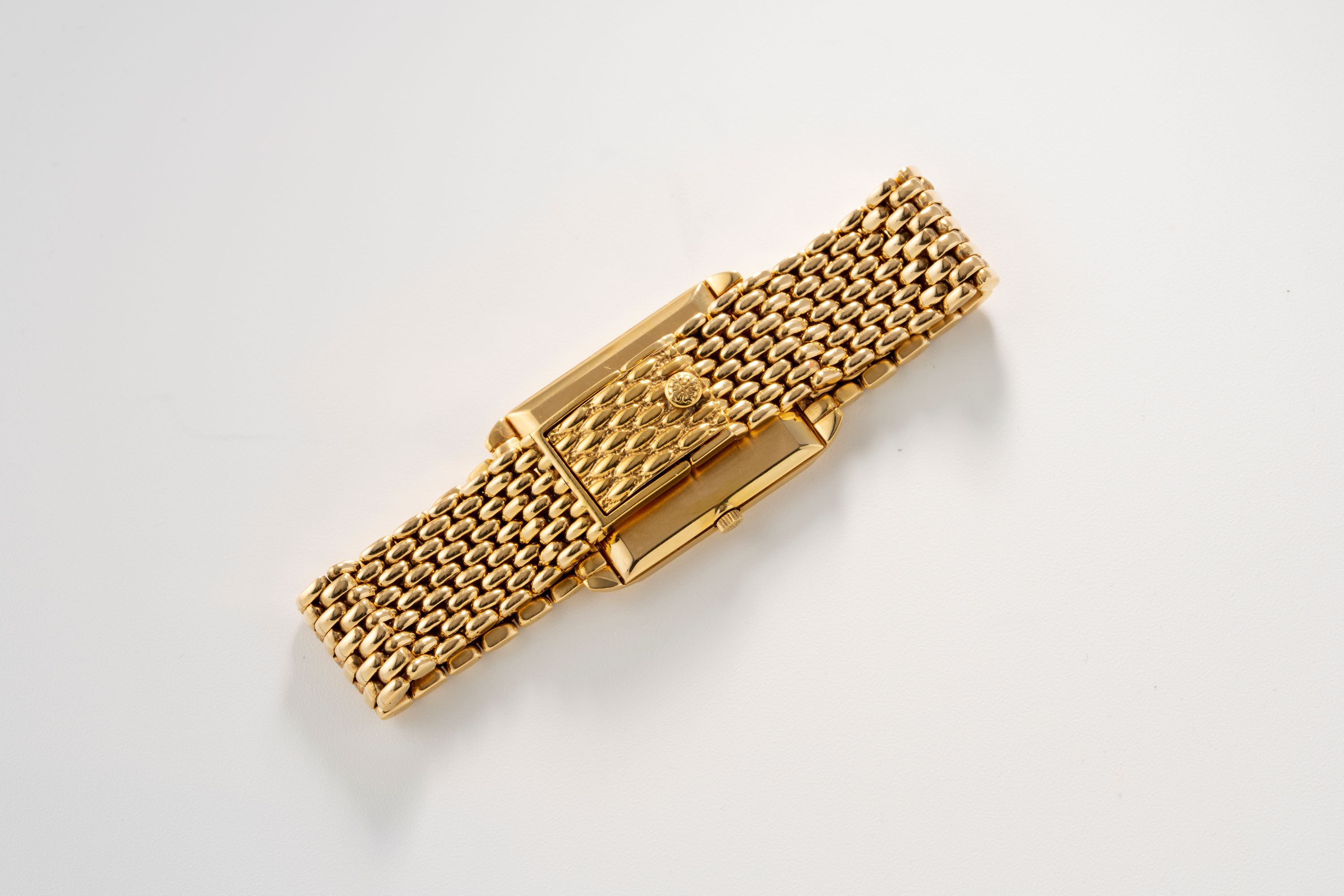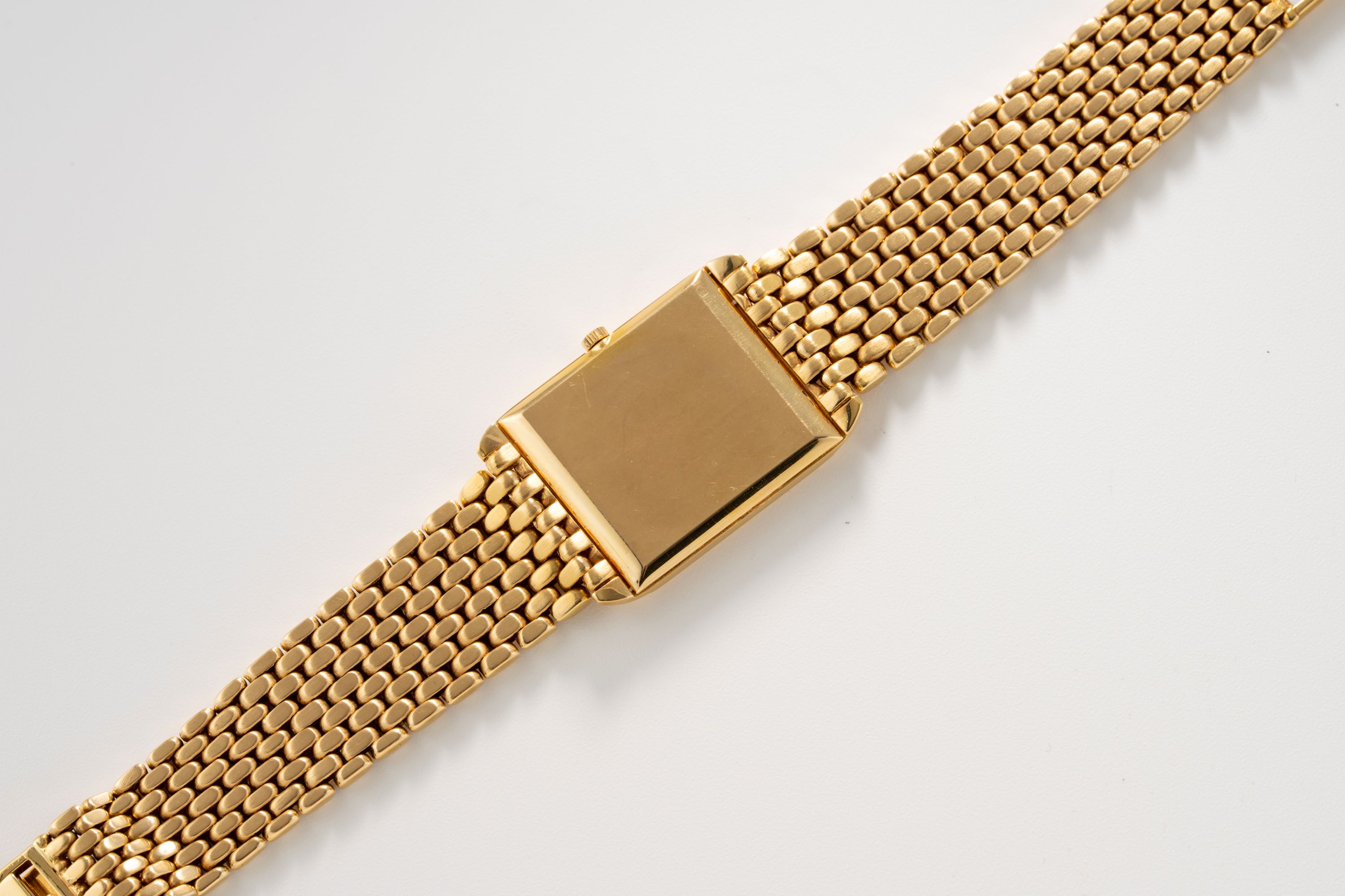CaseRectangular case in 18k yellow gold with winding crown at 3 o'clock, solid caseback