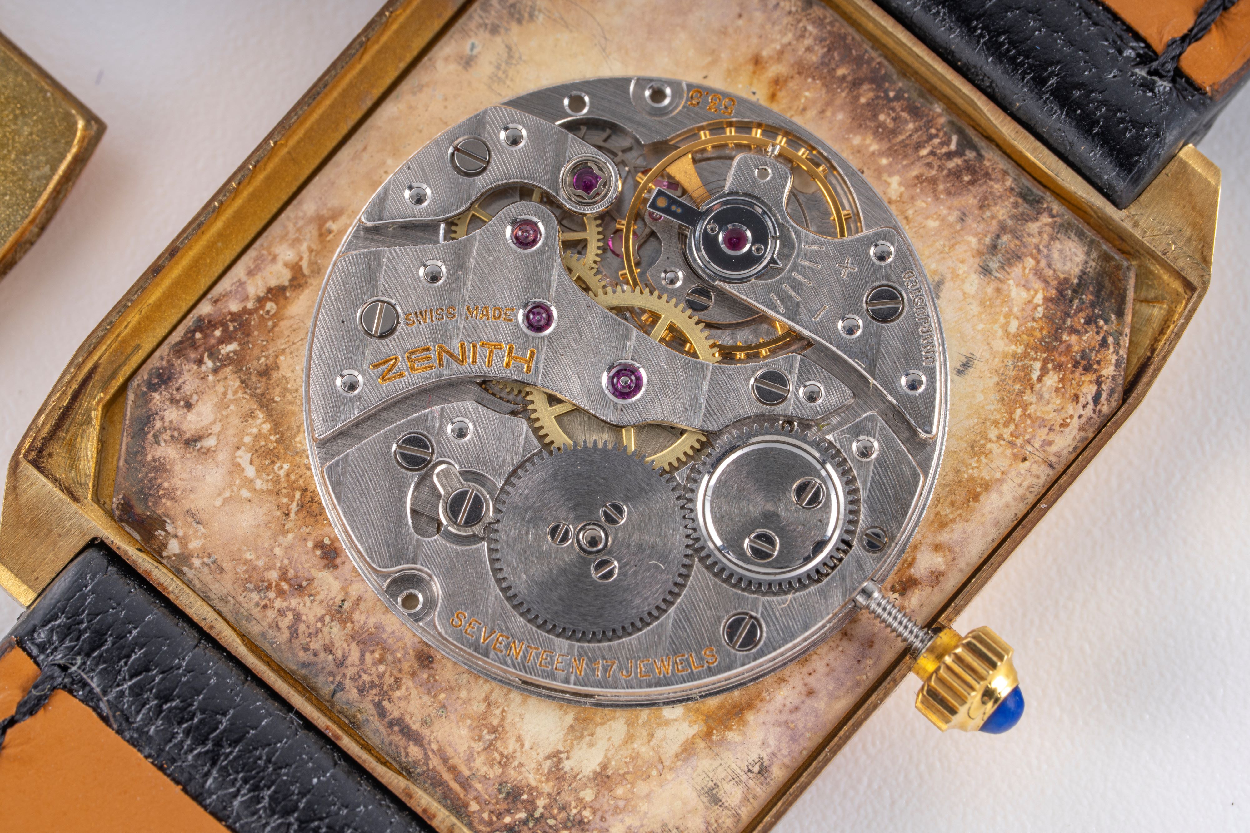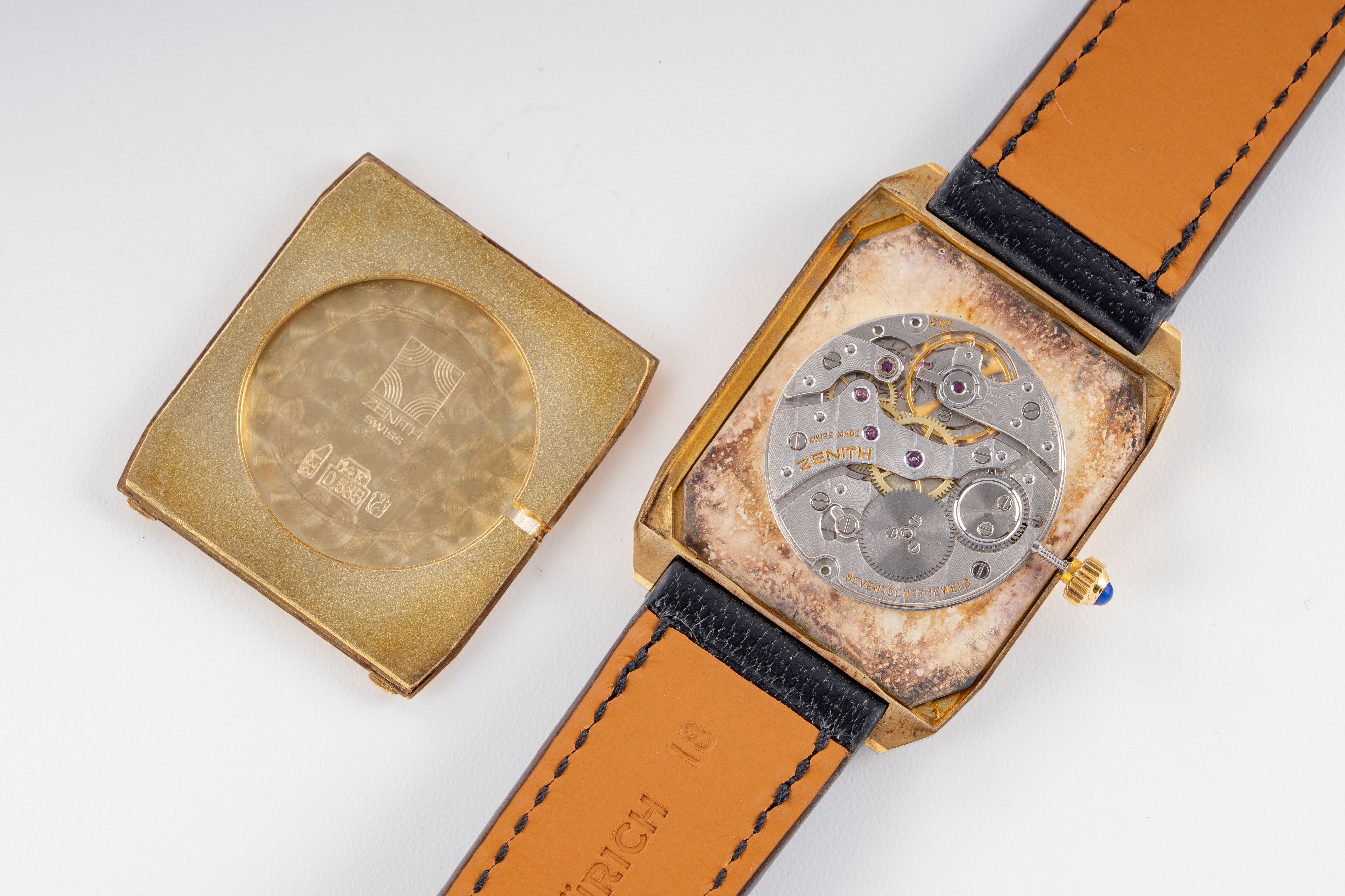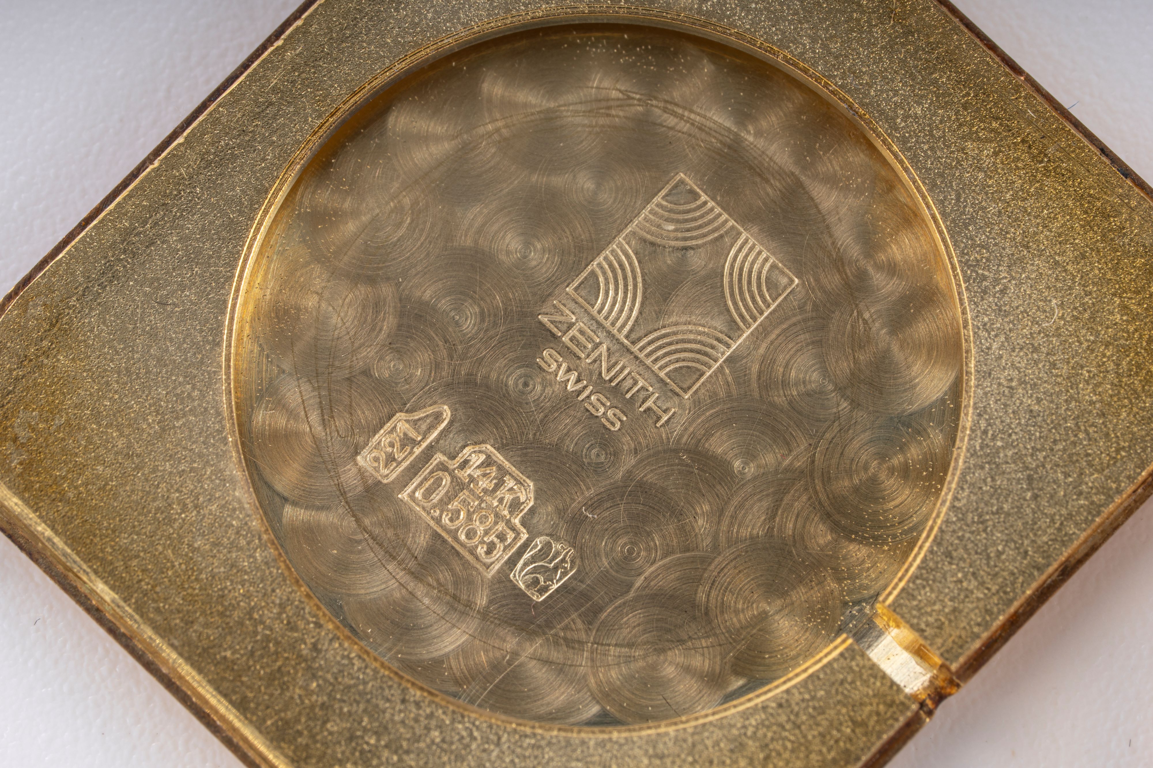CaseAngular Zenith-signed case in 14k yellow gold with cabouchon crown at 3 o'clock, solid caseback