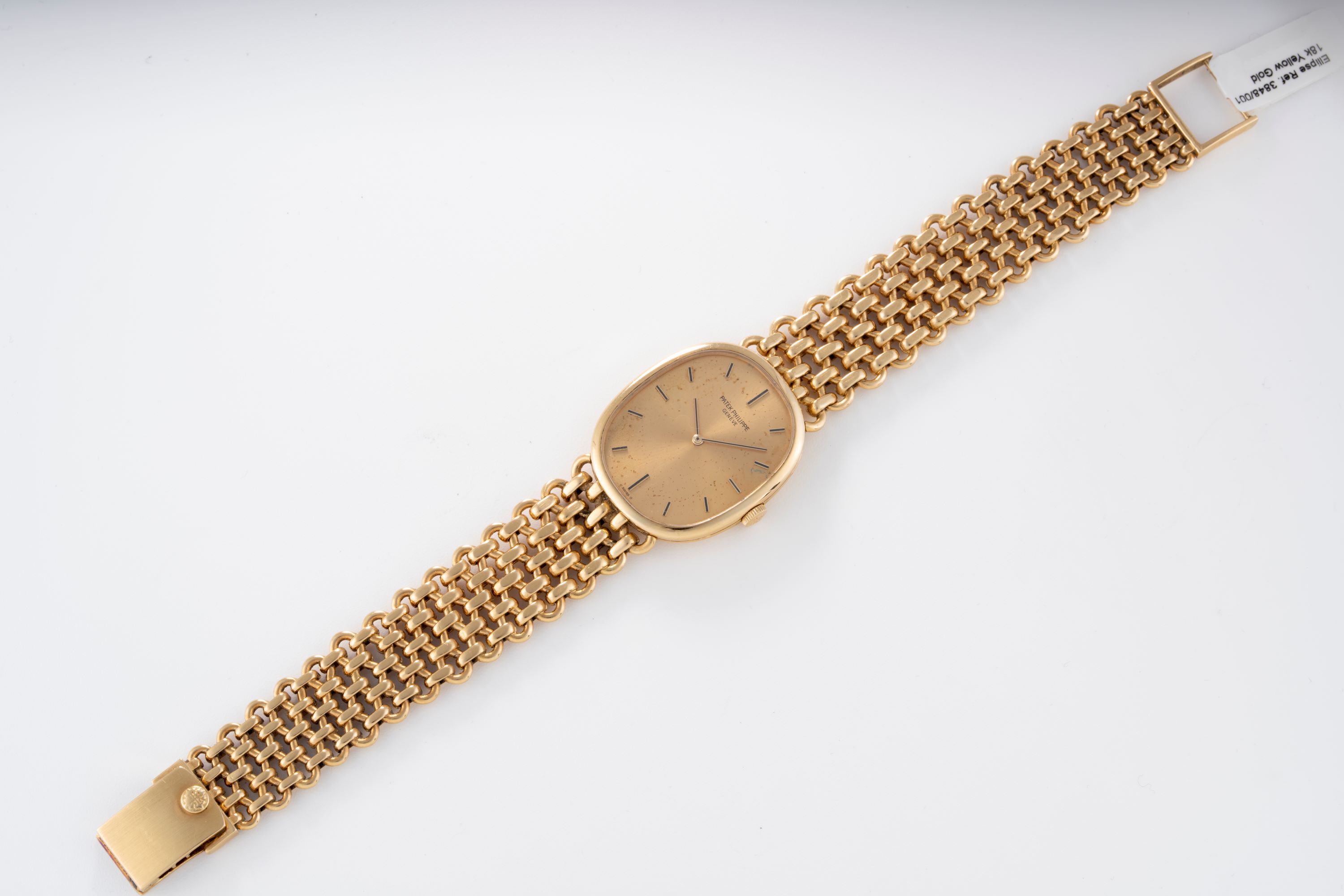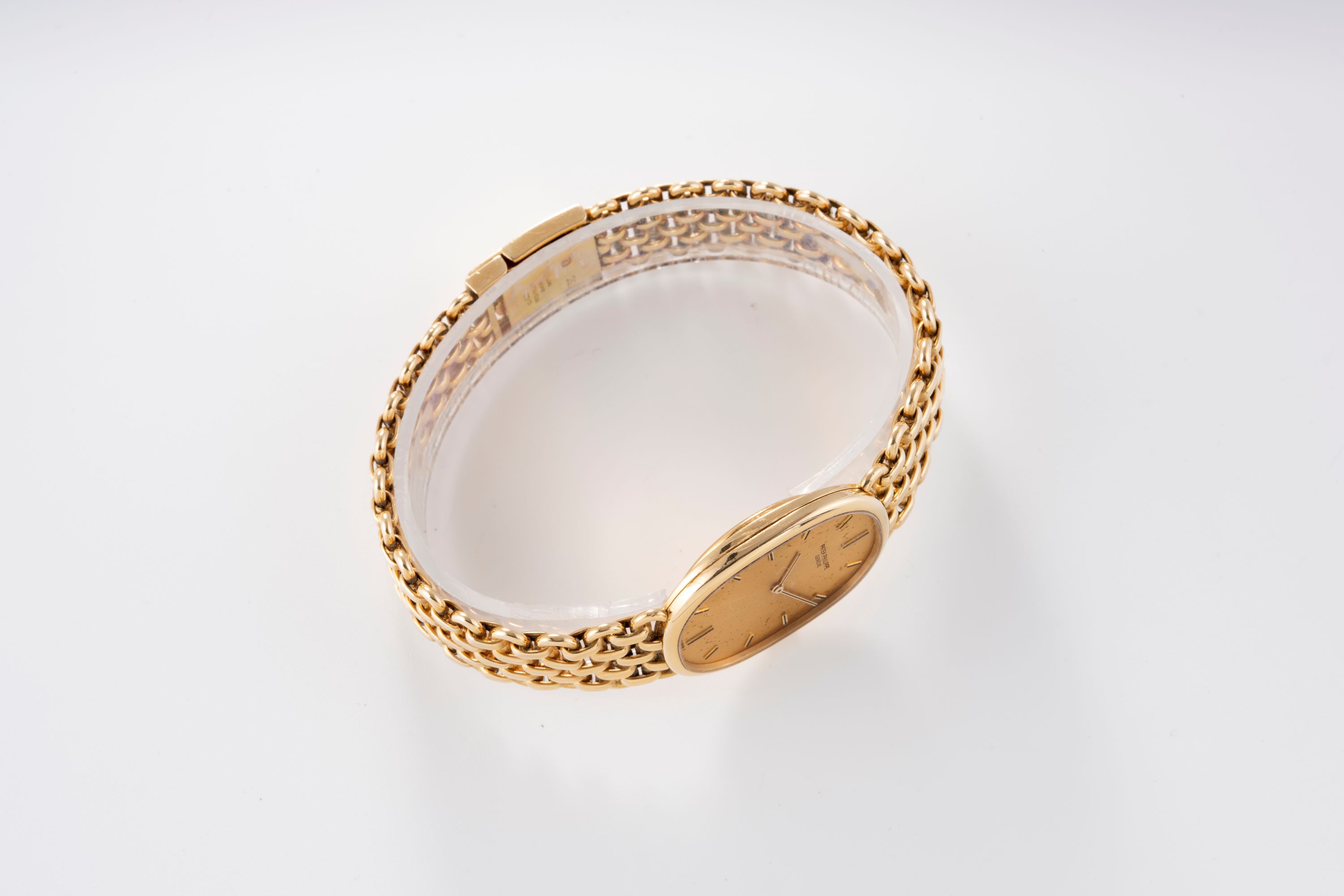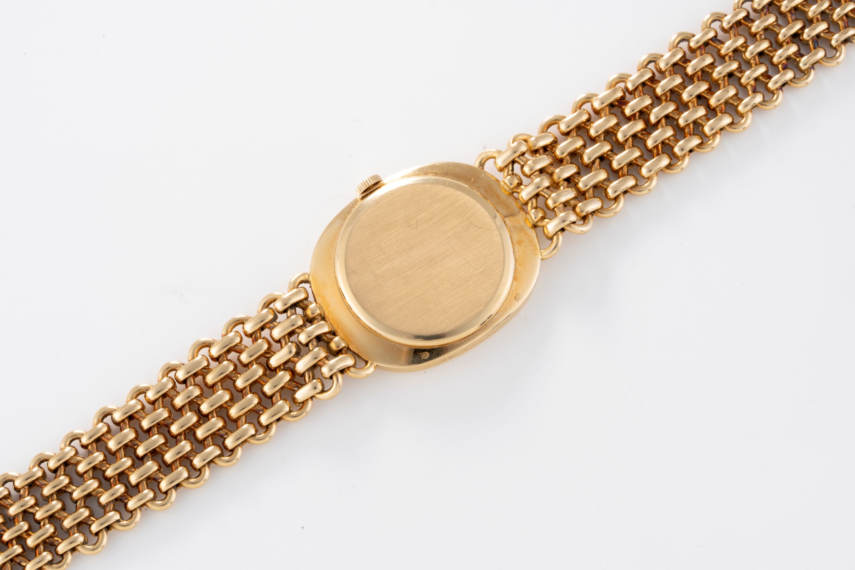 CaseElliptical case in 18k yellow gold with winding crown at 3 o'clock, solid caseback