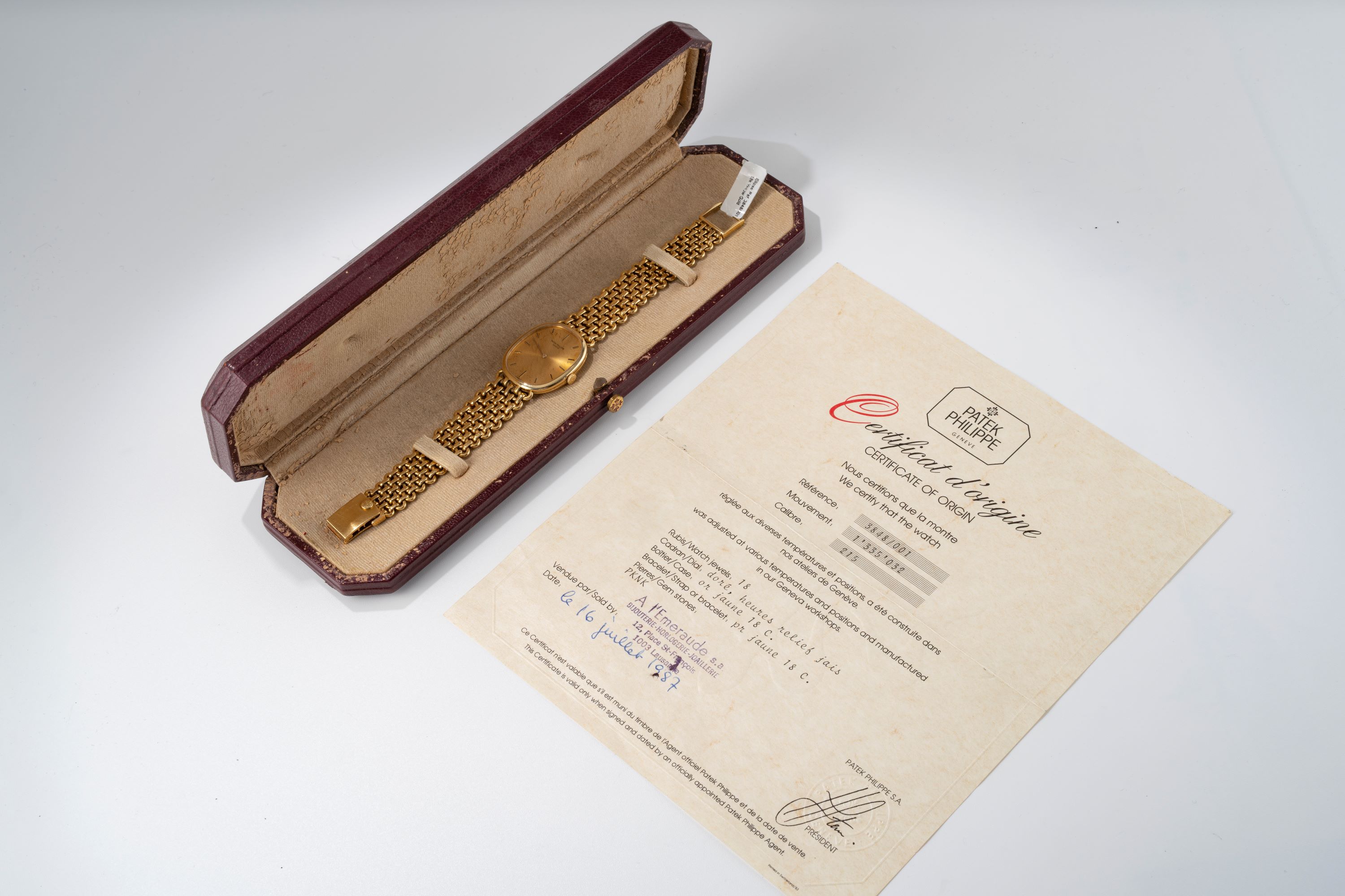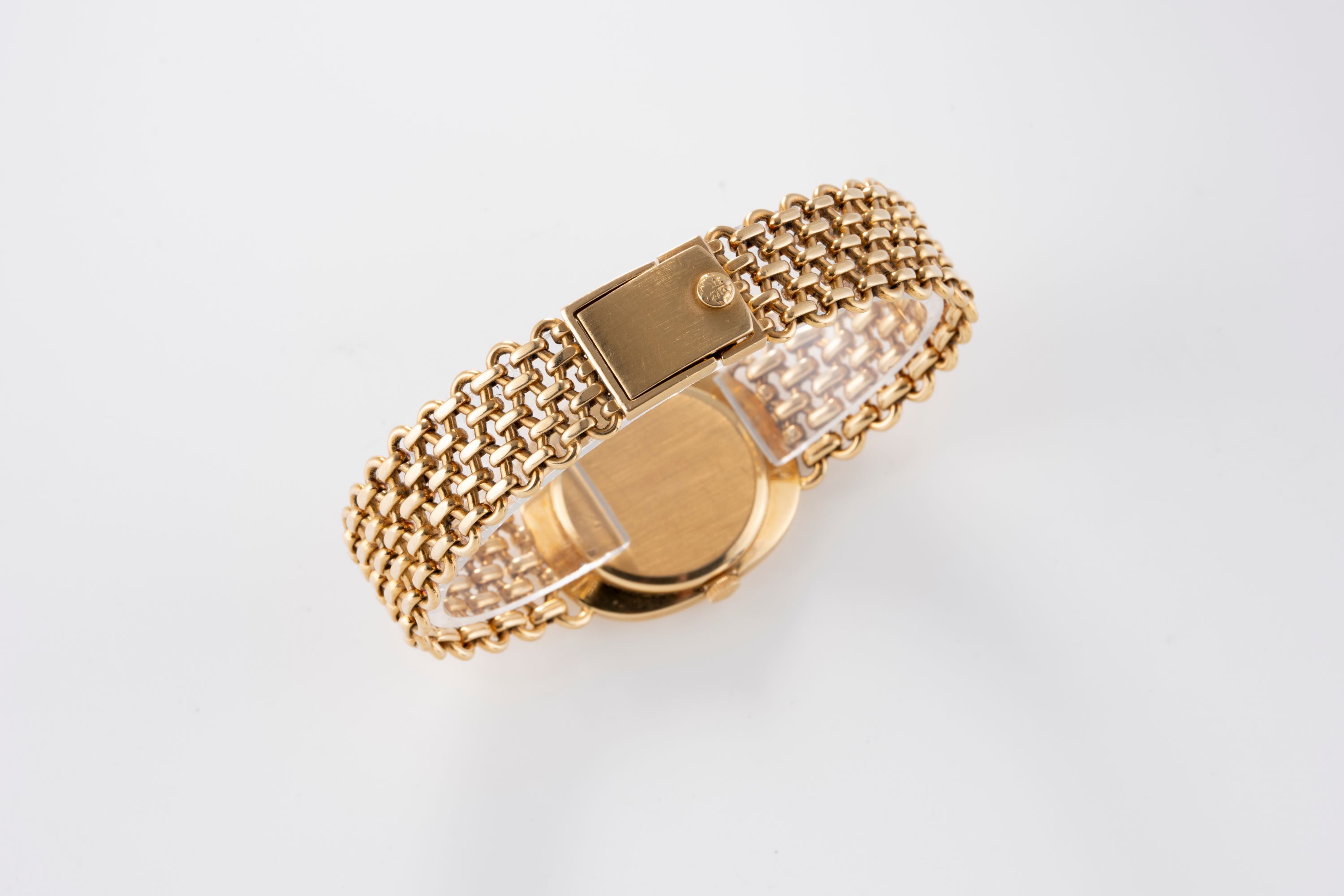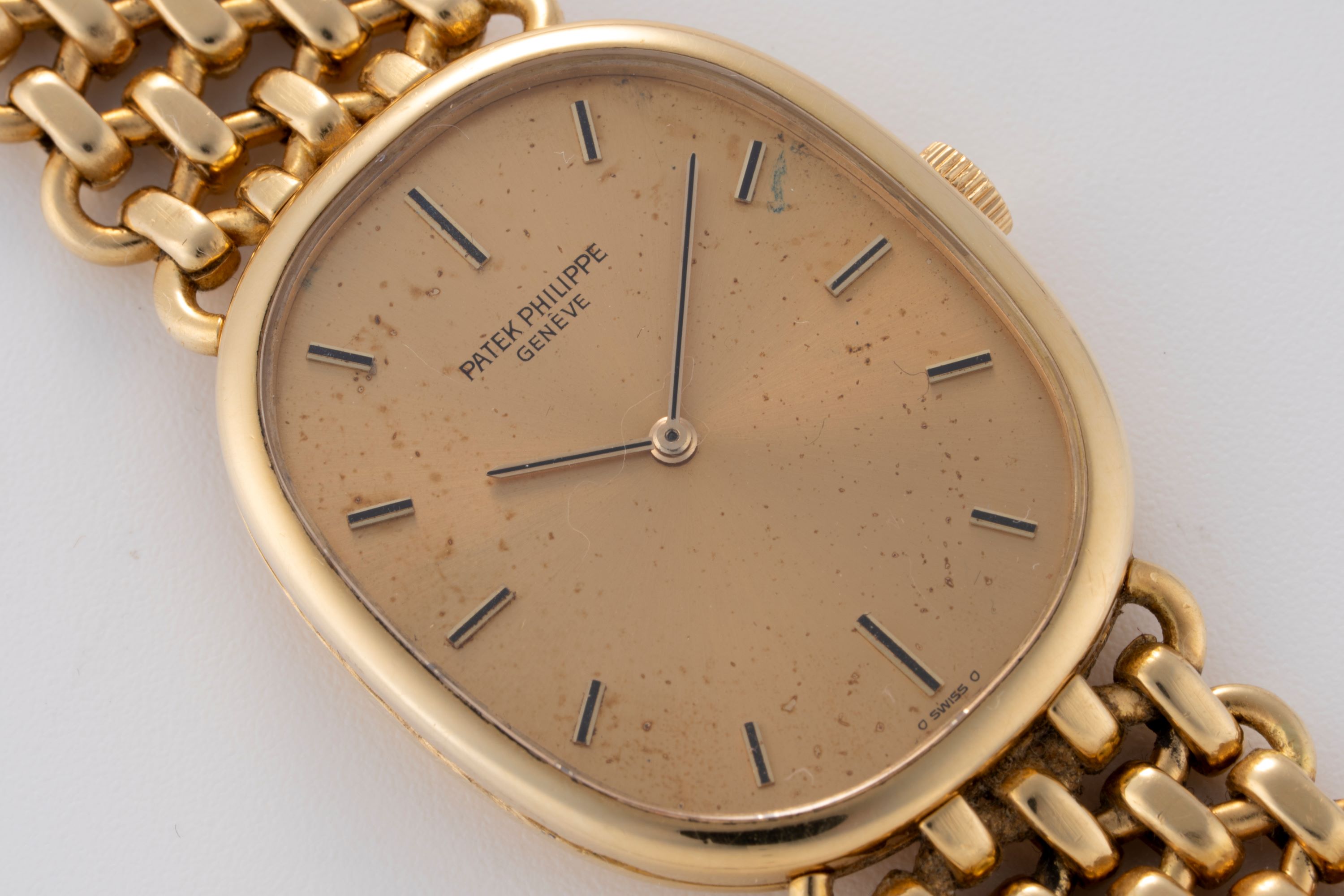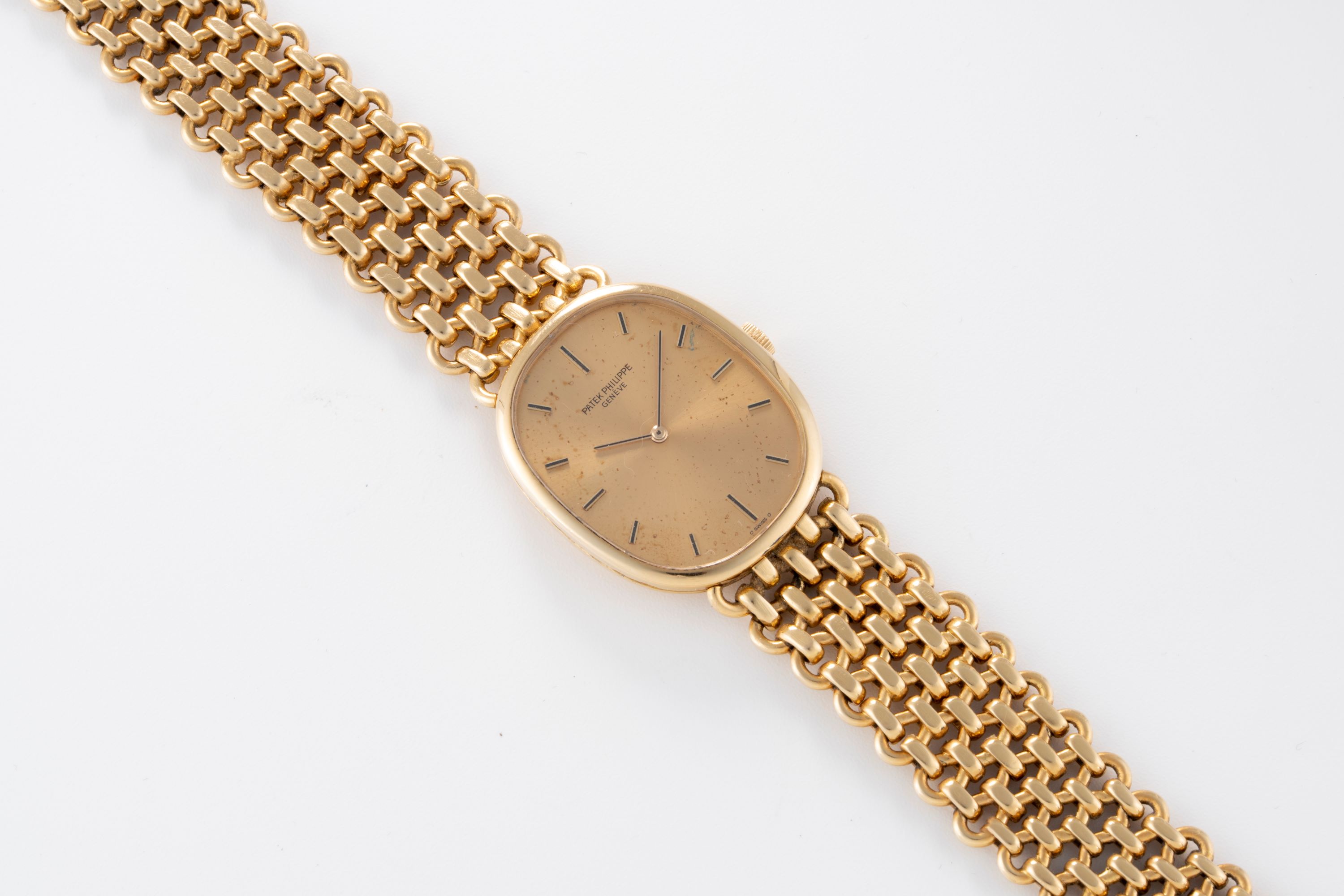 CaseElliptical case in 18k yellow gold with winding crown at 3 o'clock, solid caseback