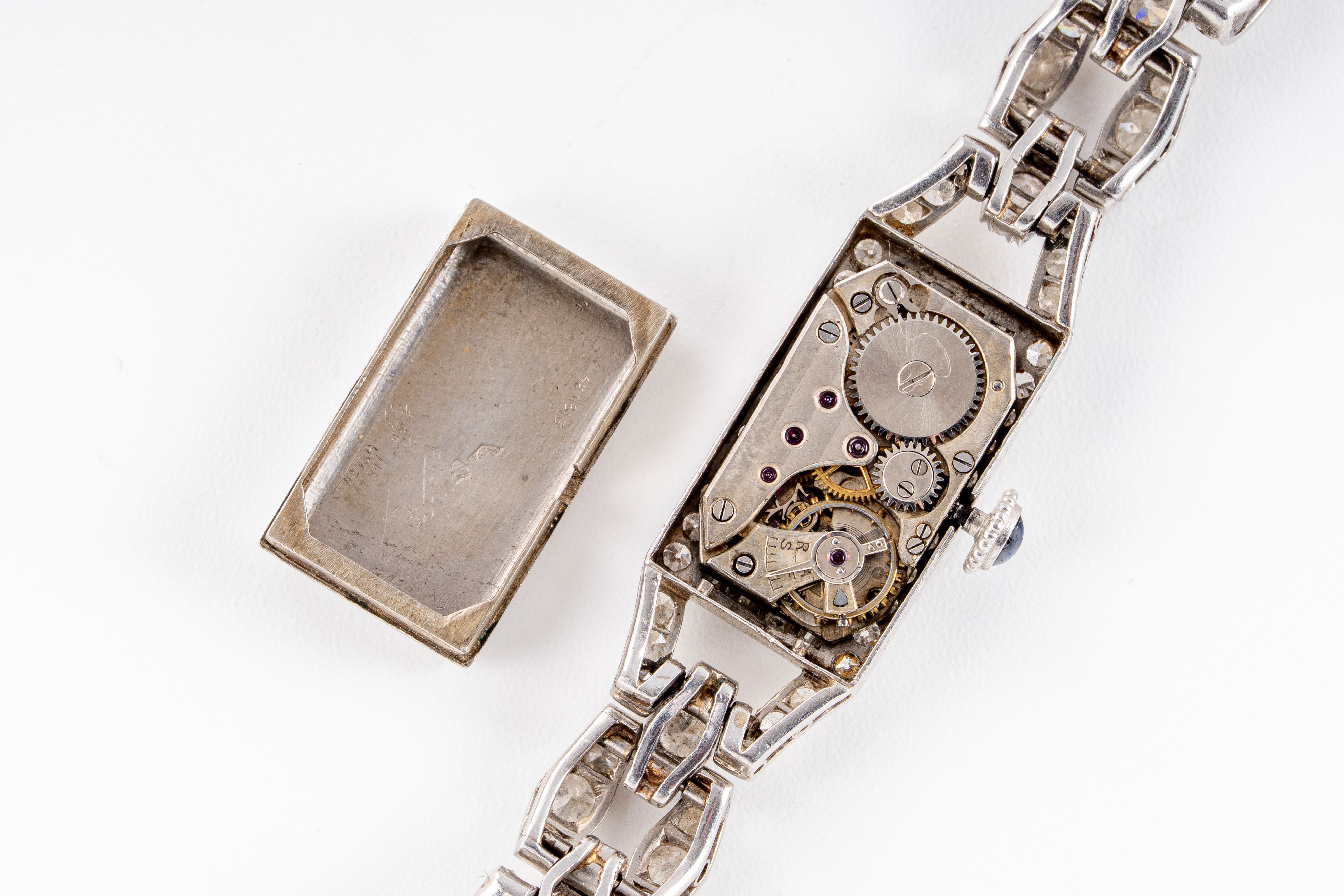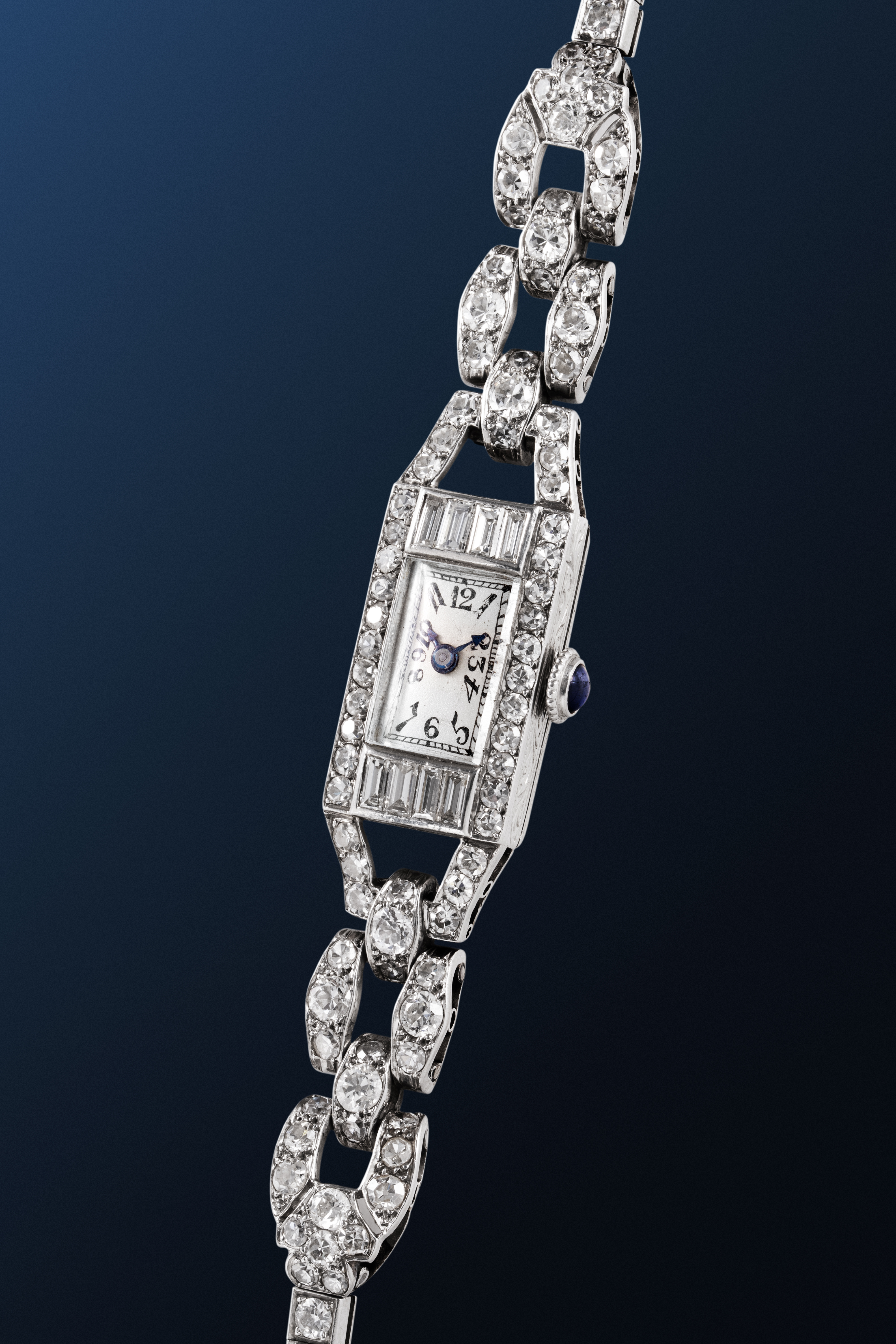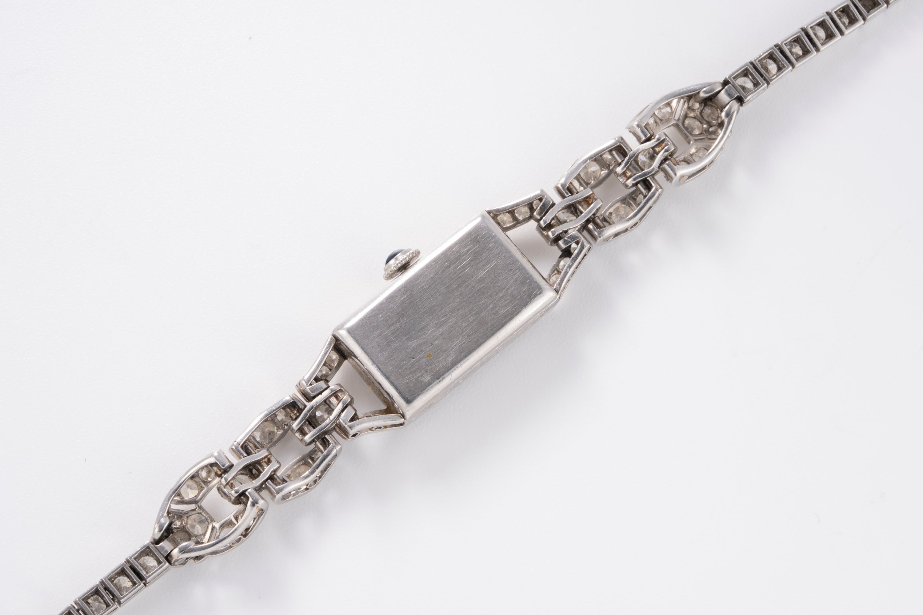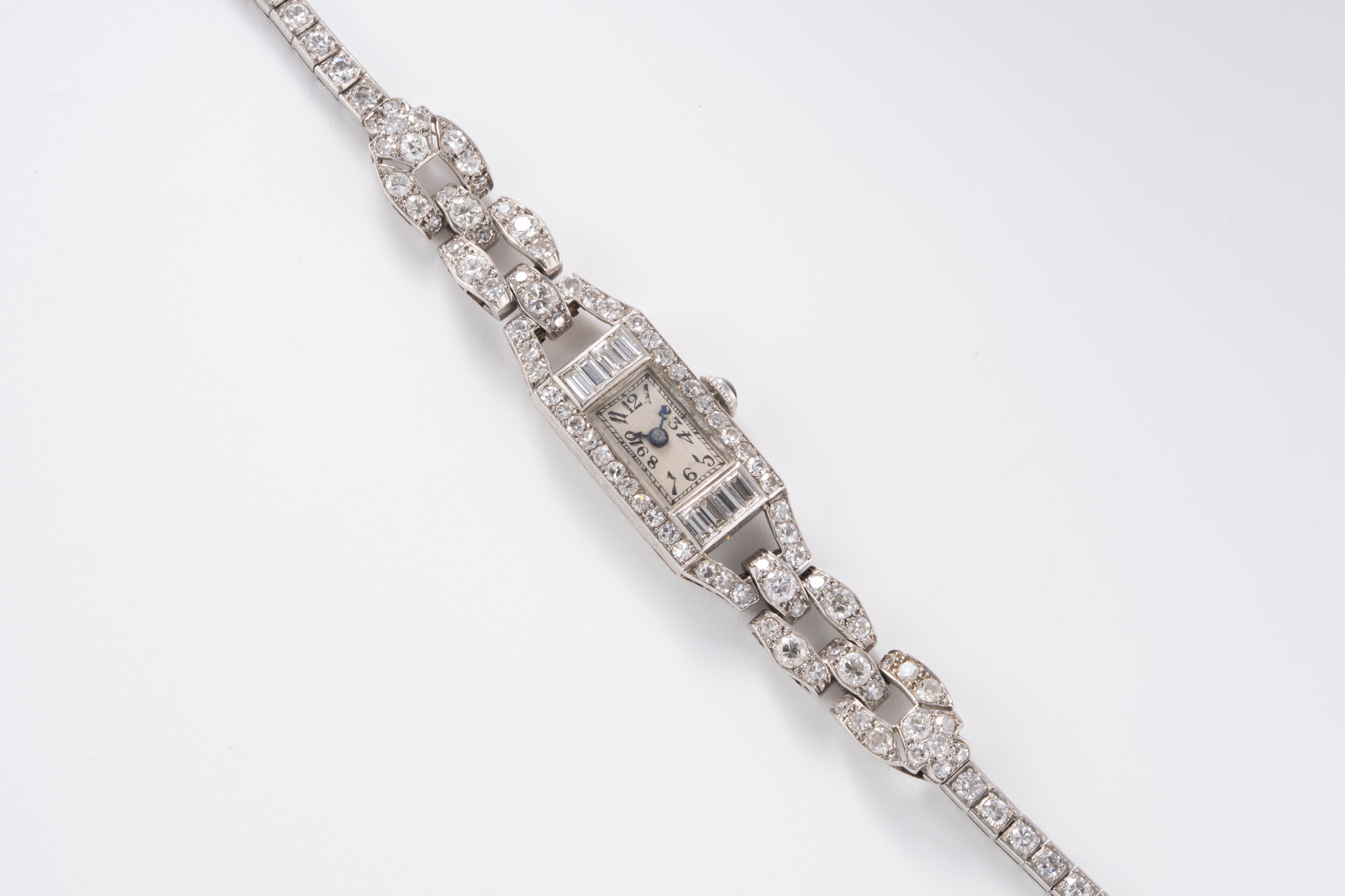 CaseRectangular platinum case with cabouchon crown at 3 o'clock, baguette and brilliant diamonds in old cut on the bezel, French hallmarks