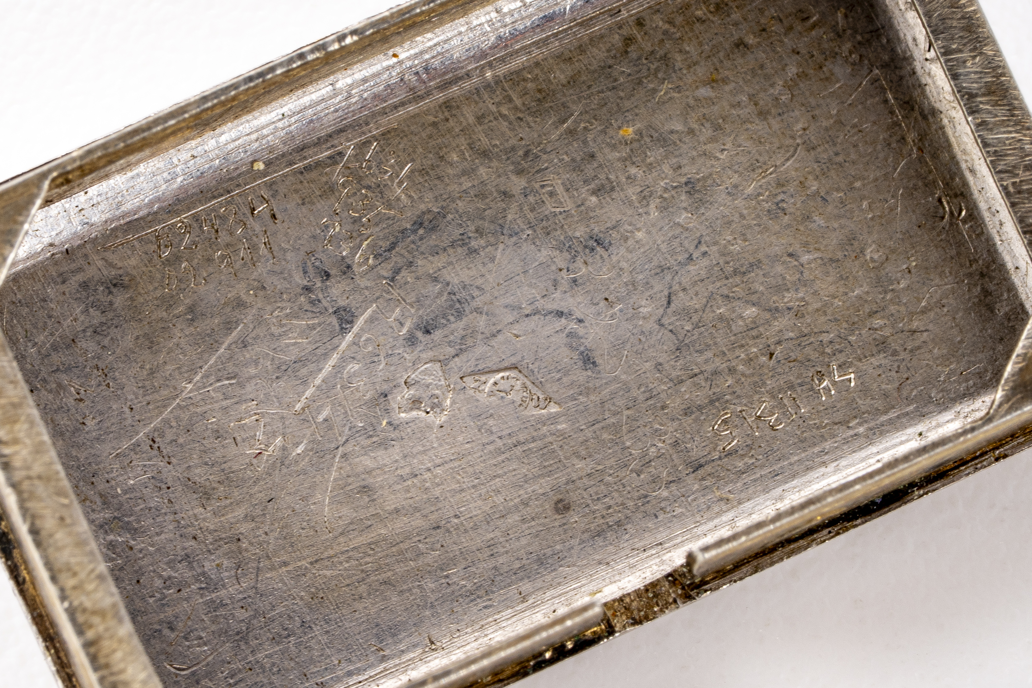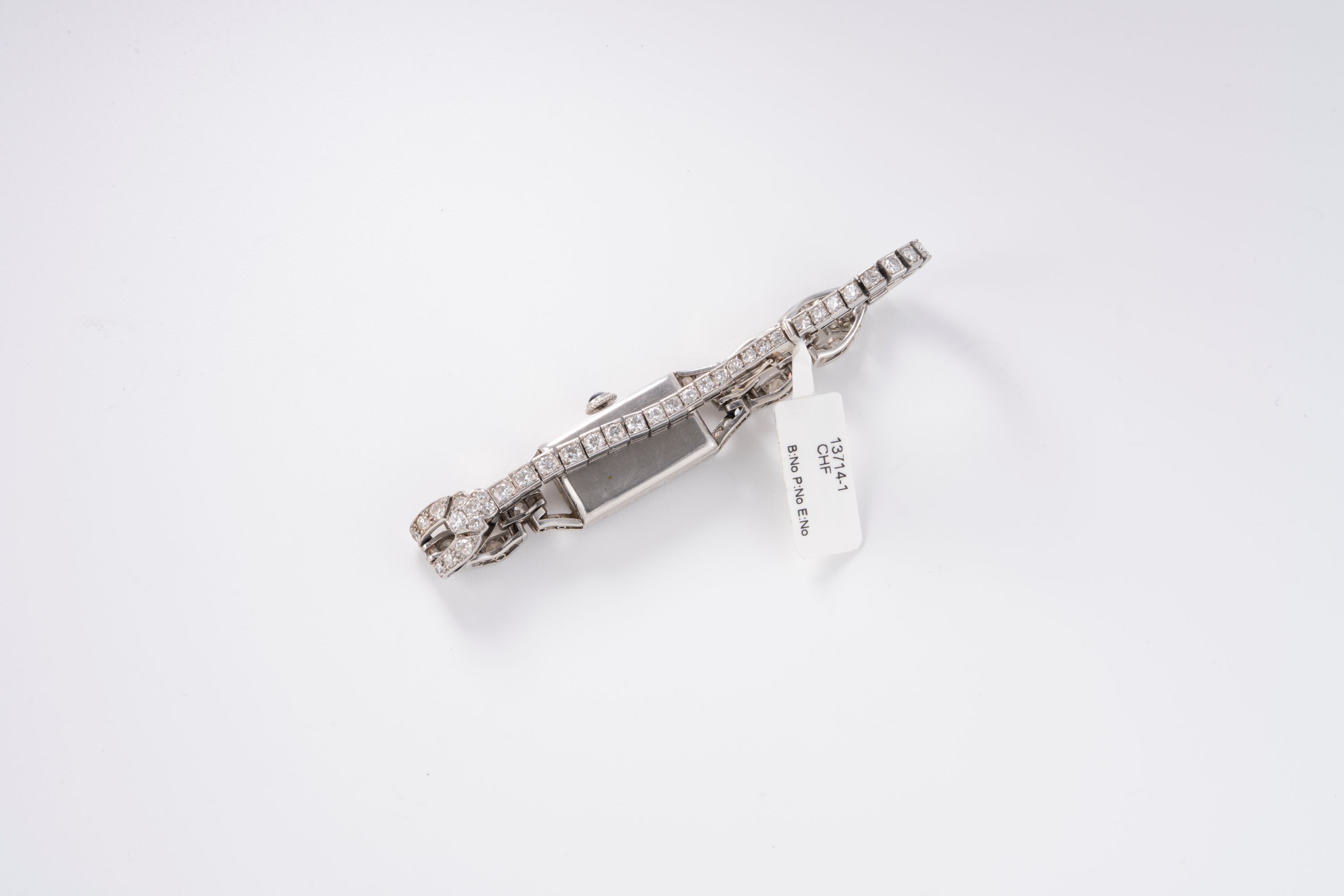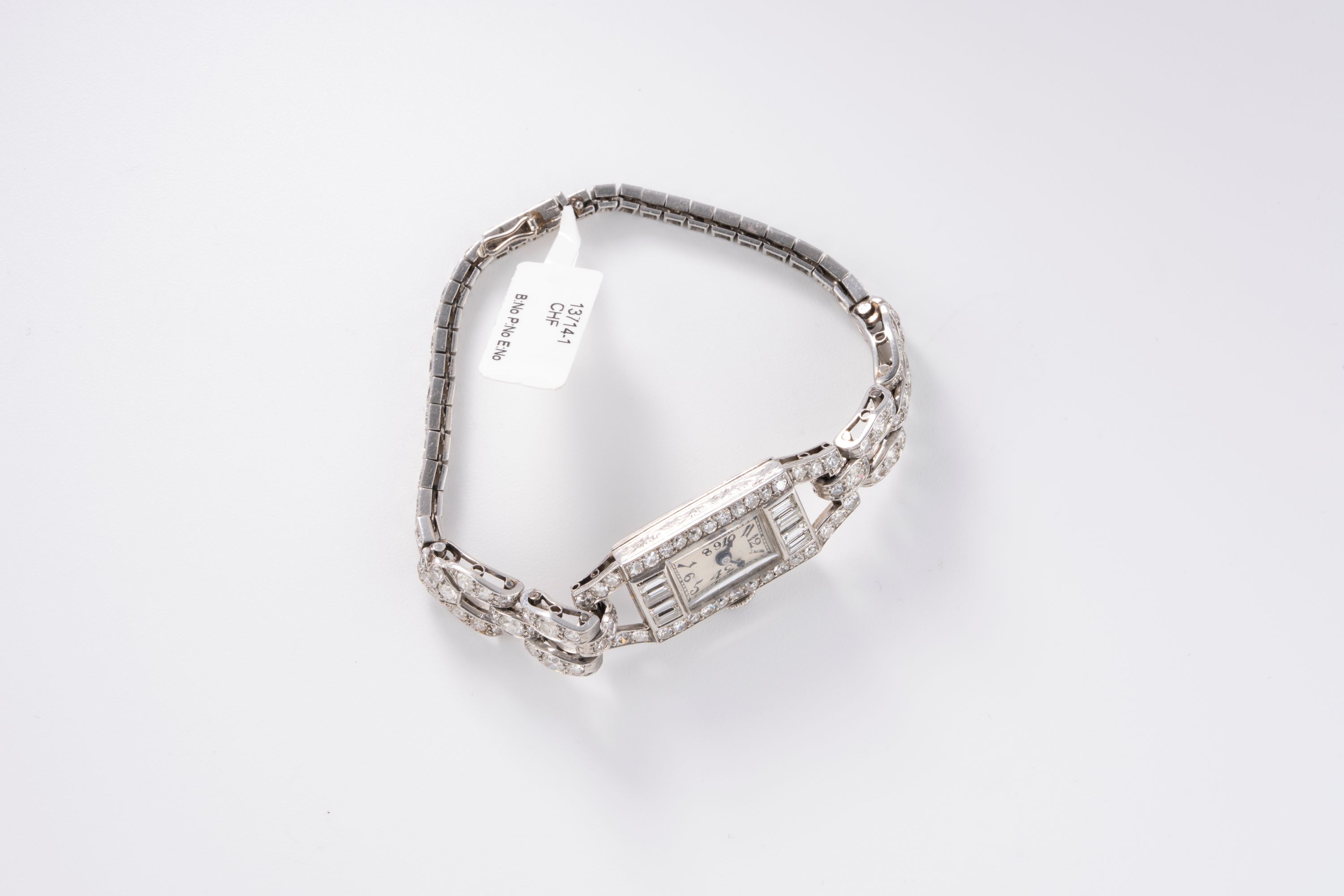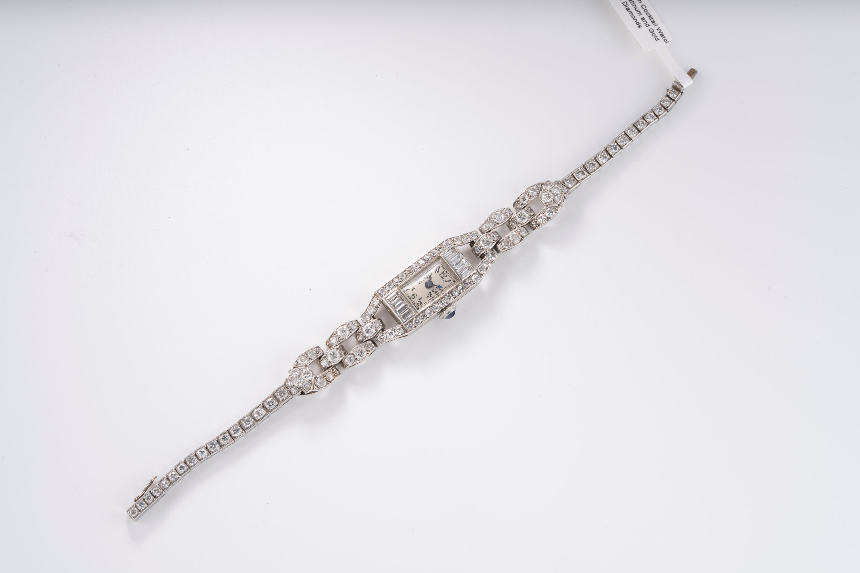 CaseRectangular platinum case with cabouchon crown at 3 o'clock, baguette and brilliant diamonds in old cut on the bezel, French hallmarks