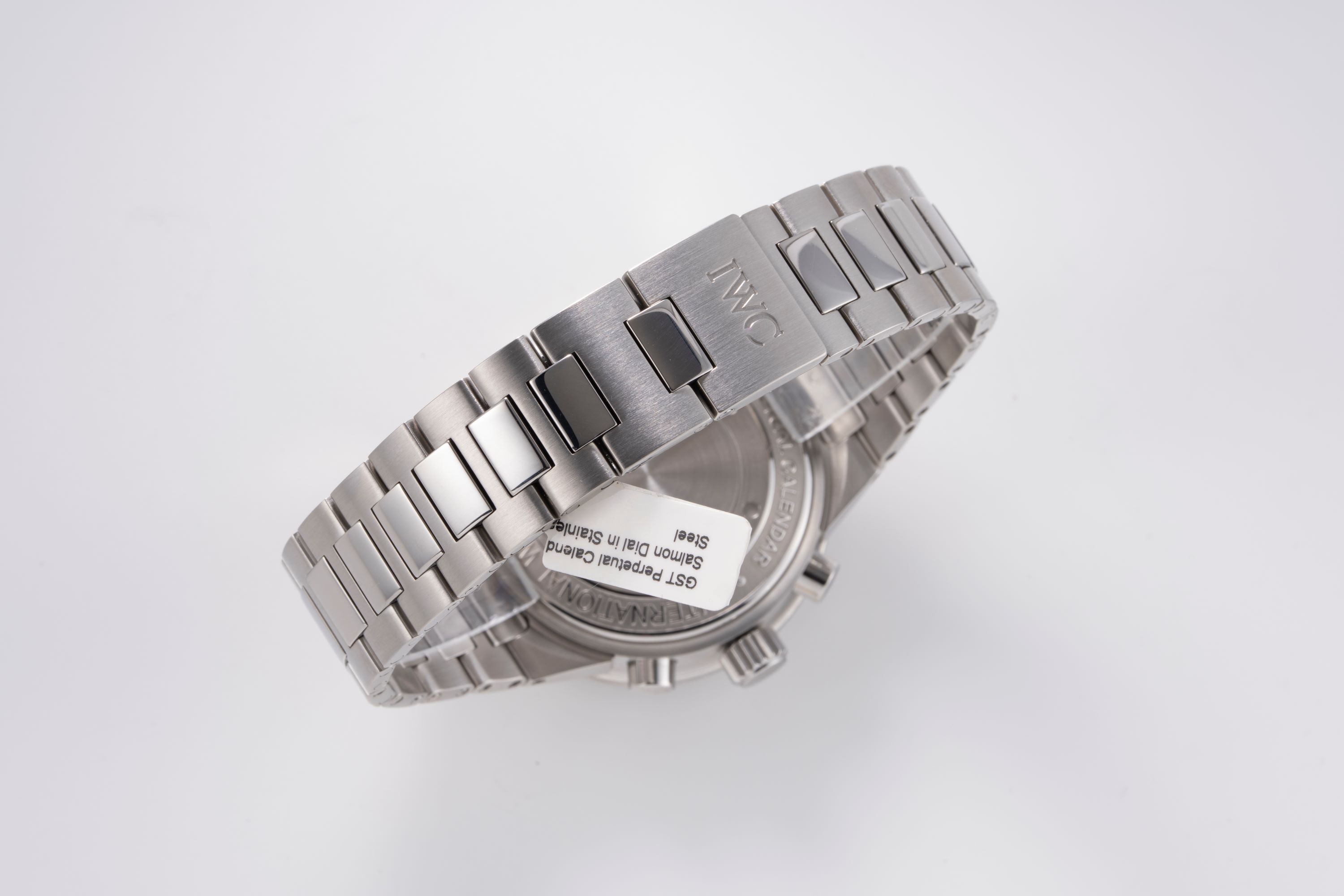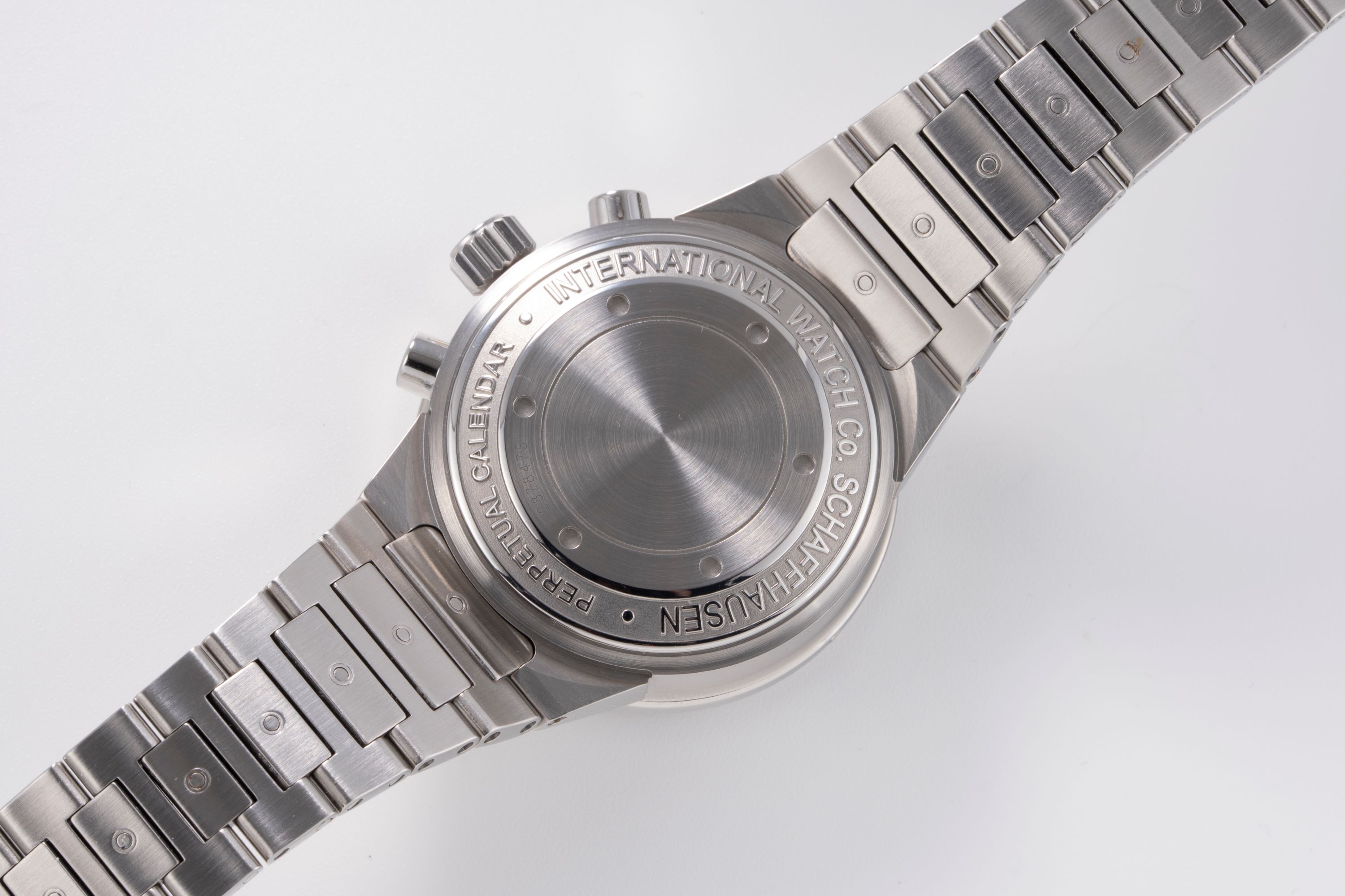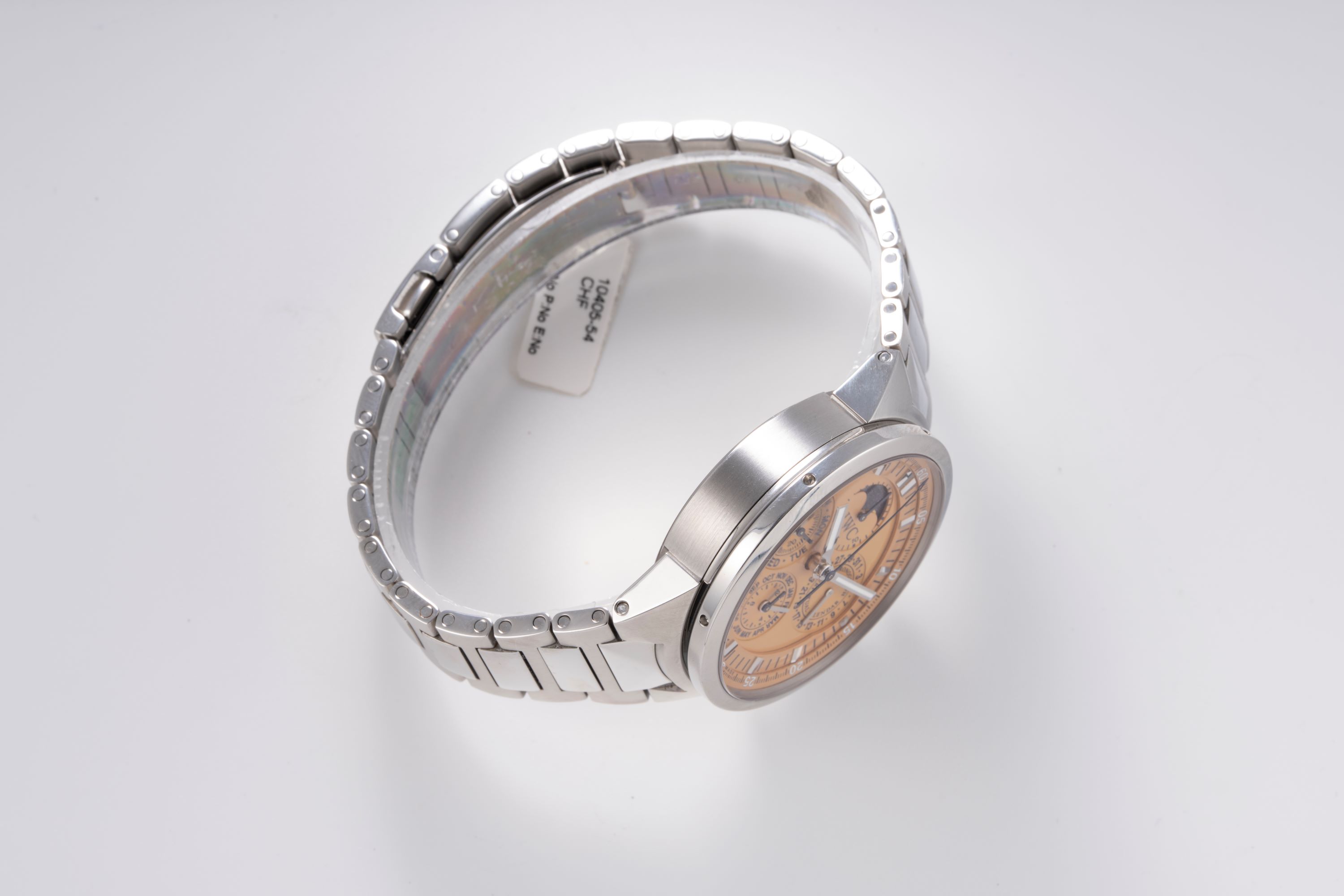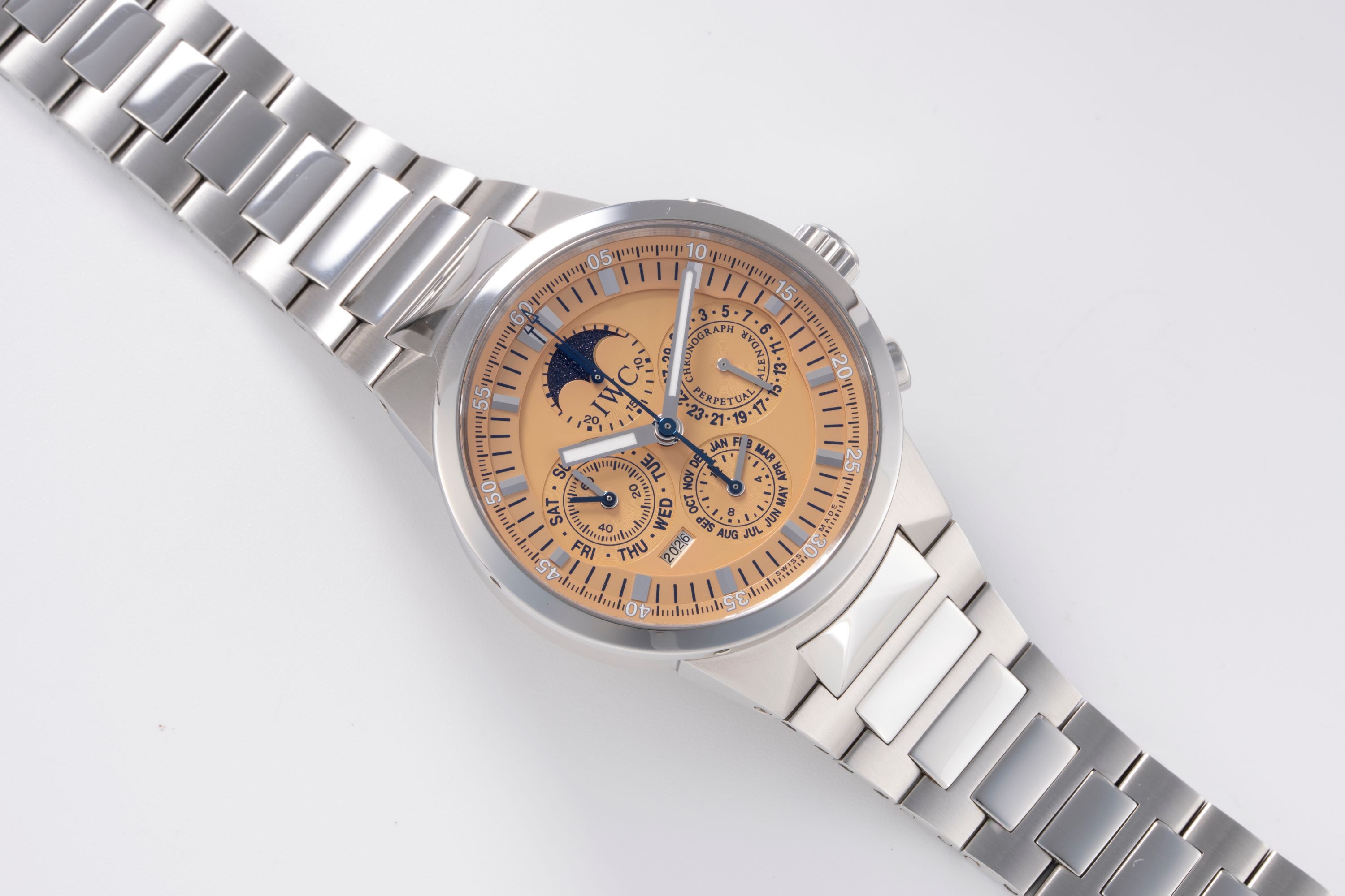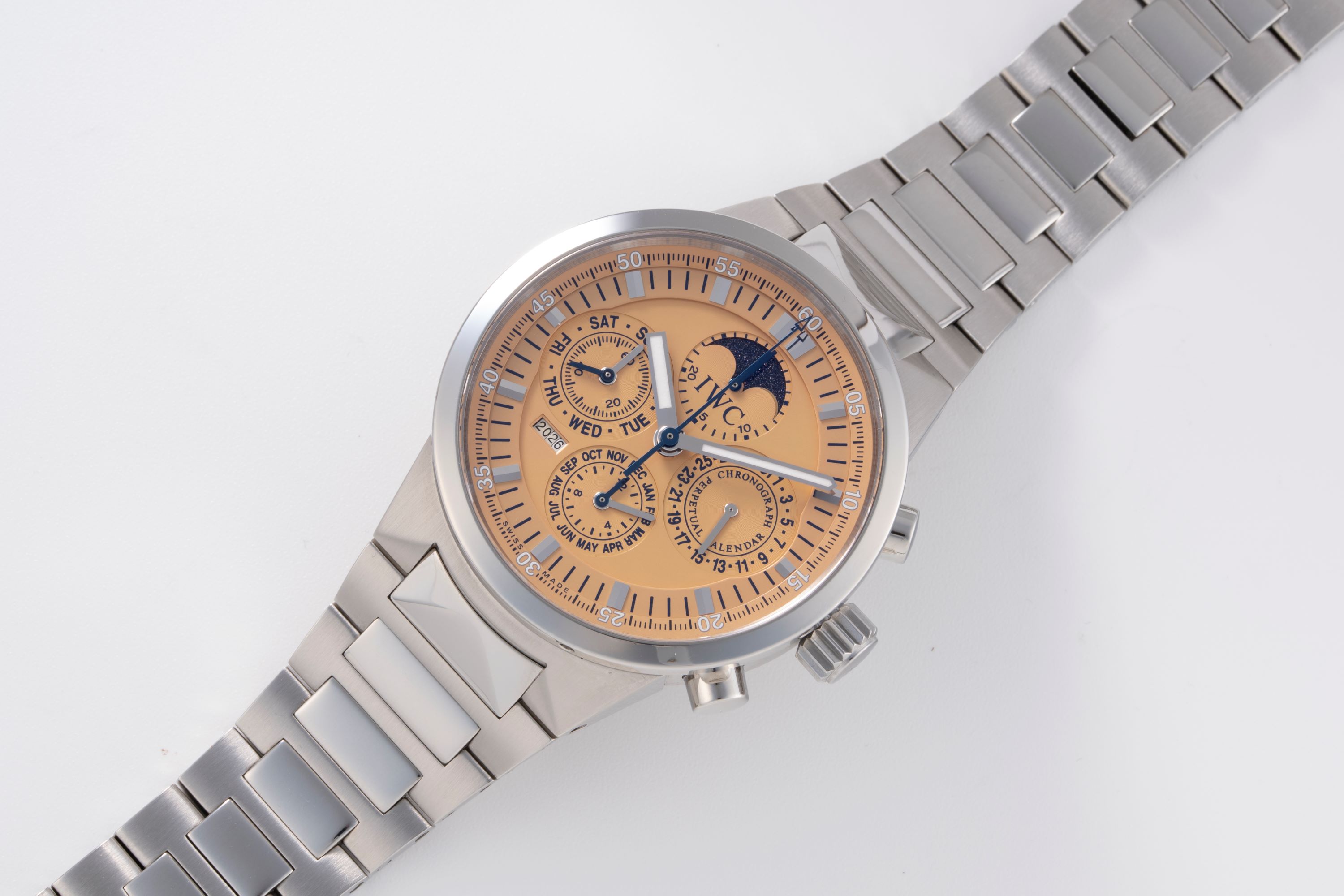 DialSalmon dial with applied indices, luminous hands, small seconds and day at 9 o'clock, month and 12 hour chronograph counter at 6 o'clock, year at 7:30, moonphase at 12 o'clock, date at 3 o'clock, central chronograph seconds hand, signed 'IWC' at 12 o'clock