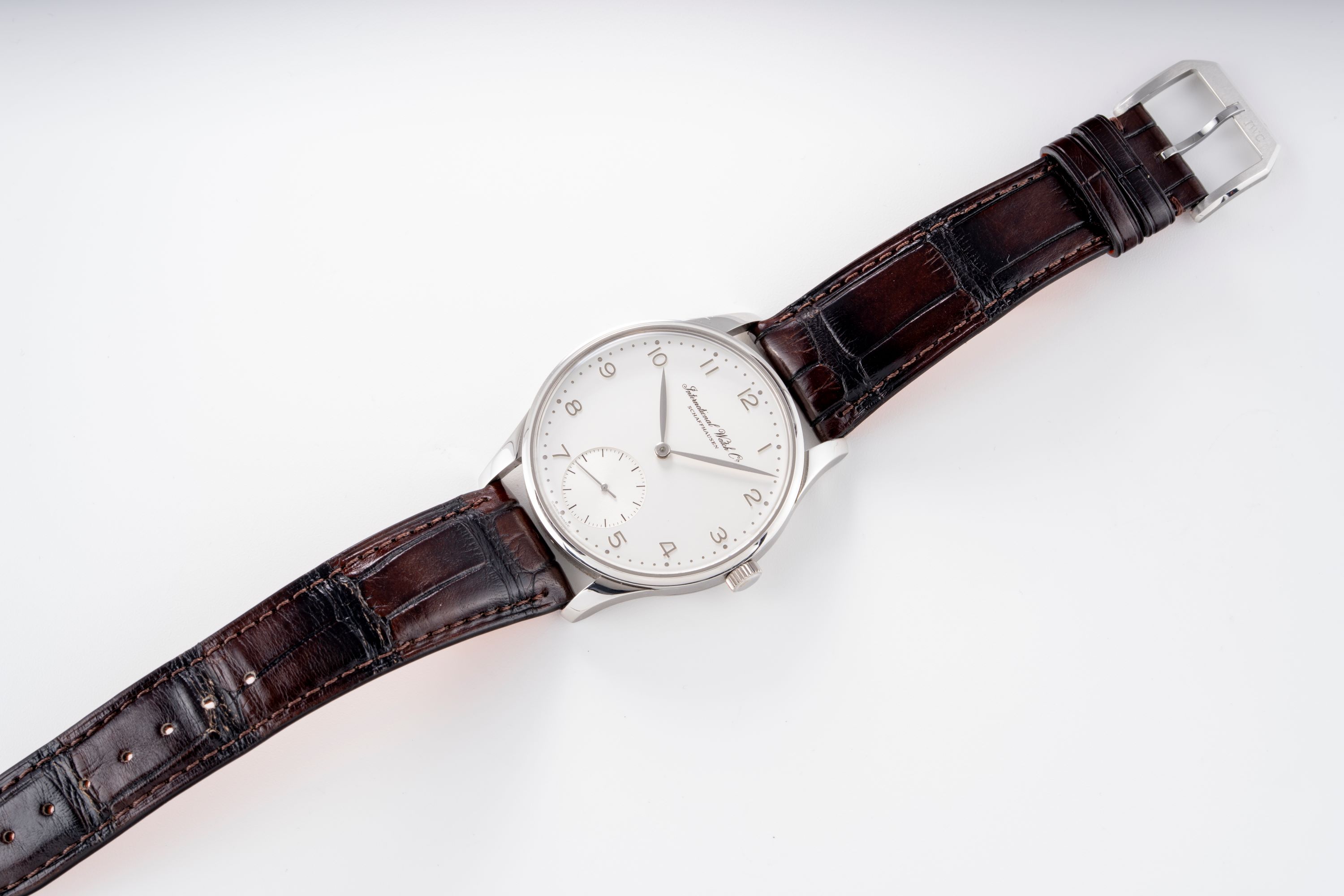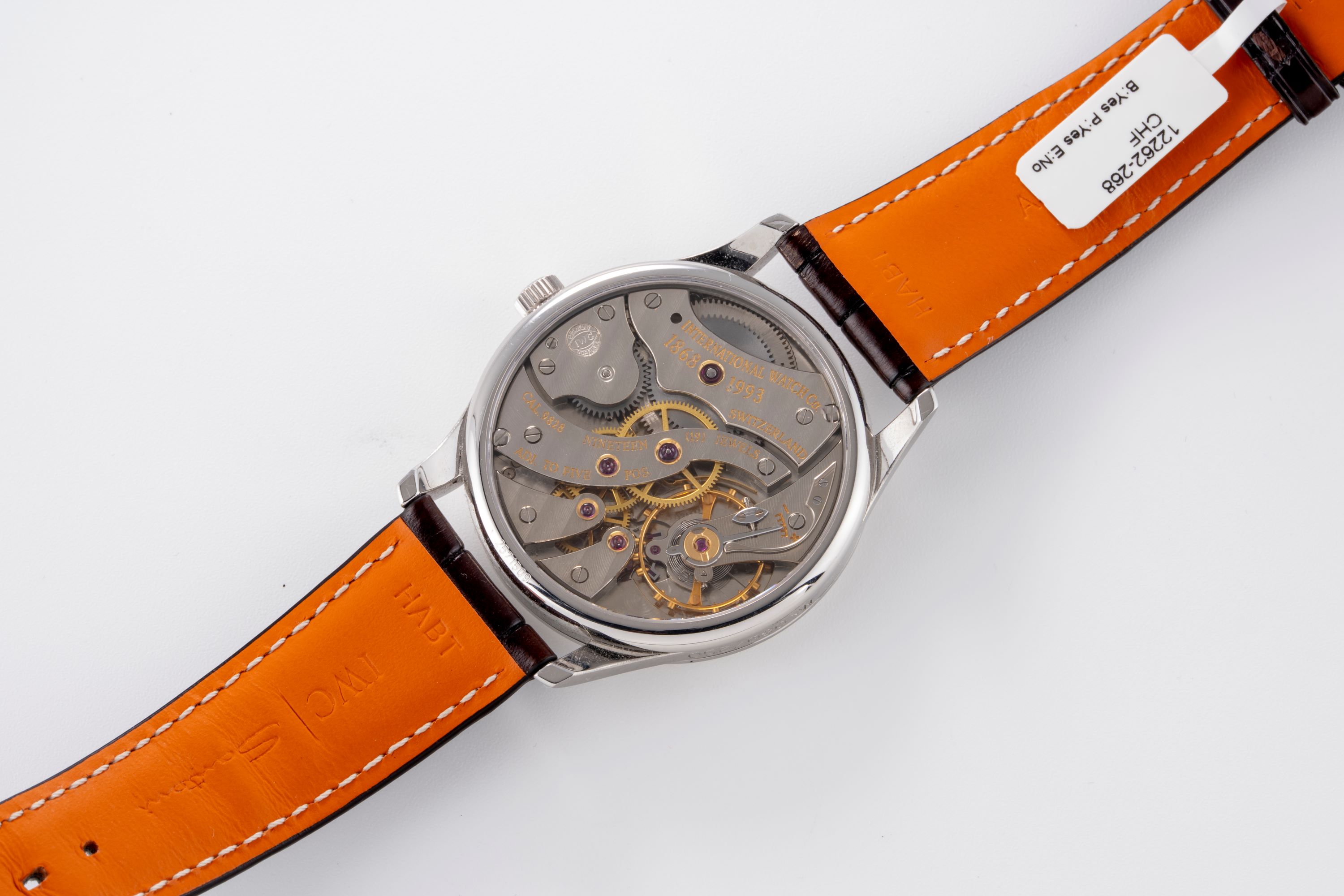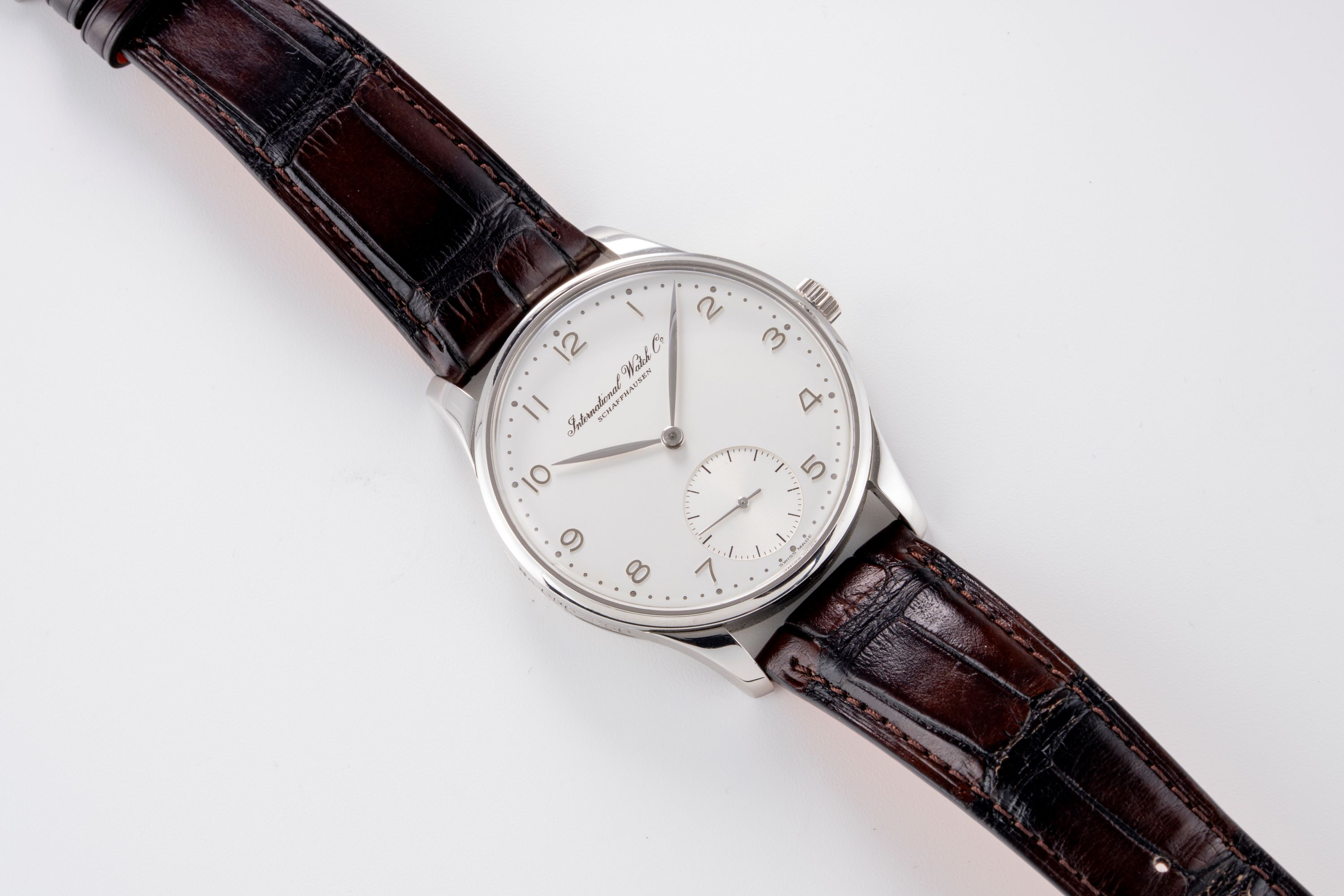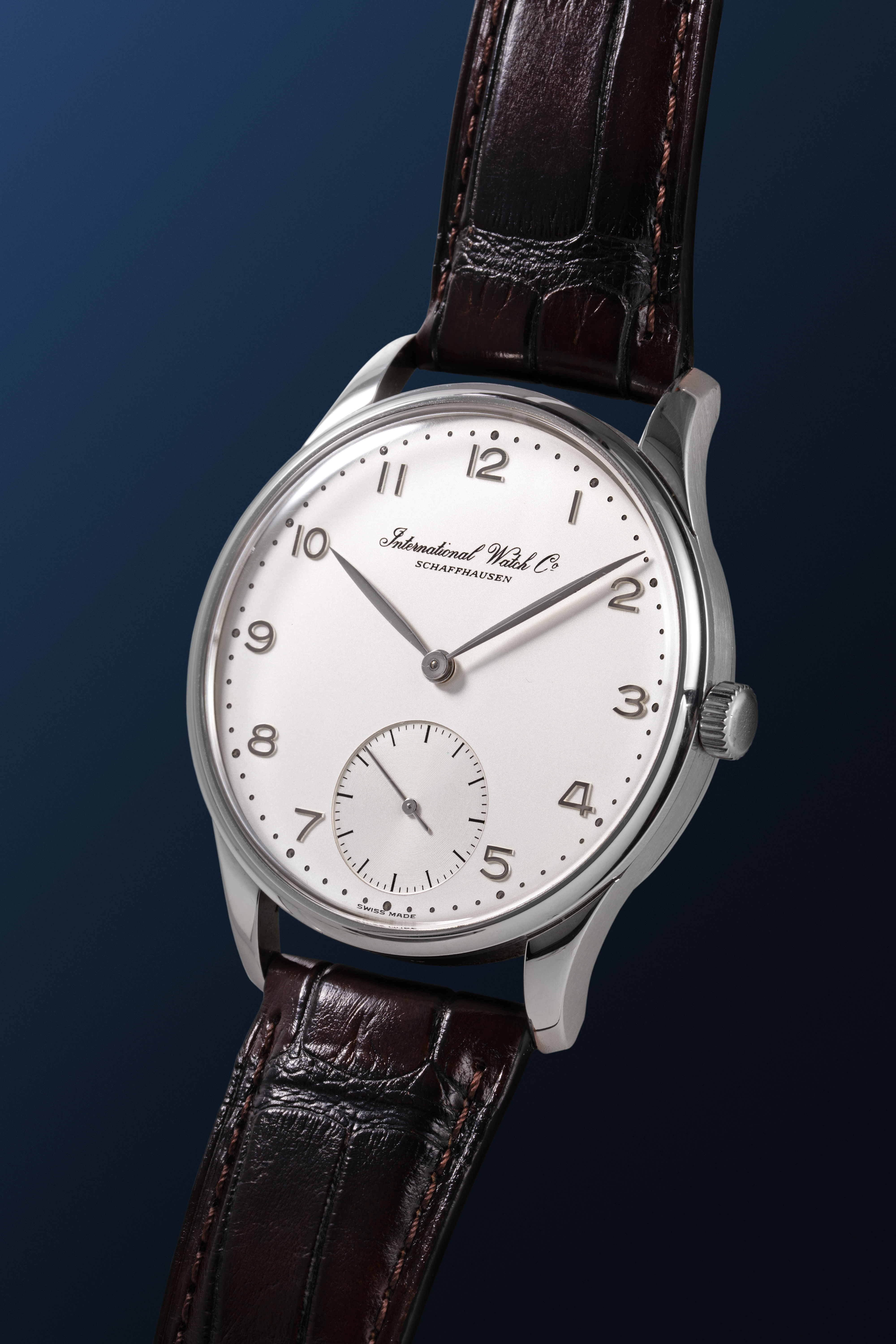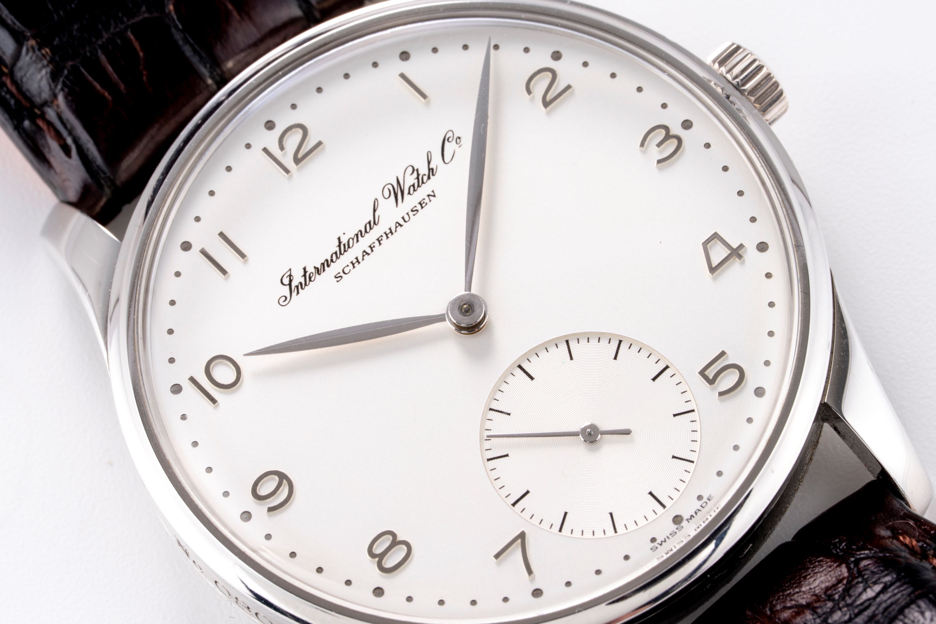 DialSilver-white dial with applied numerals, leaf hands, small seconds at 6 o'clock, signed 'International Watch Co.' at 12 o'clock