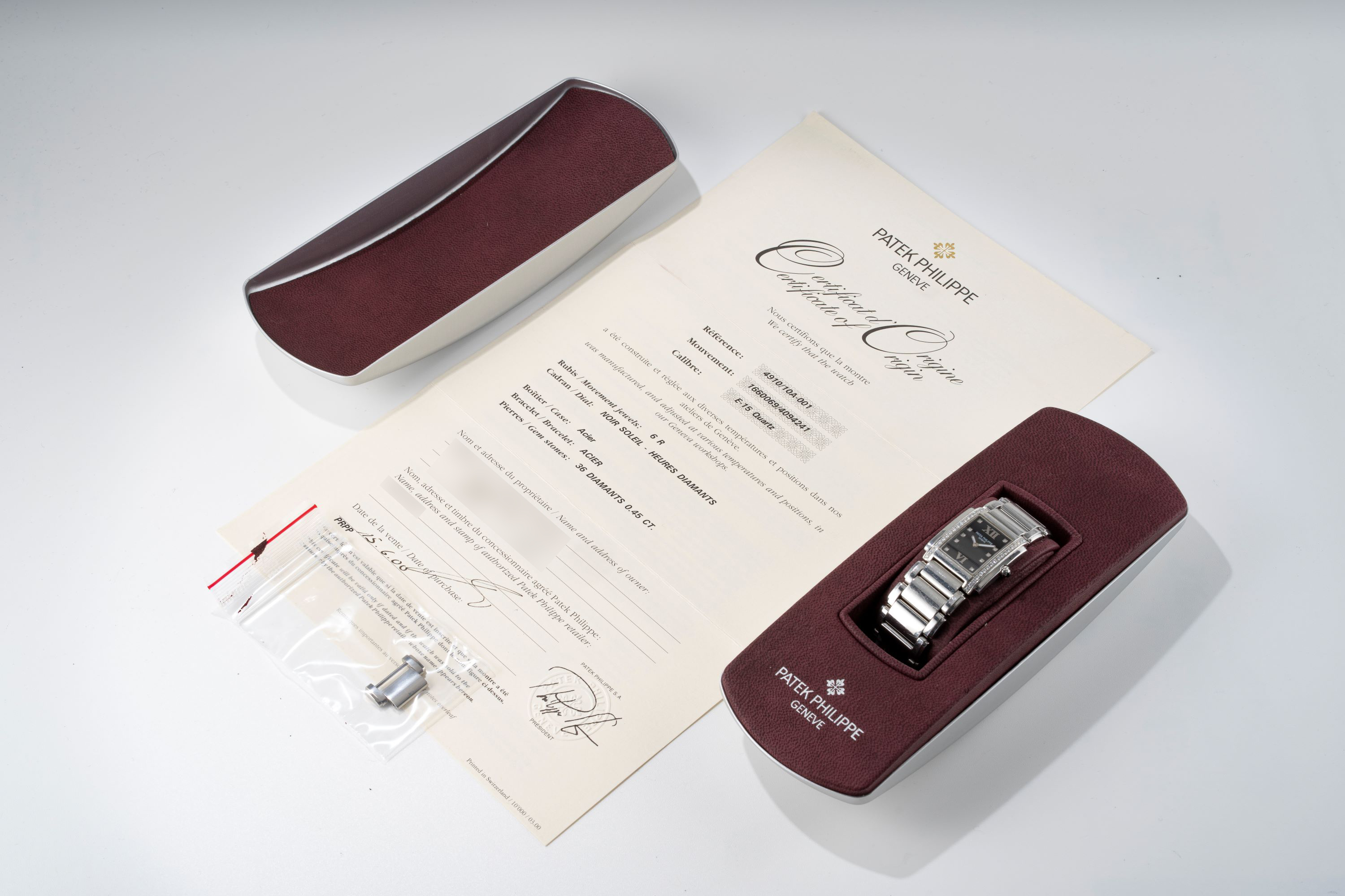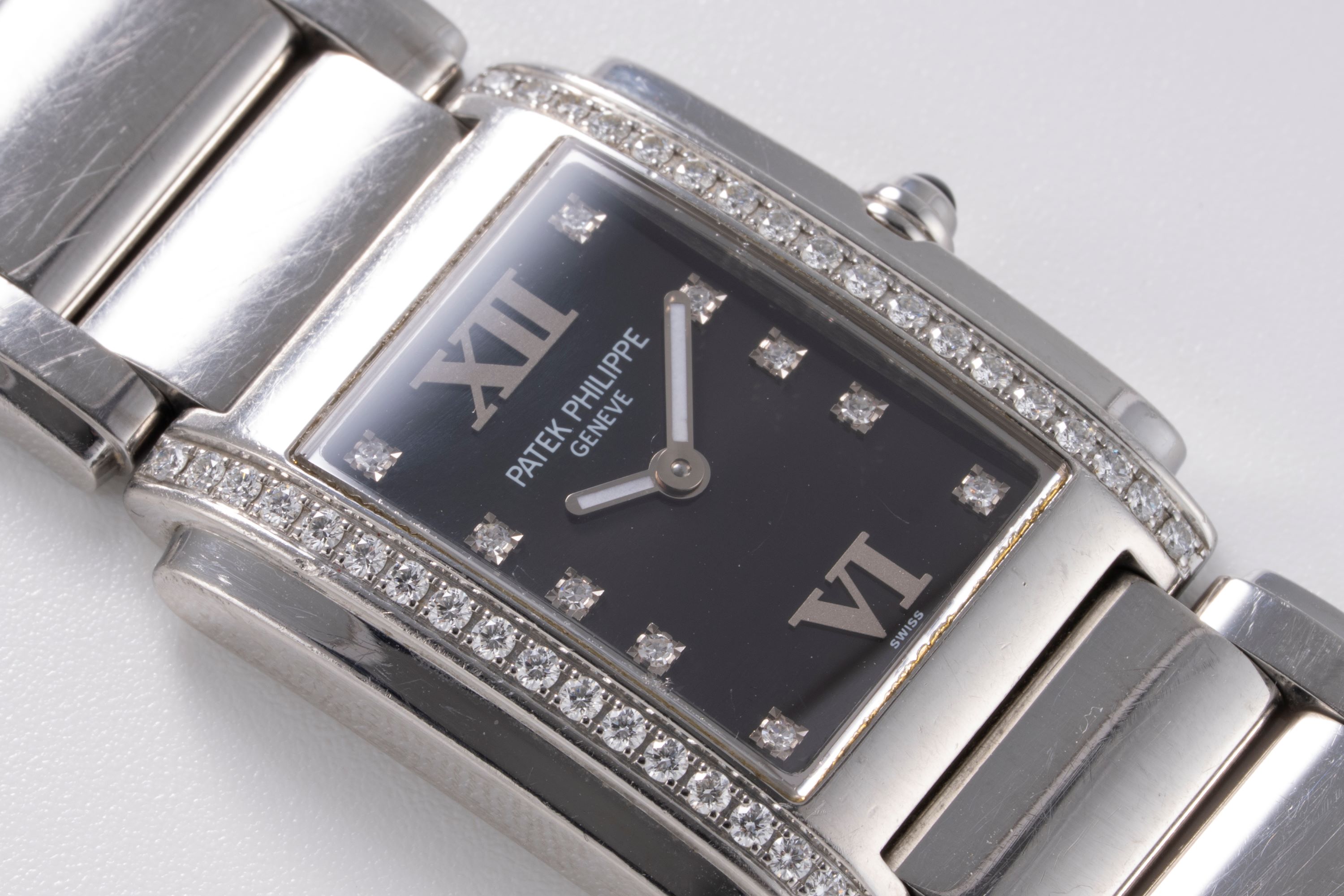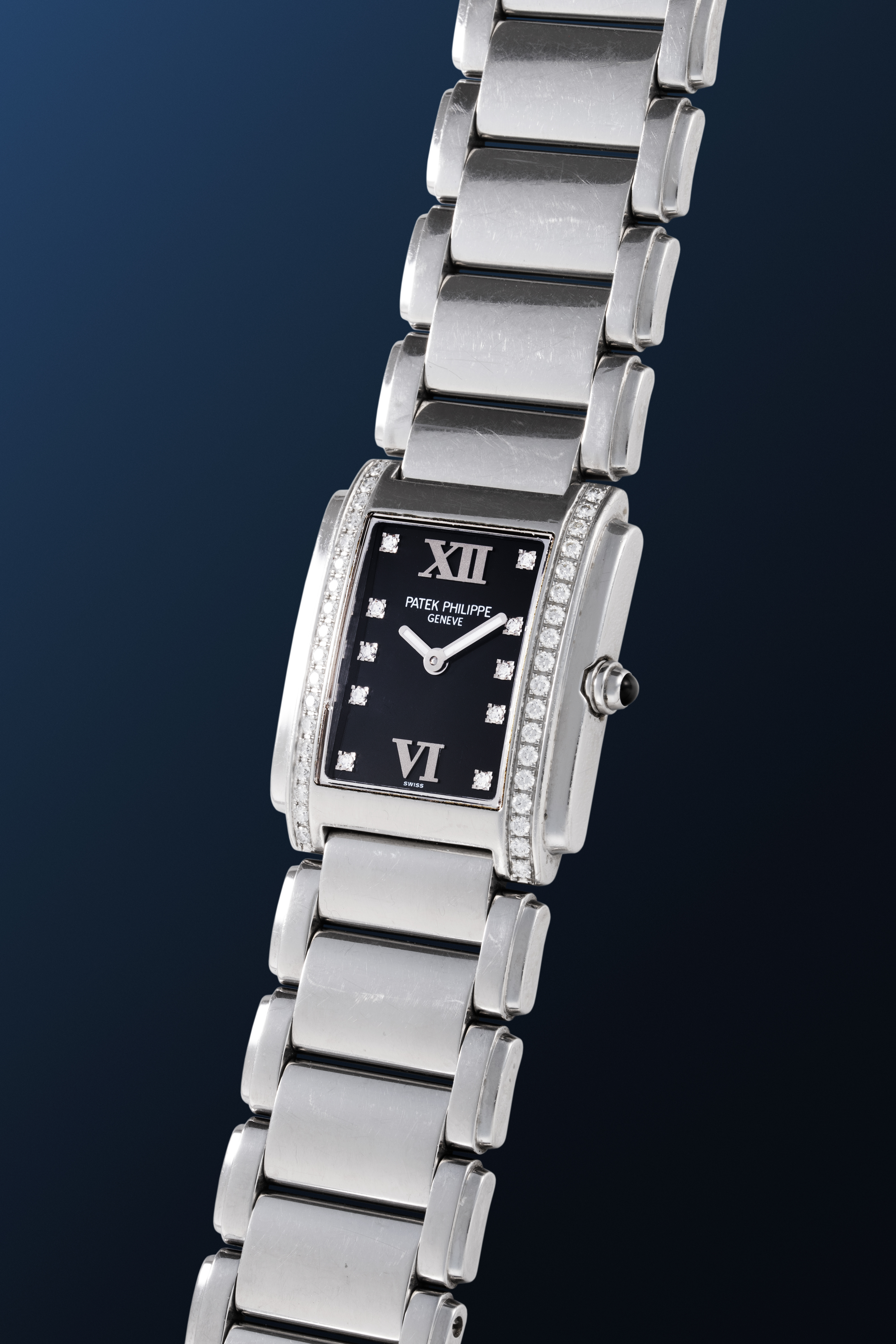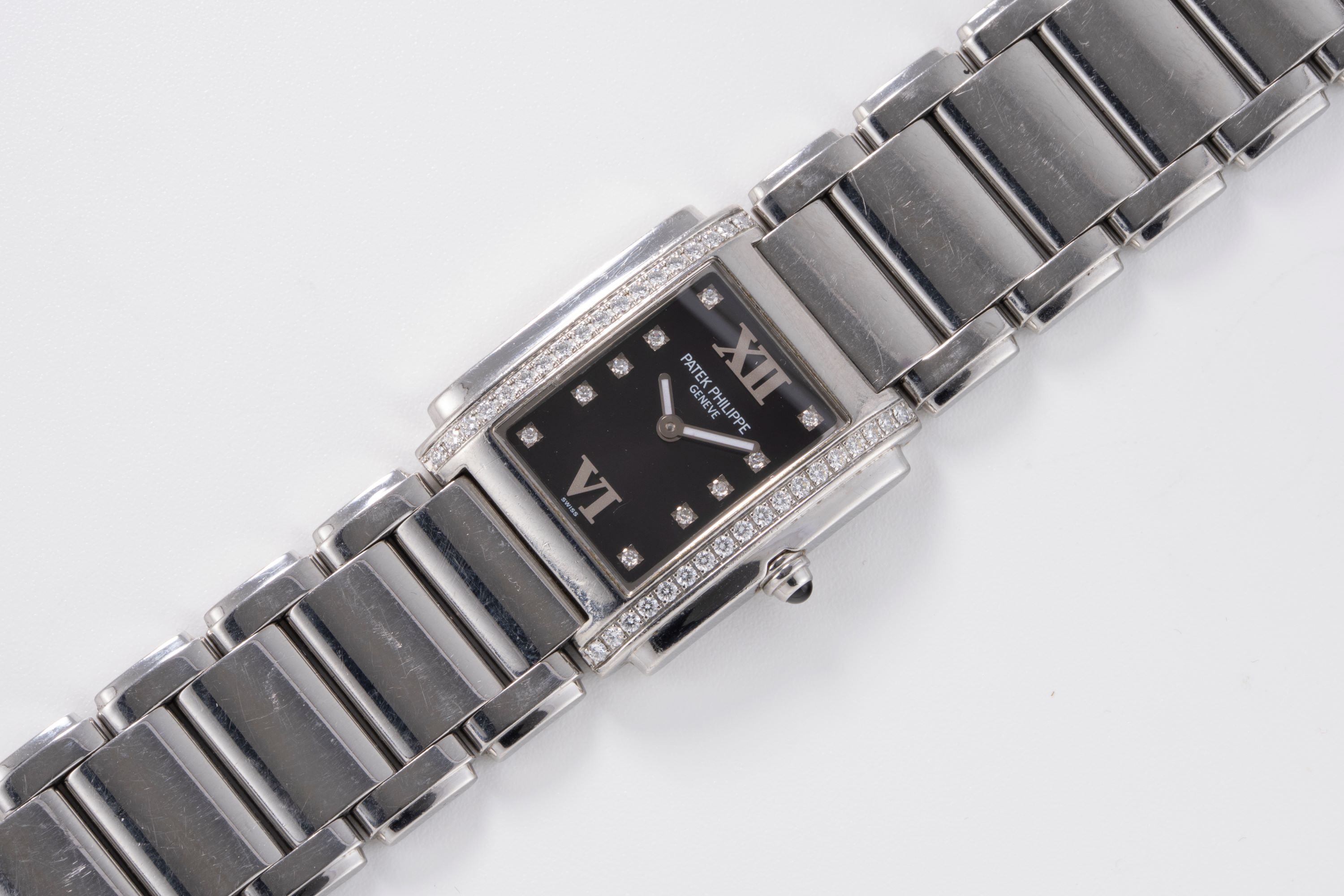 DialBlack dial with diamond indices, white gold hands, large applied Roman numerals at 12 o'clock, signed 'Patek Philippe' at 12 o'clock