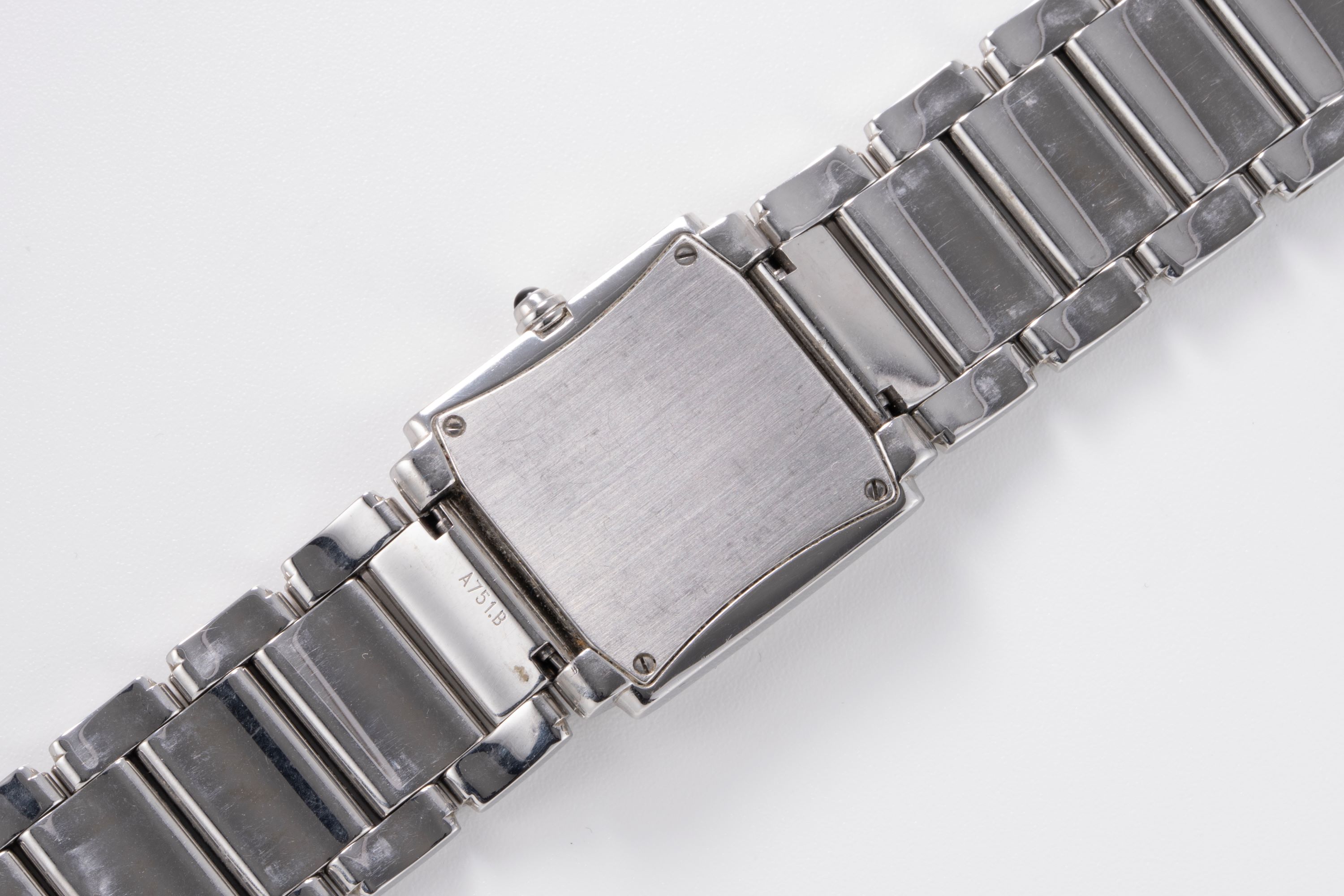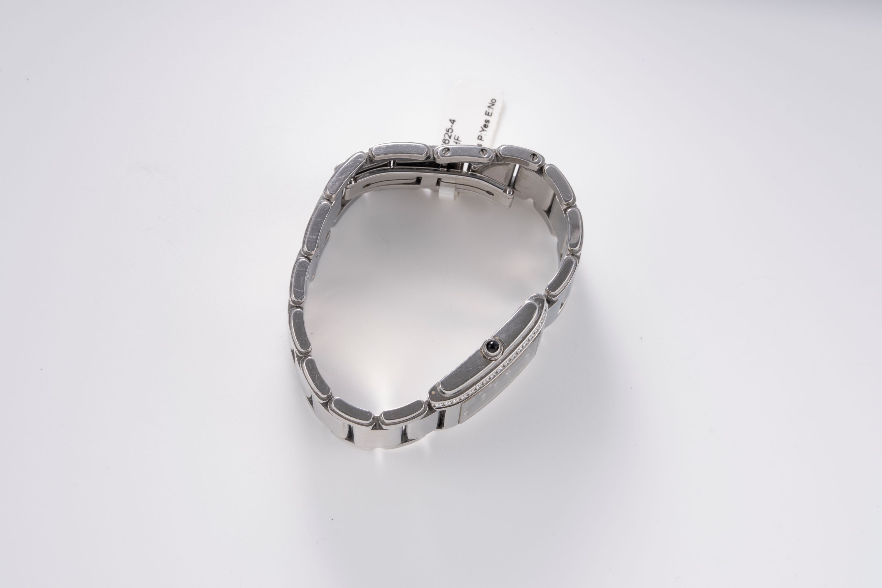 CaseRectangular stepped case in stainless steel with diamond-set flanks, cabouchon crown at 3 o'clock, solid caseback