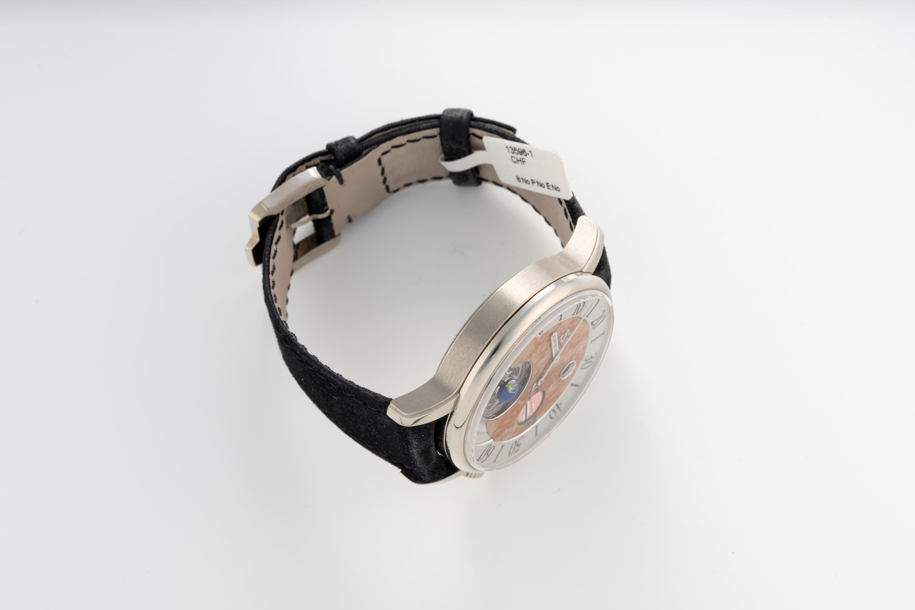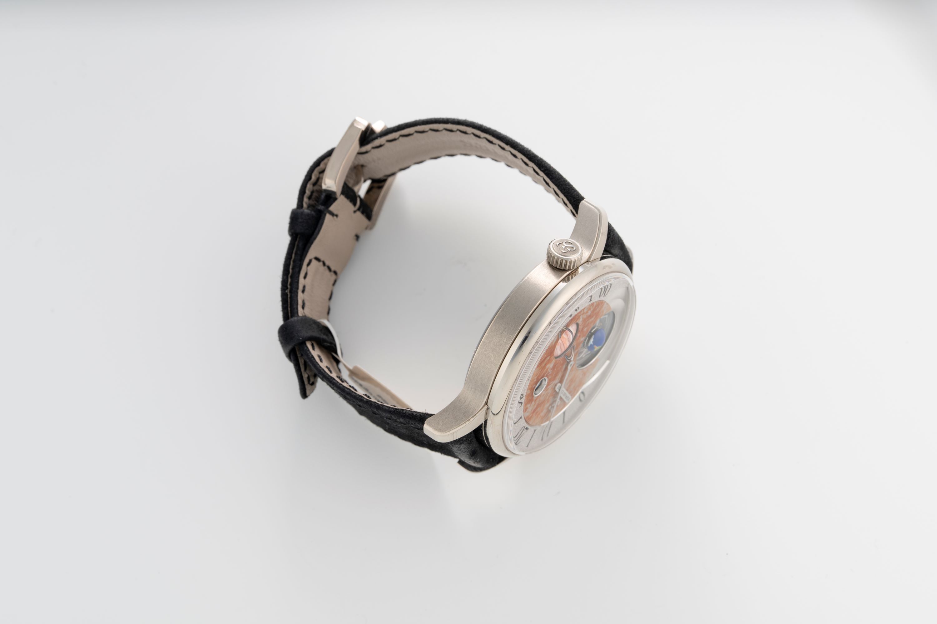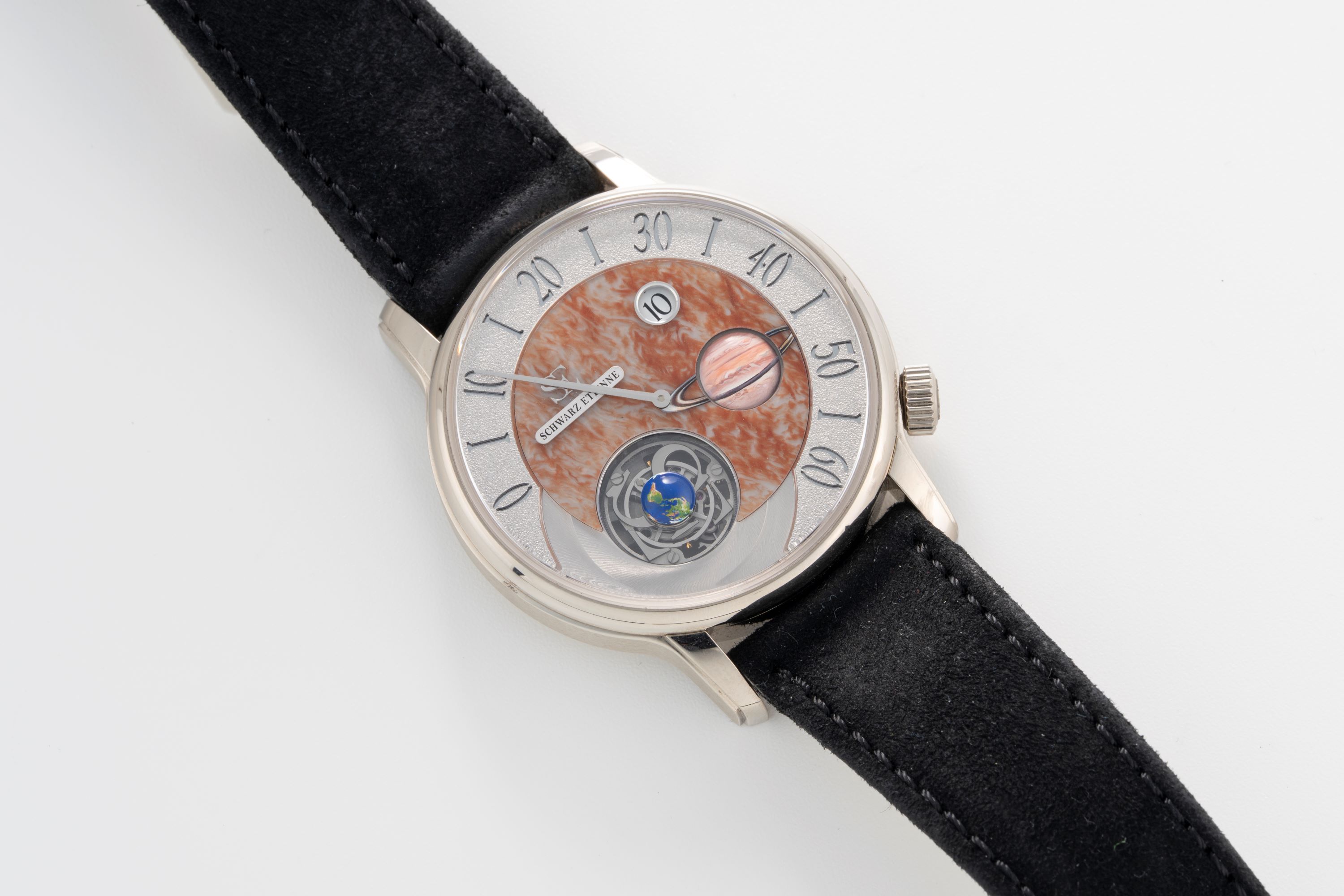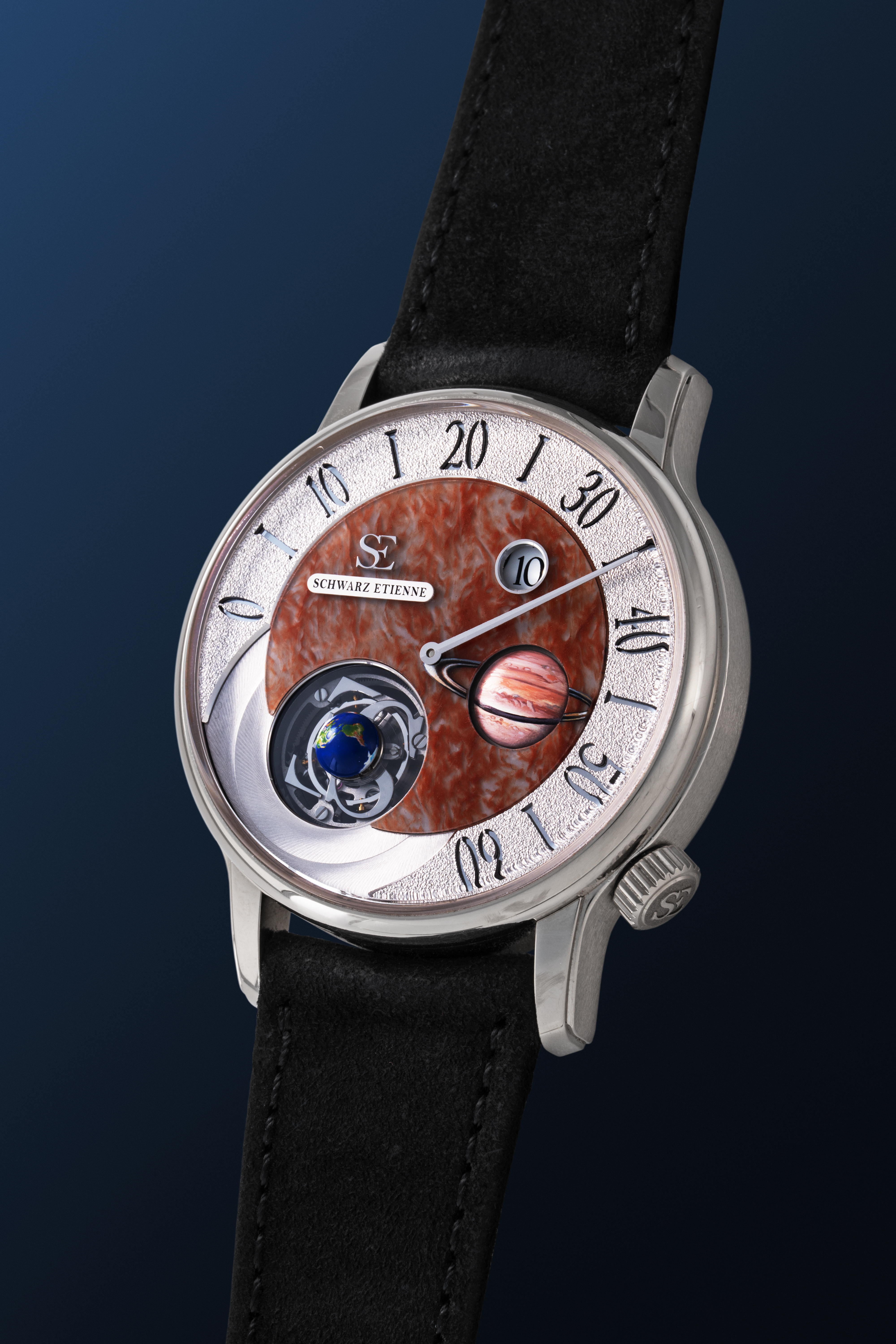 DialOrange aventurine dial with asymmetrical 60 minute retrograce track, digital jump hour near the 30 minute mark, tourbillon window on the bottom left, signed 'Schwarz Etienne' near the 10 minute mark