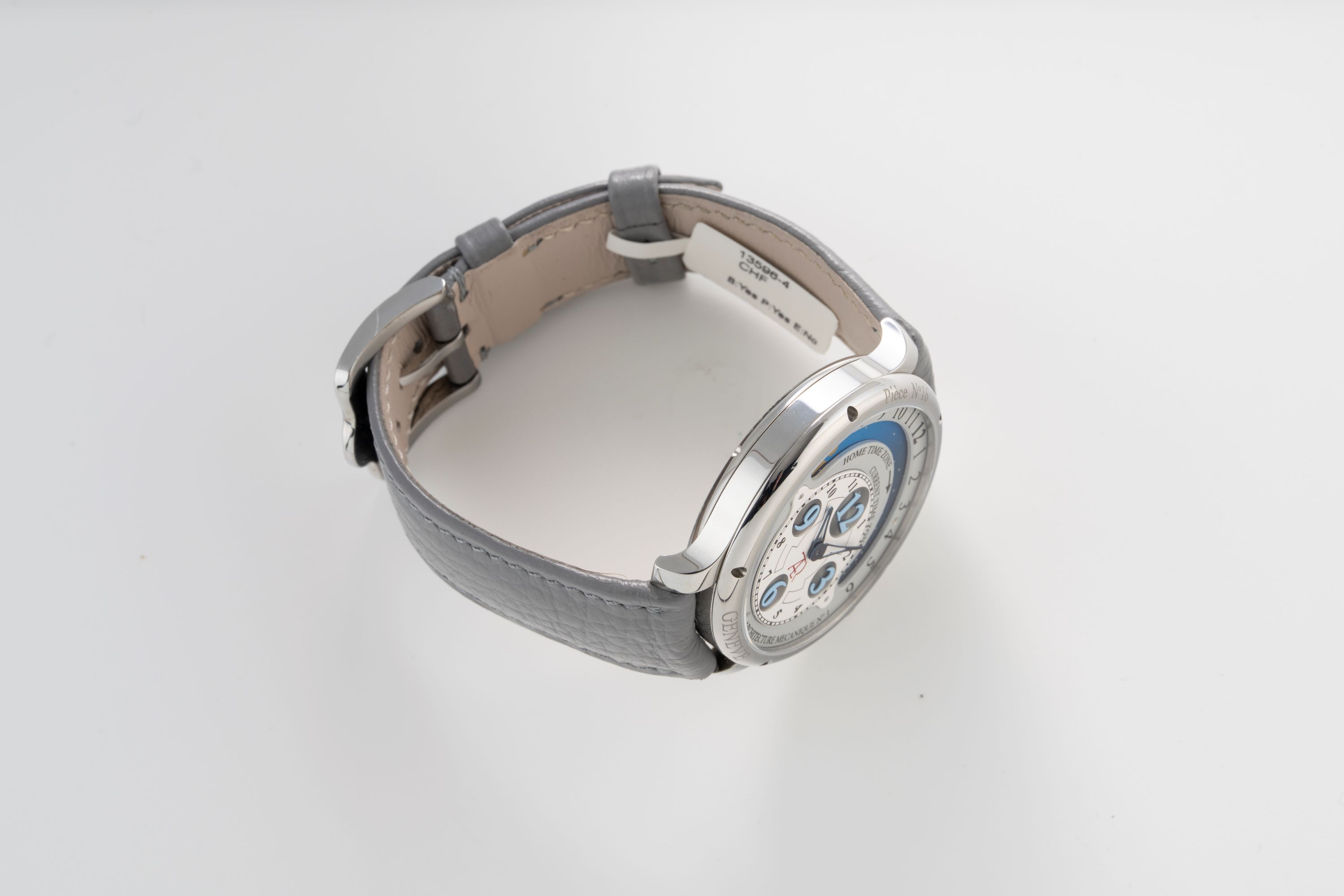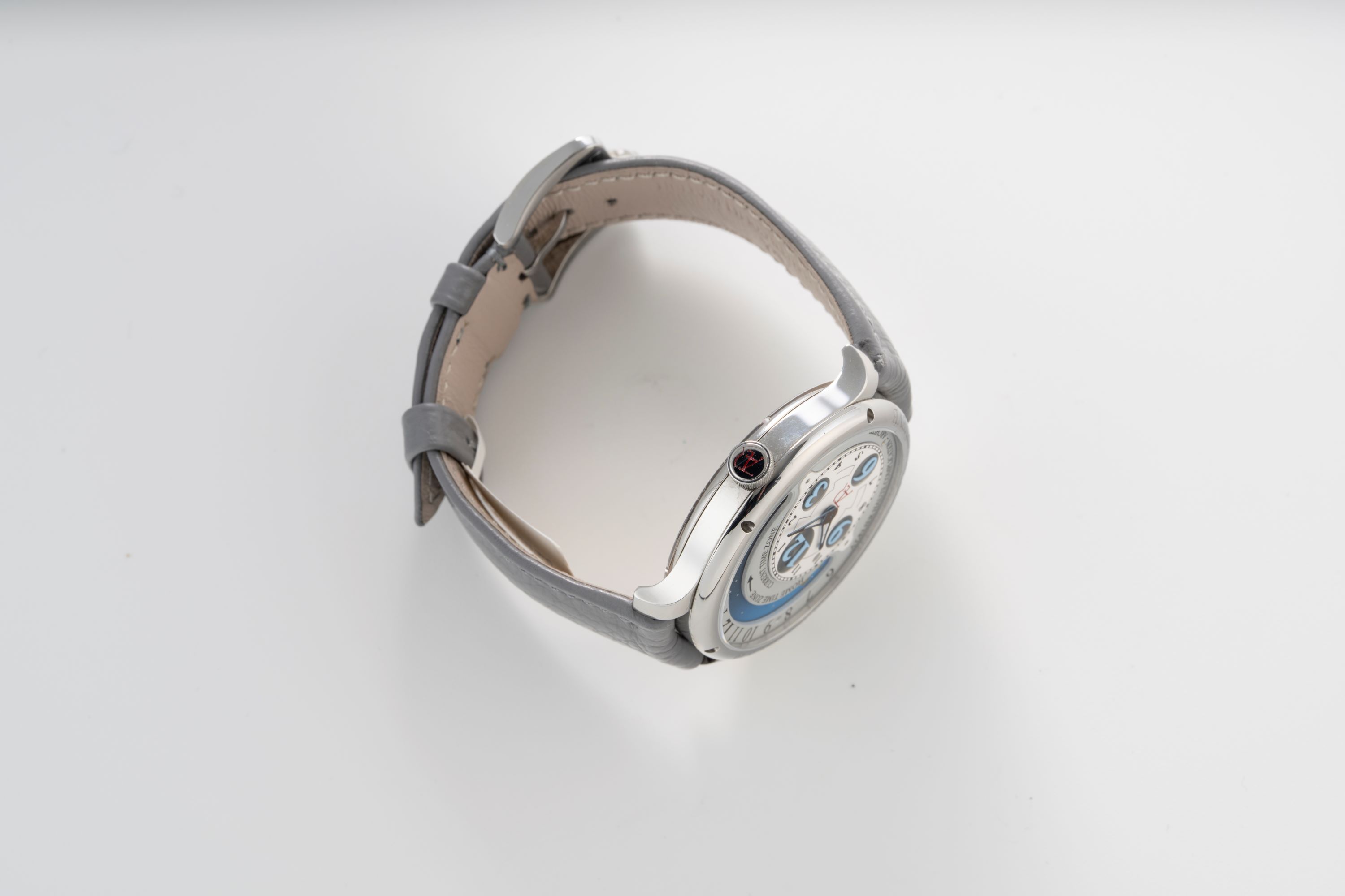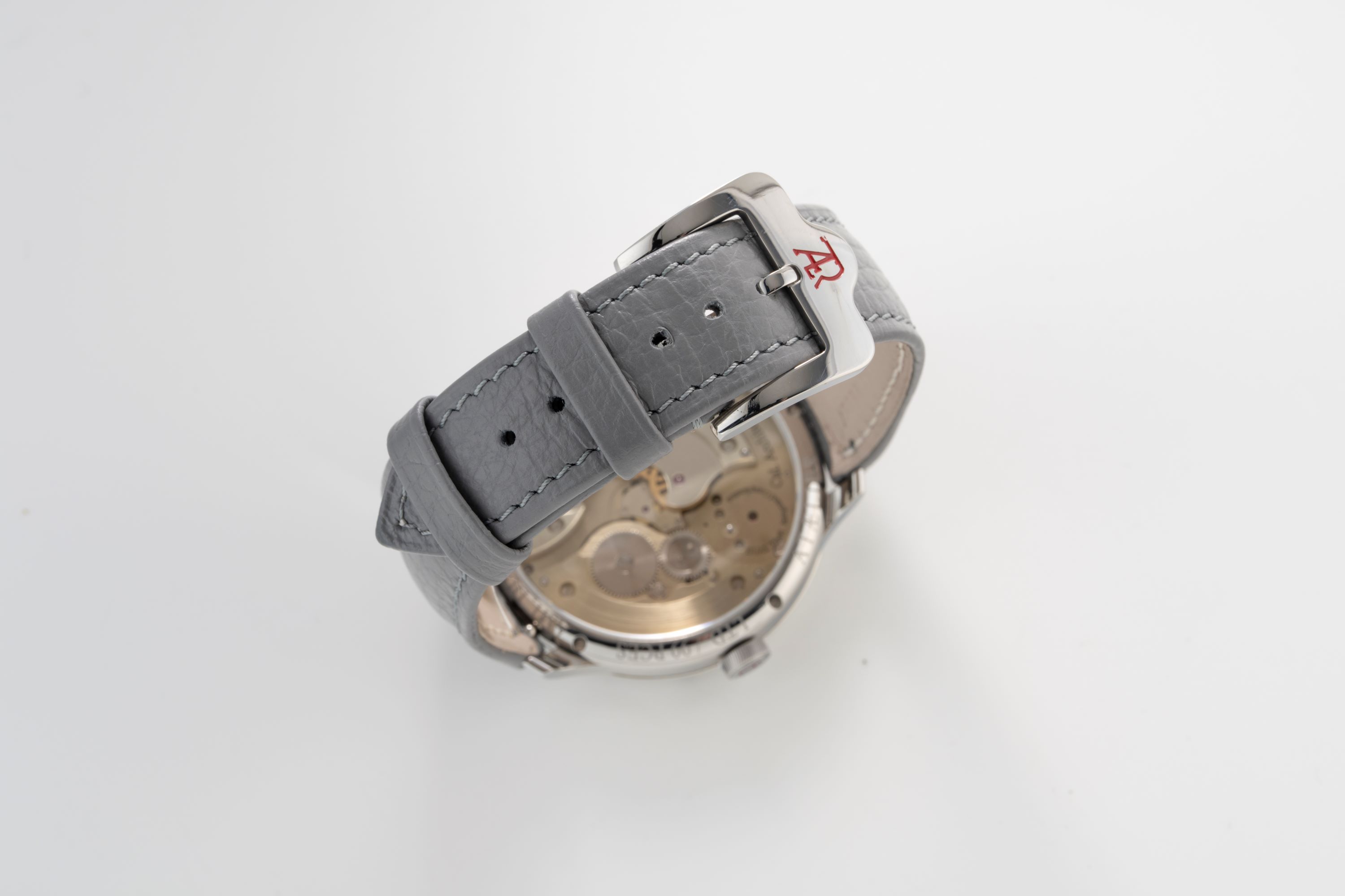 DialGrey dial with local time on raised dial at 6 o'clock, home time display at 12 o'clock with day/night display, heat-blued hands