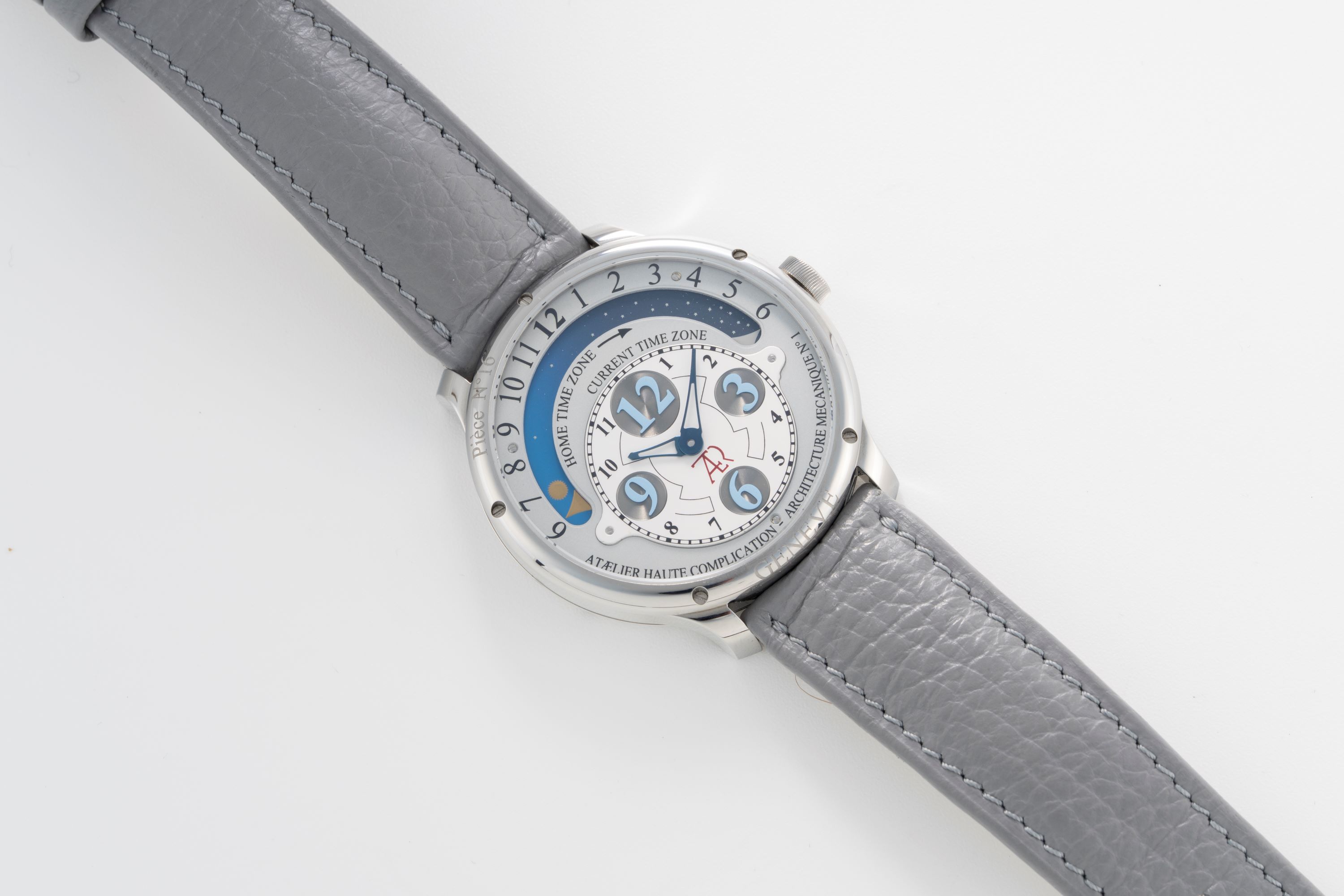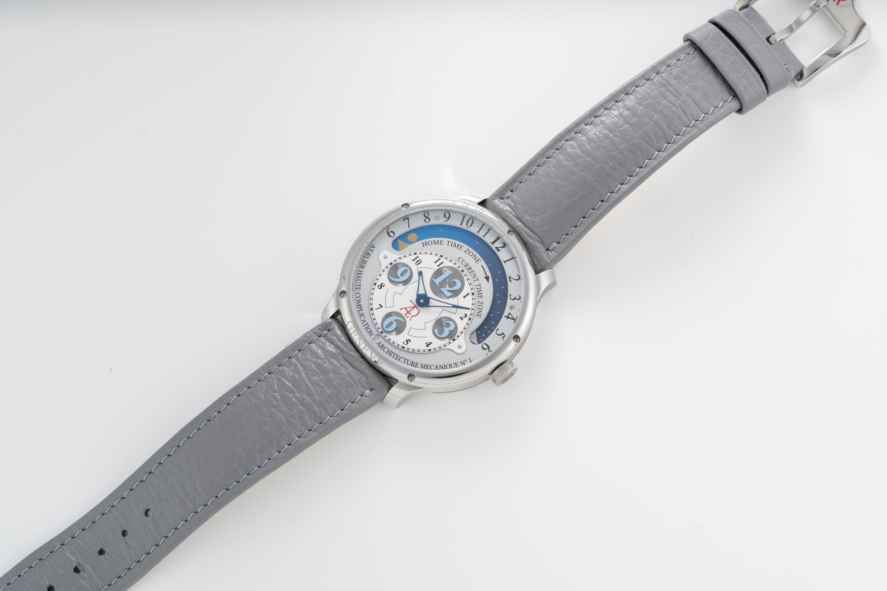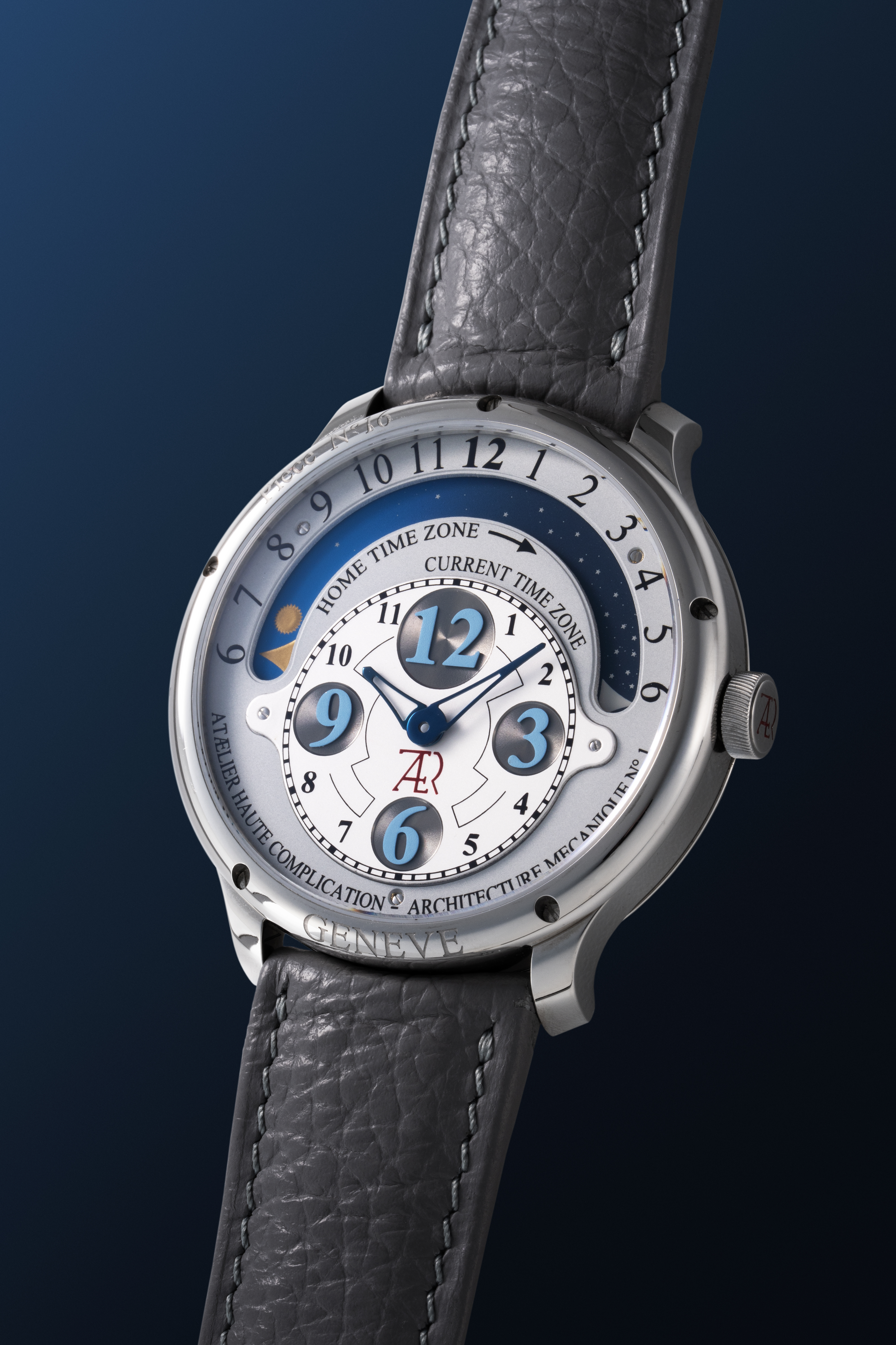 MovementHand-wound mechanical movement Cal. Architecture Méchanique No. 1, functions: hours, minutes, home and local timezones
