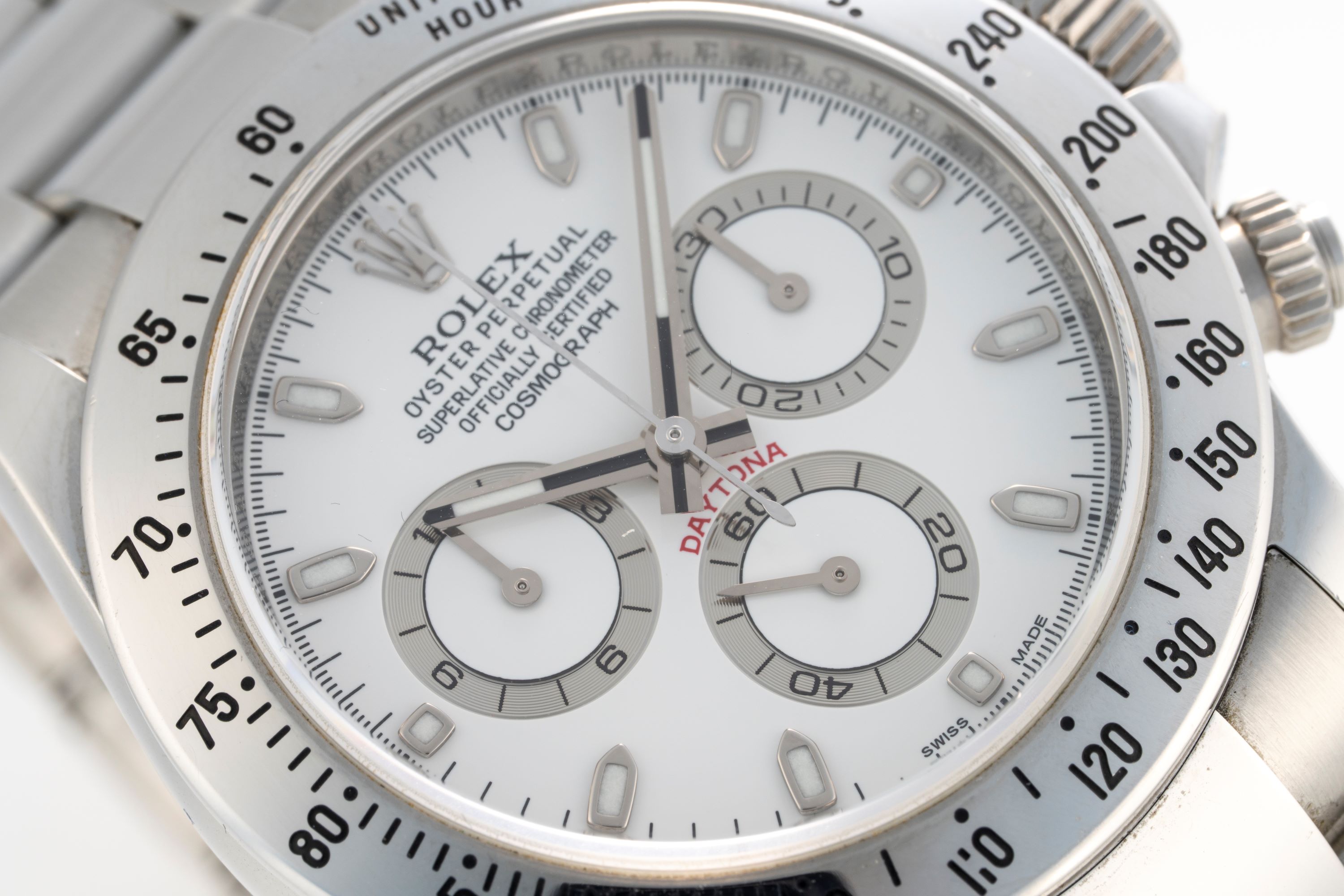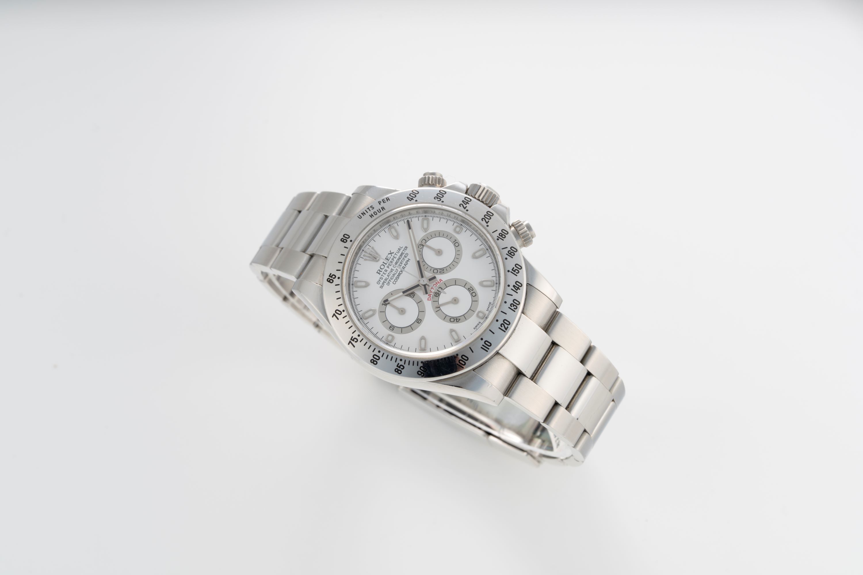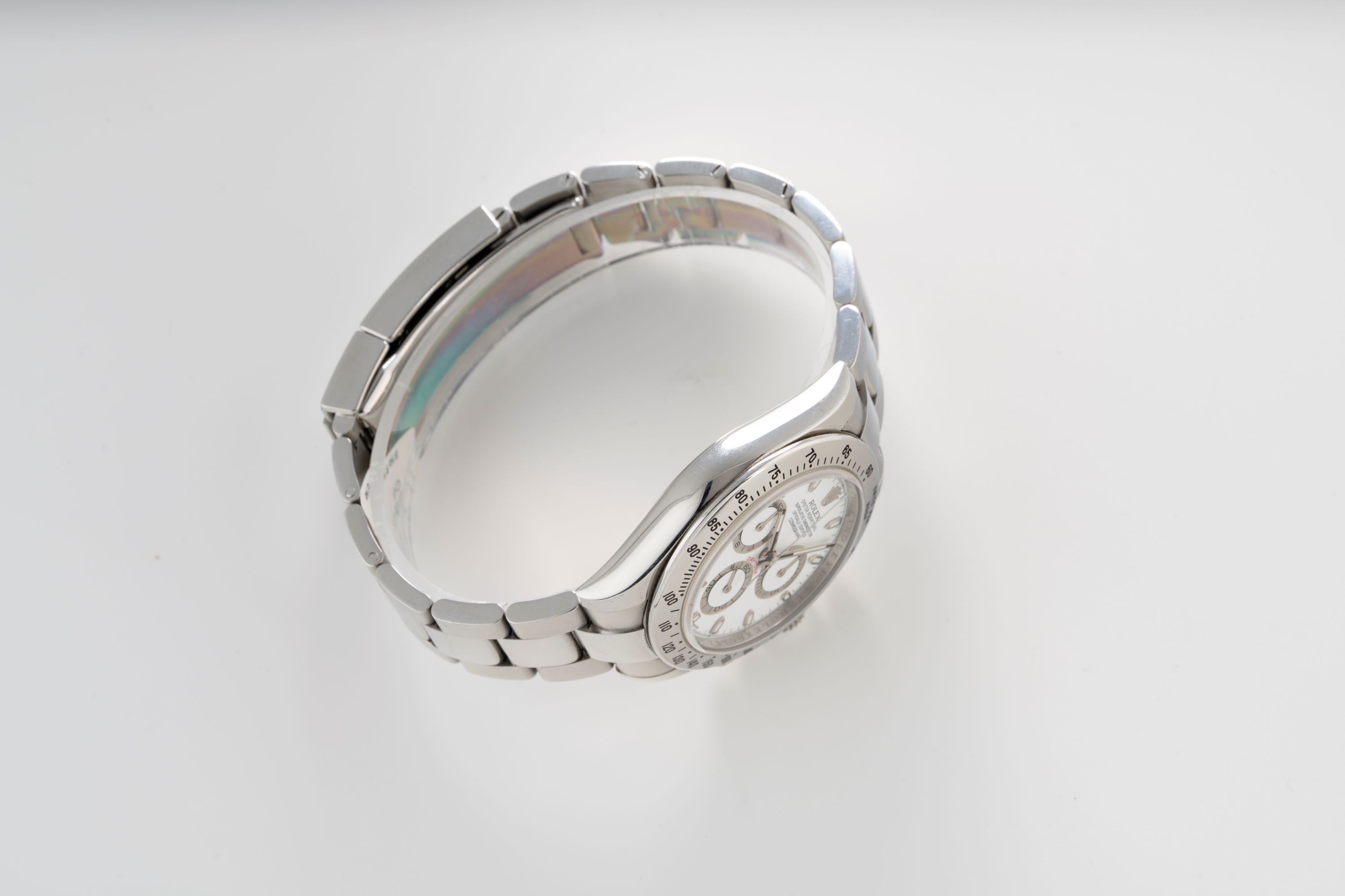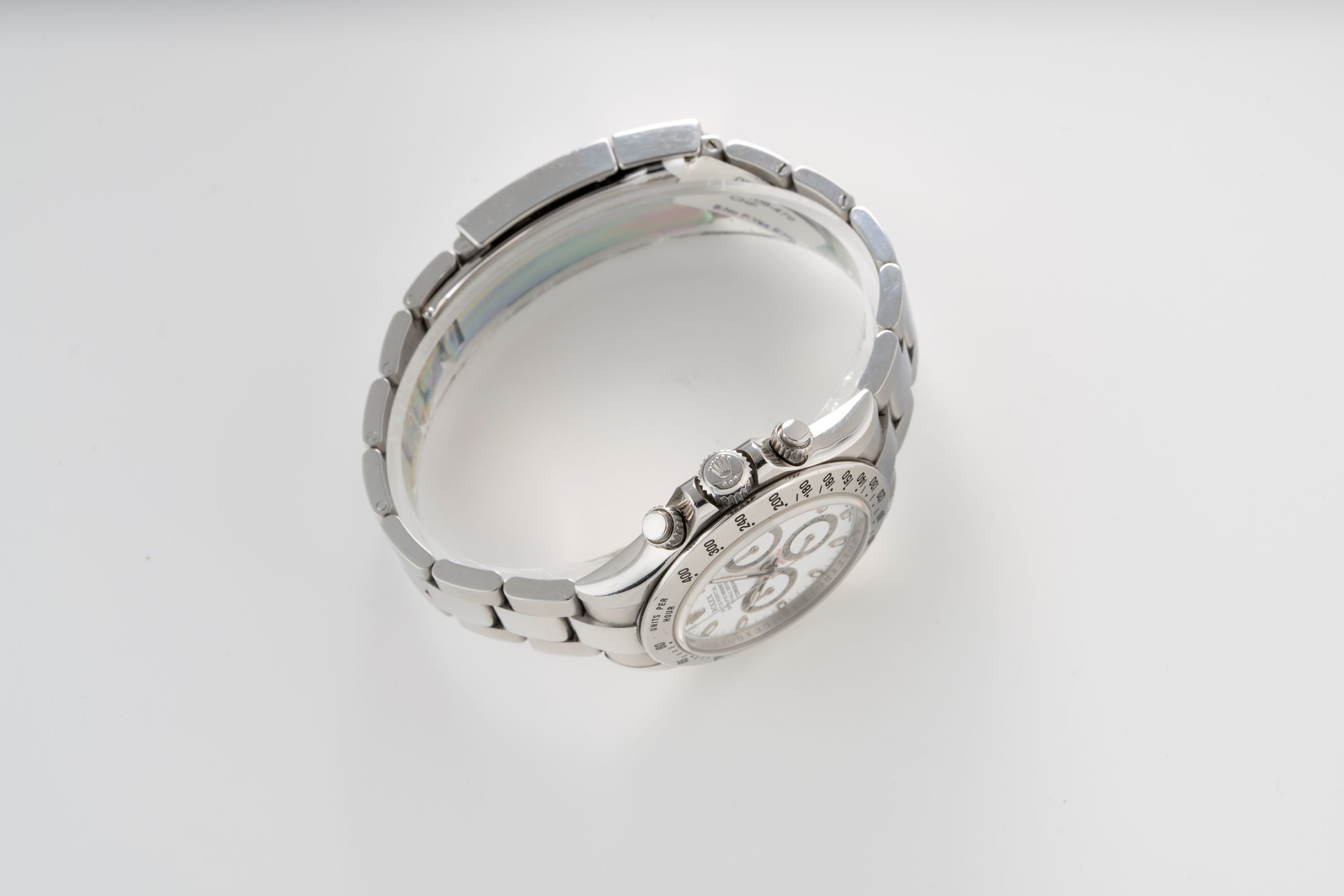 DialWhite lacquer dial with applied white gold indices, luminous white gold hands, small seconds at 6 o'clock, 30 minute chronograph counter at 3 o'clock, 12 hour chronograph counter at 9 o'clock, signed 'Rolex' at 12 o'clock