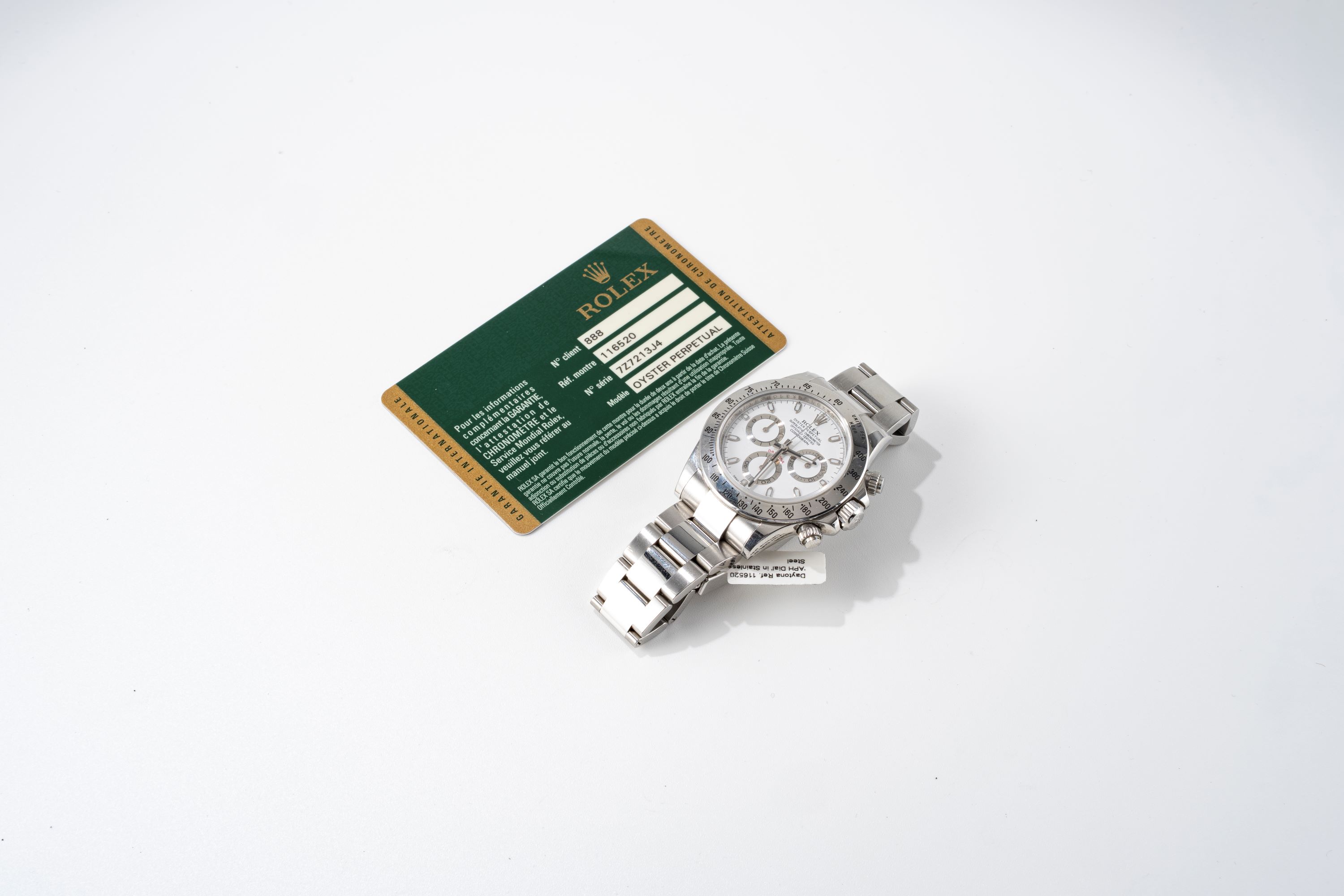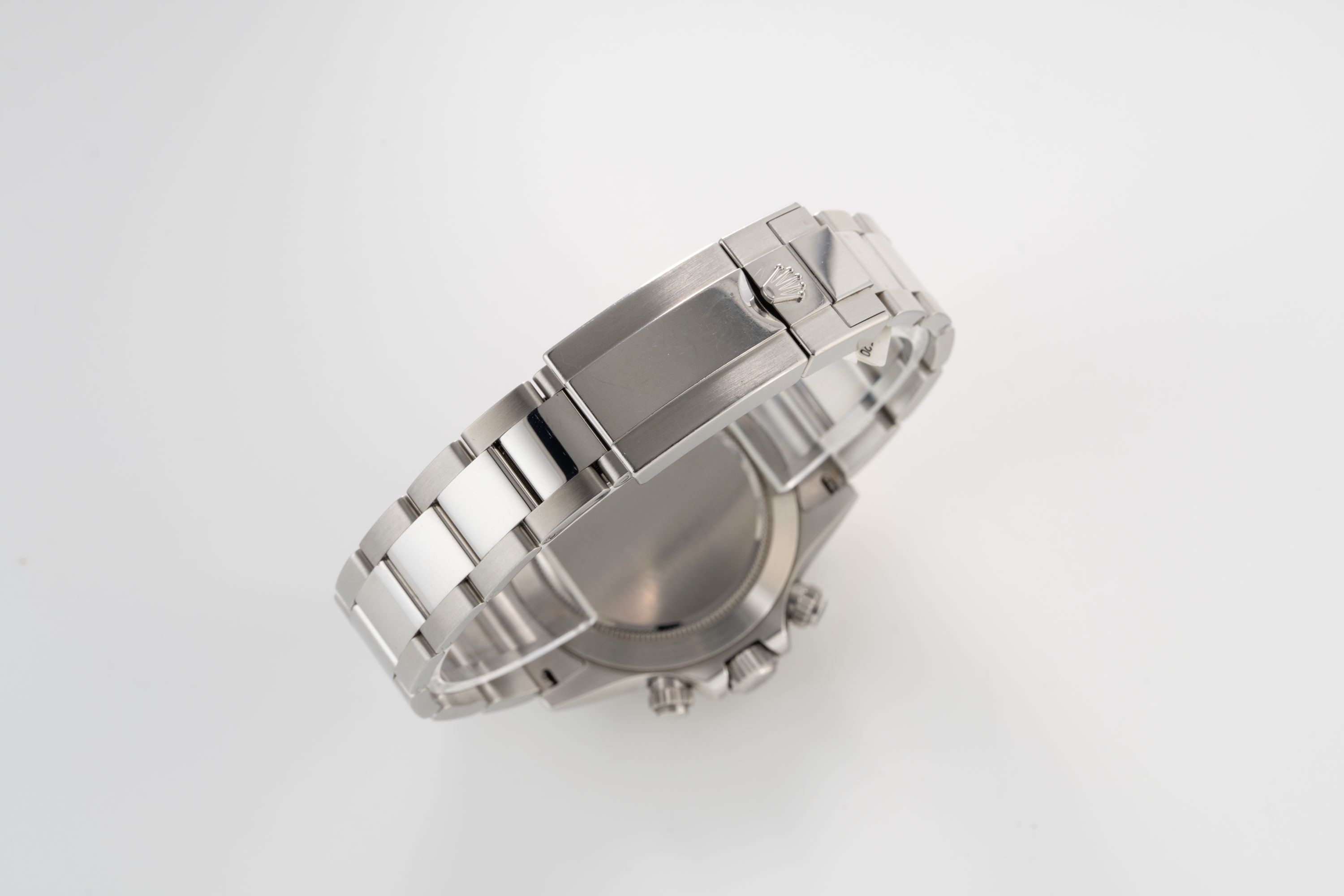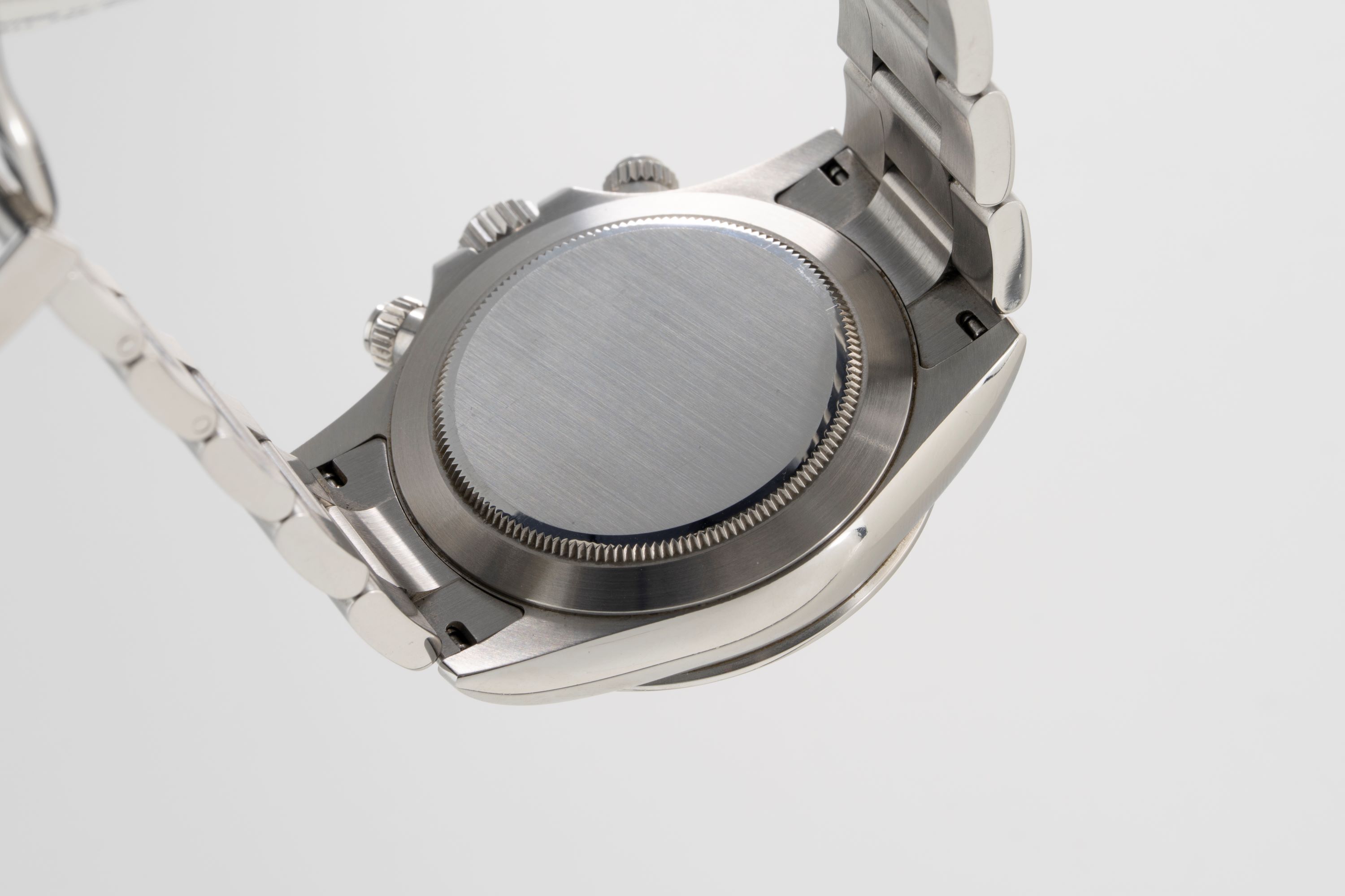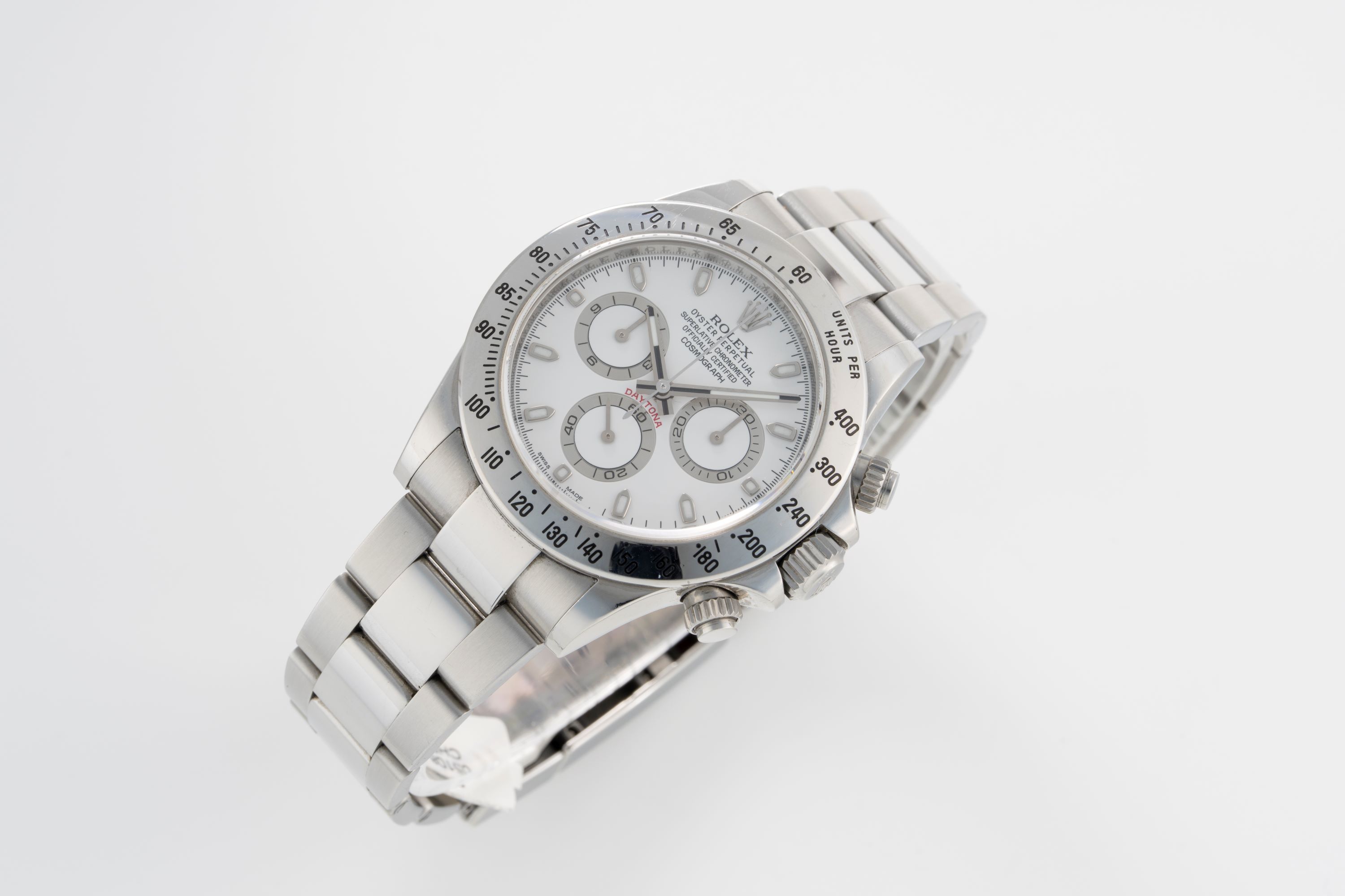 DialWhite lacquer dial with applied white gold indices, luminous white gold hands, small seconds at 6 o'clock, 30 minute chronograph counter at 3 o'clock, 12 hour chronograph counter at 9 o'clock, signed 'Rolex' at 12 o'clock